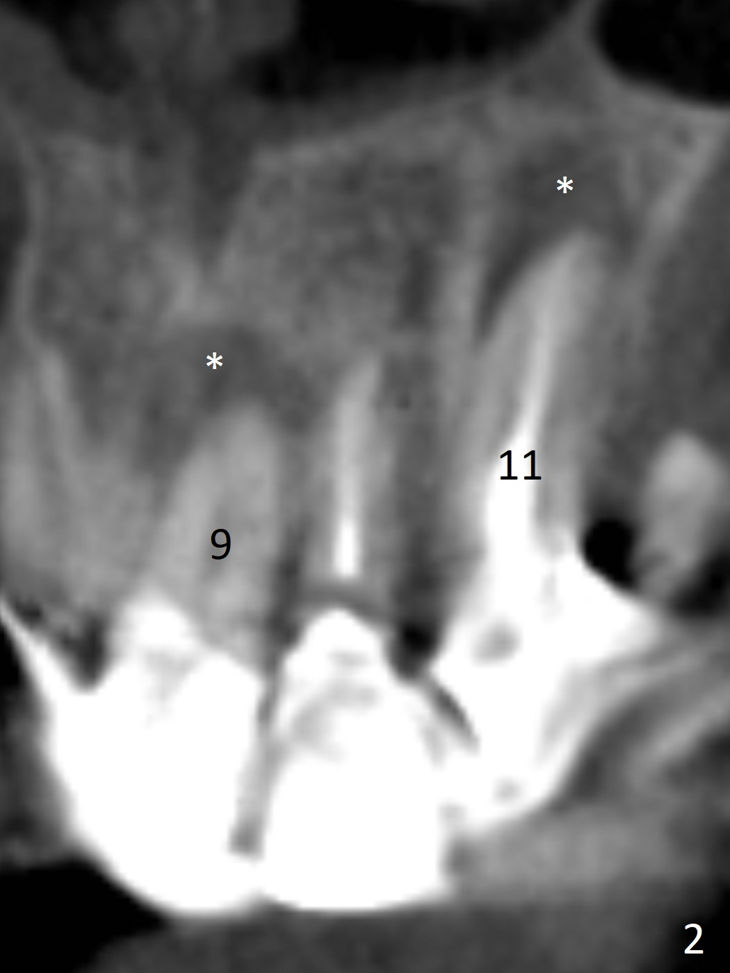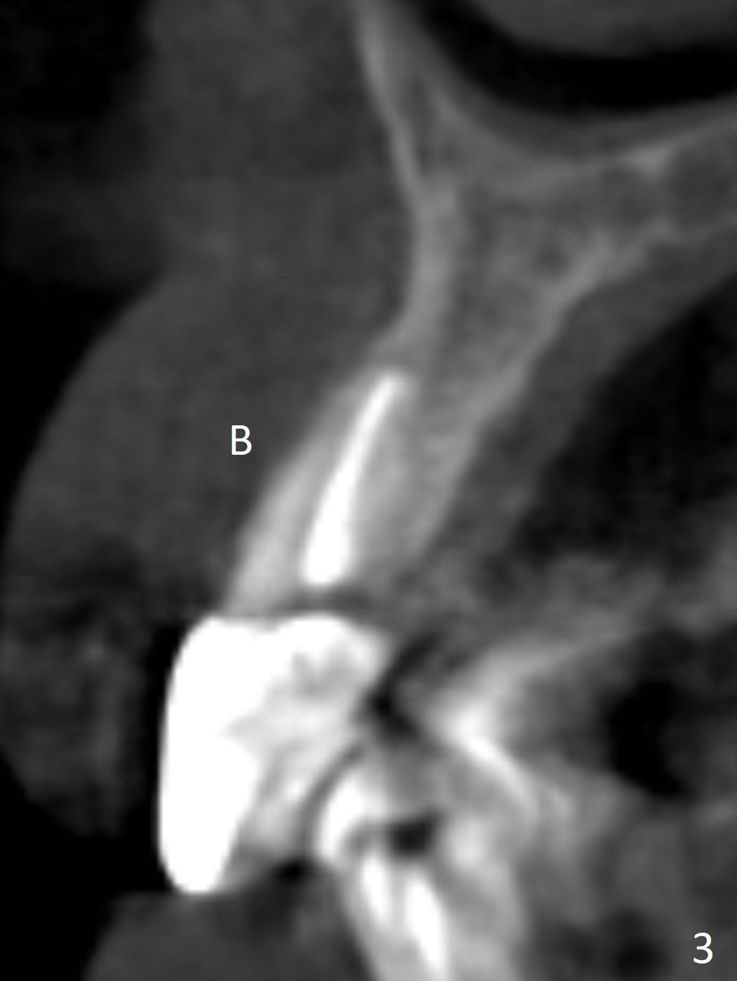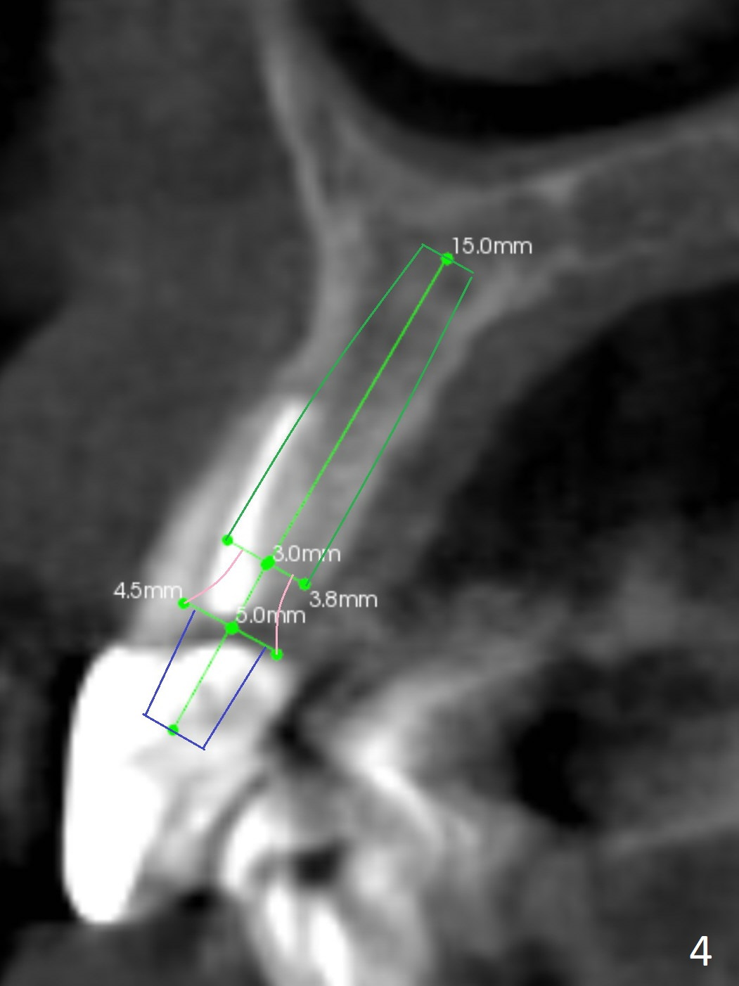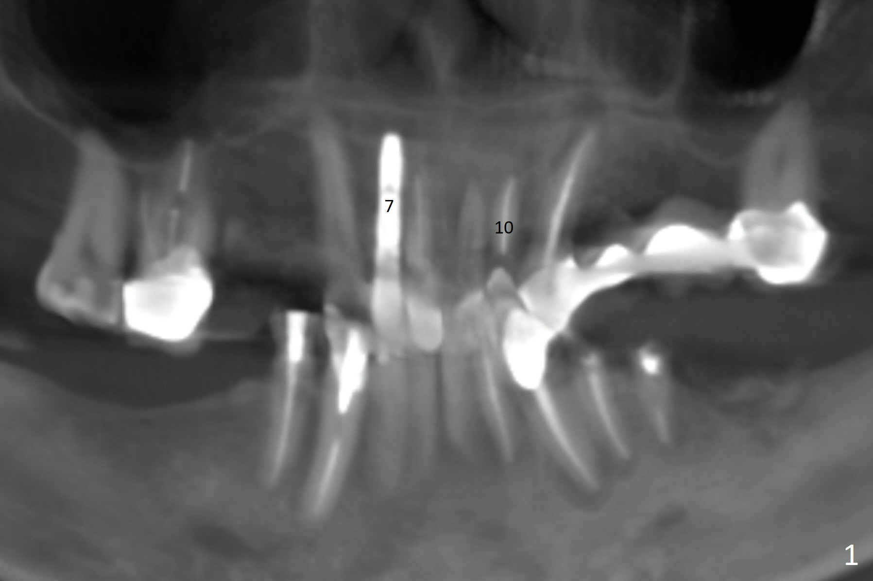 A 60-year-old man fractures the tooth #10 after implant at #7 (Fig.1). An implant should be placed in the middle of the socket at #10 since there is periapical radiolucencey at #9 and 11 (Fig.2 CBCT). The buccal plate at #10 is thin (Fig.4). A 3.8x15 mm implant (the smallest 2-piece) appears to be large for the alveolus (Fig.5). The gingiva must be thin as well. This is called thin biotype. In fact the buccal plate seems to have undergone bone resorption post 3.8x15 mm implant placement at #7. Therefore a 2.5 or 3x14 or 16 mm 1-piece implant will be placed at #10 (Fig.5). Also prepare angled ones. Take photos of #7 and 10 to show bone resorption and the thin gingiva. If the caries is not extensive, perform socket shield. In fact a 1-piece implant is chosen because of the narrow mesiodistal space.