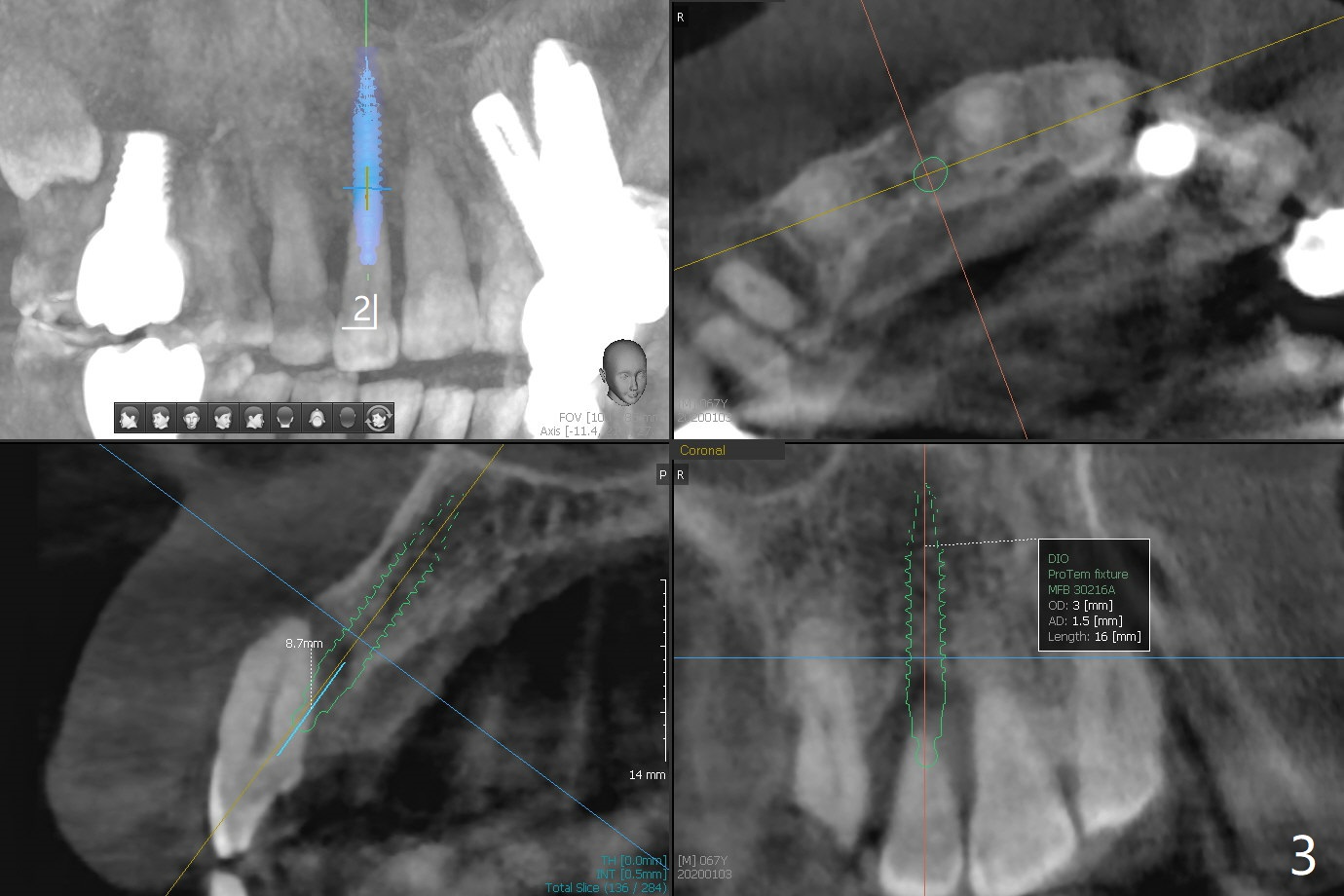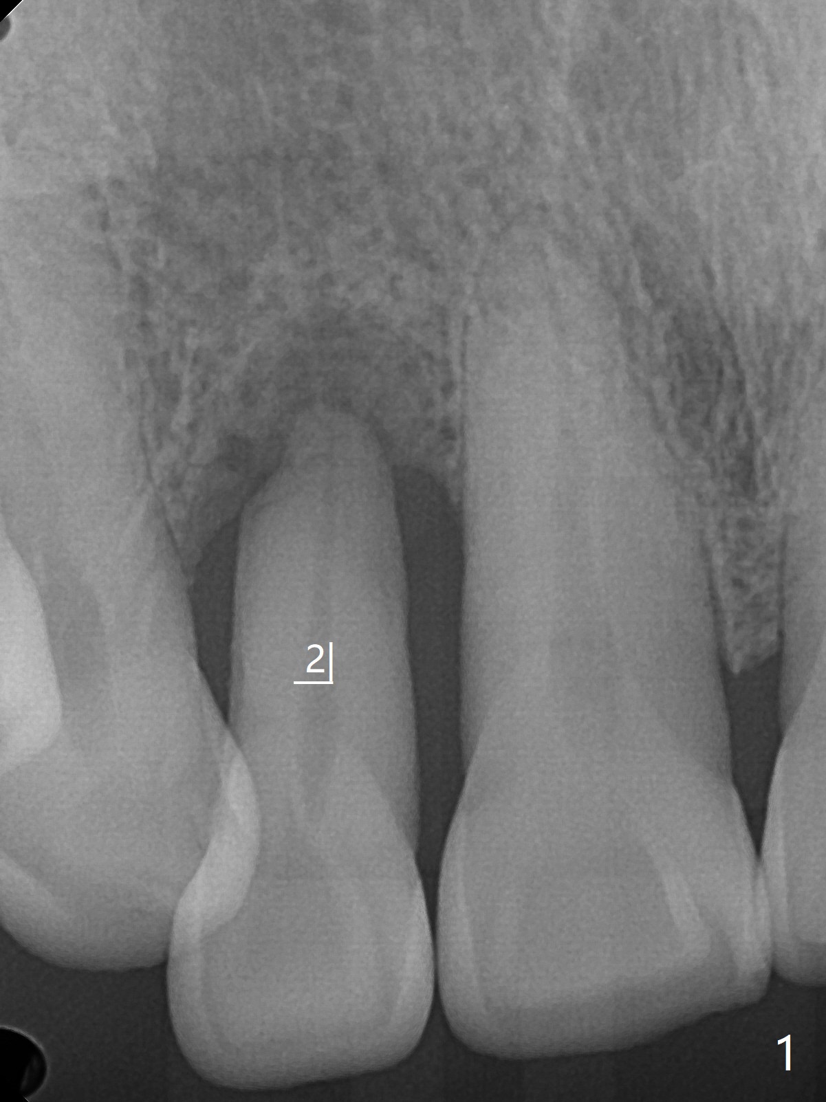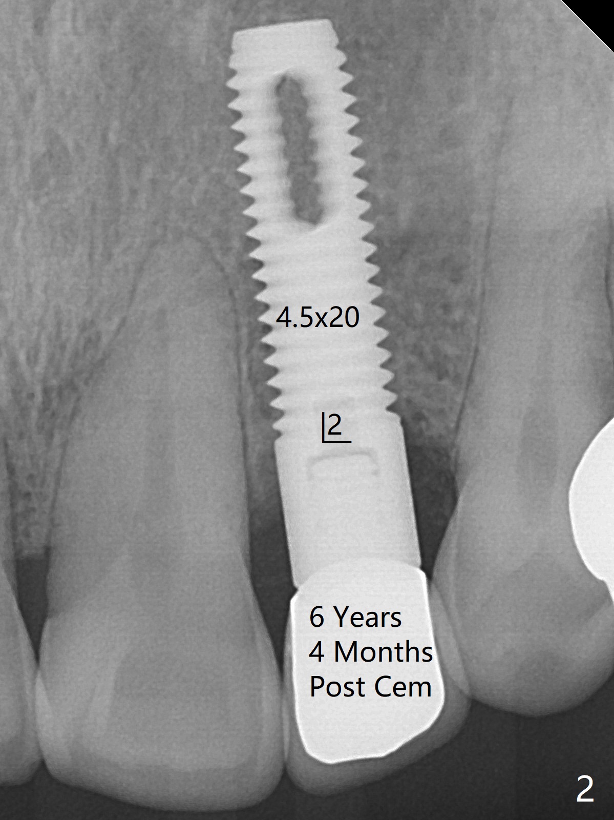 68岁男要求拔除右上2松动牙(图一),尽管近远中空间大,不能象左上2种大植体(图二,五)。右上2骨质吸收严重,植体应该植入深,牙龈厚(6毫米,图三,四),需要长基台,放置粘性骨粉修复骨质缺失。PRF膜好像用处不大,PRF上清液适当多用于制作粘性骨粉。准备牙周洁治器和Endogain,让骨粉与邻牙牙根结合。