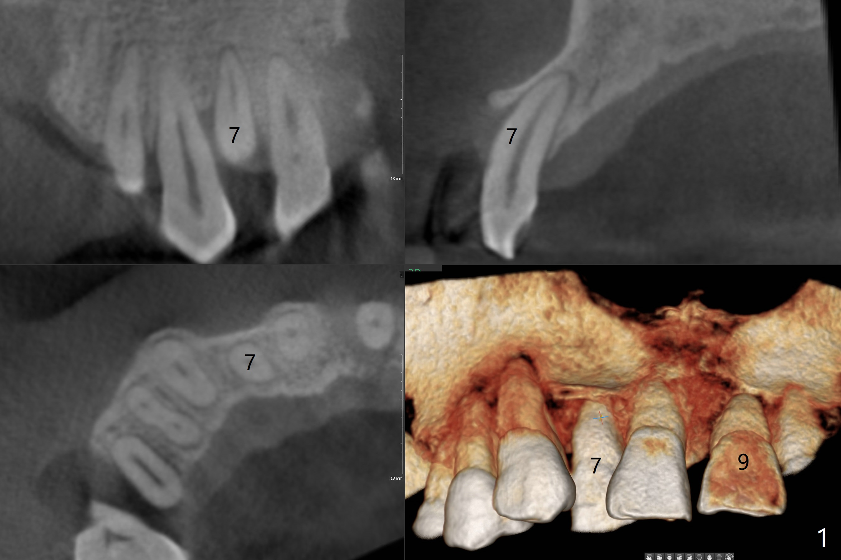 A 47-year-old man has history of chronic periodontitis and bruxism. After implants at 19, 3, and 9 with improvement in oral hygiene, he has unabated wish to correct #7 cross bite (Fig.1). The upper dental midline deviates to the right. When the implant at #9 osteointegrates, align the mesial surface of the immediate provisional to the facial midline.
