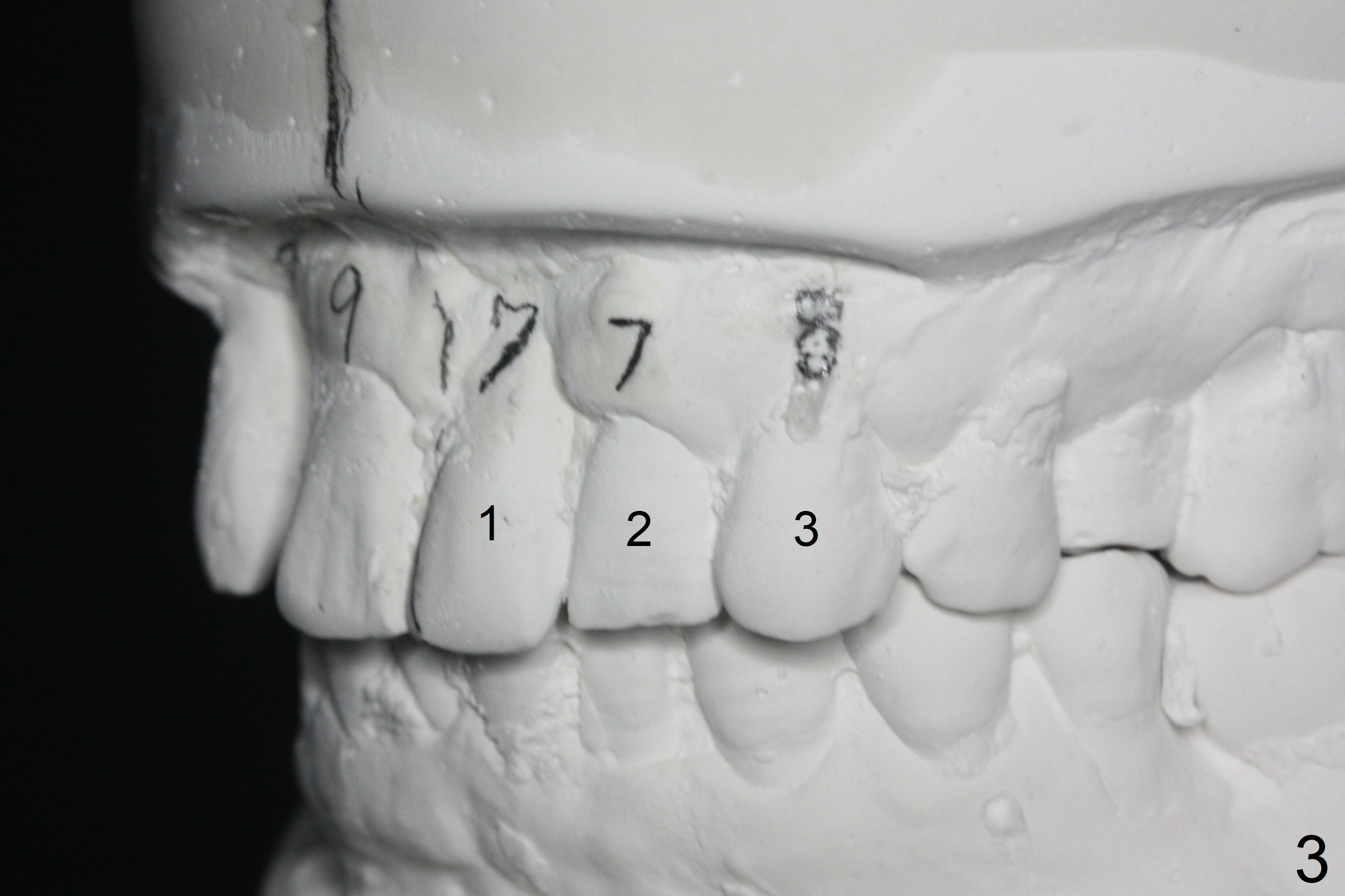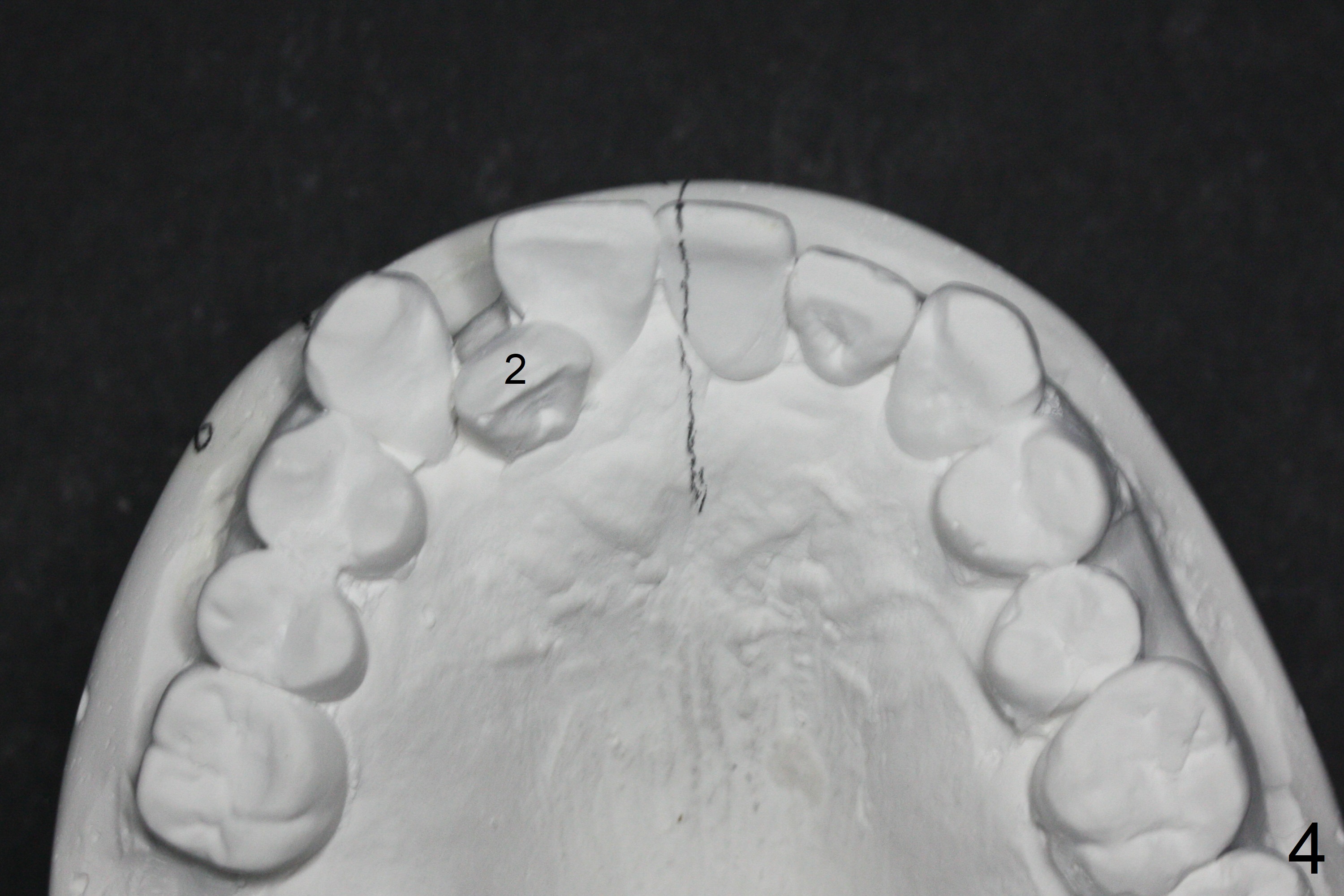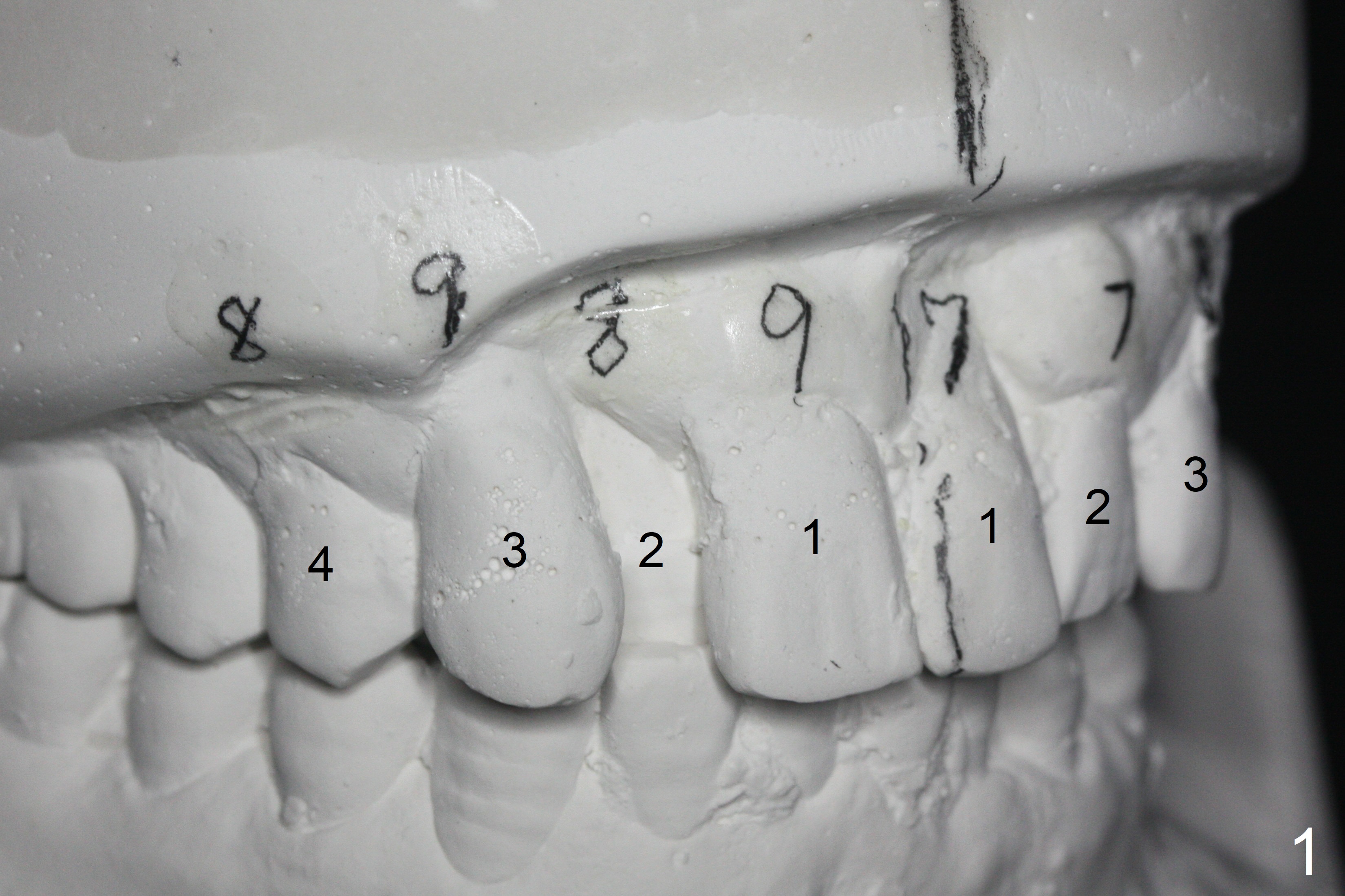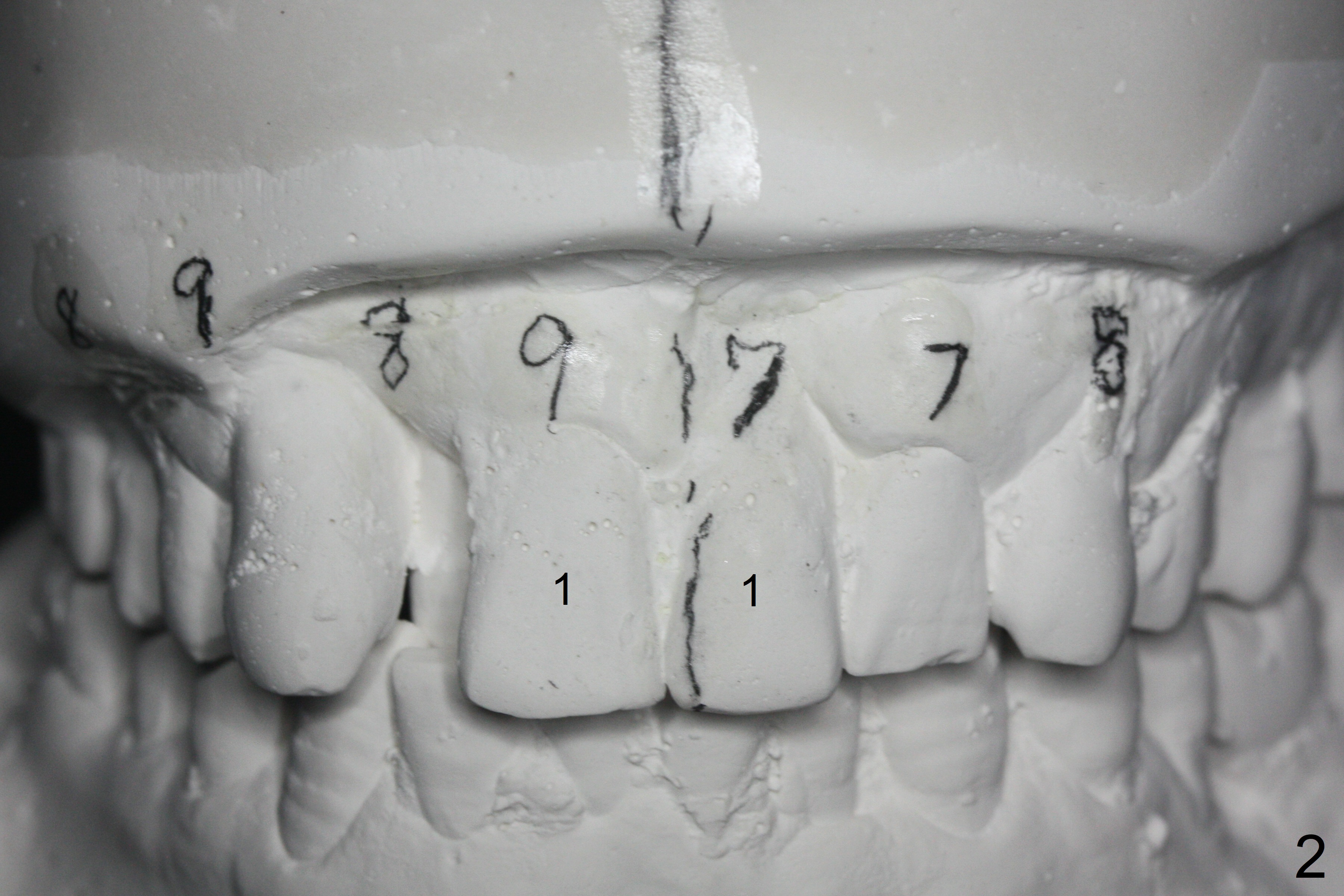 In spite of several warnings against orthodontic treatment for a 47-year-old man with chronic periodontitis, he requests it once more time before UL1 implant restoration. How to correct UR2 cross bite (Fig.1-4)? The number in pencil represents the width of each tooth in mm. For example the width of UR1 is 9 mm, whereas that of UL1 is 7 mm (Fig.2). The pencil line represents the facial midline and the upper dental midline. Ideally the UL1 should be moved distally ~ 1 mm.