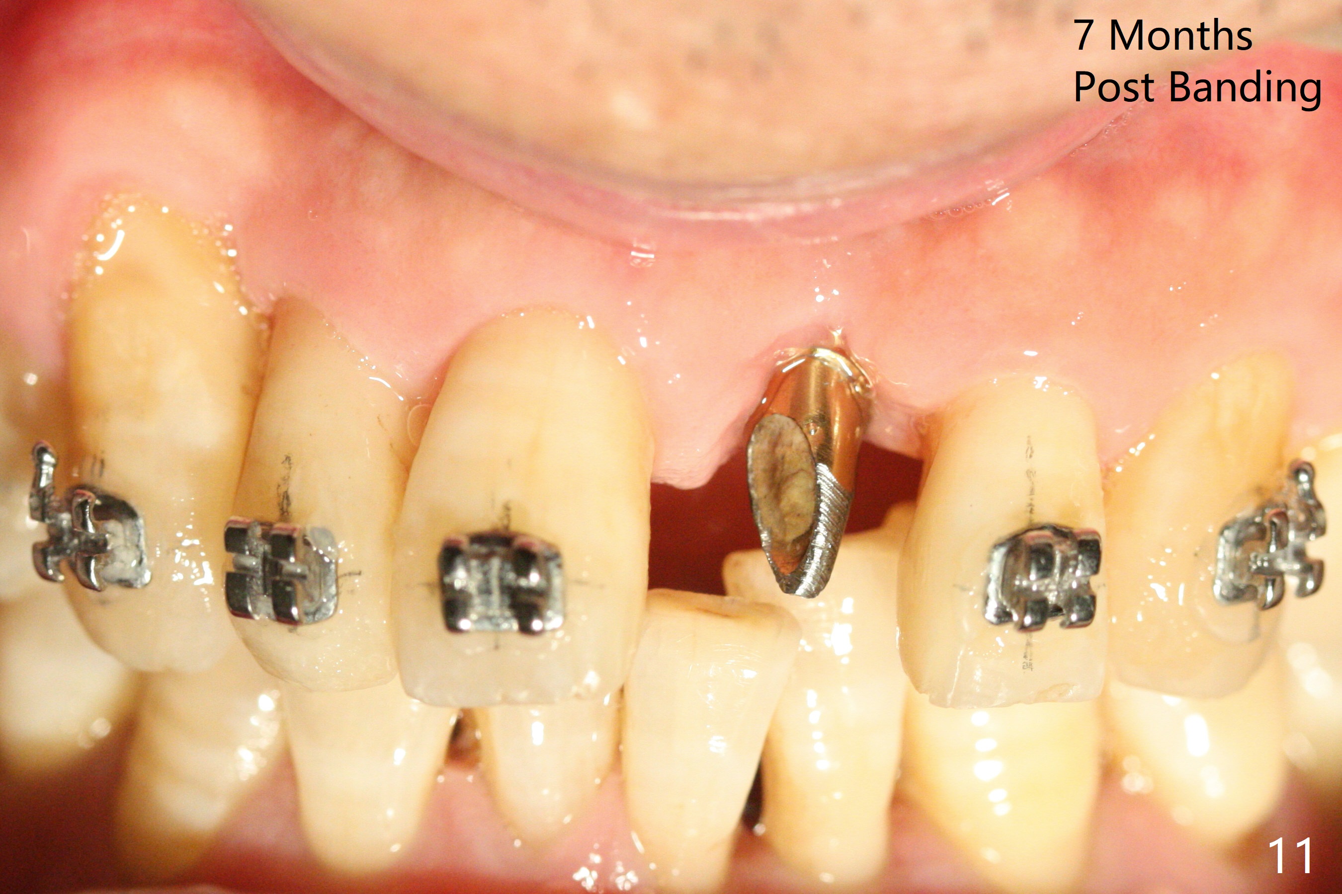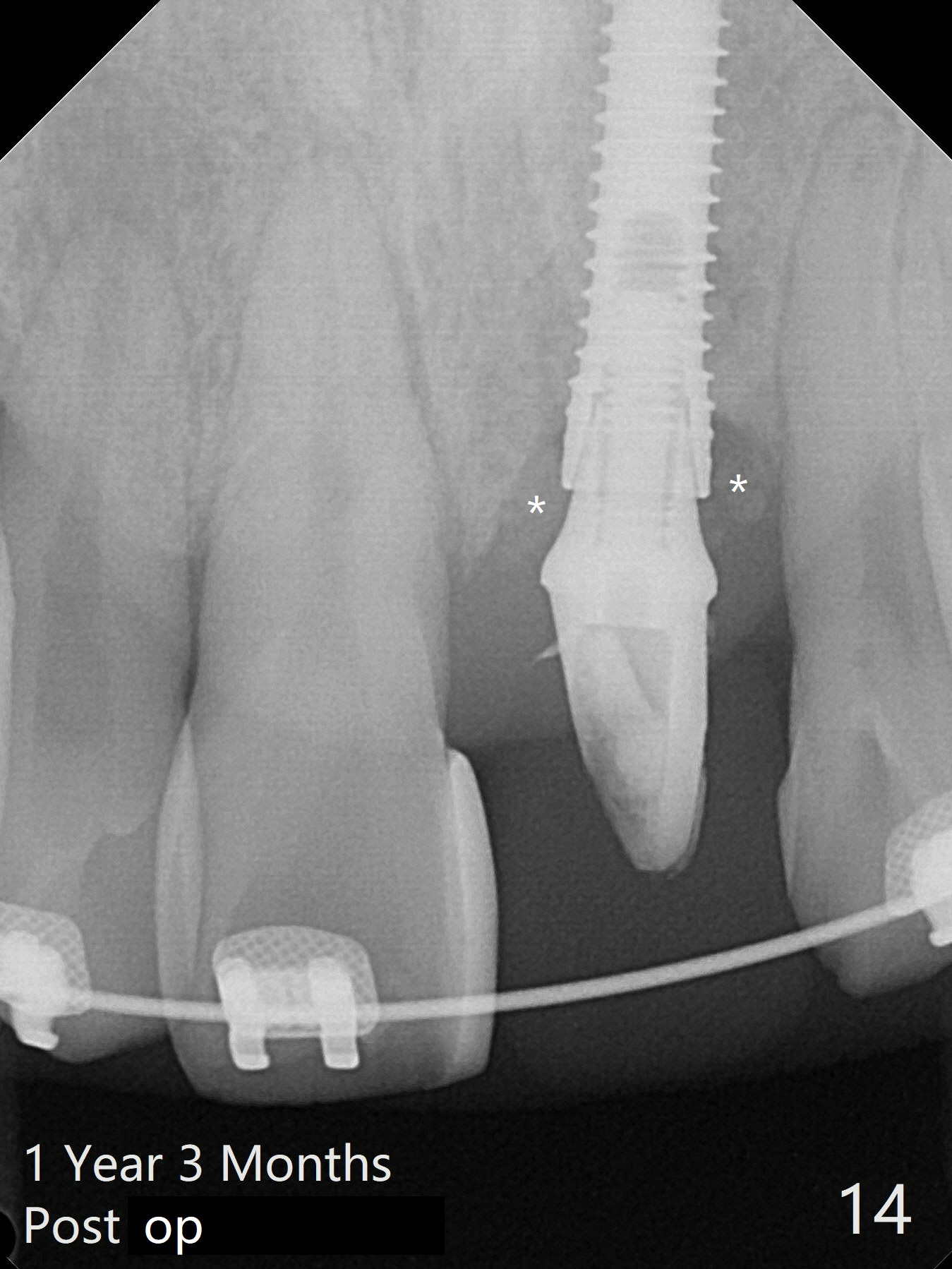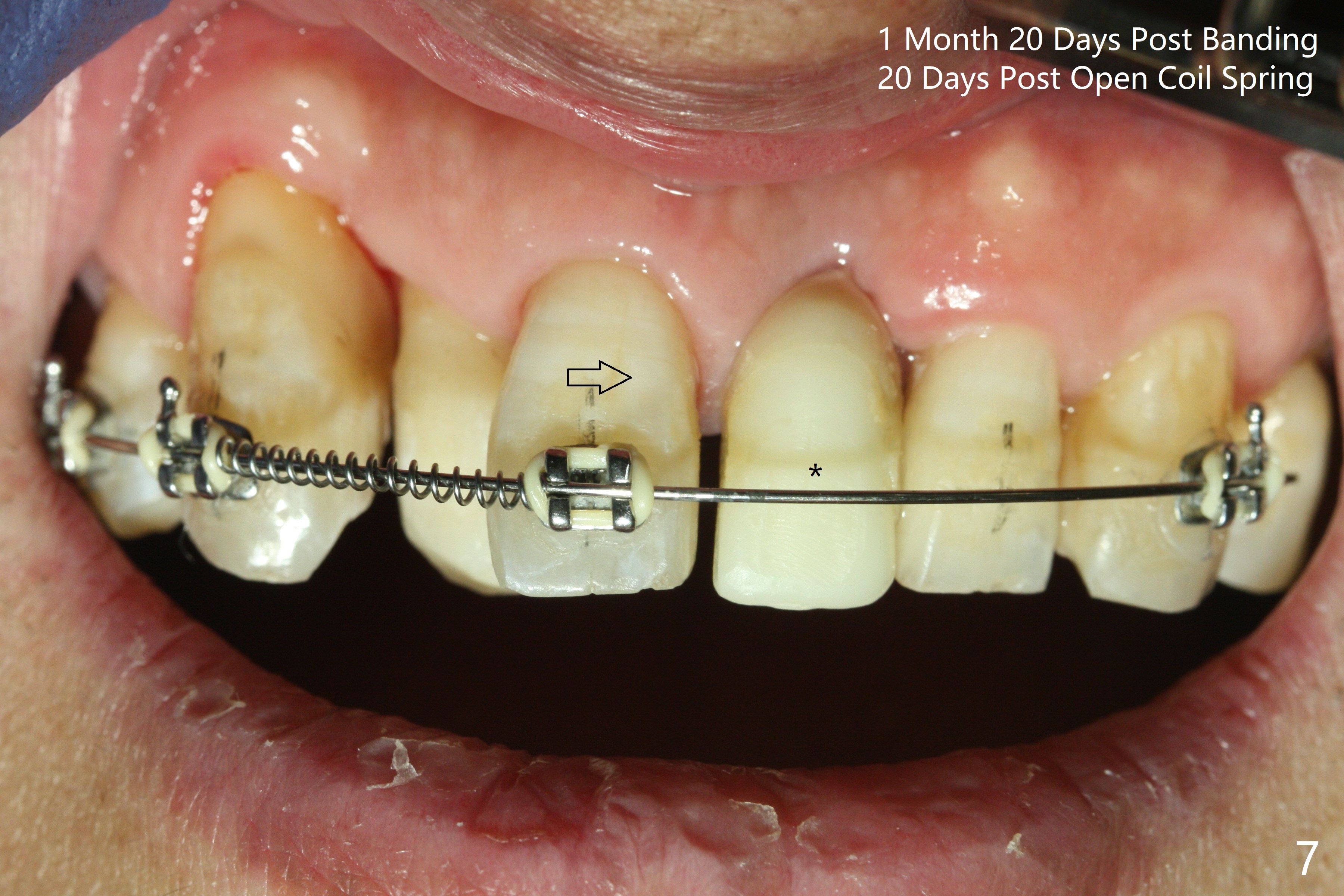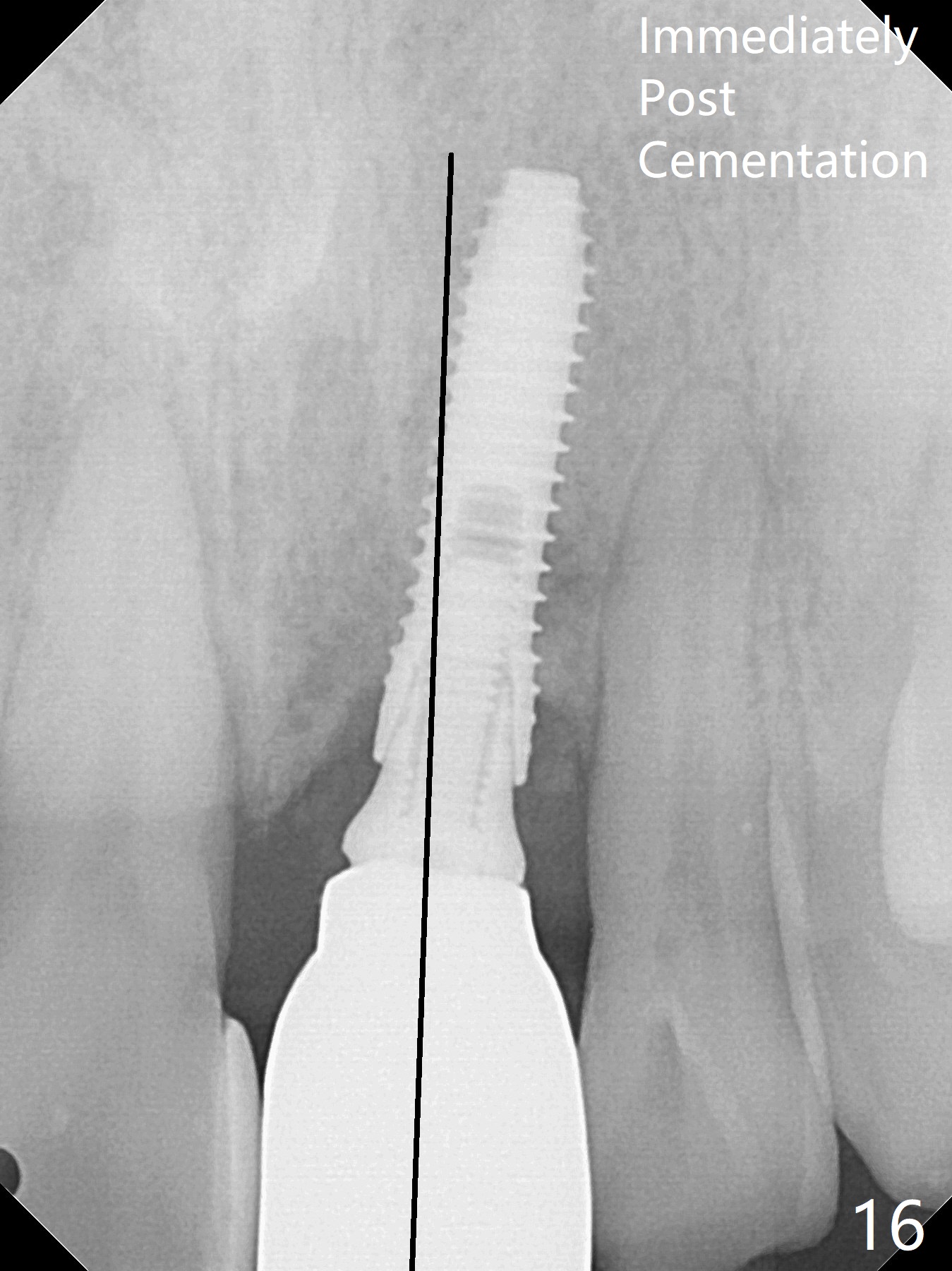 Nearly 7 months postop, the immediate provisional at UL1 is removed; with the mesial reduction of UL2 from 7 to 6 mm (Fig.1), an angled abutment is to be changed (4.5x15 degree, 2 mm cuff). A new provisional (Fig.2,3) co-incides with the facial midline. Brackets will be placed between UR4 to UL3 except UL2 (symptomatic once with chronic periodontitis) with initial proximal reduction between UR1-4 in preparation to correct cross bite of UR2. Twelve days later, the patient returns for UR5-UL3 bracketing after UR1-4 initial proximal reduction with 14 niti wire (Fig.4-6). UR1 moves mesial 20 days post open coil spring (Fig.7 arrow), while UL1 debracketes after permanent re-cementation of the temporary crown last visit (*, no re-bracketing, since it appears not essential). Before placement of 20 ss wire, diastemata are created by proximal reduction (Fig.8 *). In fact UR1 moves mesial, while UR3 does not move distal with the open coil. With placement of UR6 (implant) molar band, UR3 is distalized effectively. With sling shot, UR2 is almost labialized in one appointment (Fig.9). After consolidation of the diastemata between UR1-6 with power chains following UR2 cross bite correction (Fig.10), the restoration space for UL1 seems to be too large (Fig.11). Next visit, check the midlines, take 1-2 PAs for #7-9 and determine whether a straight abutment should be changed back and whether composite should be placed UR1 mesial to reduce the space. One week later, composite is added to the mesial surface of the tooth #8 to increase its width, while the provisional at #9 is relined to improve the interdental papilla (Fig.12). Minimal bone loss at UR2 is observed 8 months post banding (Fig.13), while the socket at UL1 seems to have healed except the most coronal 1 year 3 months postop (Fig.14 *). The margin of the abutment should be uneven, more coronal proximal than buccopalatal (Fig.15). The final crown has an open margin, partially due to less ideal trajectory (Fig.16 (black line: ideal trajectory, nearly 1 year 4 months postop)). Guided surgery could solve the problem. Sticky bone may restore the buccal plate defect. Die shows that the implant is palatally placed (Fig.17). CT will be taken to determine whether the implant perforates the palatal plate.
