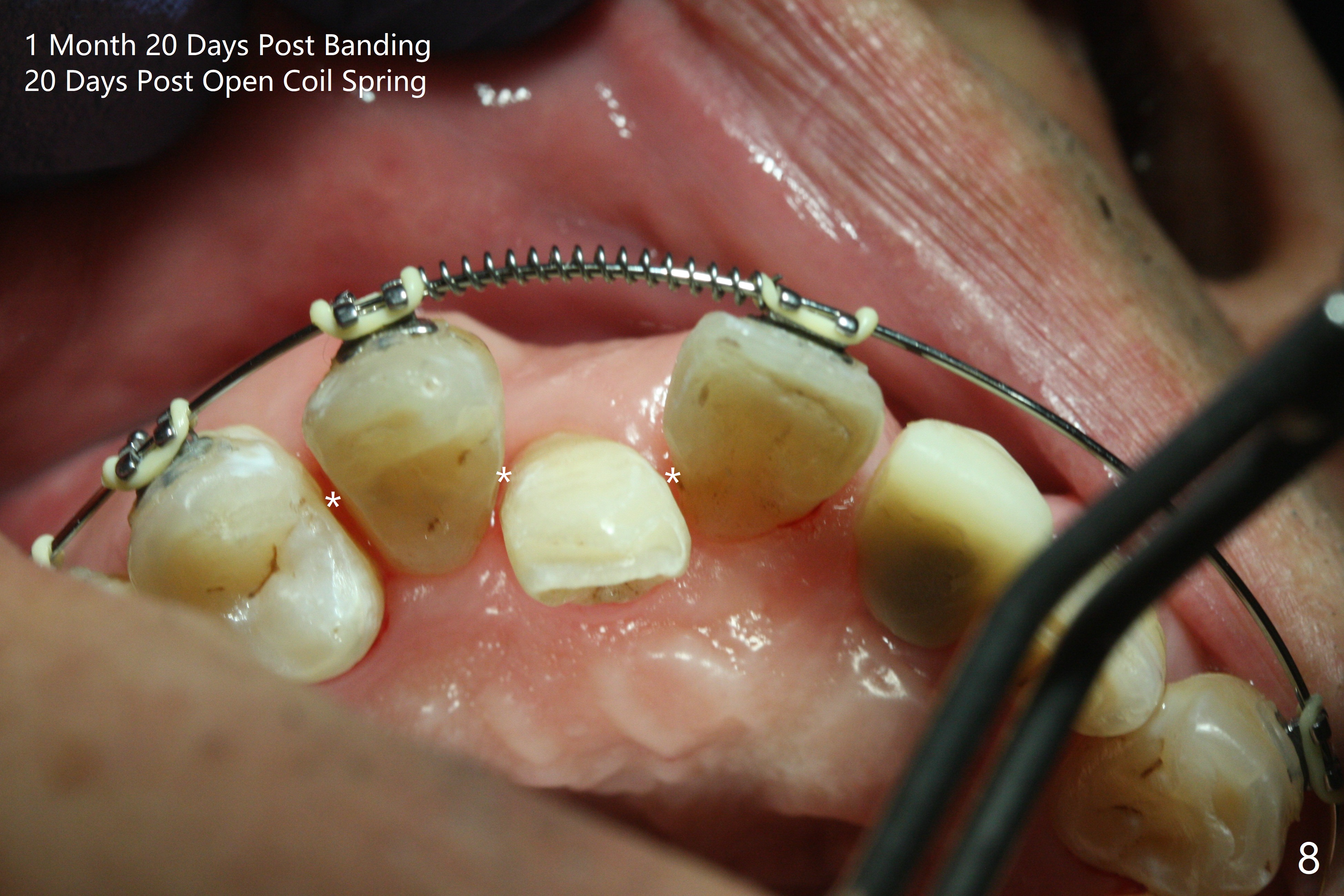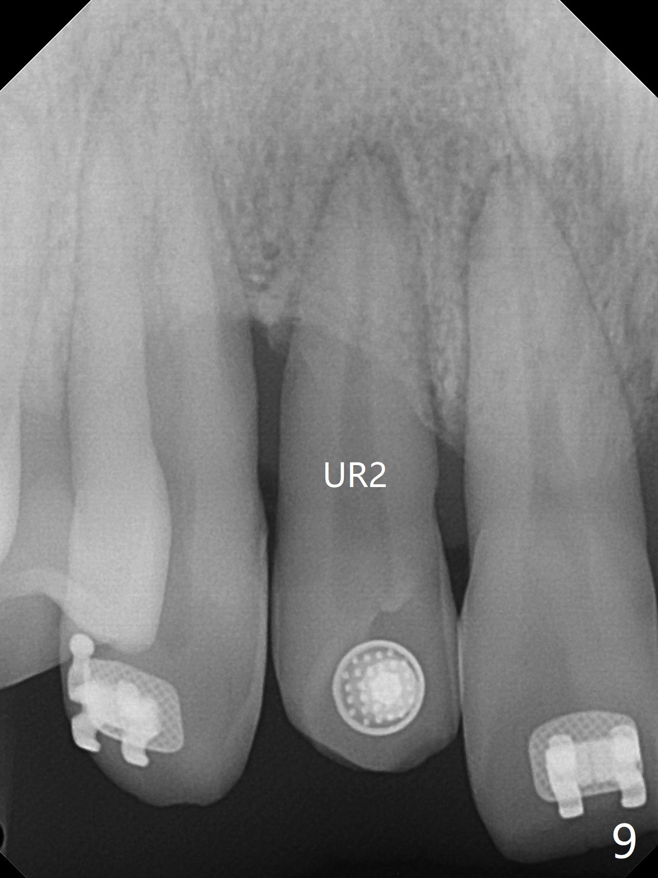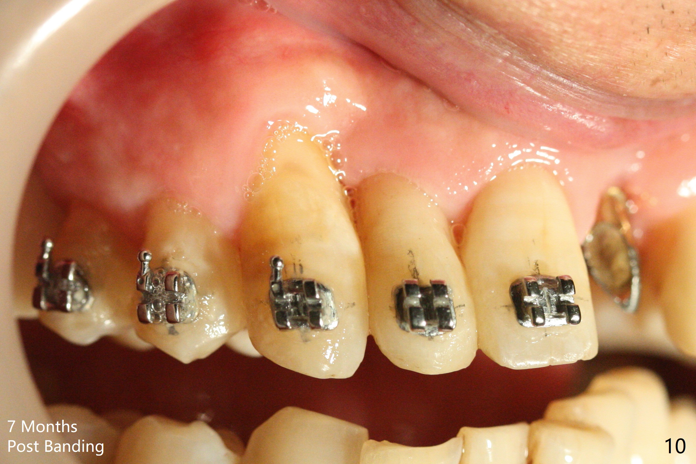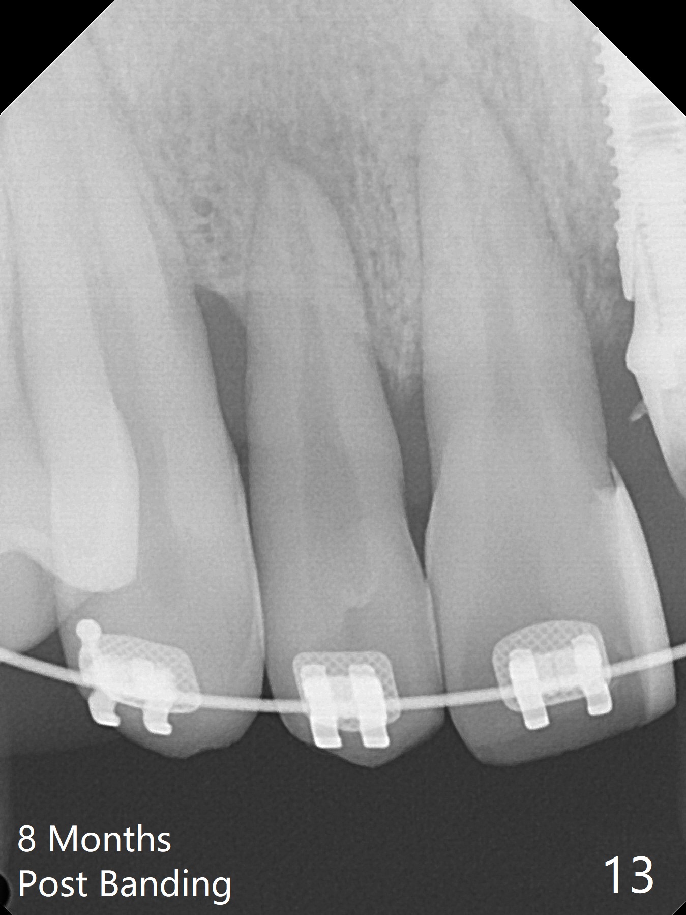 Nearly 7 months postop, the immediate provisional at UL1 is removed; with the mesial reduction of UL2 from 7 to 6 mm (Fig.1), an angled abutment is to be changed (4.5x15 degree, 2 mm cuff). A new provisional (Fig.2,3) co-incides with the facial midline. Brackets will be placed between UR4 to UL3 except UL2 (symptomatic once with chronic periodontitis) with initial proximal reduction between UR1-4 in preparation to correct cross bite of UR2. Twelve days later, the patient returns for UR5-UL3 bracketing after UR1-4 initial proximal reduction with 14 niti wire (Fig.4-6). UR1 moves mesial 20 days post open coil spring (Fig.7 arrow), while UL1 debracketes after permanent re-cementation of the temporary crown last visit (*, no re-bracketing, since it appears not essential). Before placement of 20 ss wire, diastemata are created by proximal reduction (Fig.8 *). In fact UR1 moves mesial, while UR3 does not move distal with the open coil. With placement of UR6 (implant) molar band, UR3 is distalized effectively. With sling shot, UR2 is almost labialized in one appointment (Fig.9). After consolidation of the diastemata between UR1-6 with power chains following UR2 cross bite correction (Fig.10), the restoration space for UL1 seems to be too large (Fig.11). Next visit, check the midlines, take 1-2 PAs for #7-9 and determine whether a straight abutment should be changed back and whether composite should be placed UR1 mesial to reduce the space. One week later, composite is added to the mesial surface of the tooth #8 to increase its width, while the provisional at #9 is relined to improve the interdental papilla (Fig.12). Minimal bone loss at UR2 is observed 8 months post banding (Fig.13), while the socket at UL1 seems to have healed except the most coronal 1 year 3 months postop (Fig.14 *). The margin of the abutment should be uneven, more coronal proximal than buccopalatal (Fig.15). The final crown has an open margin, partially due to less ideal trajectory (Fig.16 (black line: ideal trajectory, nearly 1 year 4 months postop)). Guided surgery could solve the problem. Sticky bone may restore the buccal plate defect. Die shows that the implant is palatally placed (Fig.17). CT will be taken to determine whether the implant perforates the palatal plate.