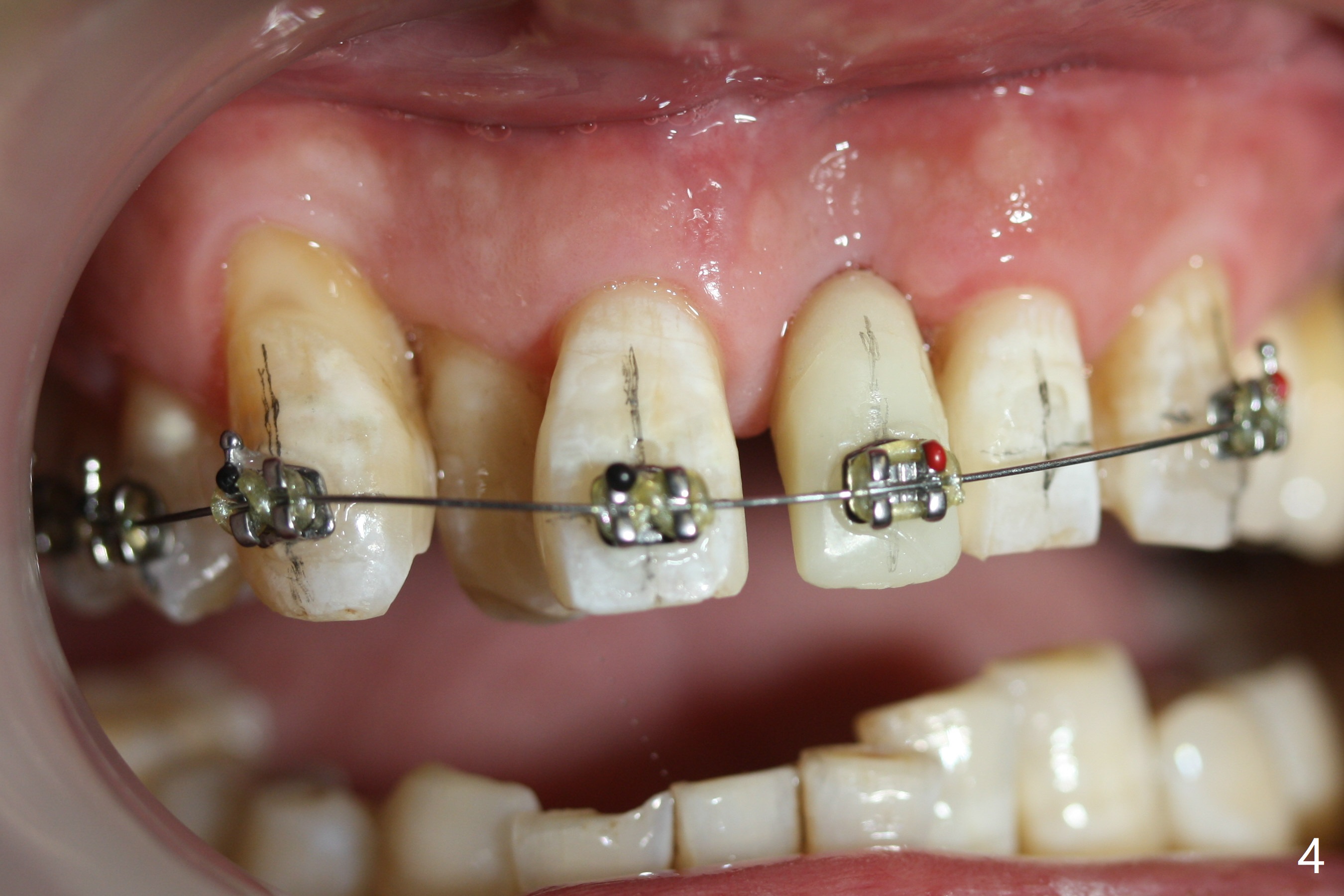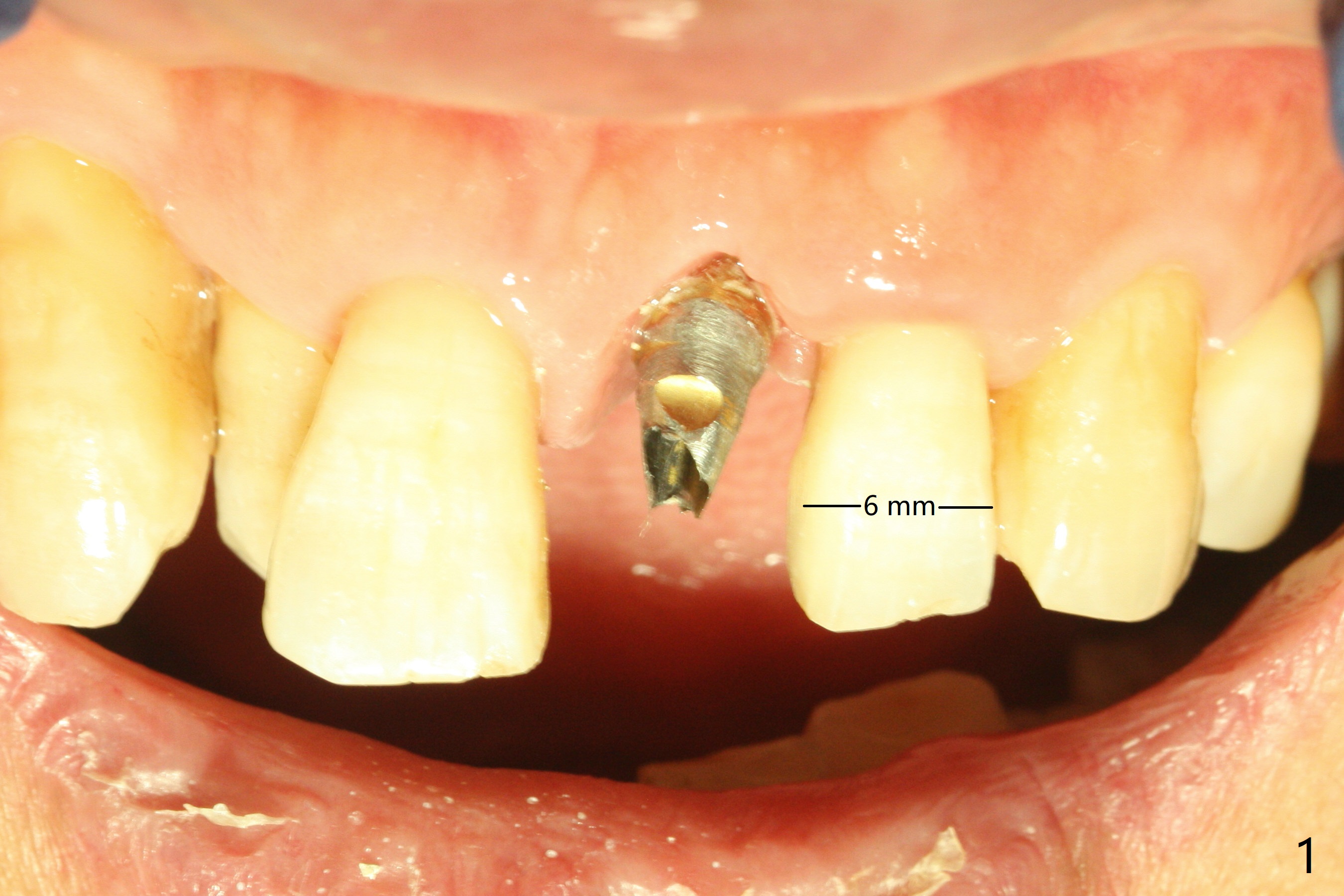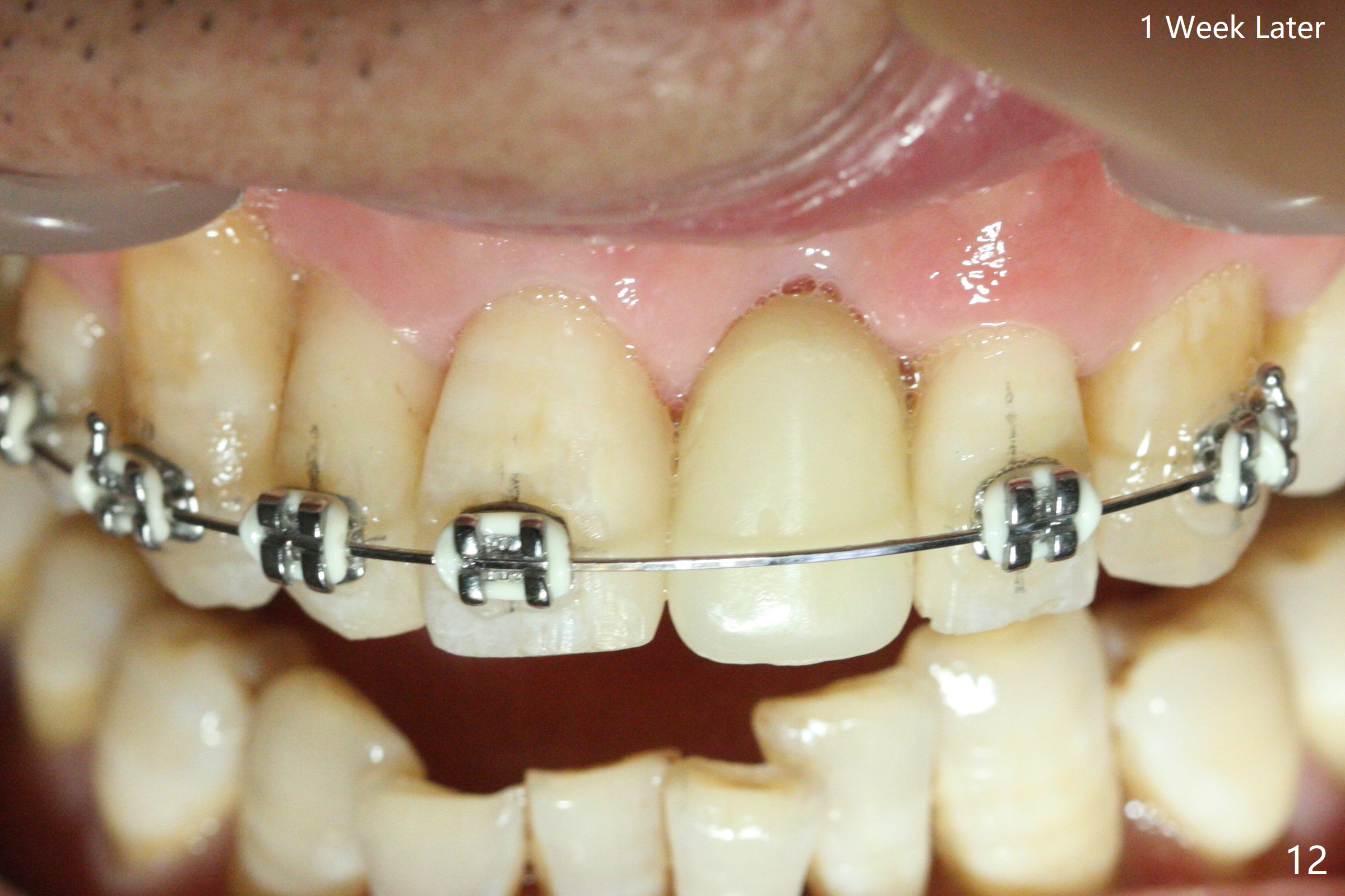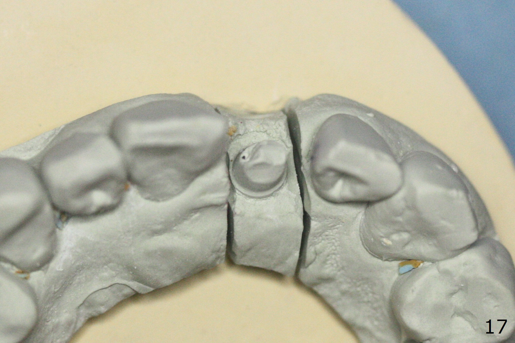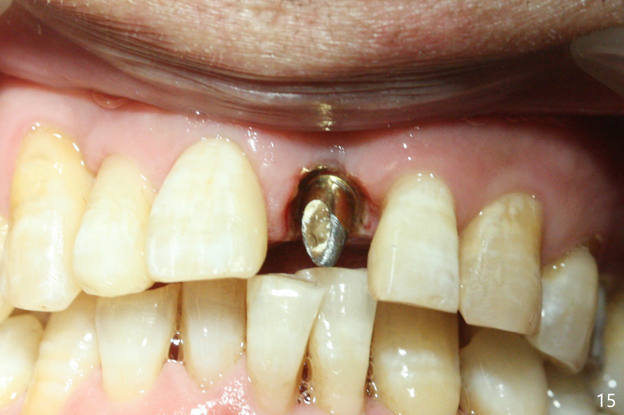 Nearly 7 months postop, the immediate provisional at UL1 is removed; with the mesial reduction of UL2 from 7 to 6 mm (Fig.1), an angled abutment is to be changed (4.5x15 degree, 2 mm cuff). A new provisional (Fig.2,3) co-incides with the facial midline. Brackets will be placed between UR4 to UL3 except UL2 (symptomatic once with chronic periodontitis) with initial proximal reduction between UR1-4 in preparation to correct cross bite of UR2. Twelve days later, the patient returns for UR5-UL3 bracketing after UR1-4 initial proximal reduction with 14 niti wire (Fig.4-6). UR1 moves mesial 20 days post open coil spring (Fig.7 arrow), while UL1 debracketes after permanent re-cementation of the temporary crown last visit (*, no re-bracketing, since it appears not essential). Before placement of 20 ss wire, diastemata are created by proximal reduction (Fig.8 *). In fact UR1 moves mesial, while UR3 does not move distal with the open coil. With placement of UR6 (implant) molar band, UR3 is distalized effectively. With sling shot, UR2 is almost labialized in one appointment (Fig.9). After consolidation of the diastemata between UR1-6 with power chains following UR2 cross bite correction (Fig.10), the restoration space for UL1 seems to be too large (Fig.11). Next visit, check the midlines, take 1-2 PAs for #7-9 and determine whether a straight abutment should be changed back and whether composite should be placed UR1 mesial to reduce the space. One week later, composite is added to the mesial surface of the tooth #8 to increase its width, while the provisional at #9 is relined to improve the interdental papilla (Fig.12). Minimal bone loss at UR2 is observed 8 months post banding (Fig.13), while the socket at UL1 seems to have healed except the most coronal 1 year 3 months postop (Fig.14 *). The margin of the abutment should be uneven, more coronal proximal than buccopalatal (Fig.15). The final crown has an open margin, partially due to less ideal trajectory (Fig.16 (black line: ideal trajectory, nearly 1 year 4 months postop)). Guided surgery could solve the problem. Sticky bone may restore the buccal plate defect. Die shows that the implant is palatally placed (Fig.17). CT will be taken to determine whether the implant perforates the palatal plate.