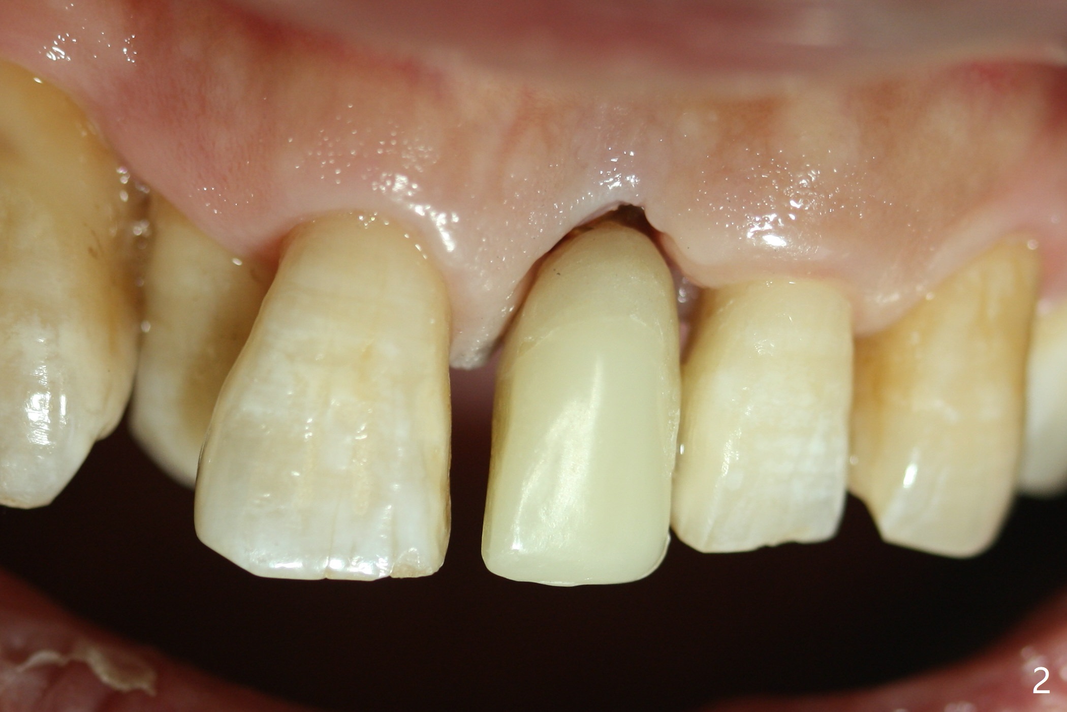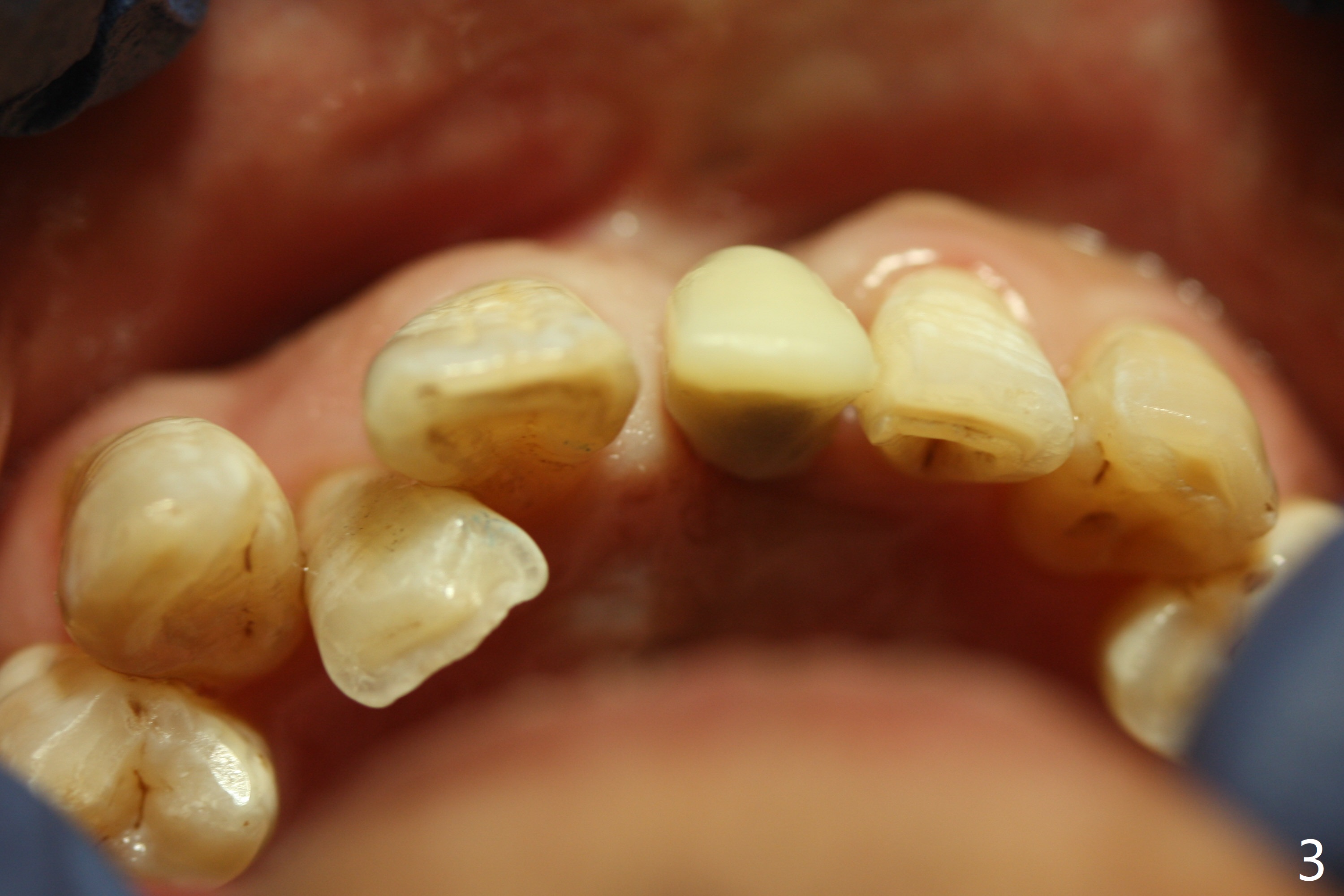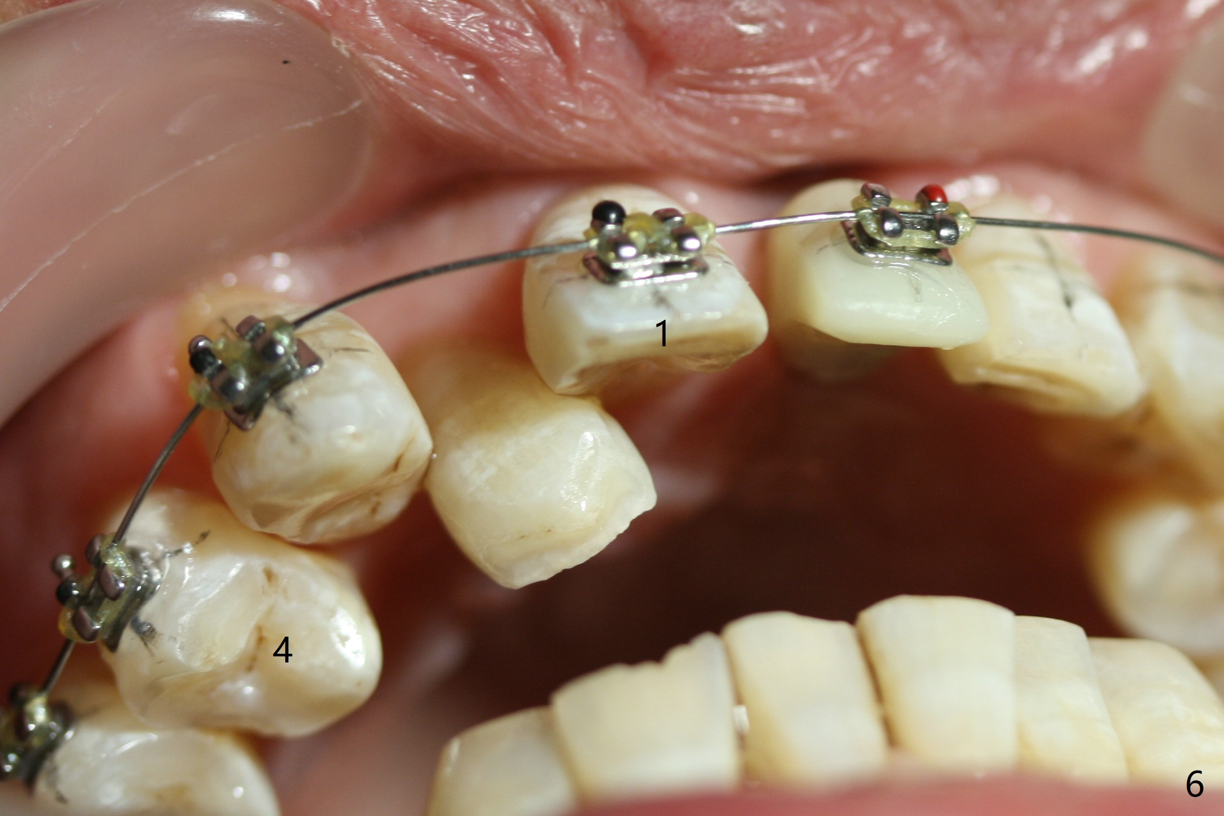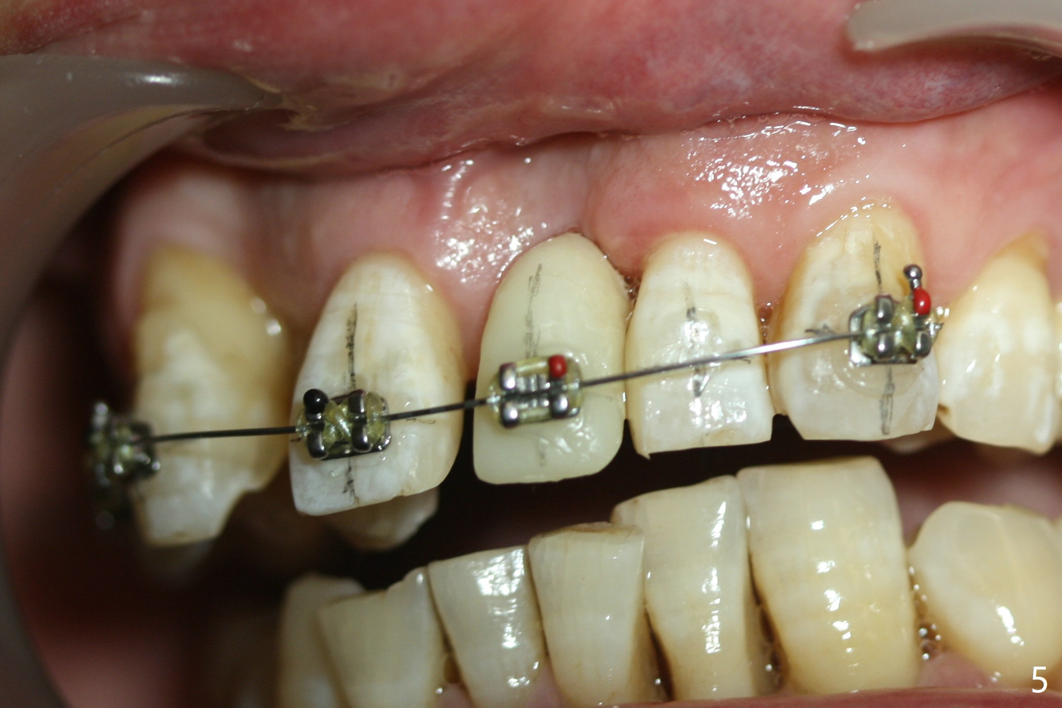 Nearly 7 months postop, the immediate provisional at UL1 is removed; with the mesial reduction of UL2 from 7 to 6 mm (Fig.1), an angled abutment is to be changed (4.5x15 degree, 2 mm cuff). A new provisional (Fig.2,3) co-incides with the facial midline. Brackets will be placed between UR4 to UL3 except UL2 (symptomatic once with chronic periodontitis) with initial proximal reduction between UR1-4 in preparation to correct cross bite of UR2. Twelve days later, the patient returns for UR5-UL3 bracketing after UR1-4 initial proximal reduction with 14 niti wire (Fig.4-6). UR1 moves mesial 20 days post open coil spring (Fig.7 arrow), while UL1 debracketes after permanent re-cementation of the temporary crown last visit (*, no re-bracketing, since it appears not essential). Before placement of 20 ss wire, diastemata are created by proximal reduction (Fig.8 *). In fact UR1 moves mesial, while UR3 does not move distal with the open coil. With placement of UR6 (implant) molar band, UR3 is distalized effectively. With sling shot, UR2 is almost labialized in one appointment (Fig.9). After consolidation of the diastemata between UR1-6 with power chains following UR2 cross bite correction (Fig.10), the restoration space for UL1 seems to be too large (Fig.11). Next visit, check the midlines, take 1-2 PAs for #7-9 and determine whether a straight abutment should be changed back and whether composite should be placed UR1 mesial to reduce the space. One week later, composite is added to the mesial surface of the tooth #8 to increase its width, while the provisional at #9 is relined to improve the interdental papilla (Fig.12). Minimal bone loss at UR2 is observed 8 months post banding (Fig.13), while the socket at UL1 seems to have healed except the most coronal 1 year 3 months postop (Fig.14 *). The margin of the abutment should be uneven, more coronal proximal than buccopalatal (Fig.15). The final crown has an open margin, partially due to less ideal trajectory (Fig.16 (black line: ideal trajectory, nearly 1 year 4 months postop)). Guided surgery could solve the problem. Sticky bone may restore the buccal plate defect. Die shows that the implant is palatally placed (Fig.17). CT will be taken to determine whether the implant perforates the palatal plate.