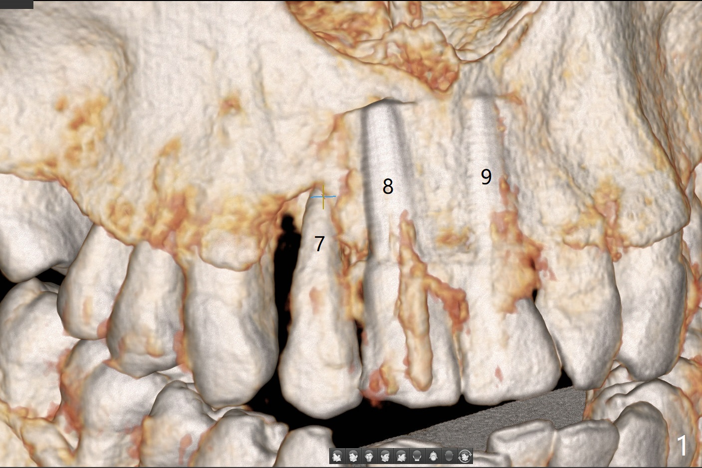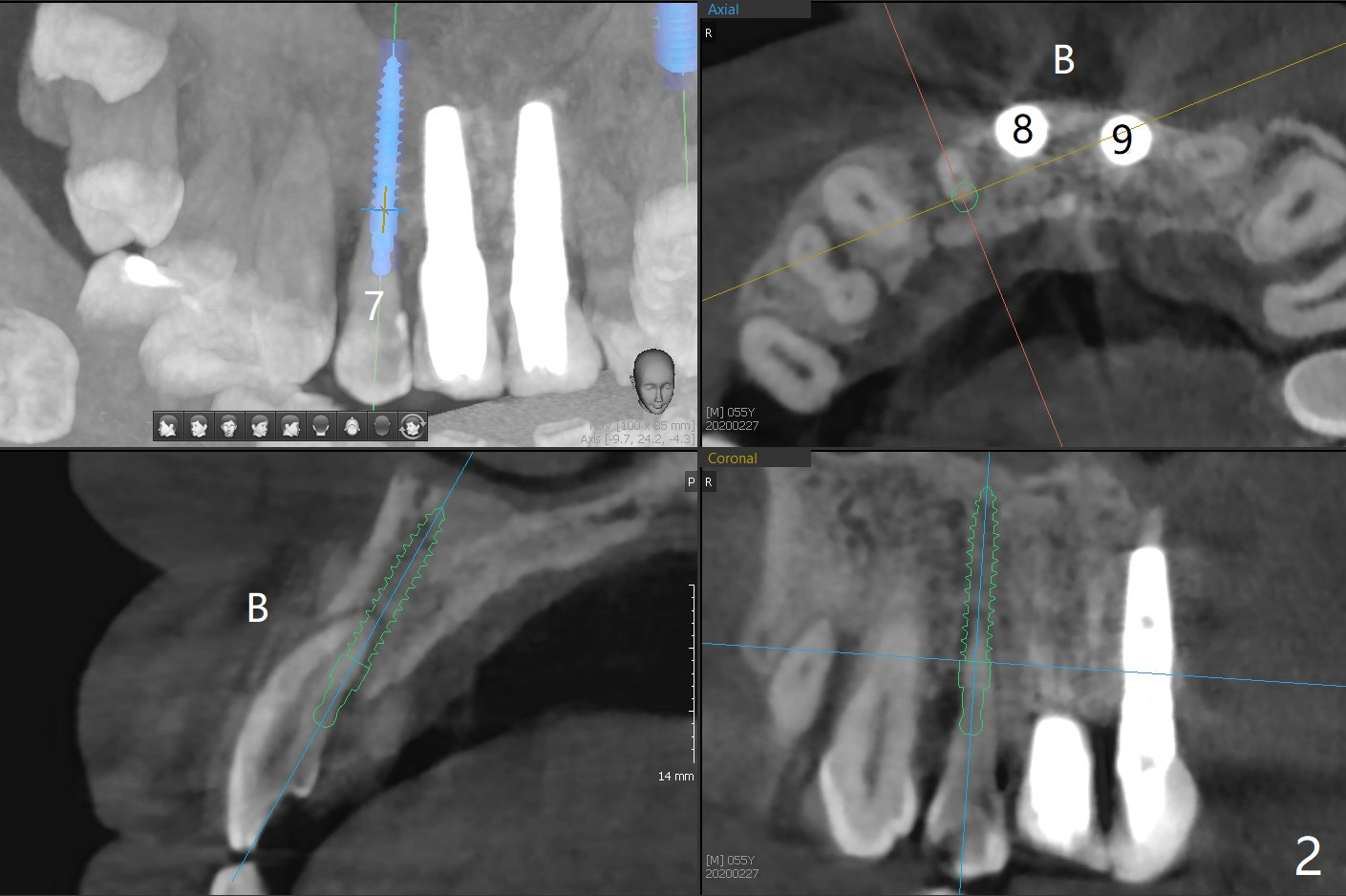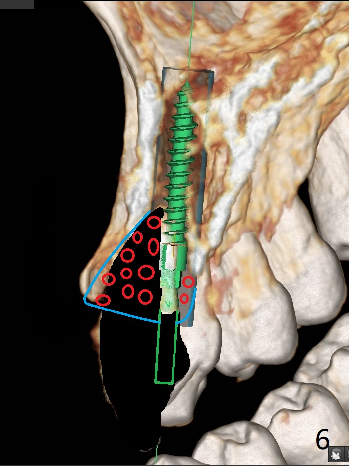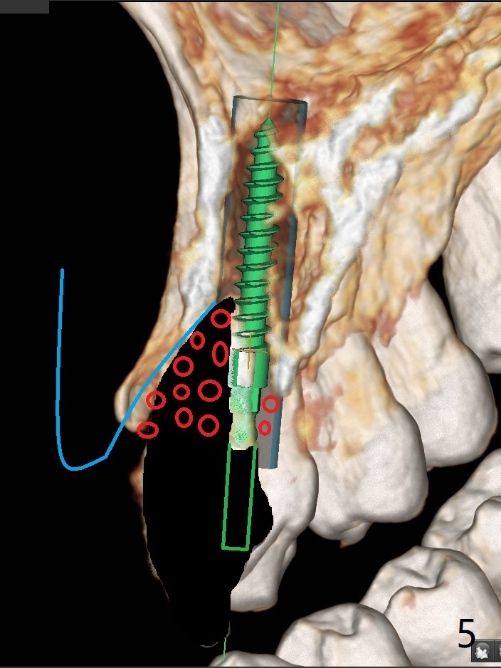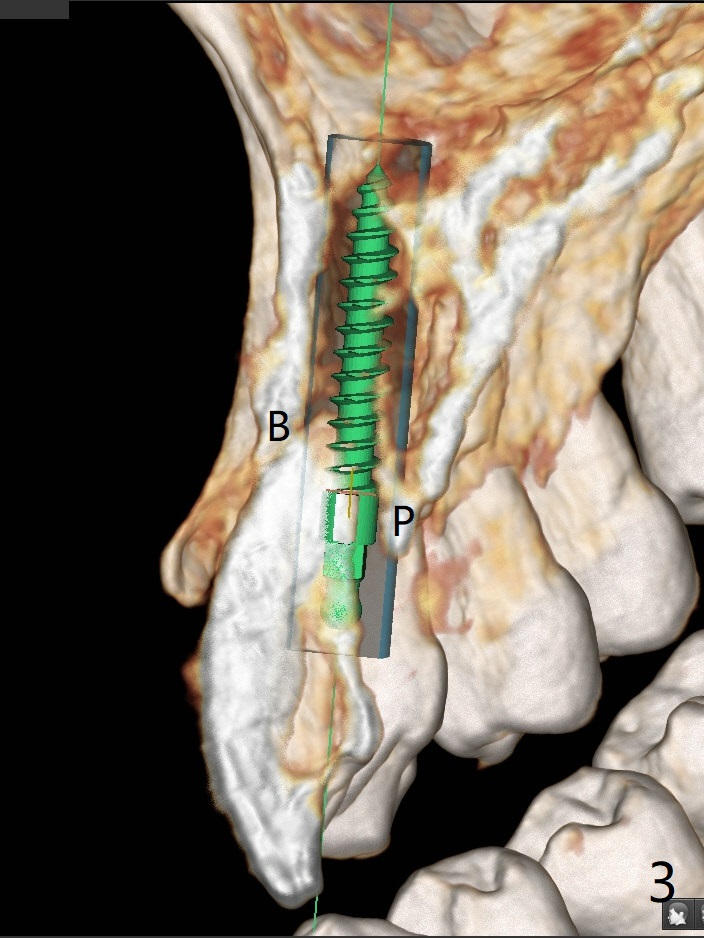 A 58-year-old man recently had sudden pain at #7 with labial plate loss (Fig.1 CT taken 3 years earlier). To avoid the labial placement of the large implants at #8, and 9, the implant at #7 will be smaller and palatally inserted (Fig.2). Fig.3 is a coronal section of 3D image of #7, showing the labial (B) and palatal (P) crests. After extraction (Fig.4 black), the narrow implant is placed between the crests (green). To repair the coronal labial plate, a piece of PRF membrane (Fig.5 blue) is placed inside the socket, followed by sticky bone (red circles). The portion of PRF membrane outside the socket will be flipped palatal, inserted into the abutment with a pre-punched hole and finally tucked underneath the palatal gingiva.