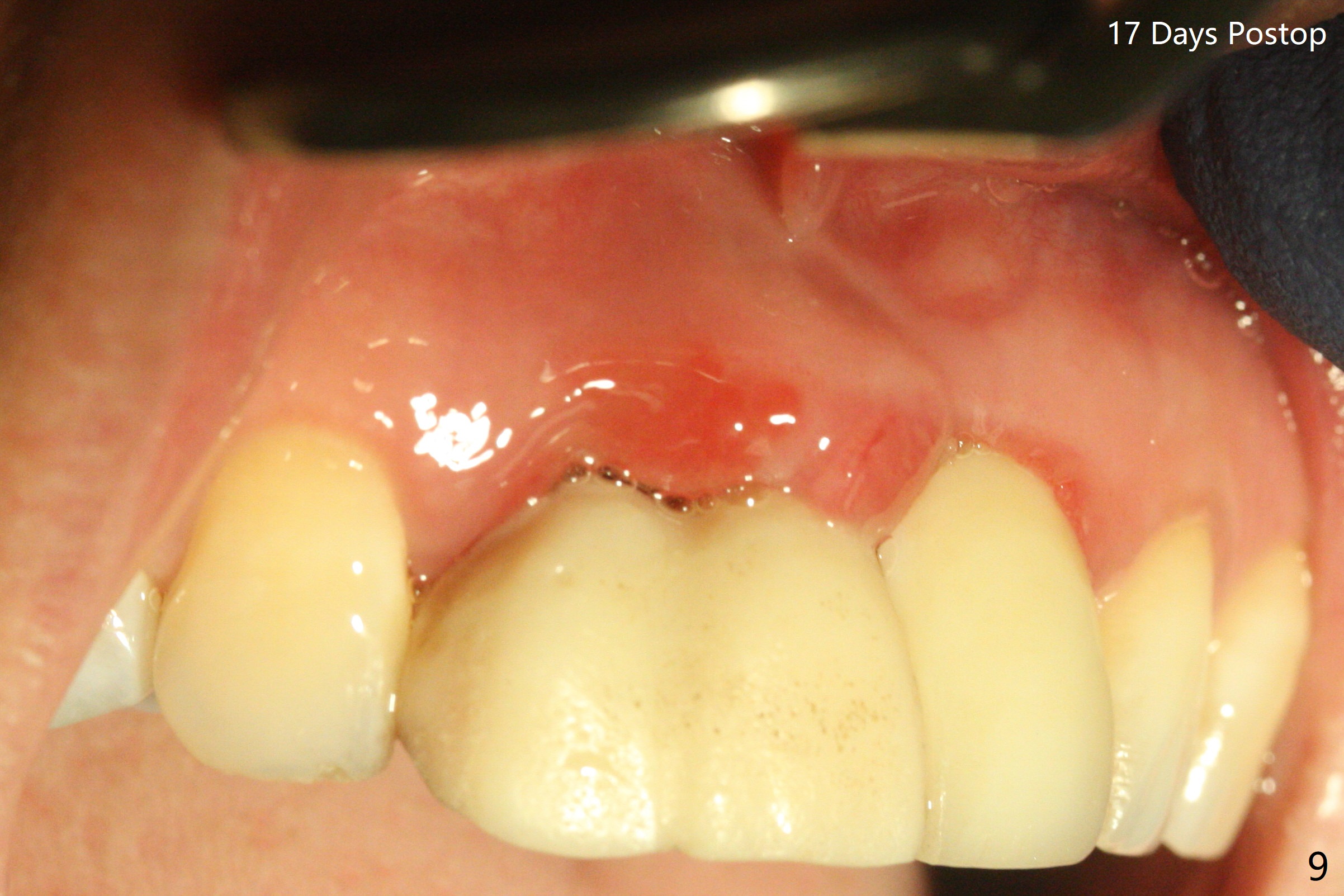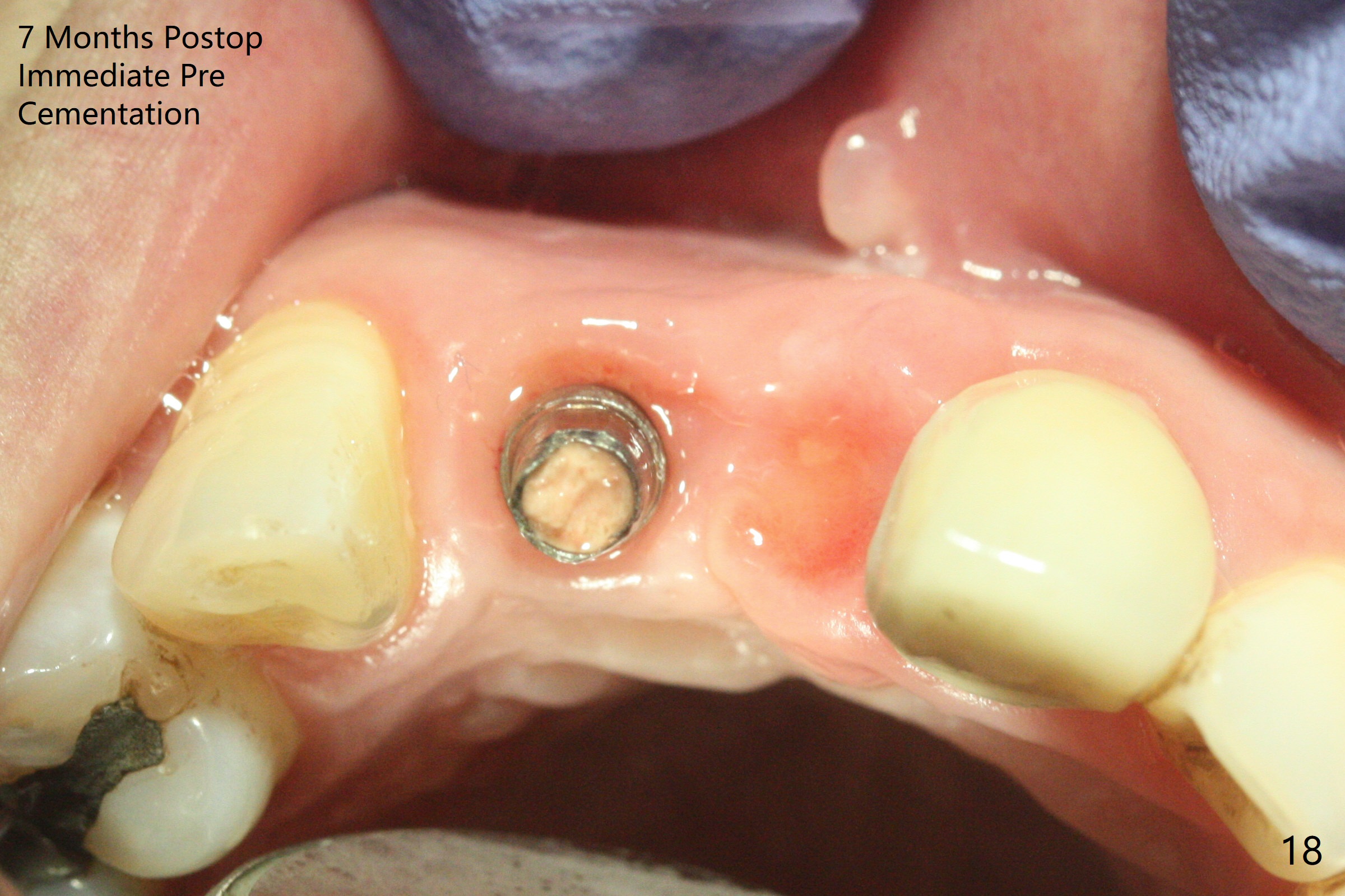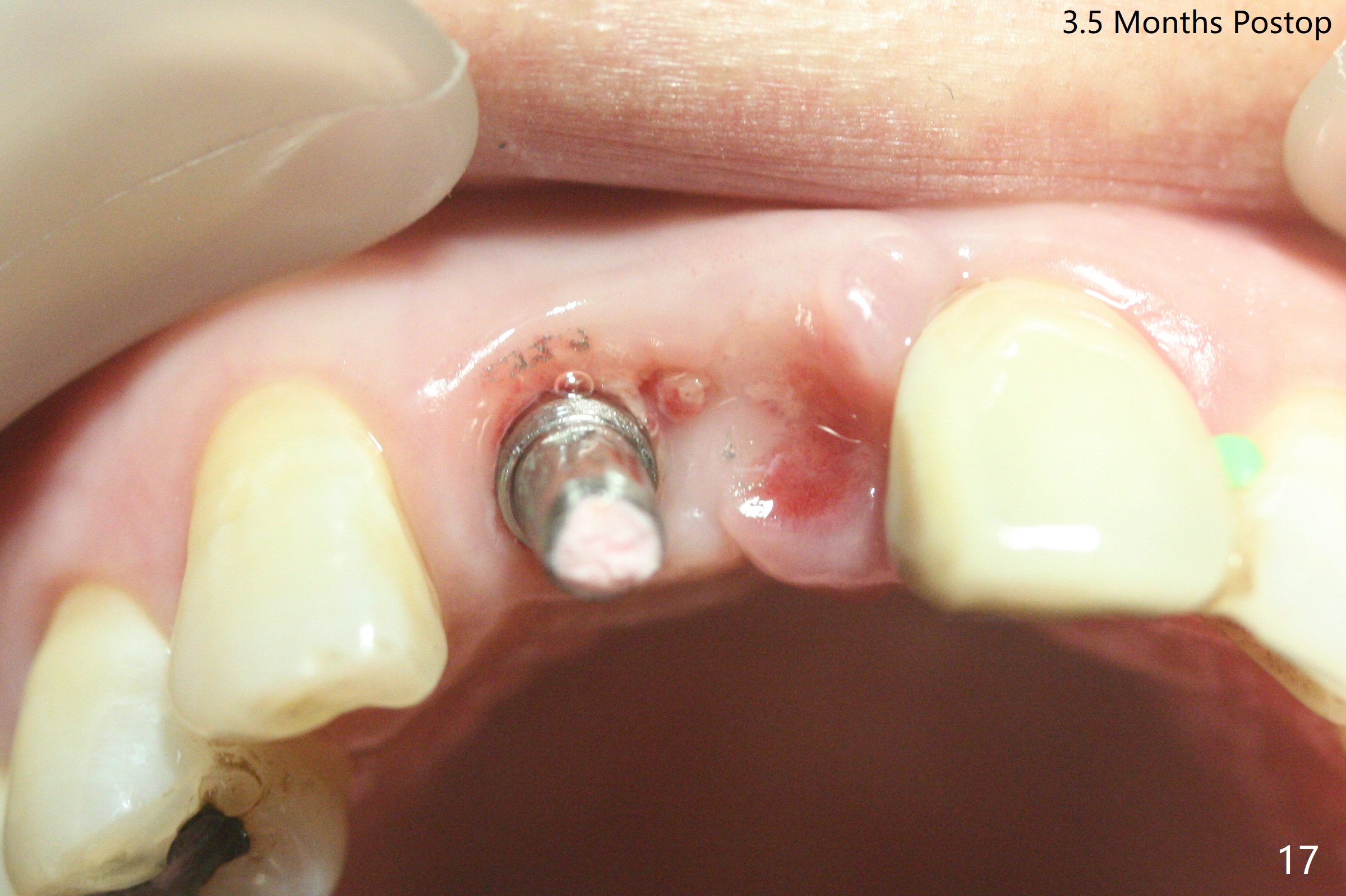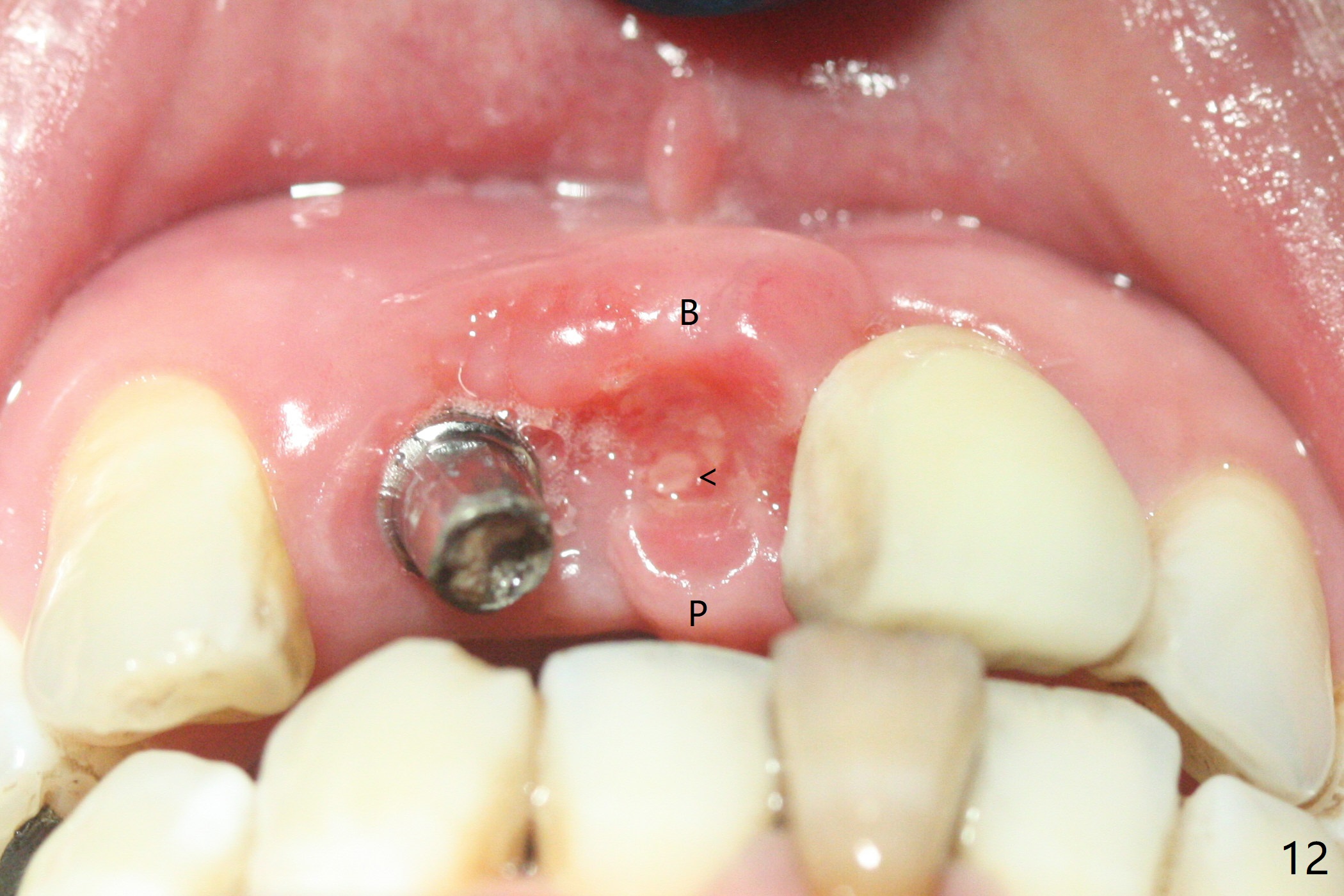 拆除部分桥发现:中,侧切牙牙龈红肿(图一),不利于切口和伤口愈合。不过还是在中切牙区切开,牙龈相当厚,有利于今后牙龈形成凹陷和乳头。坏消息是近远中距离太短,不利于植牙以及今后局部卫生维护,所以决定只在侧切牙种植(图二,三),完成钻洞后,颊侧根尖穿孔植骨,然后植入植体,即刻放置修复基台(图四 (*:牙龈乳头)),暴露基台牙龈缘,制作临时悬臂桥 (图五),两个中切牙牙冠长度差不多,插入临时桥时颊侧牙龈乳头基本形成(图六:*),缝合前颊侧,腭侧牙龈瓣下放置粘性骨块(图七,八:* )和PRF膜(图七:^)。最后使用牙周敷料。但愿术后牙龈炎症消失,形成良好牙龈乳头和pontic concavity。 其实由于口腔卫生习惯,术后十七天颊侧牙龈仍红肿(图九),而腭侧正常。如果口腔卫生改善而红肿依然存在,让实验室制作临时桥。术后一个月颊侧牙龈红肿好些(图十),好像骨粉丢失少许,可能与水枪使用有关。右上1牙冠显得太短(*)。也太肥大,因为右上1切缘太颊侧,与左上1对比(图十一:*)。由于颊侧牙龈(图十二:B)术中推向颊侧,与腭侧(P)牙龈之间放置大量粘性骨粉,术后一个月骨粉(<)形成牙龈,形成凹陷。颊侧萎缩不再明显了。右上1牙冠颈部多加些树脂,牙齿就显得长的多(图十三:箭头)。与侧切牙之间颈部故意留下间隙(*),让牙龈入位(空箭头),形成龈乳头。当右上1临时牙冠切缘(图十四:*)移到腭侧,外形改观不少。下次改善侧切牙唇侧。术后两个月三个星期牙龈红肿好像减轻,牙龈没有进入切牙间隙,干脆用树脂关闭(图十五:> <)。下次减少侧切牙切缘(^),适当增加中切牙长度(上提牙龈)。术后3.5个月植体好像整合,基台完全就位(图十六)。术后3.5个月Pontic凹陷形成,但是1,2之间龈乳头始终无法形成(图十七)。以后类似病例应该多种植一个。此例草率取模,可能需要临时粘固,观察植体近中颊侧所谓瘘道,必要刮治。由于比色不佳,需要实验室颜色更改,病人强化卫生,术后七个月,永久性牙冠粘固前,局部牙龈健康(图十八)。