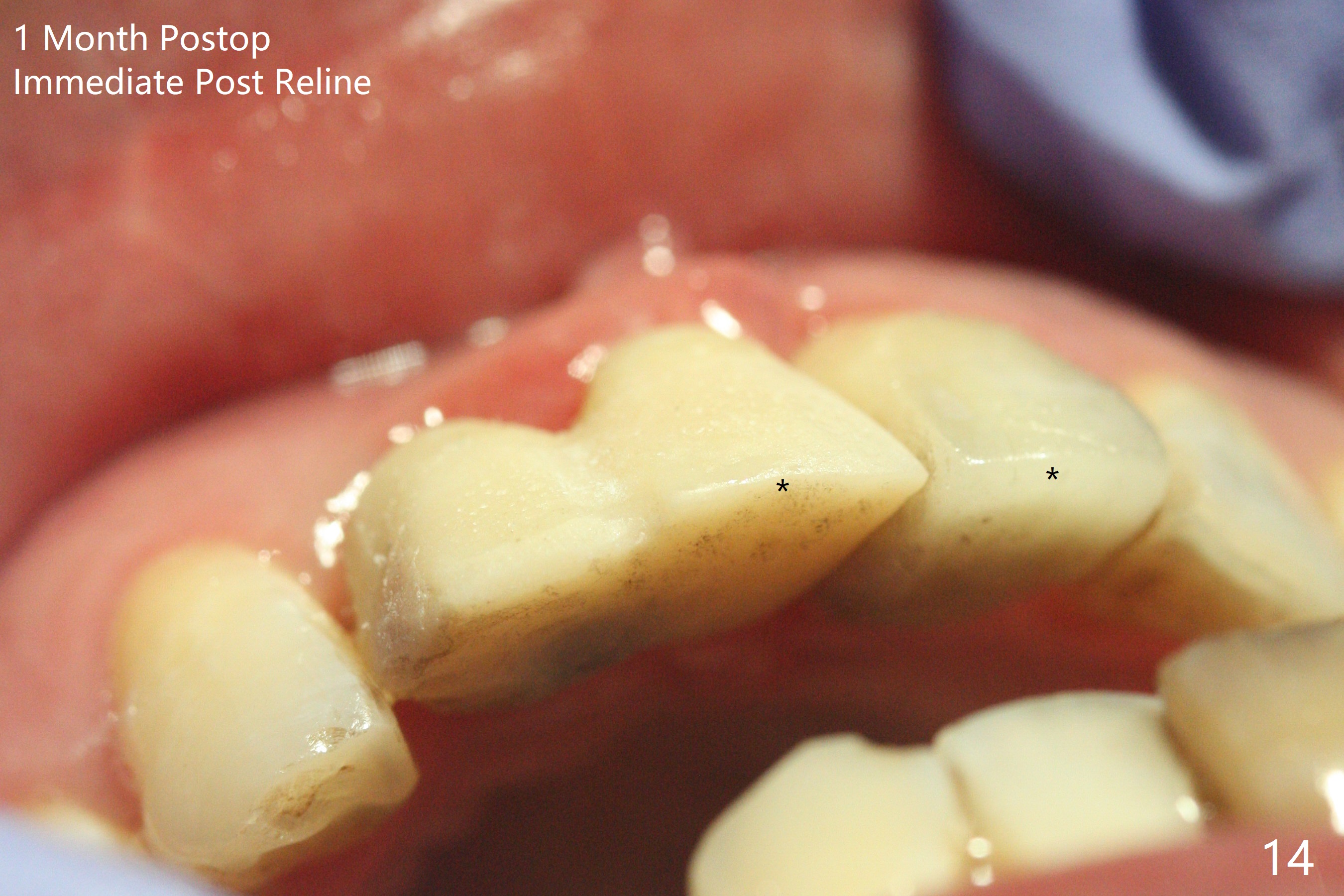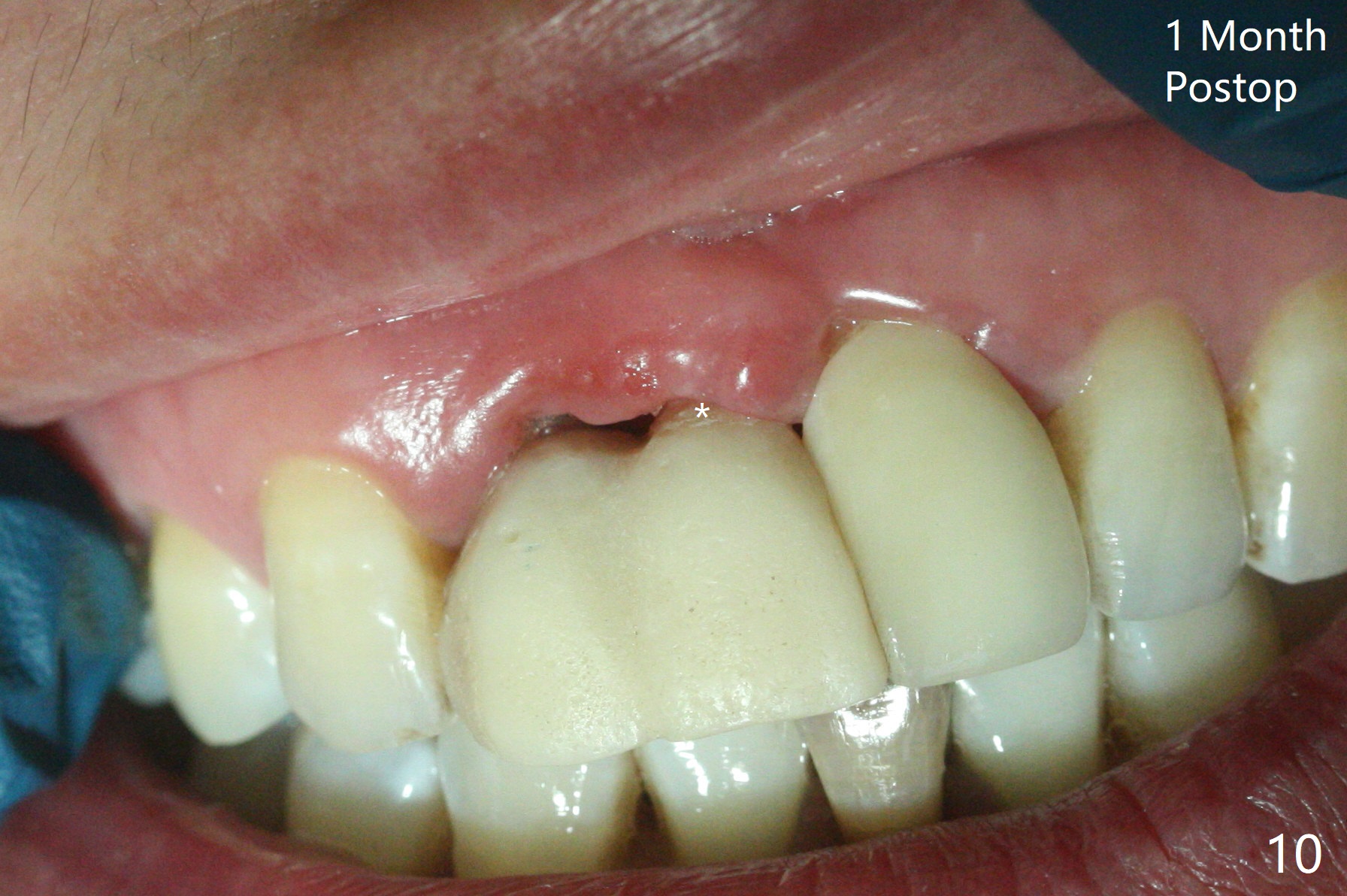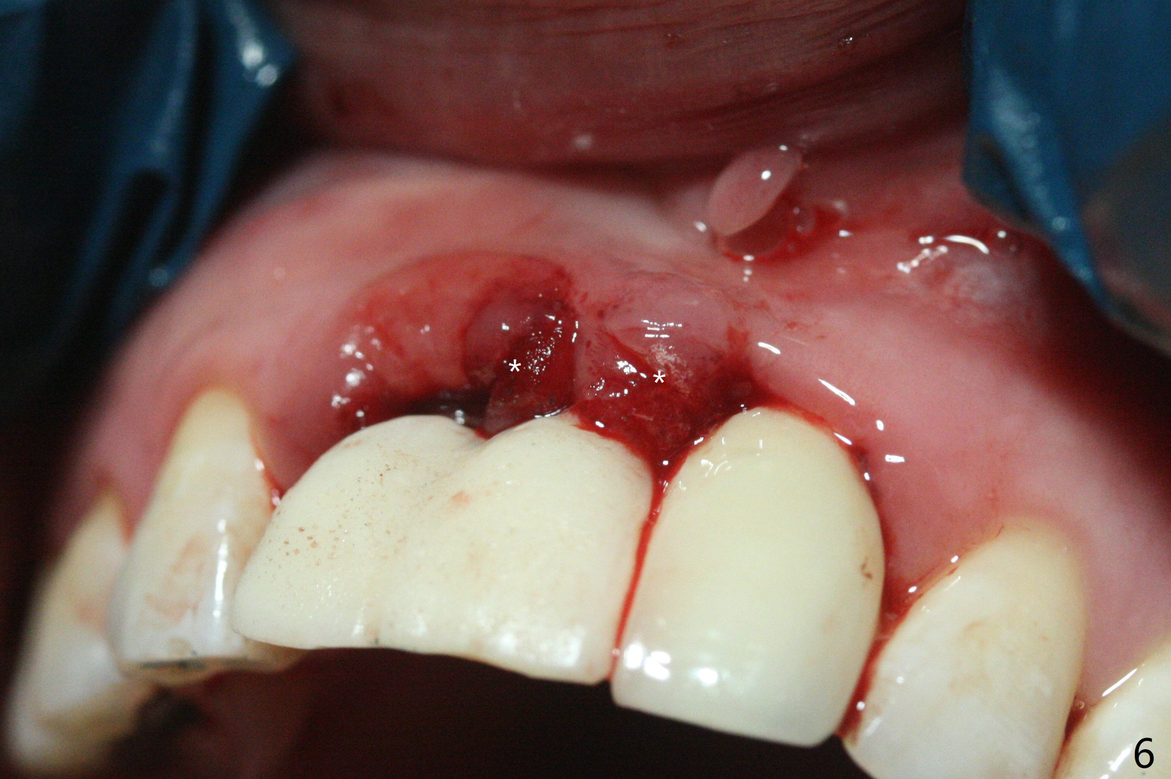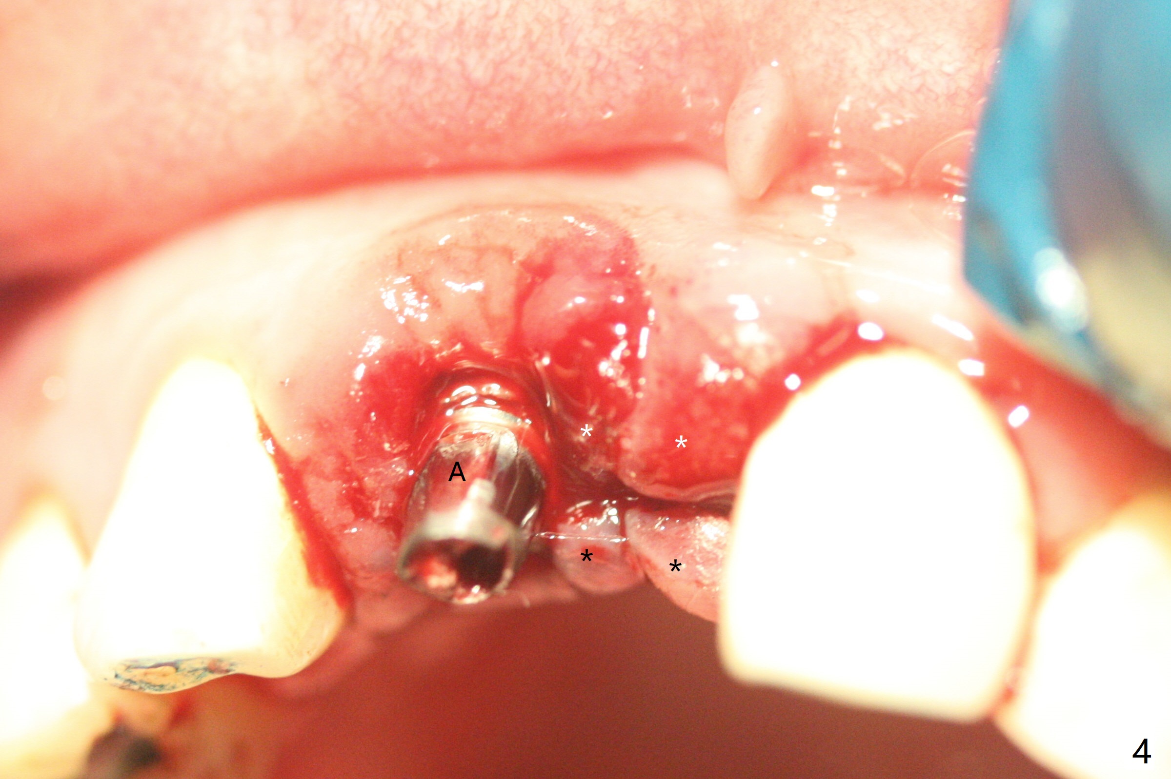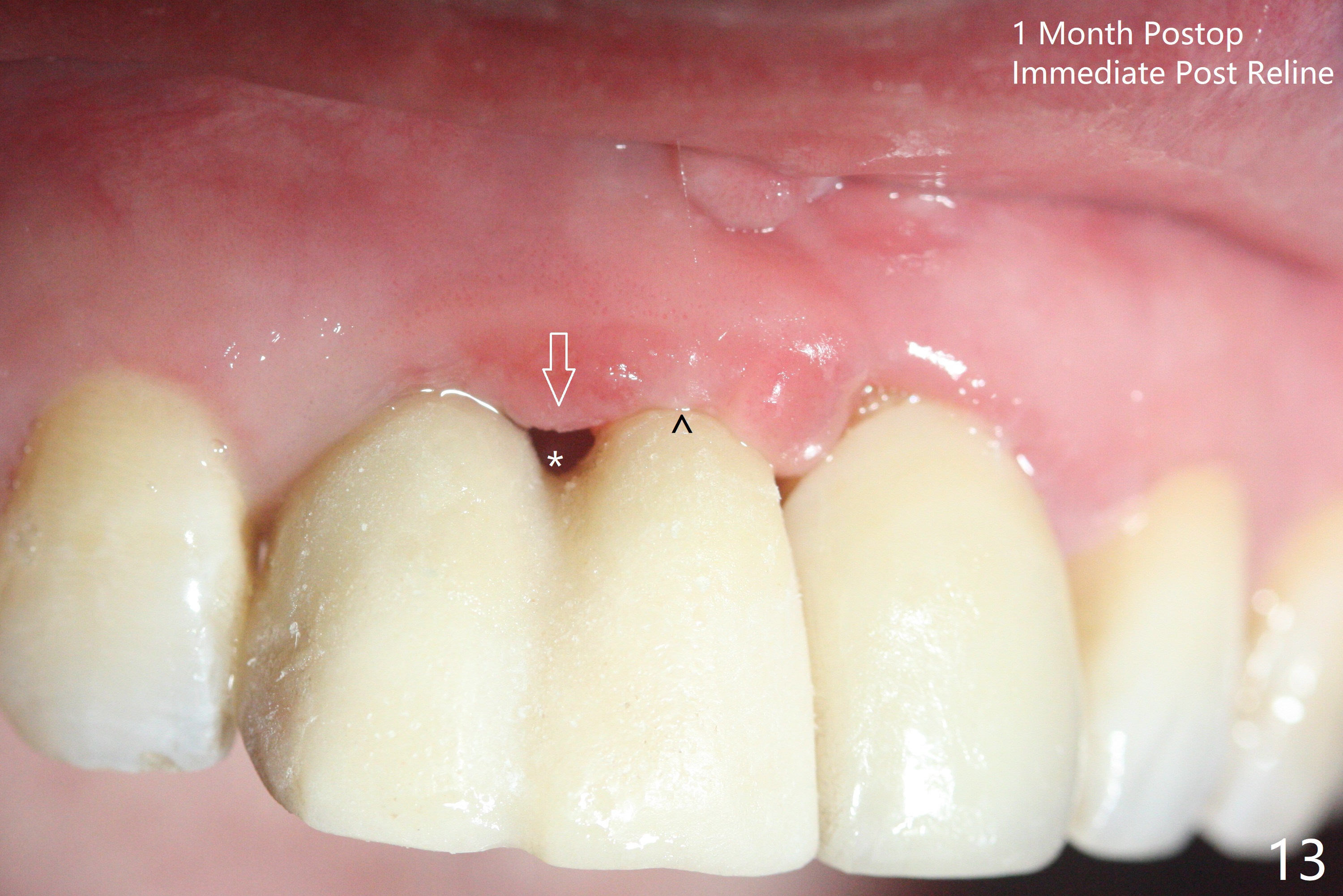 拆除部分桥发现:中,侧切牙牙龈红肿(图一),不利于切口和伤口愈合。不过还是在中切牙区切开,牙龈相当厚,有利于今后牙龈形成凹陷和乳头。坏消息是近远中距离太短,不利于植牙以及今后局部卫生维护,所以决定只在侧切牙种植(图二,三),完成钻洞后,颊侧根尖穿孔植骨,然后植入植体,即刻放置修复基台(图四 (*:牙龈乳头)),暴露基台牙龈缘,制作临时悬臂桥 (图五),两个中切牙牙冠长度差不多,插入临时桥时颊侧牙龈乳头基本形成(图六:*),缝合前颊侧,腭侧牙龈瓣下放置粘性骨块(图七,八:* )和PRF膜(图七:^)。最后使用牙周敷料。但愿术后牙龈炎症消失,形成良好牙龈乳头和pontic concavity。 其实由于口腔卫生习惯,术后十七天颊侧牙龈仍红肿(图九),而腭侧正常。如果口腔卫生改善而红肿依然存在,让实验室制作临时桥。术后一个月颊侧牙龈红肿好些(图十),好像骨粉丢失少许,可能与水枪使用有关。右上1牙冠显得太短(*)。也太肥大,因为右上1切缘太颊侧,与左上1对比(图十一:*)。由于颊侧牙龈(图十二:B)术中推向颊侧,与腭侧(P)牙龈之间放置大量粘性骨粉,术后一个月骨粉(<)形成牙龈,形成凹陷。颊侧萎缩不再明显了。右上1牙冠颈部多加些树脂,牙齿就显得长的多(图十三:箭头)。与侧切牙之间颈部故意留下间隙(*),让牙龈入位(空箭头),形成龈乳头。当右上1临时牙冠切缘(图十四:*)移到腭侧,外形改观不少。下次改善侧切牙唇侧。术后两个月三个星期牙龈红肿好像减轻,牙龈没有进入切牙间隙,干脆用树脂关闭(图十五:> <)。下次减少侧切牙切缘(^),适当增加中切牙长度(上提牙龈)。术后3.5个月植体好像整合,基台完全就位(图十六)。术后3.5个月Pontic凹陷形成,但是1,2之间龈乳头始终无法形成(图十七)。以后类似病例应该多种植一个。此例草率取模,可能需要临时粘固,观察植体近中颊侧所谓瘘道,必要刮治。由于比色不佳,需要实验室颜色更改,病人强化卫生,术后七个月,永久性牙冠粘固前,局部牙龈健康(图十八)。