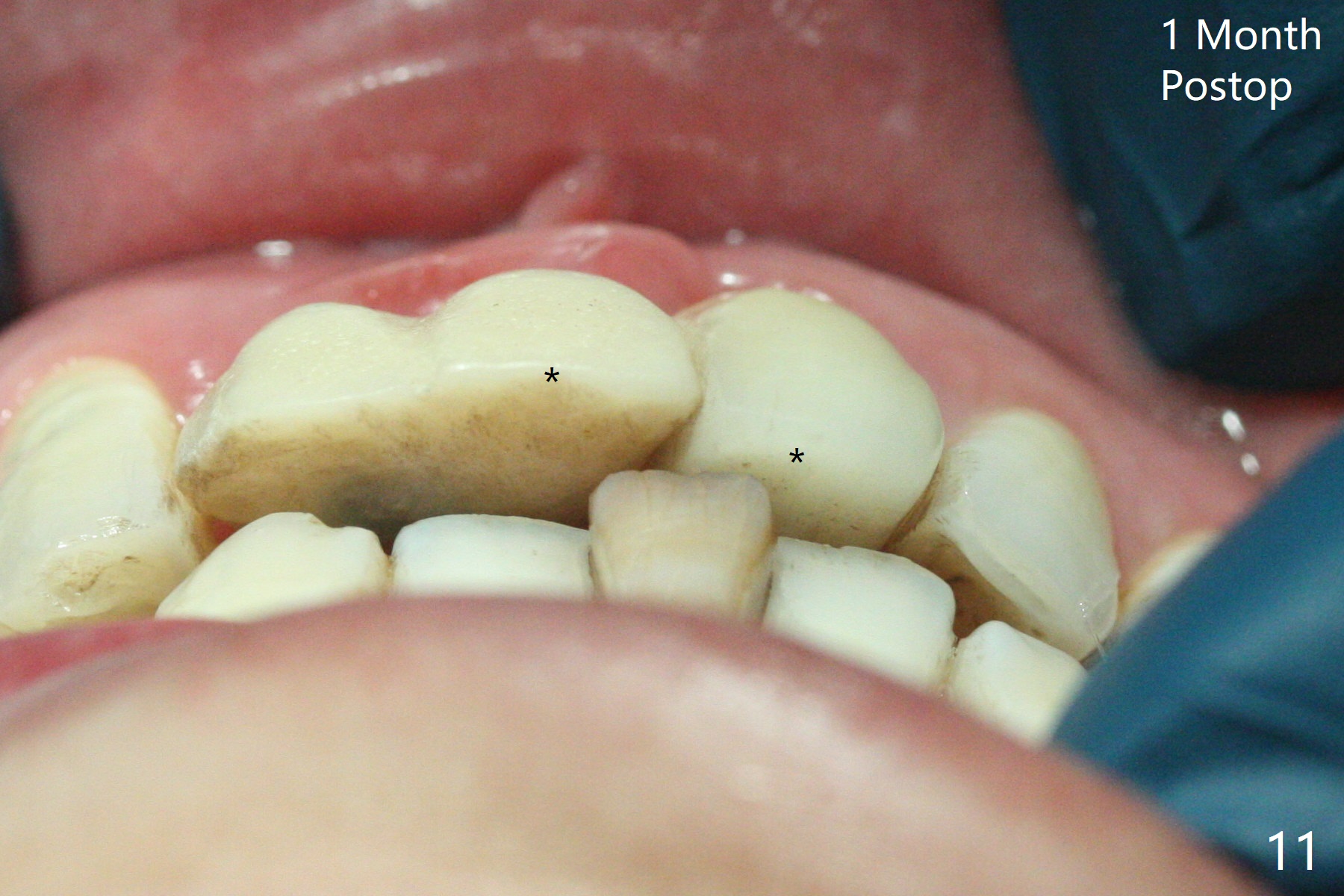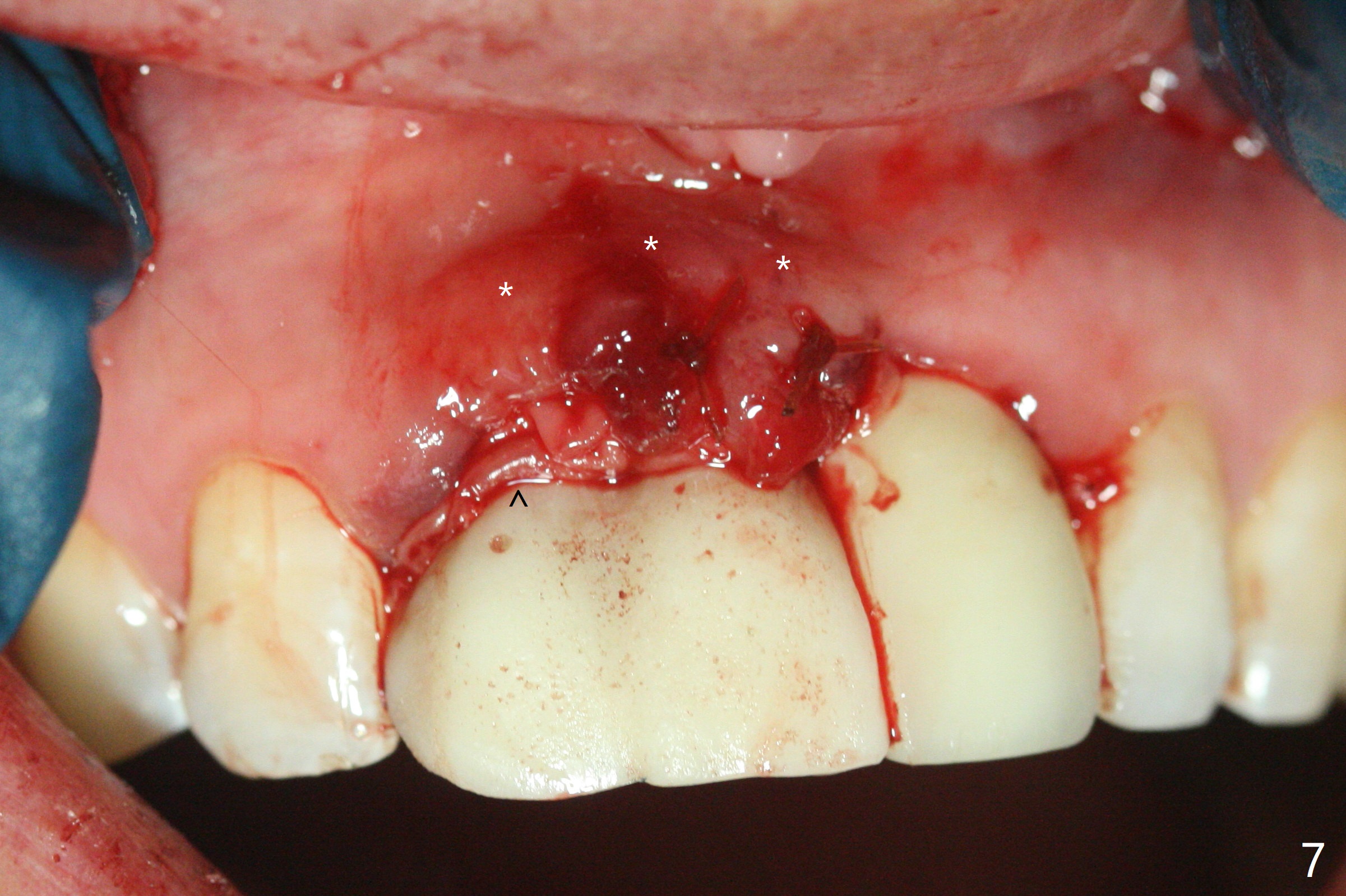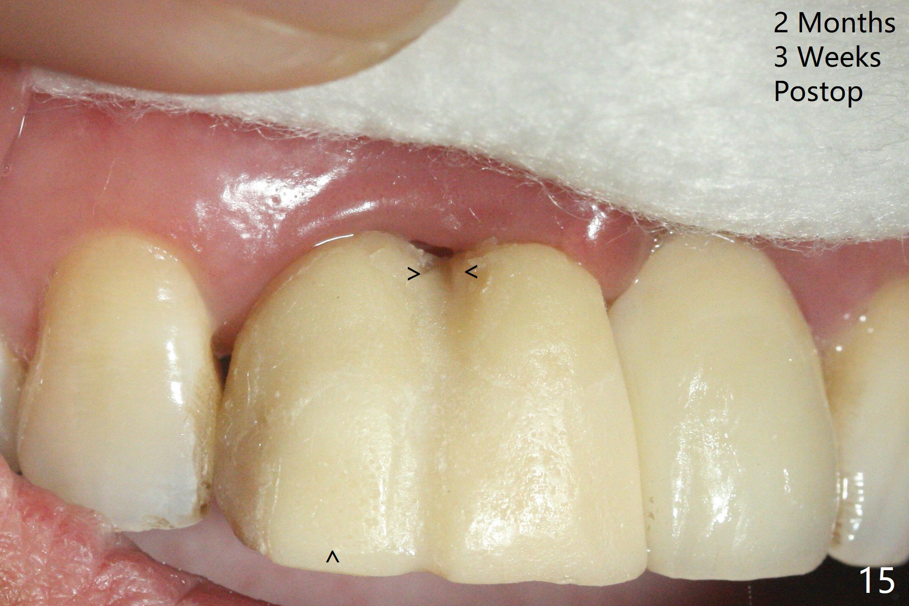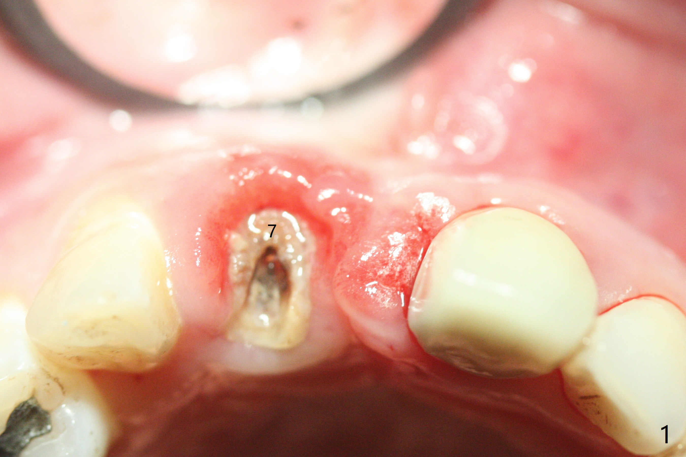 拆除部分桥发现:中,侧切牙牙龈红肿(图一),不利于切口和伤口愈合。不过还是在中切牙区切开,牙龈相当厚,有利于今后牙龈形成凹陷和乳头。坏消息是近远中距离太短,不利于植牙以及今后局部卫生维护,所以决定只在侧切牙种植(图二,三),完成钻洞后,颊侧根尖穿孔植骨,然后植入植体,即刻放置修复基台(图四 (*:牙龈乳头)),暴露基台牙龈缘,制作临时悬臂桥 (图五),两个中切牙牙冠长度差不多,插入临时桥时颊侧牙龈乳头基本形成(图六:*),缝合前颊侧,腭侧牙龈瓣下放置粘性骨块(图七,八:* )和PRF膜(图七:^)。最后使用牙周敷料。但愿术后牙龈炎症消失,形成良好牙龈乳头和pontic concavity。 其实由于口腔卫生习惯,术后十七天颊侧牙龈仍红肿(图九),而腭侧正常。如果口腔卫生改善而红肿依然存在,让实验室制作临时桥。术后一个月颊侧牙龈红肿好些(图十),好像骨粉丢失少许,可能与水枪使用有关。右上1牙冠显得太短(*)。也太肥大,因为右上1切缘太颊侧,与左上1对比(图十一:*)。由于颊侧牙龈(图十二:B)术中推向颊侧,与腭侧(P)牙龈之间放置大量粘性骨粉,术后一个月骨粉(<)形成牙龈,形成凹陷。颊侧萎缩不再明显了。右上1牙冠颈部多加些树脂,牙齿就显得长的多(图十三:箭头)。与侧切牙之间颈部故意留下间隙(*),让牙龈入位(空箭头),形成龈乳头。当右上1临时牙冠切缘(图十四:*)移到腭侧,外形改观不少。下次改善侧切牙唇侧。术后两个月三个星期牙龈红肿好像减轻,牙龈没有进入切牙间隙,干脆用树脂关闭(图十五:> <)。下次减少侧切牙切缘(^),适当增加中切牙长度(上提牙龈)。术后3.5个月植体好像整合,基台完全就位(图十六)。术后3.5个月Pontic凹陷形成,但是1,2之间龈乳头始终无法形成(图十七)。以后类似病例应该多种植一个。此例草率取模,可能需要临时粘固,观察植体近中颊侧所谓瘘道,必要刮治。由于比色不佳,需要实验室颜色更改,病人强化卫生,术后七个月,永久性牙冠粘固前,局部牙龈健康(图十八)。