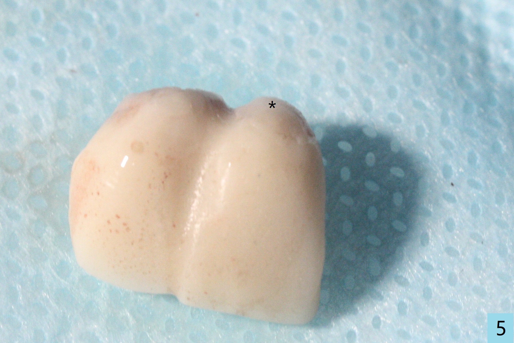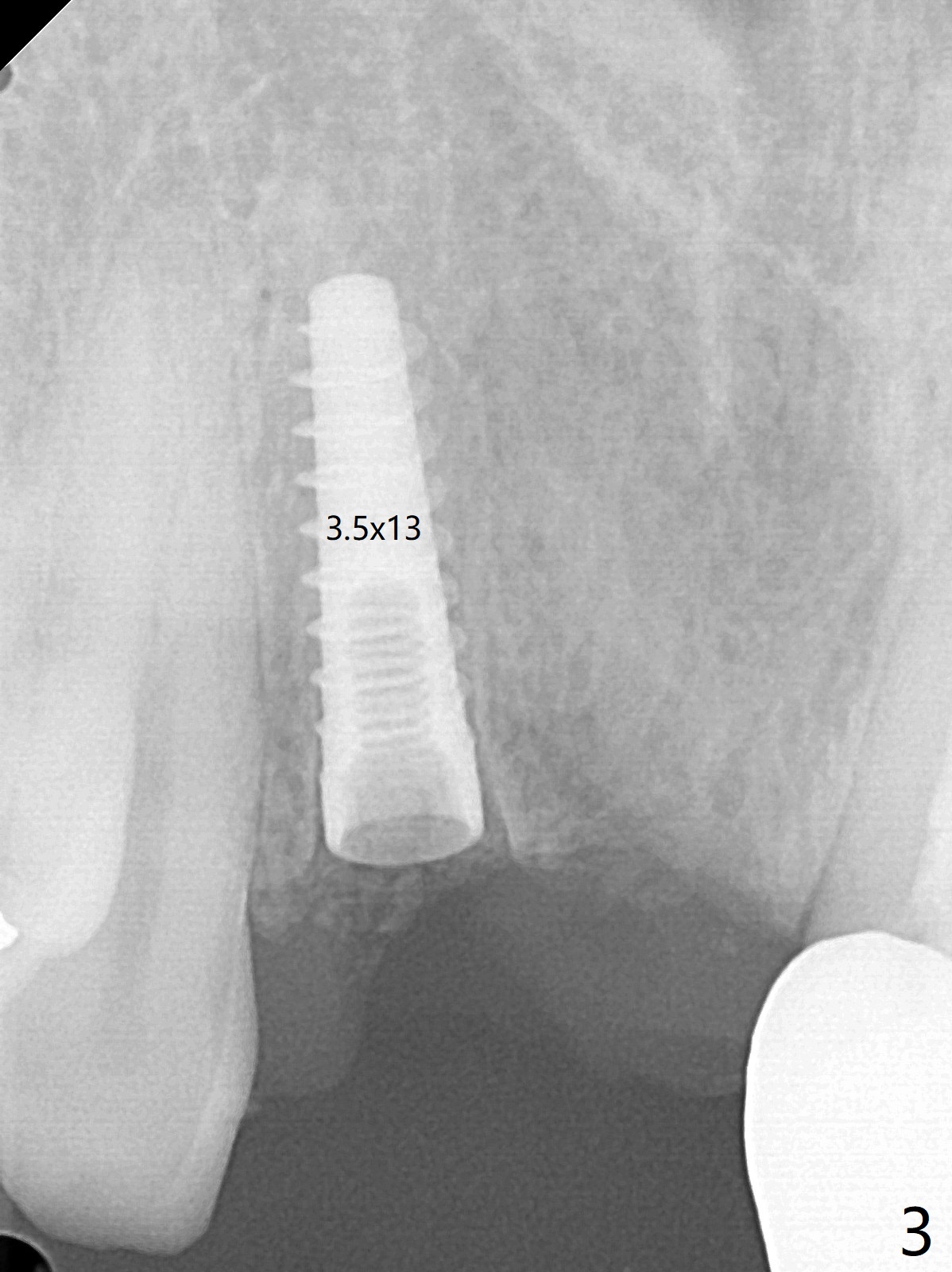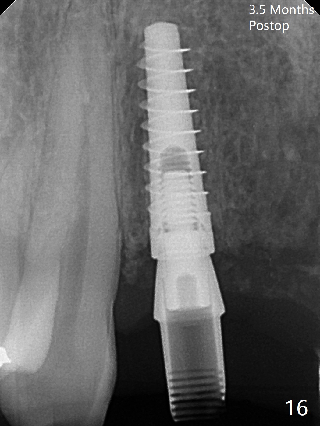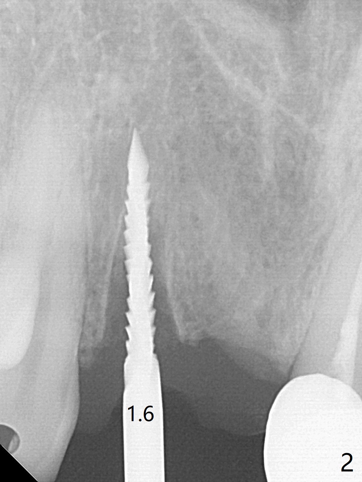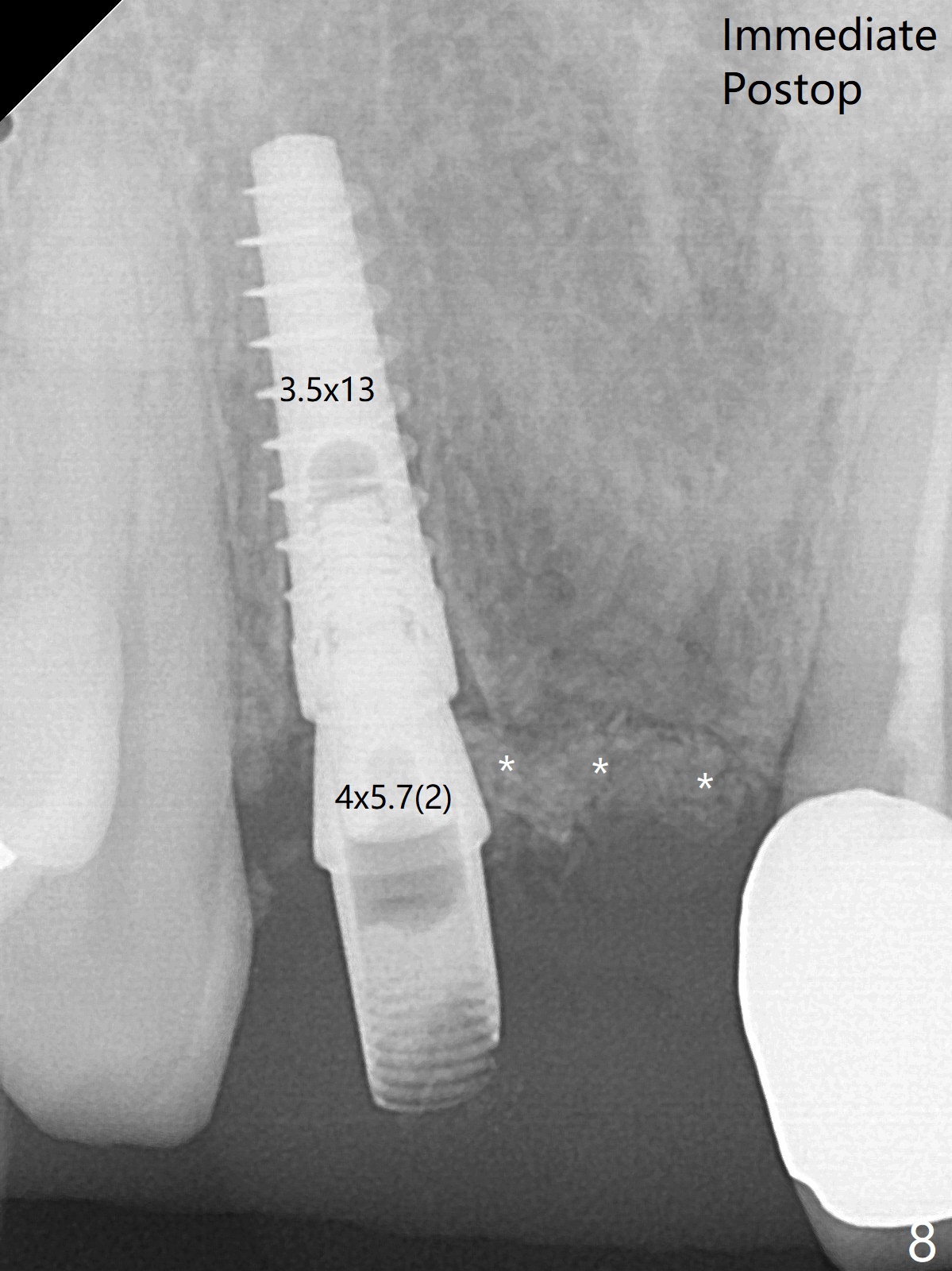 拆除部分桥发现:中,侧切牙牙龈红肿(图一),不利于切口和伤口愈合。不过还是在中切牙区切开,牙龈相当厚,有利于今后牙龈形成凹陷和乳头。坏消息是近远中距离太短,不利于植牙以及今后局部卫生维护,所以决定只在侧切牙种植(图二,三),完成钻洞后,颊侧根尖穿孔植骨,然后植入植体,即刻放置修复基台(图四 (*:牙龈乳头)),暴露基台牙龈缘,制作临时悬臂桥 (图五),两个中切牙牙冠长度差不多,插入临时桥时颊侧牙龈乳头基本形成(图六:*),缝合前颊侧,腭侧牙龈瓣下放置粘性骨块(图七,八:* )和PRF膜(图七:^)。最后使用牙周敷料。但愿术后牙龈炎症消失,形成良好牙龈乳头和pontic concavity。 其实由于口腔卫生习惯,术后十七天颊侧牙龈仍红肿(图九),而腭侧正常。如果口腔卫生改善而红肿依然存在,让实验室制作临时桥。术后一个月颊侧牙龈红肿好些(图十),好像骨粉丢失少许,可能与水枪使用有关。右上1牙冠显得太短(*)。也太肥大,因为右上1切缘太颊侧,与左上1对比(图十一:*)。由于颊侧牙龈(图十二:B)术中推向颊侧,与腭侧(P)牙龈之间放置大量粘性骨粉,术后一个月骨粉(<)形成牙龈,形成凹陷。颊侧萎缩不再明显了。右上1牙冠颈部多加些树脂,牙齿就显得长的多(图十三:箭头)。与侧切牙之间颈部故意留下间隙(*),让牙龈入位(空箭头),形成龈乳头。当右上1临时牙冠切缘(图十四:*)移到腭侧,外形改观不少。下次改善侧切牙唇侧。术后两个月三个星期牙龈红肿好像减轻,牙龈没有进入切牙间隙,干脆用树脂关闭(图十五:> <)。下次减少侧切牙切缘(^),适当增加中切牙长度(上提牙龈)。术后3.5个月植体好像整合,基台完全就位(图十六)。术后3.5个月Pontic凹陷形成,但是1,2之间龈乳头始终无法形成(图十七)。以后类似病例应该多种植一个。此例草率取模,可能需要临时粘固,观察植体近中颊侧所谓瘘道,必要刮治。由于比色不佳,需要实验室颜色更改,病人强化卫生,术后七个月,永久性牙冠粘固前,局部牙龈健康(图十八)。