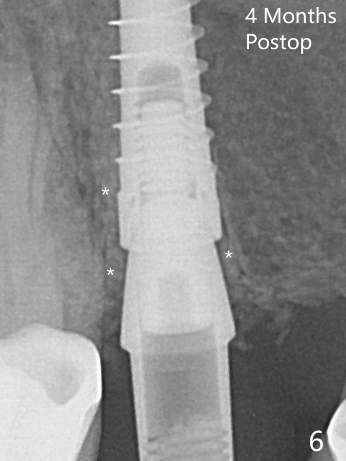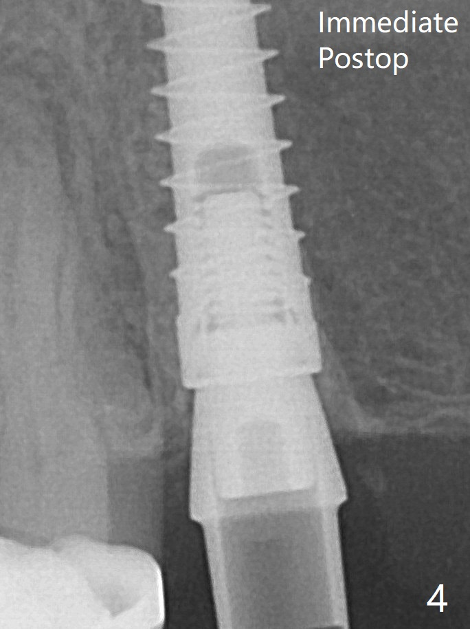 A relatively large 2-piece implant (3.5x13 mm) is placed (Fig.3), but a 4x5.7(2) mm abutment is incompletely seated (<). Use of 4.6 and 5.6 mm bone profile drills does not appear to solve the problem. The implant is backed up to the supra-gingival level so that it seems easier physically to insert the same abutment into the implant securely. Then both of them are torqued into the place together (Fig.4). The bone graft remains in place 4 months postop (Fig.6).