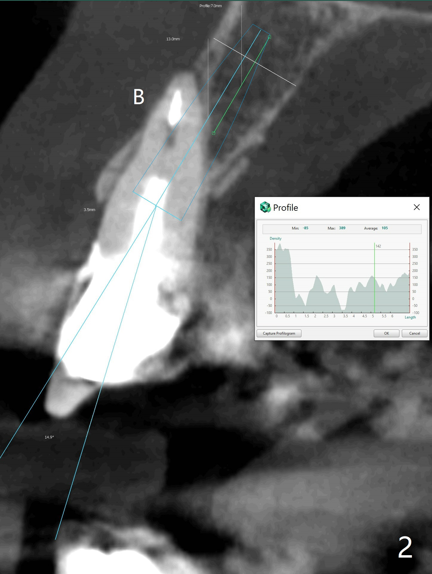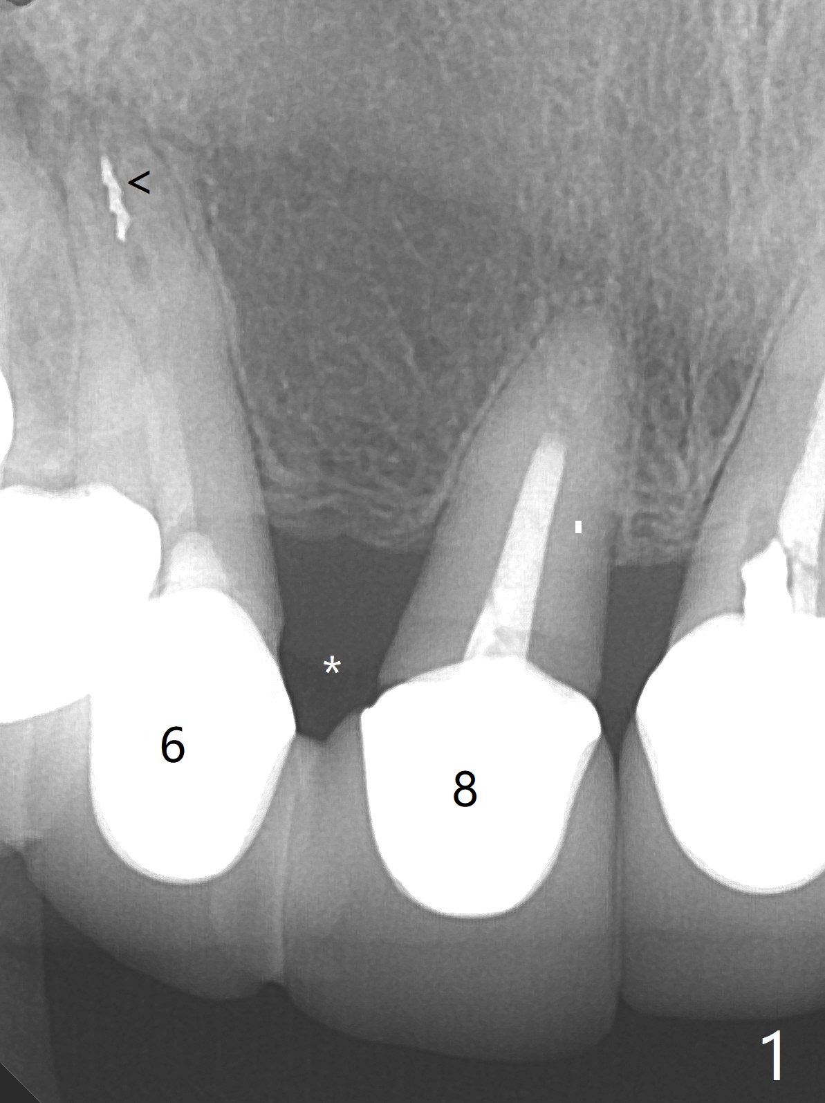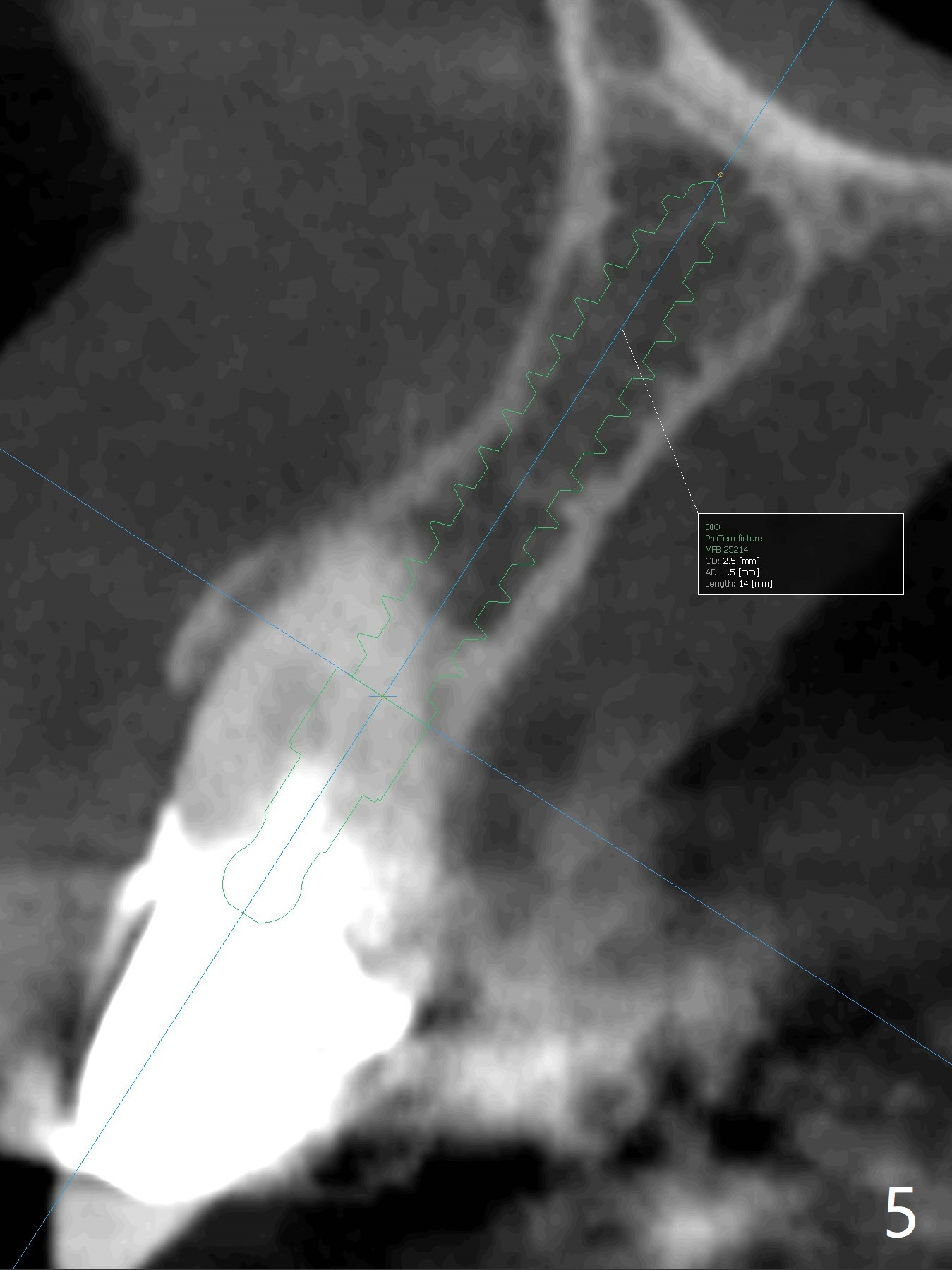 A 67-year-old woman has multiple restoration (difficult for guide preparation). The tooth #6 fractures equigingival with a separated file (Fig.1 <). Because of missing #7, the gingival embrasure between #6 and 8 is large (*). To reduce it, the mesial crest will be trimmed by using 6 mm profile drill after placement of a 3.5x13 mm FC implant (low bone density) and a narrow temporary abutment is going to be used to squeeze the papilla coronally and mesially. In a coronal section, osteotomy will be initiated in the middle of the palatal slope of the socket (Fig.2). A 4 mm x15 degree ~3 mm cuff angled abutment may be used before impression. Take preop photos to show the large gingival embrasure between #6 and 8. The other way to reduce the gingival embrasure is to place an implant mesially. It appears that a 3.5 mm implant is too large for the mesial ridge (Fig.3), while a 2.5 mm one is proper (Fig.4,5).
