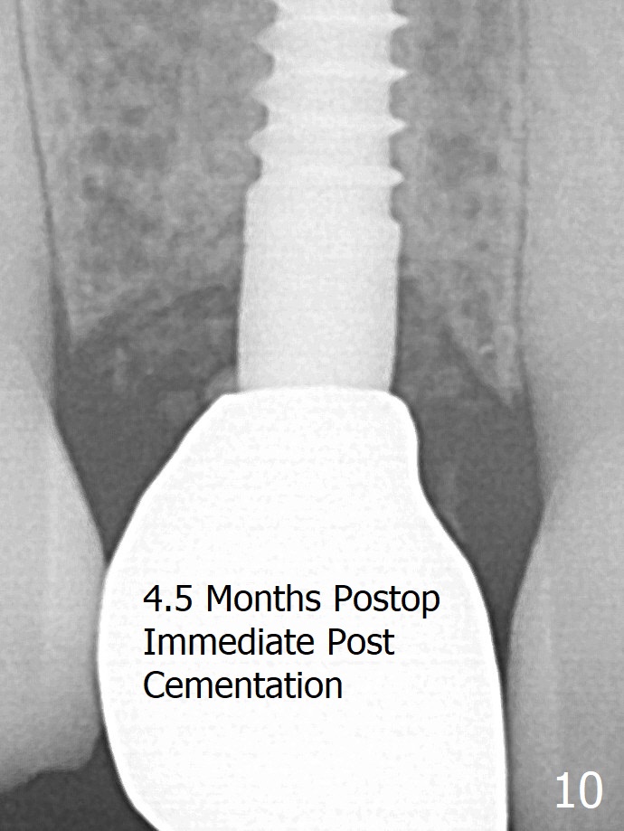 After adjustment of the trajectory of osteotomy (Fig.5), a 3x16(2) mm 1-piece implant is placed within normal limit (10-15 Ncm, Fig.6)). In fact bone graft is placed before (^ arrowhead; to repair apical buccal plate perforation) and after (*) implantation. The bone graft becomes more organized 3 months postop (Fig.9) and continues to do so 4.5 months postop (Fig.10).术后4.5个月骨粉形态继续变化(图十)。