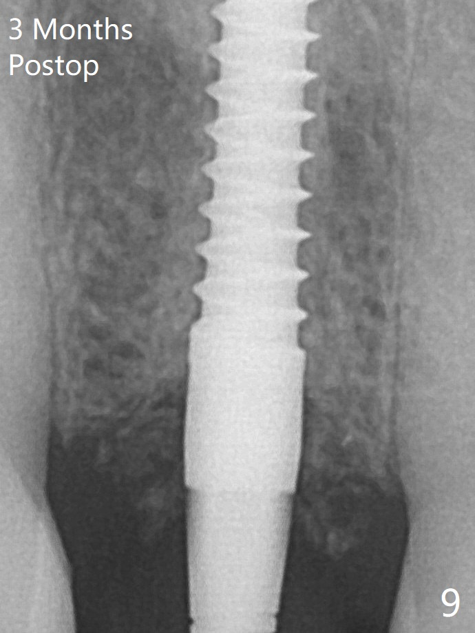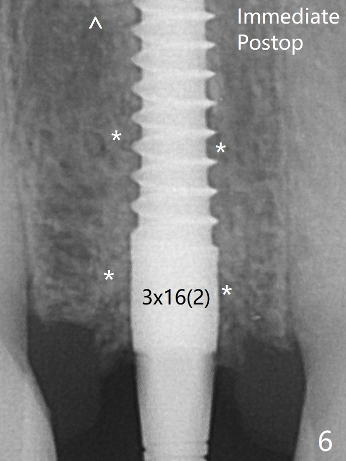After adjustment of the trajectory of osteotomy (Fig.5), a 3x16(2) mm 1-piece implant is placed within normal limit (10-15 Ncm, Fig.6)). In fact bone graft is placed before (^ arrowhead; to repair apical buccal plate perforation) and after (*) implantation. The bone graft becomes more organized 3 months postop (Fig.9).术后三个月骨粉形态改变(图九,与图六对比)。