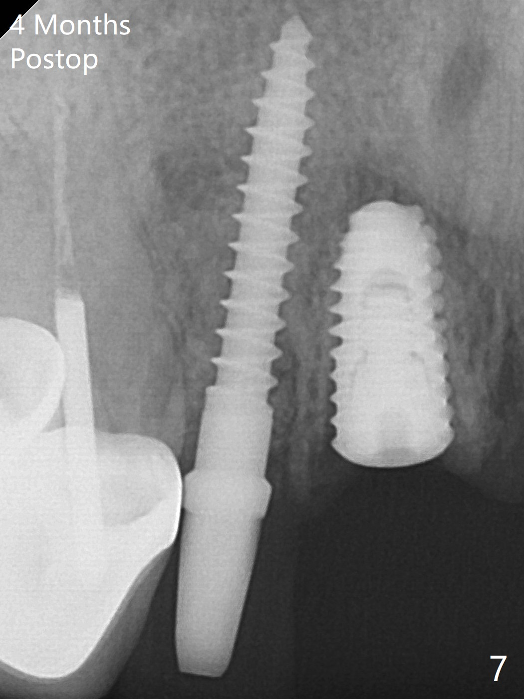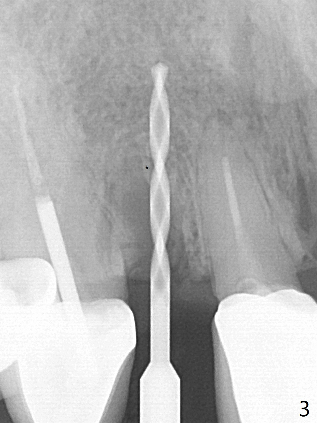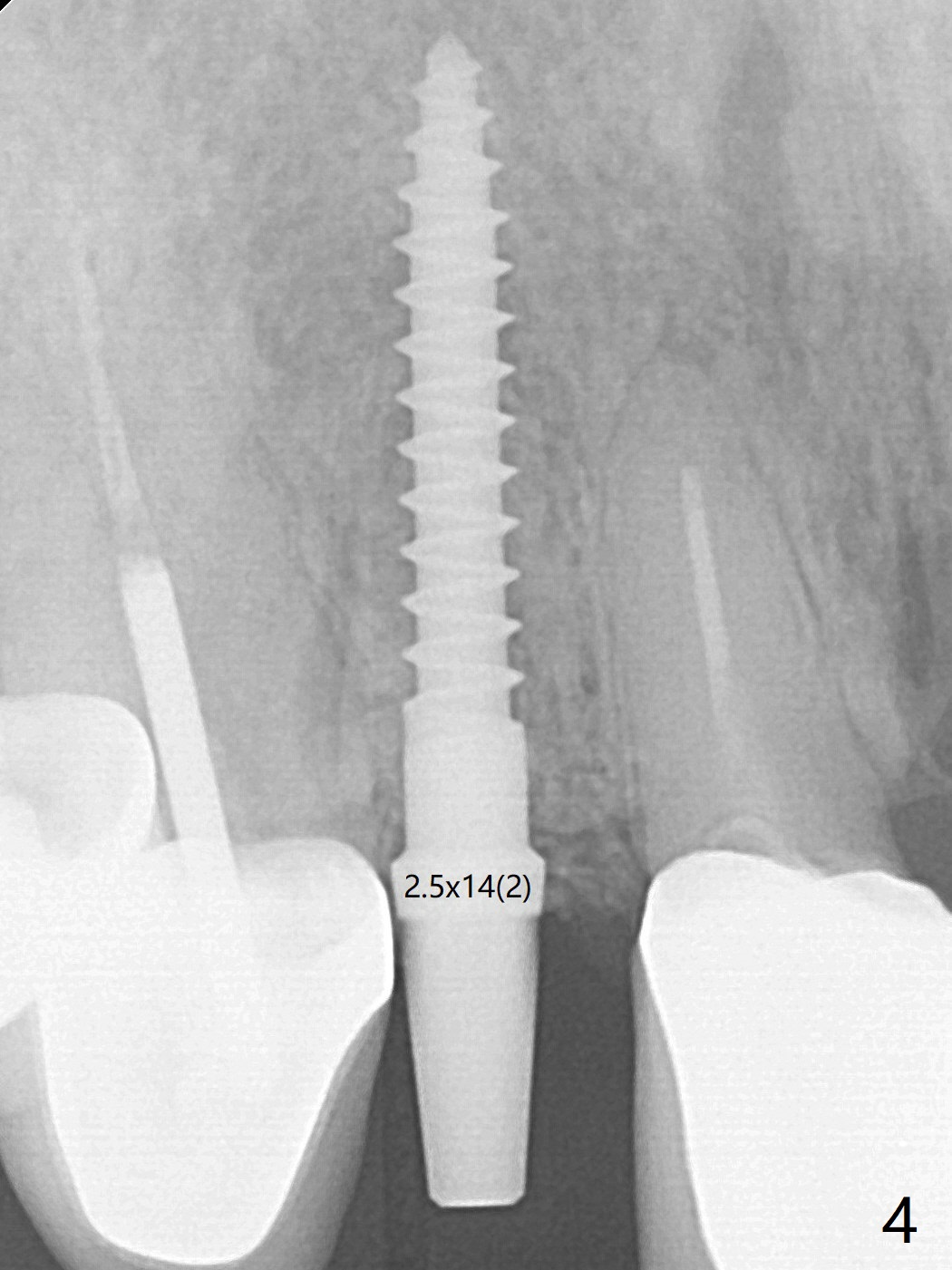 Because of the long crowns of the neighboring teeth, it is difficult to remove the apical portion of the root, including gutta percha with surgical handpiece (Fig.3 * (1.2 mm drill for 12 mm)) for socket shield. To avoid the perspective implant touching socket shield, initial osteotomy is palatal. When a 2 mm drill is being used, the coronal end of the palatal plate starts to perforate. A 2.5x14 mm 1-piece implant is placed with 30 Ncm (Fig.4). The teeth #8 and 9 fracture (an implant is placed at #8 and bone graft at #9), while the implant at #7 is osteointegrating (Fig.7). In fact the shield is exposed without symptom.