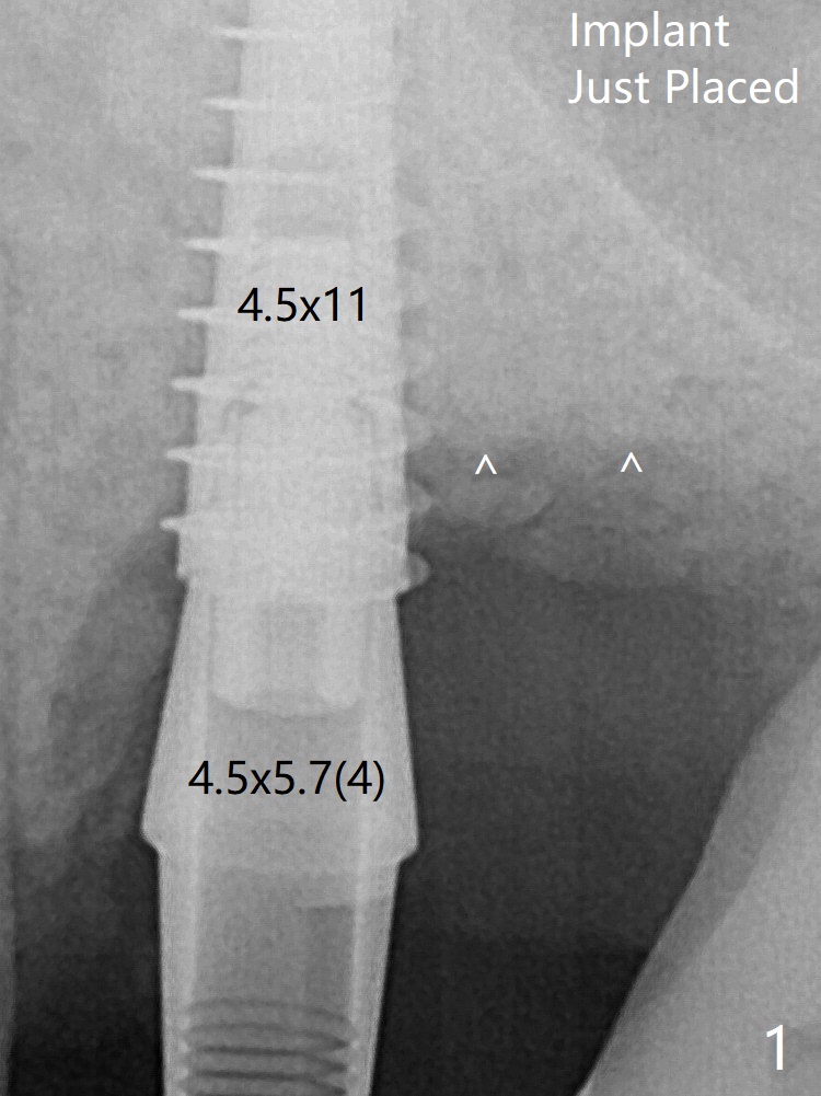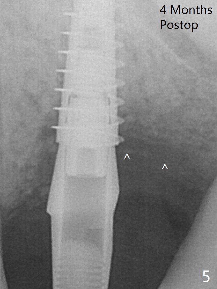 术后4个月骨粉好像覆盖远中曾经暴露螺纹(图五:^)。植体仿佛保留骨粉,促进新骨形成。