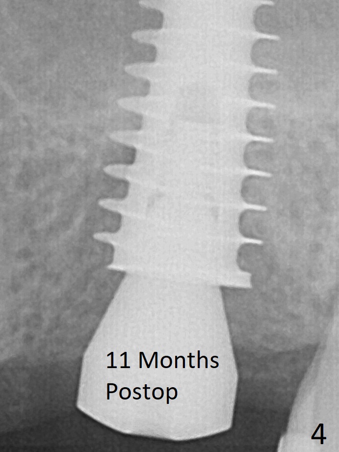 With insertion of Vanilla graft for sinus lift through the buccoapical portion of the osteotomy mentioned above, a 6x11 mm implant is placed with the same trajectory (Fig.2, <40 Ncm). With adjustment of a 6.5x4(3) mm abutment and placement of Vanilla graft in the remaining sockets (Fig.2 *), an immediate provisional is fabricated. The socket appears to heal 11 months postop (Fig.4). Later a 5x4(3) mm abutment is placed for final restoration. The palatal margin is low.