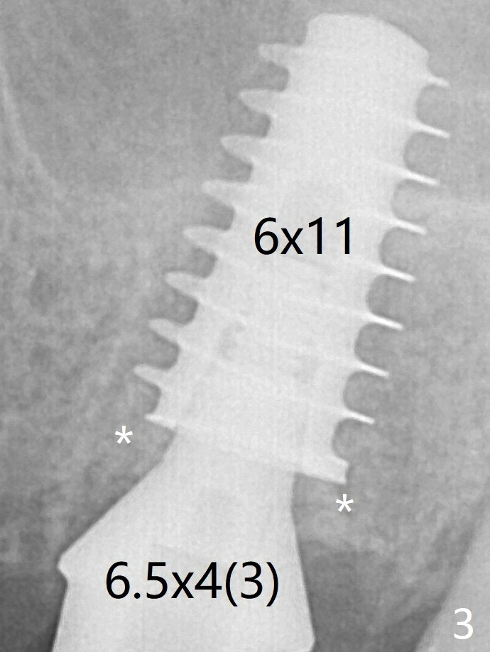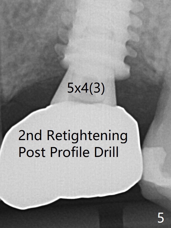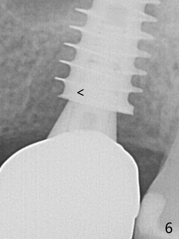 With insertion of Vanilla graft for sinus lift through the buccoapical portion of the osteotomy mentioned above, a 6x11 mm implant is placed with the same trajectory (Fig.2, <40 Ncm). With adjustment of a 6.5x4(3) mm abutment and placement of Vanilla graft in the remaining sockets (Fig.2 *), an immediate provisional is fabricated. The abutment becomes loose again 4 months later. Prior to retightening, a 6 mm profile drill is used. BW shows no bony interference (Fig.5 (opposing tooth occlusal wear; bruxism)), while PA shows the buccal bone, suggesting poor trajectory (guide essential). The gap between the abutment and implant (Fig.6 <) is smaller than that in Fig.3. Thin Septum Last Next Xin Wei, DDS, PhD, MS 1st edition 01/17/2020, last revision 12/19/2020