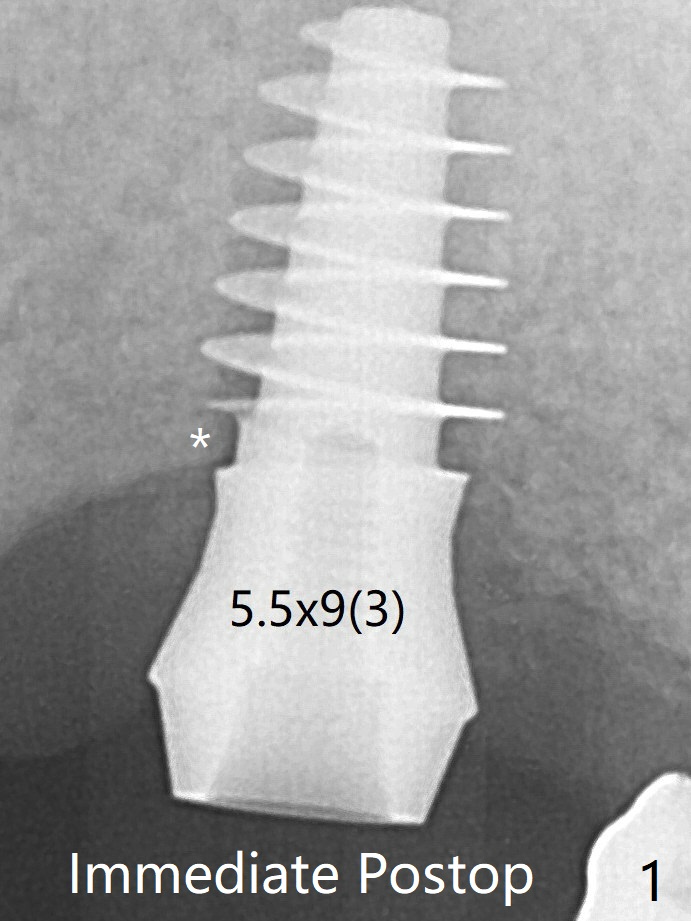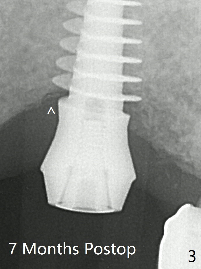 Probably due to underprep, the mesial crestal bone appears to have been resorbed 7 months postop (Fig.3 ^, as compared to Fig.1 *). The temp bond cemented crown is off 8 months post cementation (Fig.6). The bone density increases especially mesial.