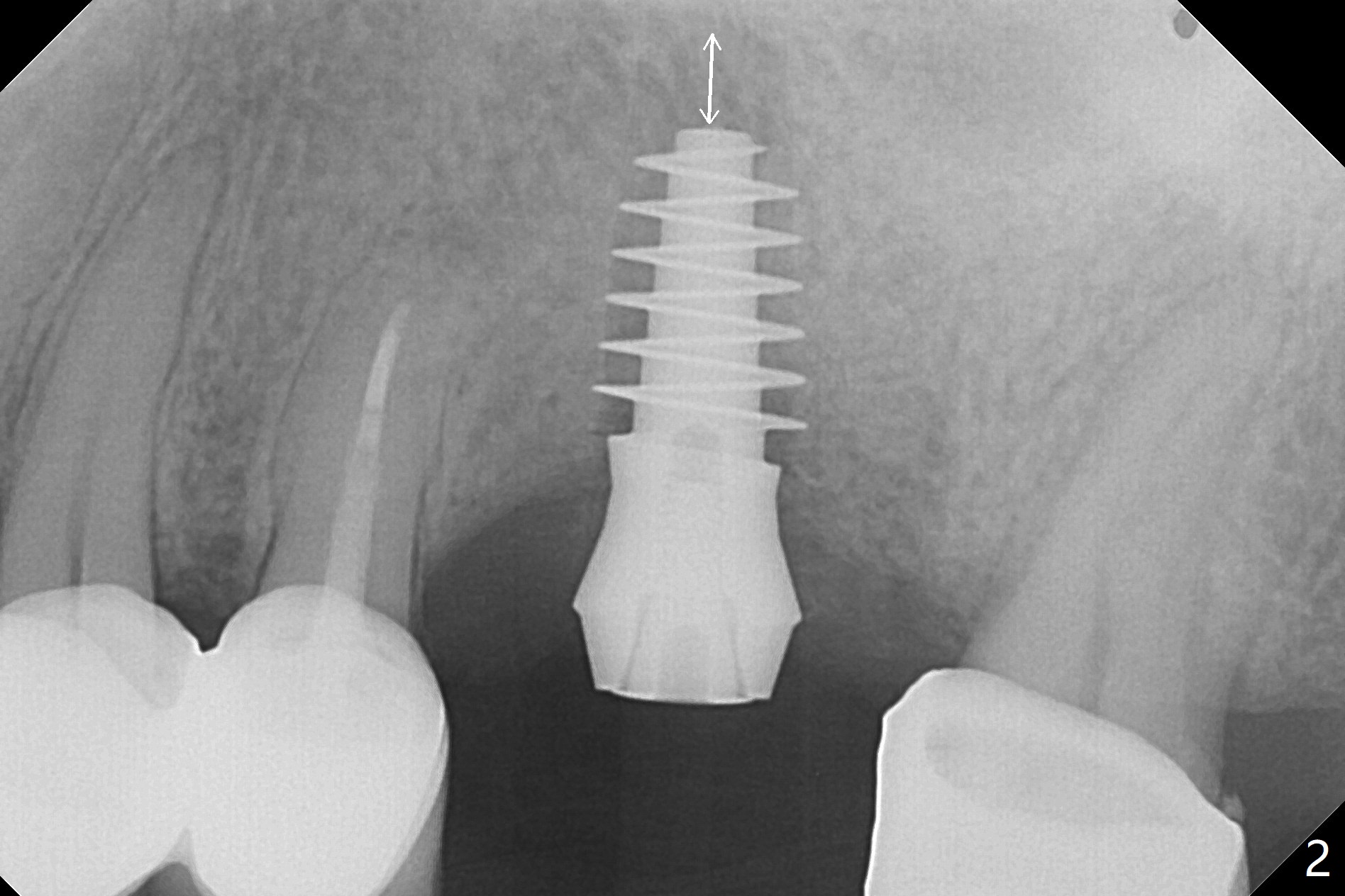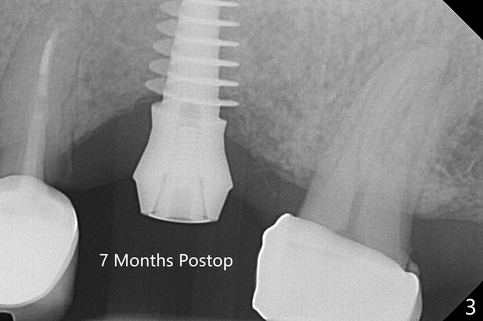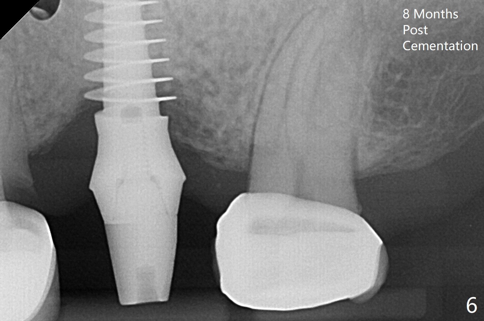 After 4.5x11.5 mm drill (10.5 mm offset) and 5.0 mm tap with guide at #14, the depth of the gingiva is measured 3 mm. A 5.5x9(3) mm Magicore cannot enter the green sleeve and is placed free hand (Fig.1). The margin is slight subgingival mesiodistal. With 3-4 turns, the buccal margin is slightly subgingival, while the palatal one slightly supragingival (Fig.2). The length of the implant could be 11 mm, considering the apical space (double arrows). To prevent periimplantitis, what is the appropriate placement depth coronally? Where does Titanium end? Dr. Wang thinks that the placement level is right. Probably due to underprep, the mesial crestal bone appears to have been resorbed 7 months postop (Fig.3 ^, as compared to Fig.1). The gingiva is healthy. A 4.3x5 mm solid abutment is torqued 20 Ncm for impression. The guide allows the implant to be placed lingual because of buccal concavity (Fig.4), but the coronal end of the solid abutment in the center for restoration (Fig.5 A). The crown is seated partially on the Magicore (M). The temp bond cemented crown is off 8 months post cementation (Fig.6). The bone density increases especially mesial.