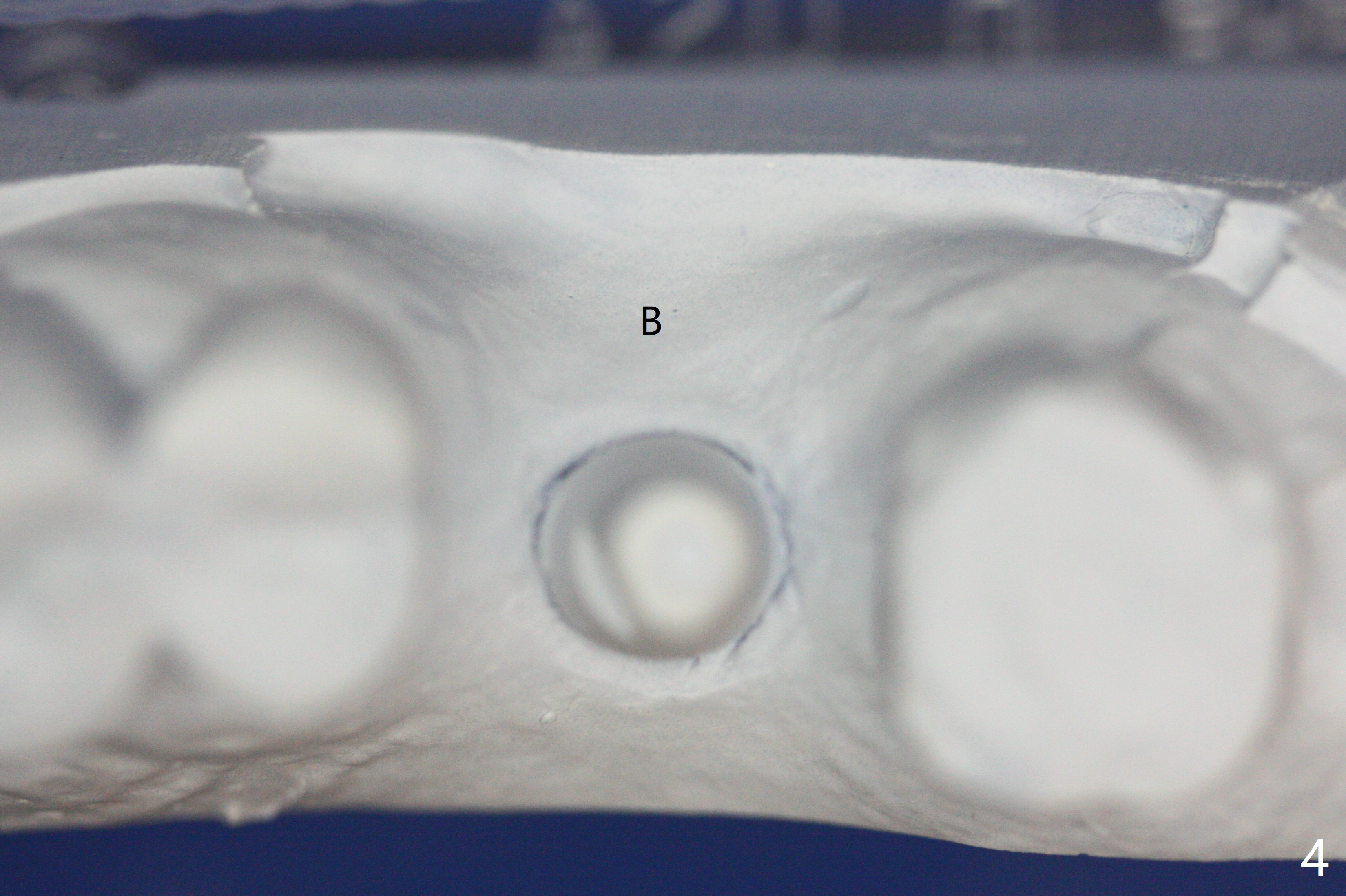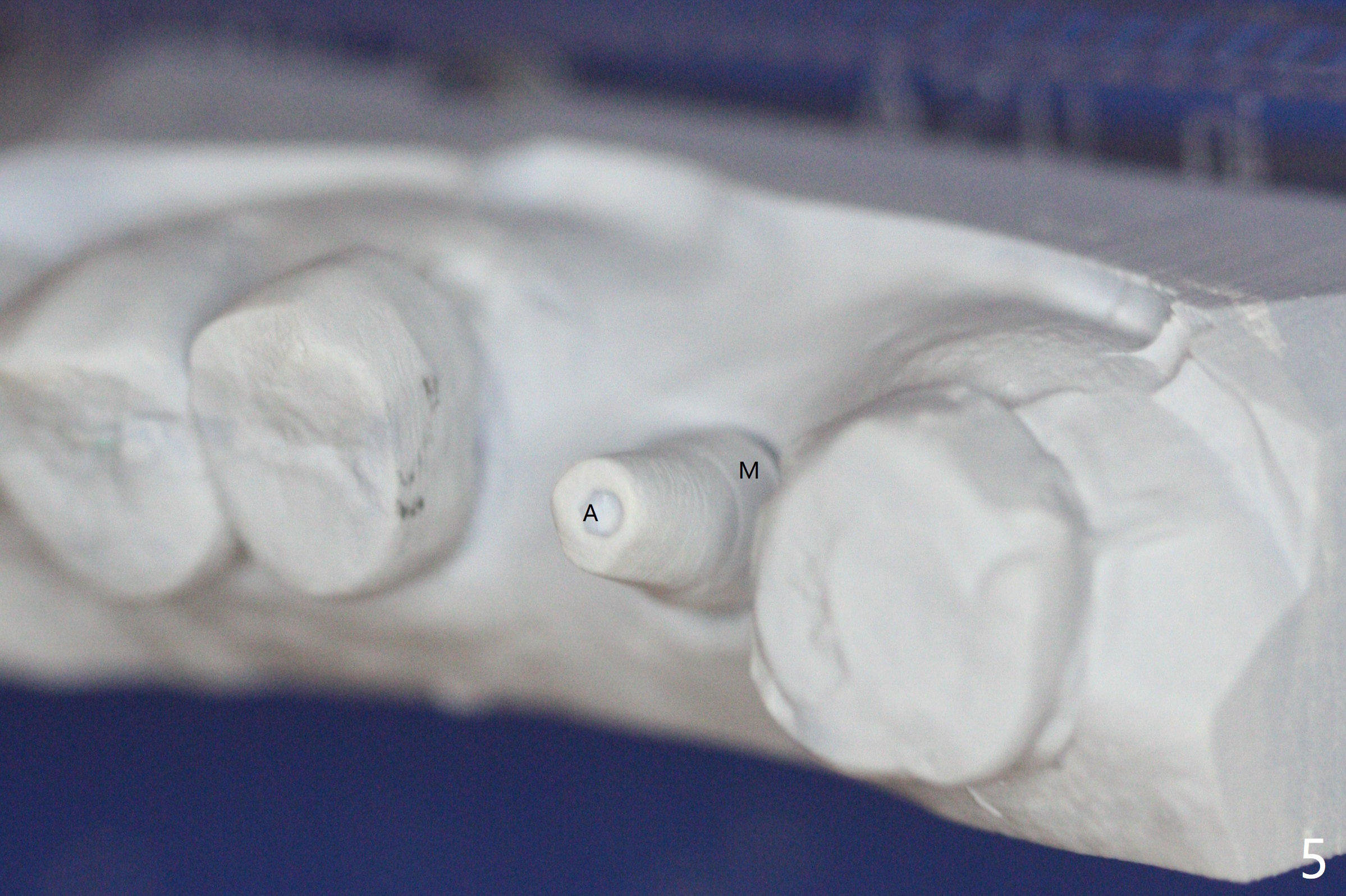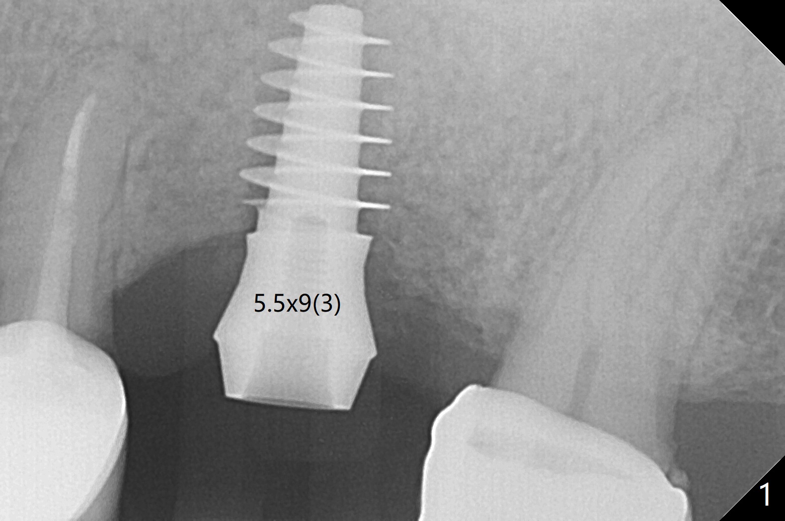 After 4.5x11.5 mm drill (10.5 mm offset) and 5.0 mm tap with guide at #14, the depth of the gingiva is measured 3 mm. A 5.5x9(3) mm Magicore cannot enter the green sleeve and is placed free hand (Fig.1). The margin is slight subgingival mesiodistal. With 3-4 turns, the buccal margin is slightly subgingival, while the palatal one slightly supragingival (Fig.2). The length of the implant could be 11 mm, considering the apical space (double arrows). To prevent periimplantitis, what is the appropriate placement depth coronally? Where does Titanium end? Dr. Wang thinks that the placement level is right. Probably due to underprep, the mesial crestal bone appears to have been resorbed 7 months postop (Fig.3 ^, as compared to Fig.1). The gingiva is healthy. A 4.3x5 mm solid abutment is torqued 20 Ncm for impression. The guide allows the implant to be placed lingual because of buccal concavity (Fig.4), but the coronal end of the solid abutment in the center for restoration (Fig.5 A). The crown is seated partially on the Magicore (M). The temp bond cemented crown is off 8 months post cementation (Fig.6). The bone density increases especially mesial.