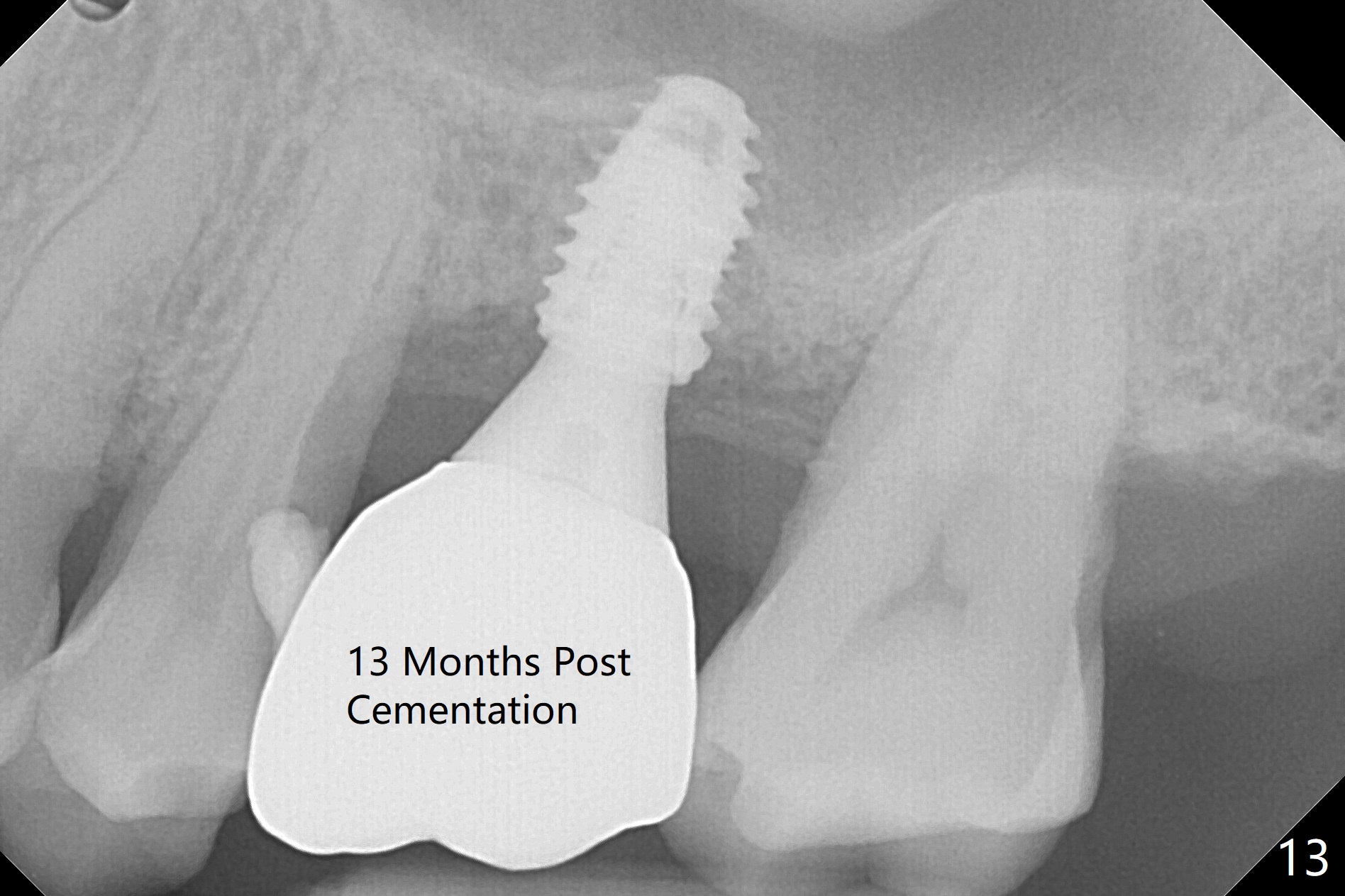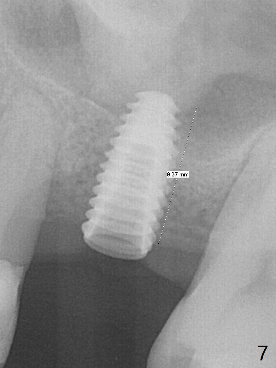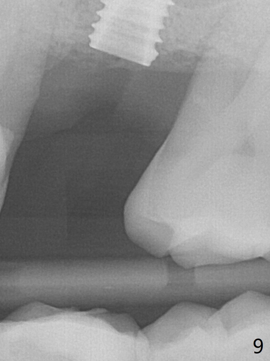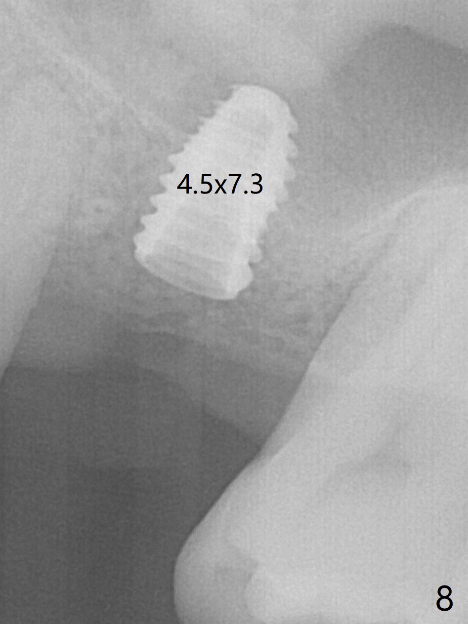 Trajectory of sinus lift without guide at #14 is off (Fig.1 (Magic Sinus Lifter (L) for 9 mm (gingival level)) and needs to be corrected (Fig.2 long line) by re-using 4.8 mm Magic Drill. Following placement of PRF membrane and Demineralized Cortical Allograft (.125-.850 mm) for sinus lift (Fig.3 black dashed line), a 4x10 mm dummy implant is placed with off trajectory. The latter will be fixed by using Lindmann bur to remove the bone distal (Fig.4). The result is less satisfactory with placement of 4.5x10 mm dummy implant (Fig.5). It appears necessary to initiate a new osteotomy (Fig.6 long black line). In fact the result is appealing (Fig.7). The final implant (5x7.3 mm) seems to be placed ideally shown by PA (Fig.8) and BW (Fig.9). Immediately postop CT demonstrates distal defect (Fig.10 *;3-D) and supracrestal placement palatal (Fig.11 P; coronal section). More allograft is then placed in these 2 areas. In all, it is difficult to establish a correct osteotomy without guide. The patient return for uncover 3.5 months postop, although there is a small hole in the middle of the incision (Fig.12). The crown/abutment becomes loose less than 1 month post cementation when the patient chews something tough. It is more related to the unfavorable implant/crown ratio. It is loose again 2 months later. Screw driver is buried inside the abutment with plumber tape. When it is loose for the 3rd time 13 months post cementation, the existing screw driver with a created slot (for retention) is buried without plumber tape after retorque at 35 Ncm (Fig.13). A tissue-level implant should have been used.