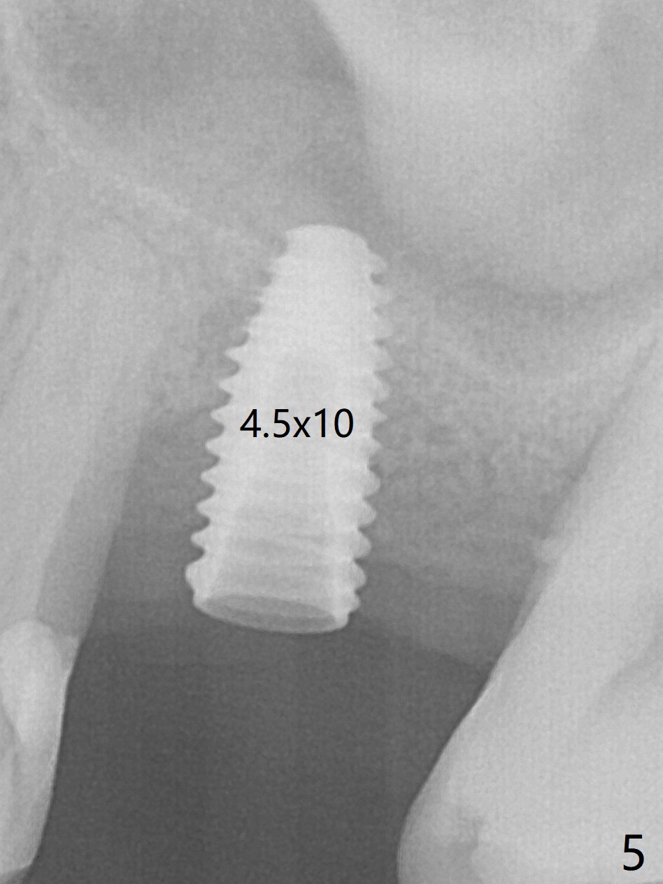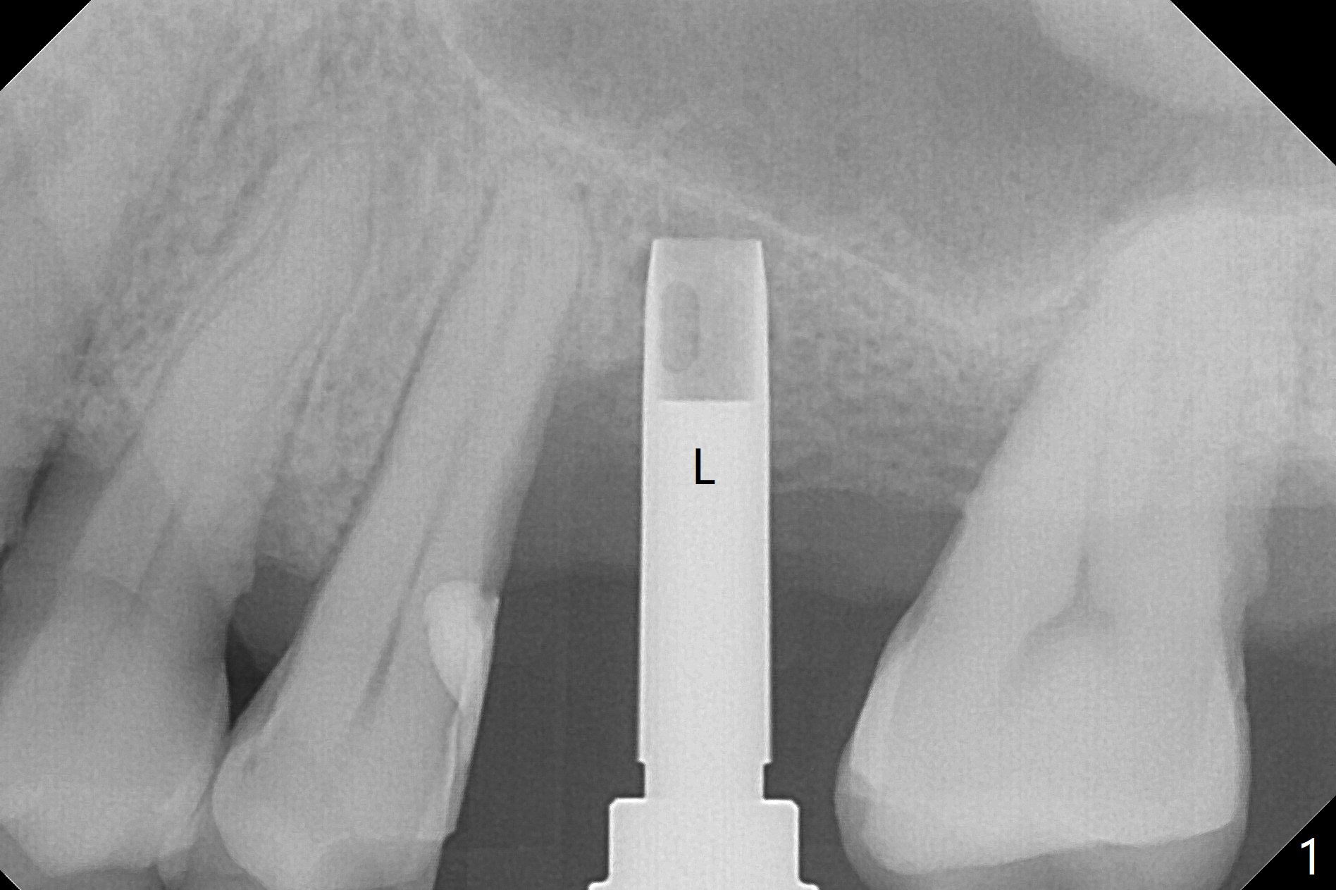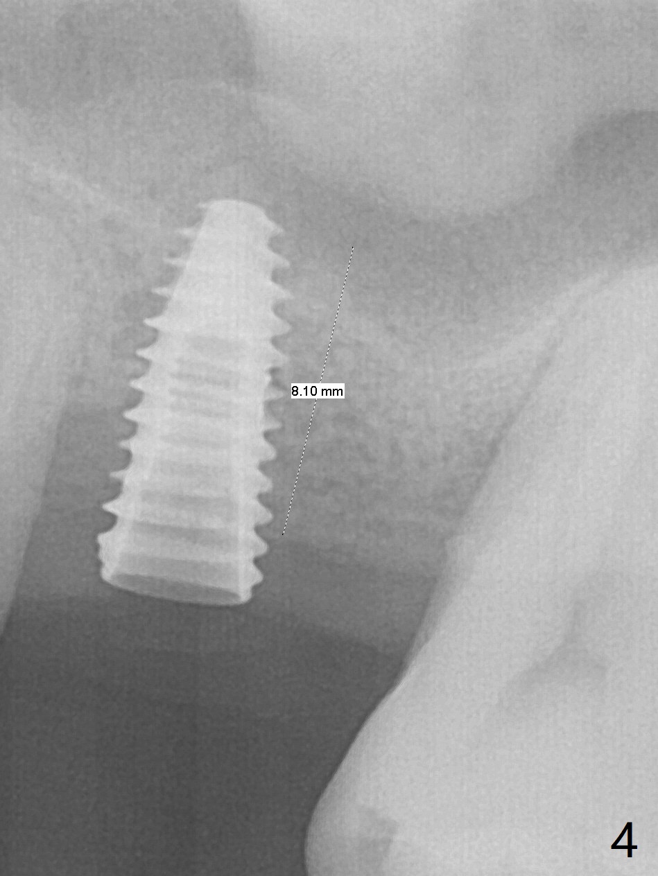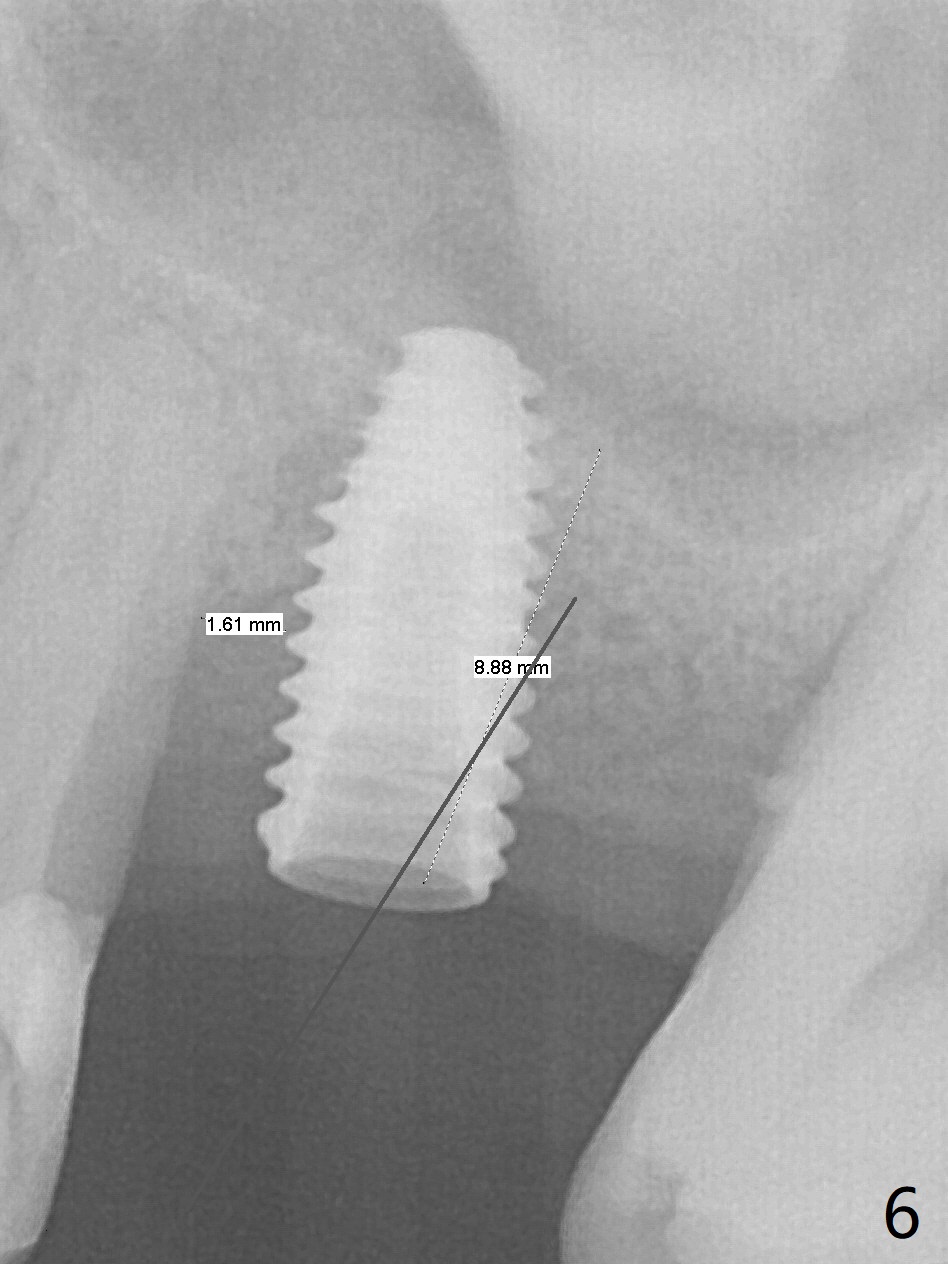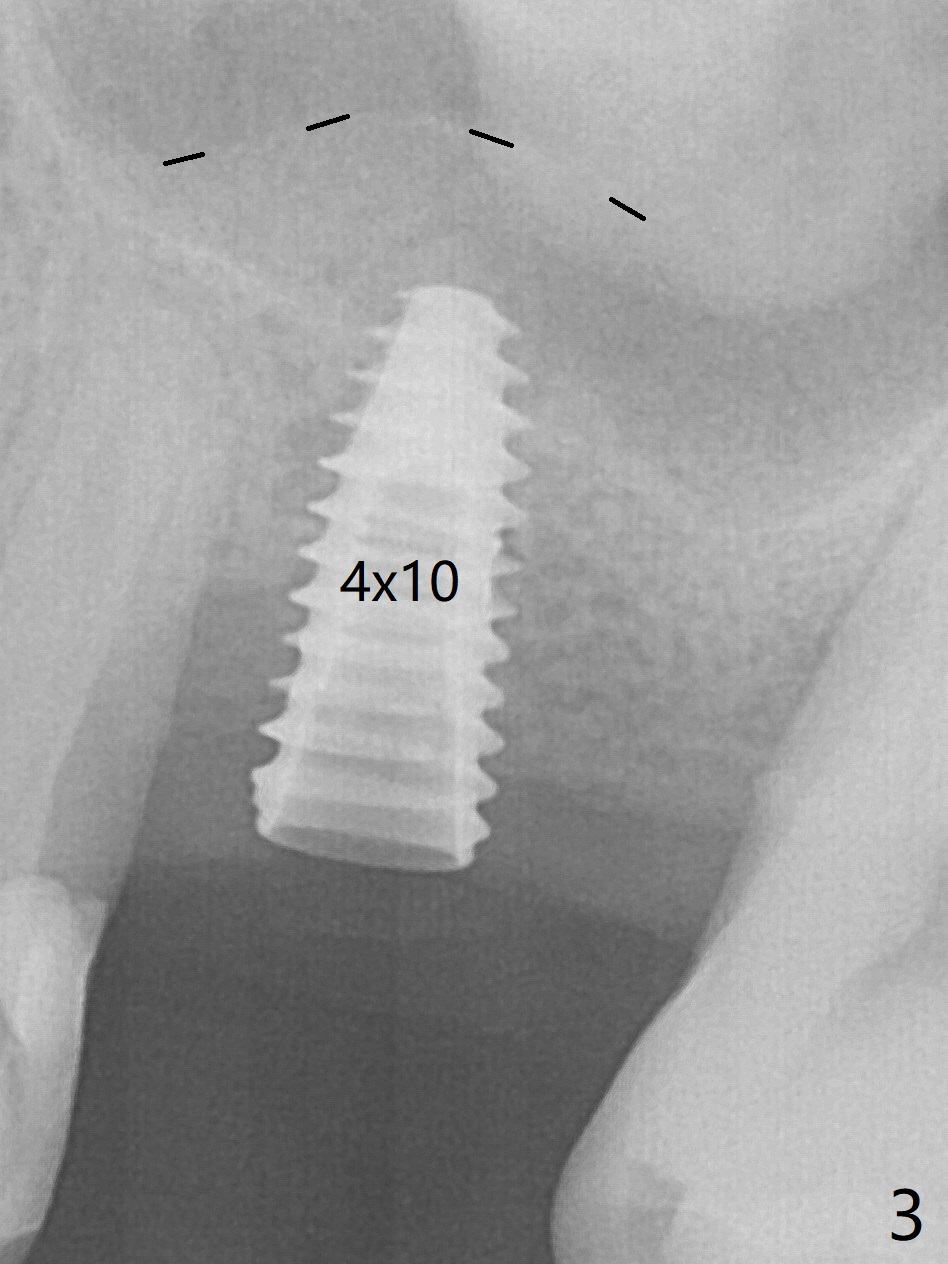 Trajectory of sinus lift without guide at #14 is off (Fig.1 (Magic Sinus Lifter (L) for 9 mm (gingival level)) and needs to be corrected (Fig.2 long line) by re-using 4.8 mm Magic Drill. Following placement of PRF membrane and Demineralized Cortical Allograft (.125-.850 mm) for sinus lift (Fig.3 black dashed line), a 4x10 mm dummy implant is placed with off trajectory. The latter will be fixed by using Lindmann bur to remove the bone distal (Fig.4). The result is less satisfactory with placement of 4.5x10 mm dummy implant (Fig.5). It appears necessary to initiate a new osteotomy (Fig.6 long black line). In fact the result is appealing (Fig.7). The final implant (5x7.3 mm) seems to be placed ideally shown by PA (Fig.8) and BW (Fig.9). Immediately postop CT demonstrates distal defect (Fig.10 *;3-D) and supracrestal placement palatal (Fig.11 P; coronal section). More allograft is then placed in these 2 areas. In all, it is difficult to establish a correct osteotomy without guide. The patient return for uncover 3.5 months postop, although there is a small hole in the middle of the incision (Fig.12). The crown/abutment becomes loose less than 1 month post cementation when the patient chews something tough. It is more related to the unfavorable implant/crown ratio. It is loose again 2 months later. Screw driver is buried inside the abutment with plumber tape. When it is loose for the 3rd time 13 months post cementation, the existing screw driver with a created slot (for retention) is buried without plumber tape after retorque at 35 Ncm (Fig.13). A tissue-level implant should have been used.