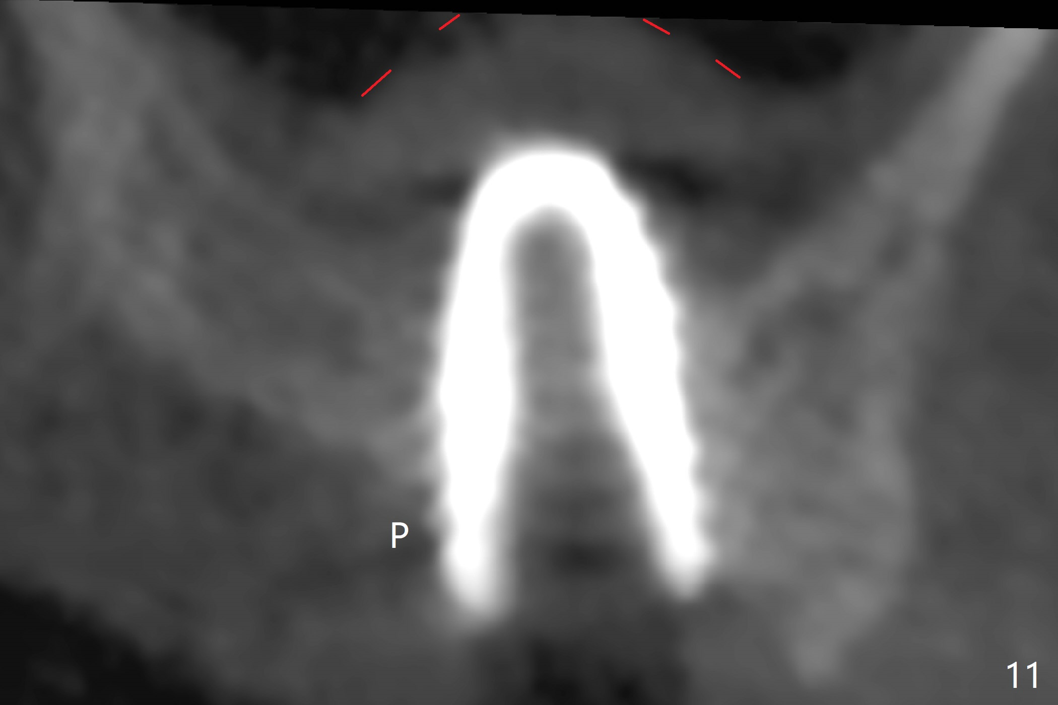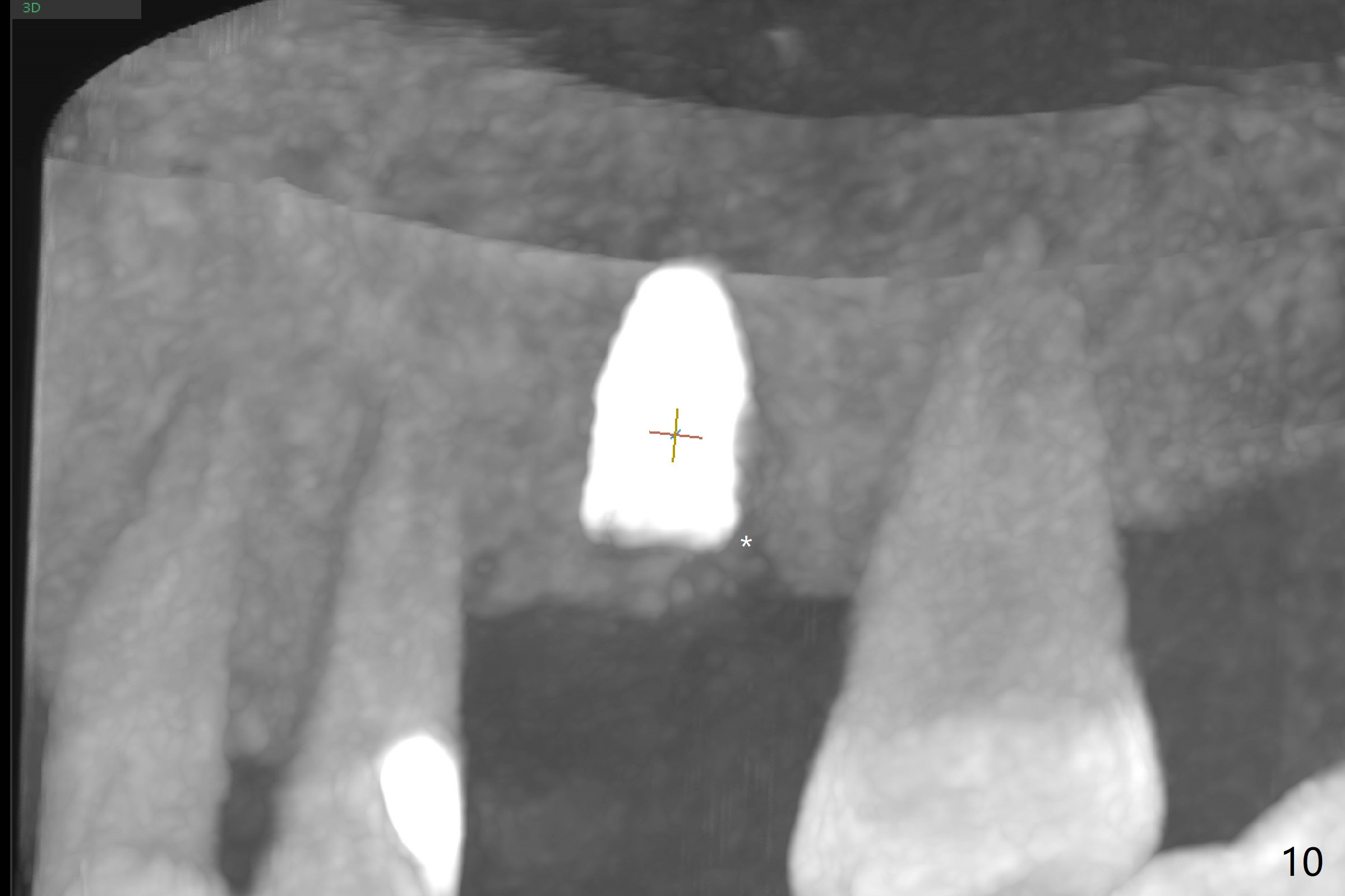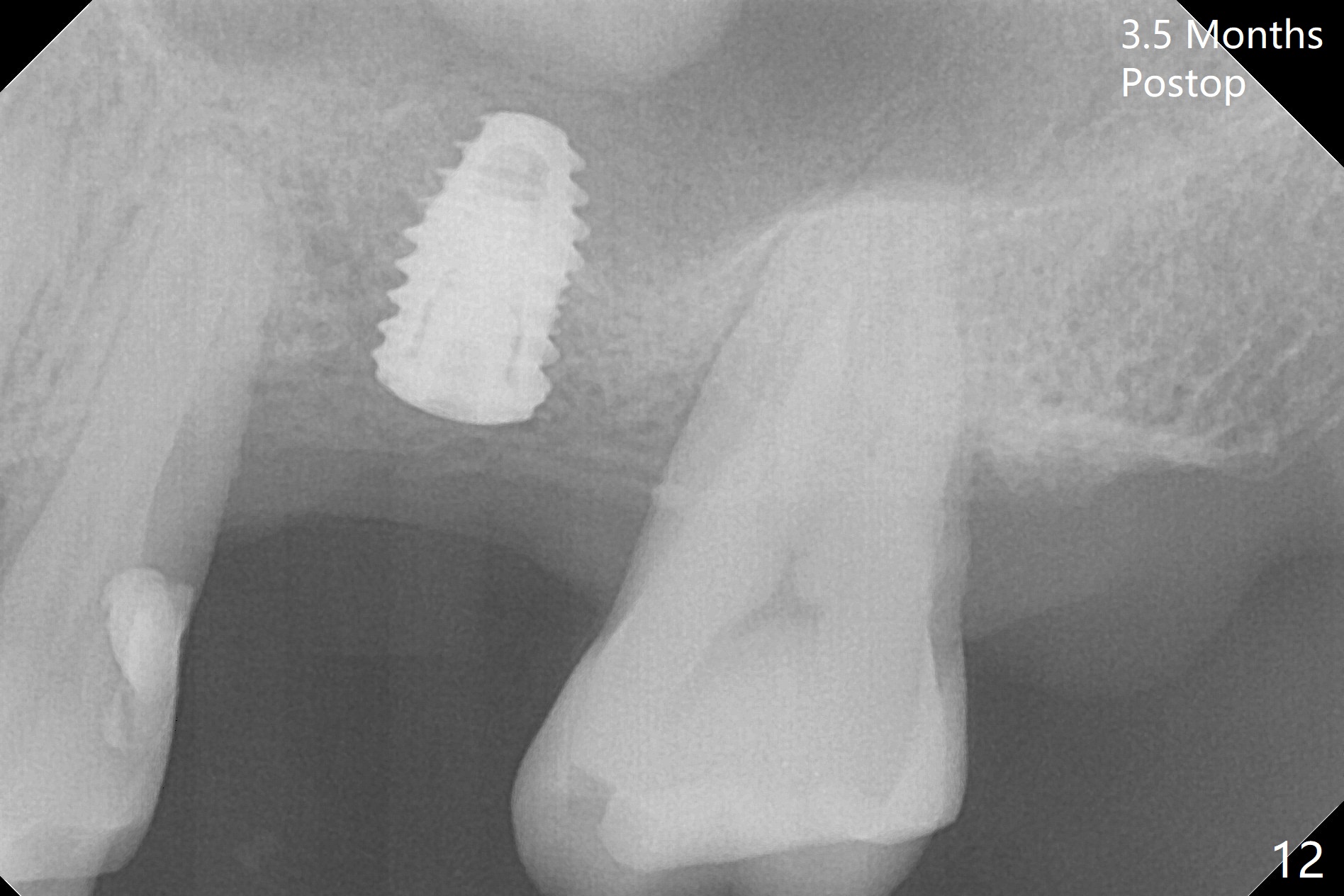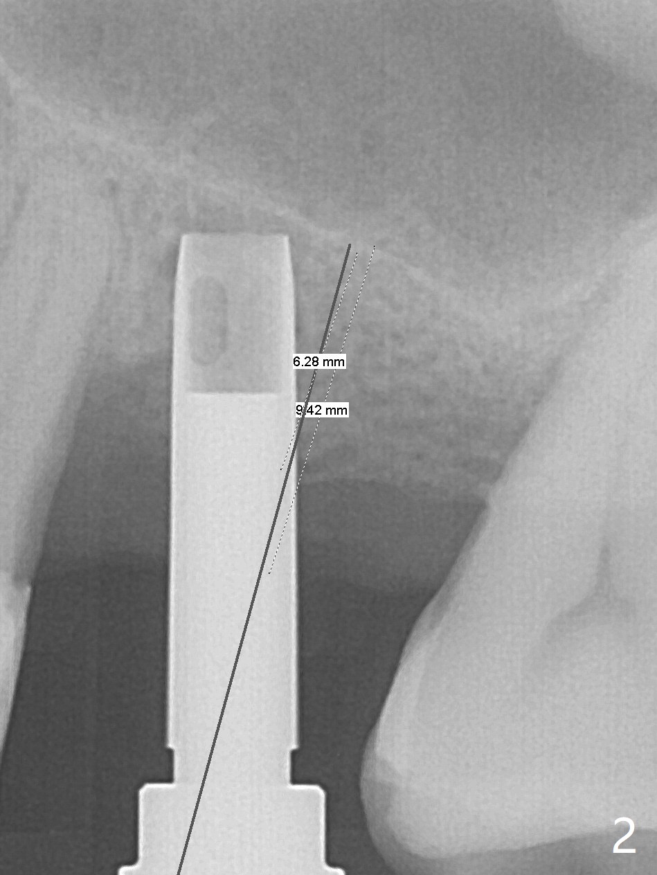 Trajectory of sinus lift without guide at #14 is off (Fig.1 (Magic Sinus Lifter (L) for 9 mm (gingival level)) and needs to be corrected (Fig.2 long line) by re-using 4.8 mm Magic Drill. Following placement of PRF membrane and Demineralized Cortical Allograft (.125-.850 mm) for sinus lift (Fig.3 black dashed line), a 4x10 mm dummy implant is placed with off trajectory. The latter will be fixed by using Lindmann bur to remove the bone distal (Fig.4). The result is less satisfactory with placement of 4.5x10 mm dummy implant (Fig.5). It appears necessary to initiate a new osteotomy (Fig.6 long black line). In fact the result is appealing (Fig.7). The final implant (5x7.3 mm) seems to be placed ideally shown by PA (Fig.8) and BW (Fig.9). Immediately postop CT demonstrates distal defect (Fig.10 *;3-D) and supracrestal placement palatal (Fig.11 P; coronal section). More allograft is then placed in these 2 areas. In all, it is difficult to establish a correct osteotomy without guide. The patient return for uncover 3.5 months postop, although there is a small hole in the middle of the incision (Fig.12). The crown/abutment becomes loose less than 1 month post cementation when the patient chews something tough. It is more related to the unfavorable implant/crown ratio. It is loose again 2 months later. Screw driver is buried inside the abutment with plumber tape. When it is loose for the 3rd time 13 months post cementation, the existing screw driver with a created slot (for retention) is buried without plumber tape after retorque at 35 Ncm (Fig.13). A tissue-level implant should have been used.