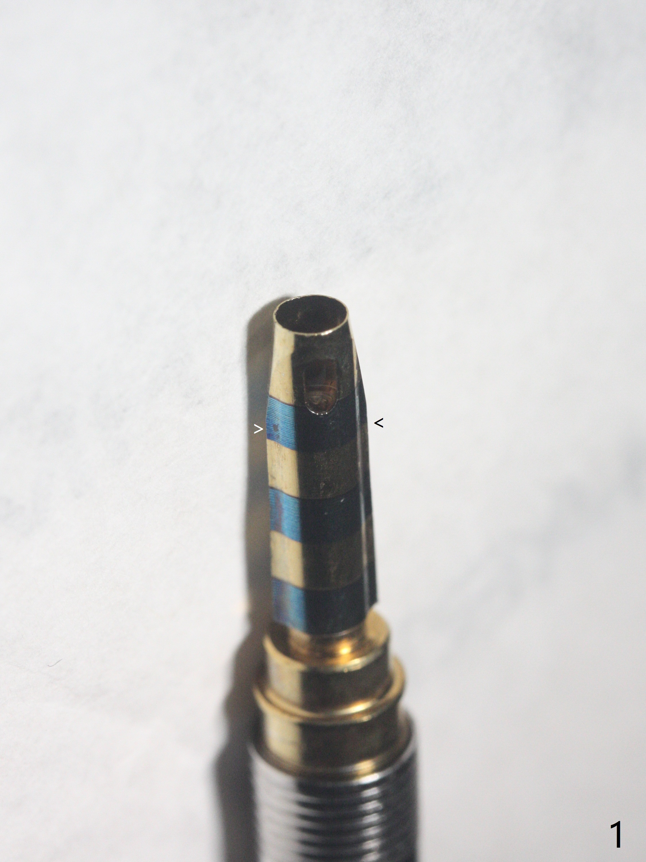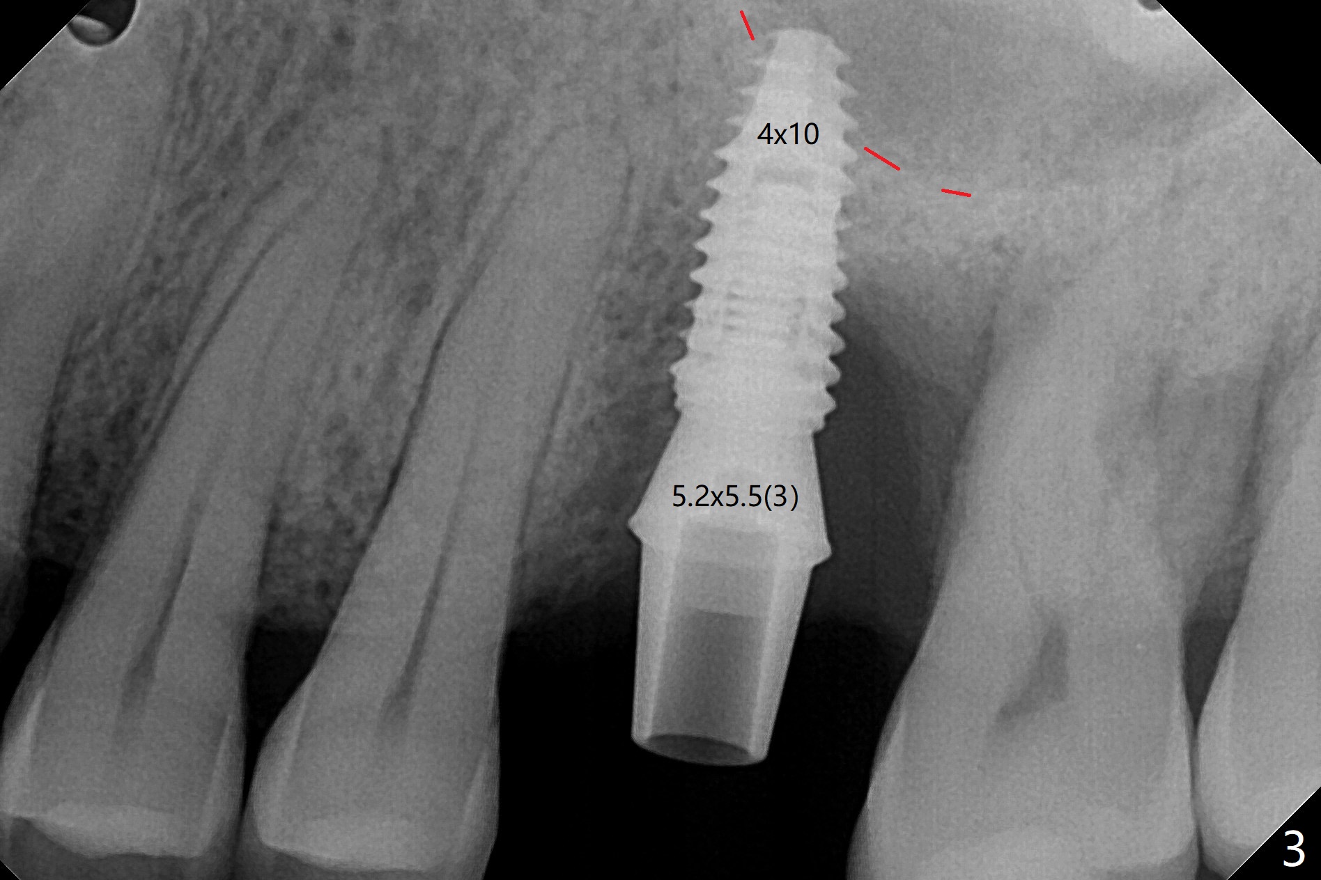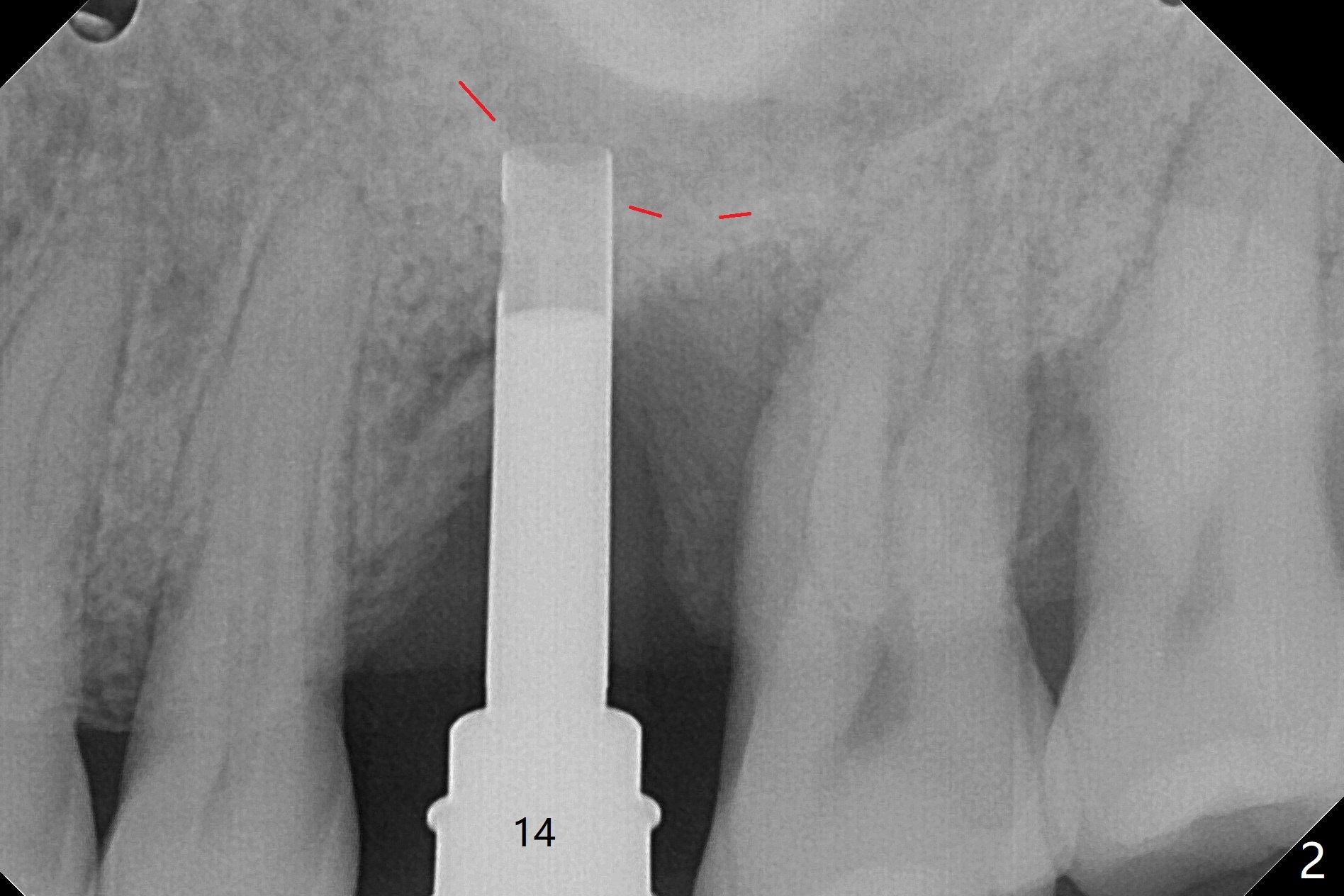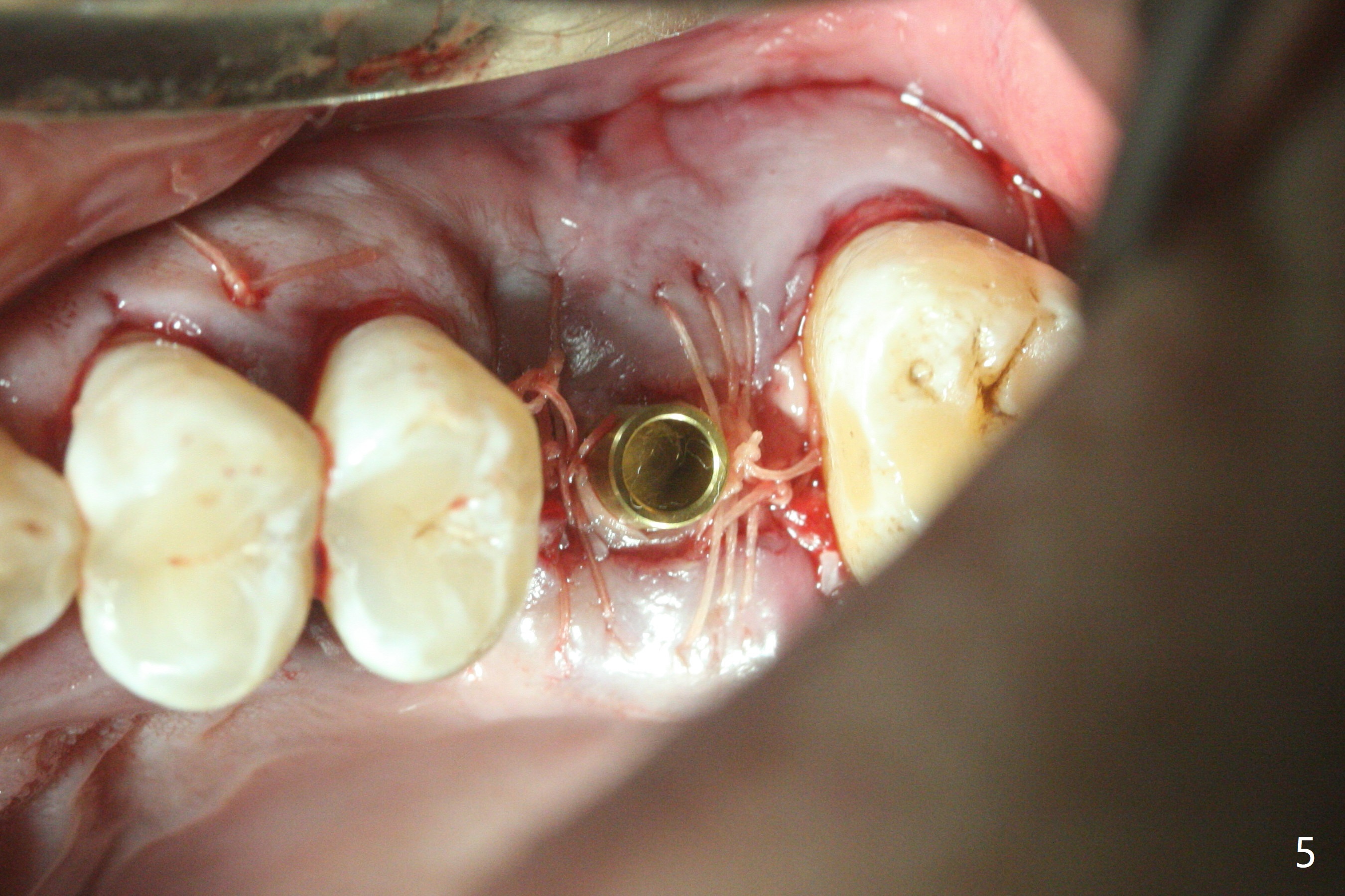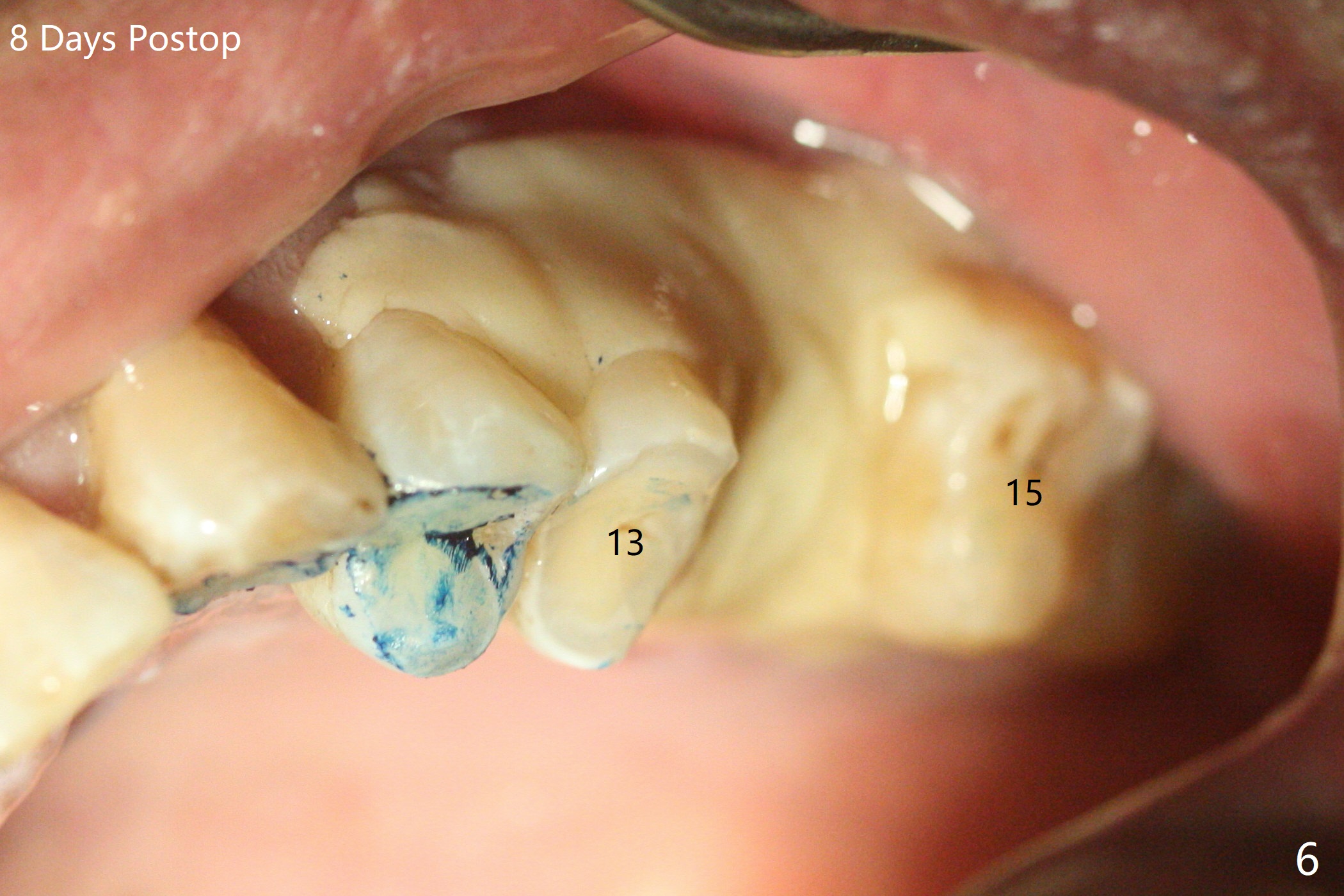 切开,使用导板完成初步钻洞,然后应用特殊上颌窦提升骨凿,顶端象环形刀,两侧有锥形刀刃(图一:箭头,防止骨凿突然进入上颌窦),由于窦底硬,骨凿并没有完全提升窦底(图二:红虚线)。使用短一号植体(图三),恰好进入上颌窦(没有骨粉),利用植体和基台固定骨粉(图四:*),覆盖两张PRF膜,将两侧厚的粘骨膜瓣尽量靠拢(图五)。最后树脂敷料。术后八天病人抱怨伤口和邻牙疼痛,骨粉被水牙线冲出来,进行邻牙咬合调整,疼痛即刻减轻(图六),再服用抗生素一周。一周后仍有轻度不适,局部牙龈正常,没有触痛。No Caries Magic Sinus Lifter 提升 Xin Wei, DDS, PhD, MS 1st edition 04/02/2021, last revision 04/18/2021