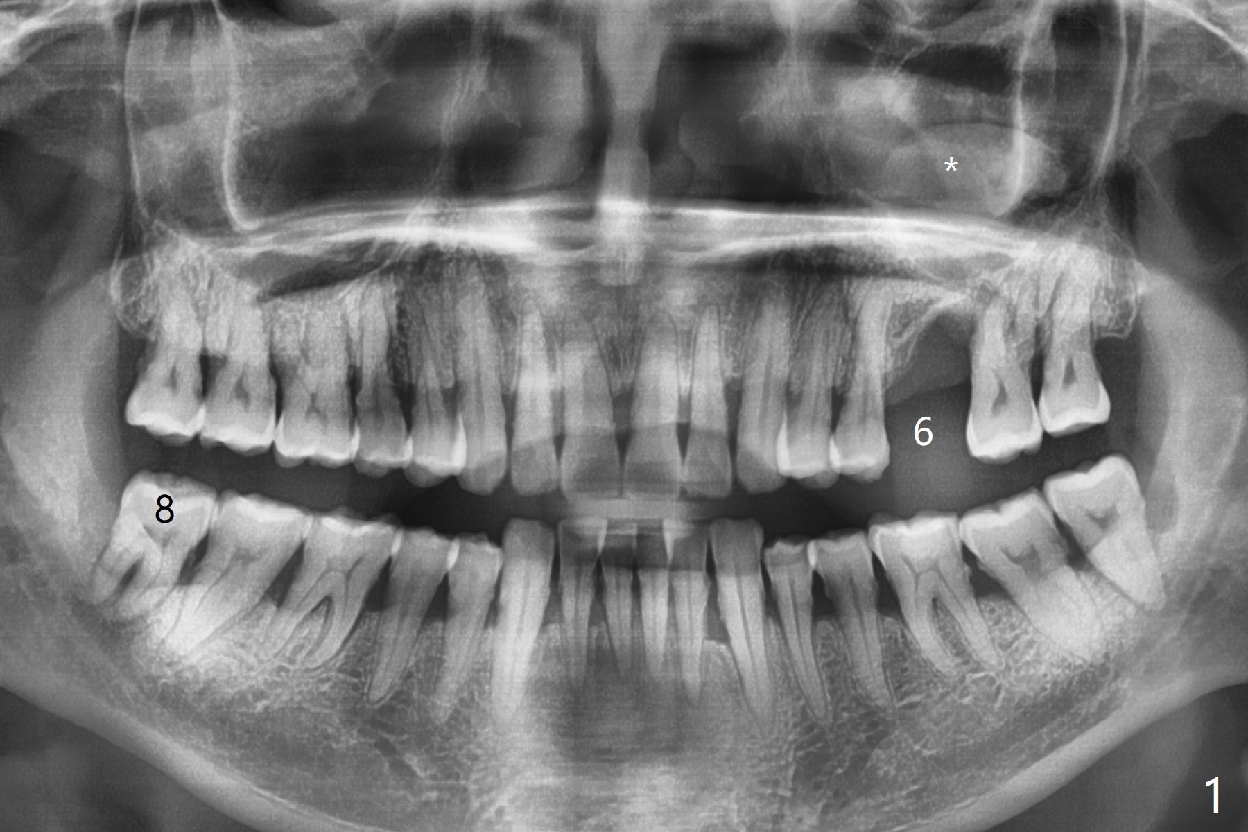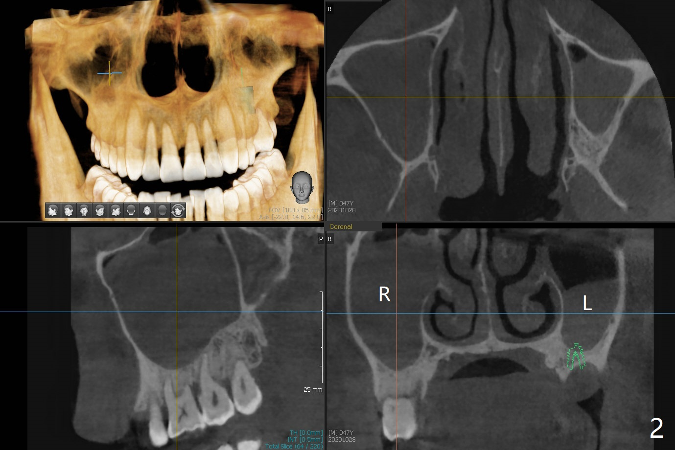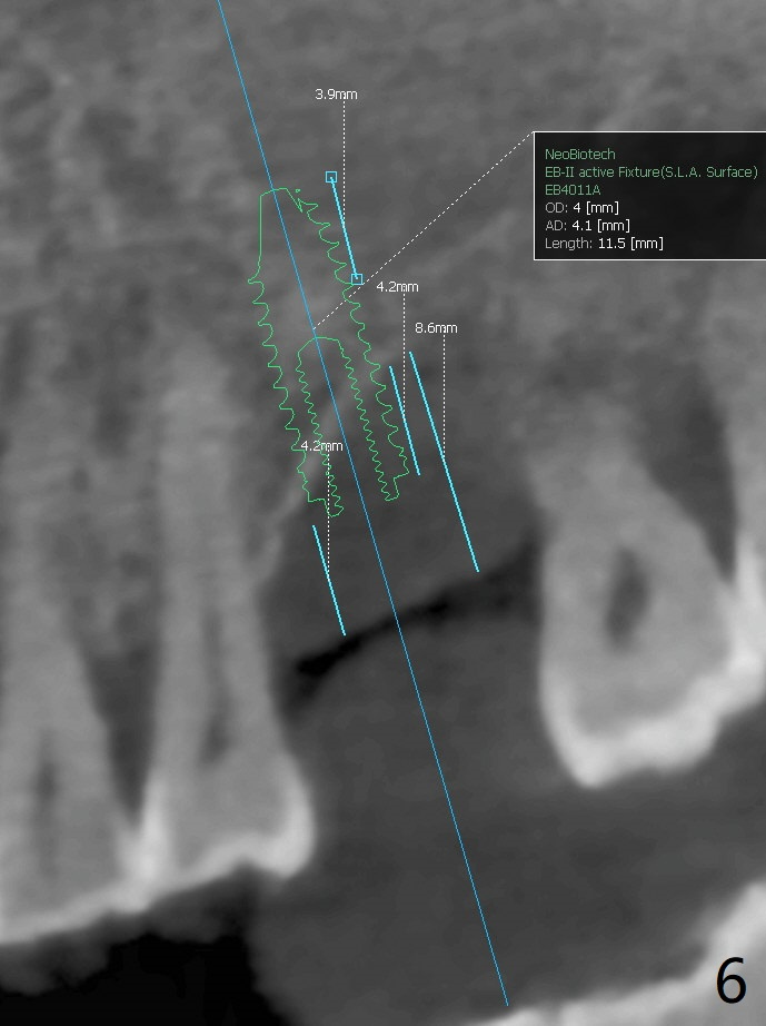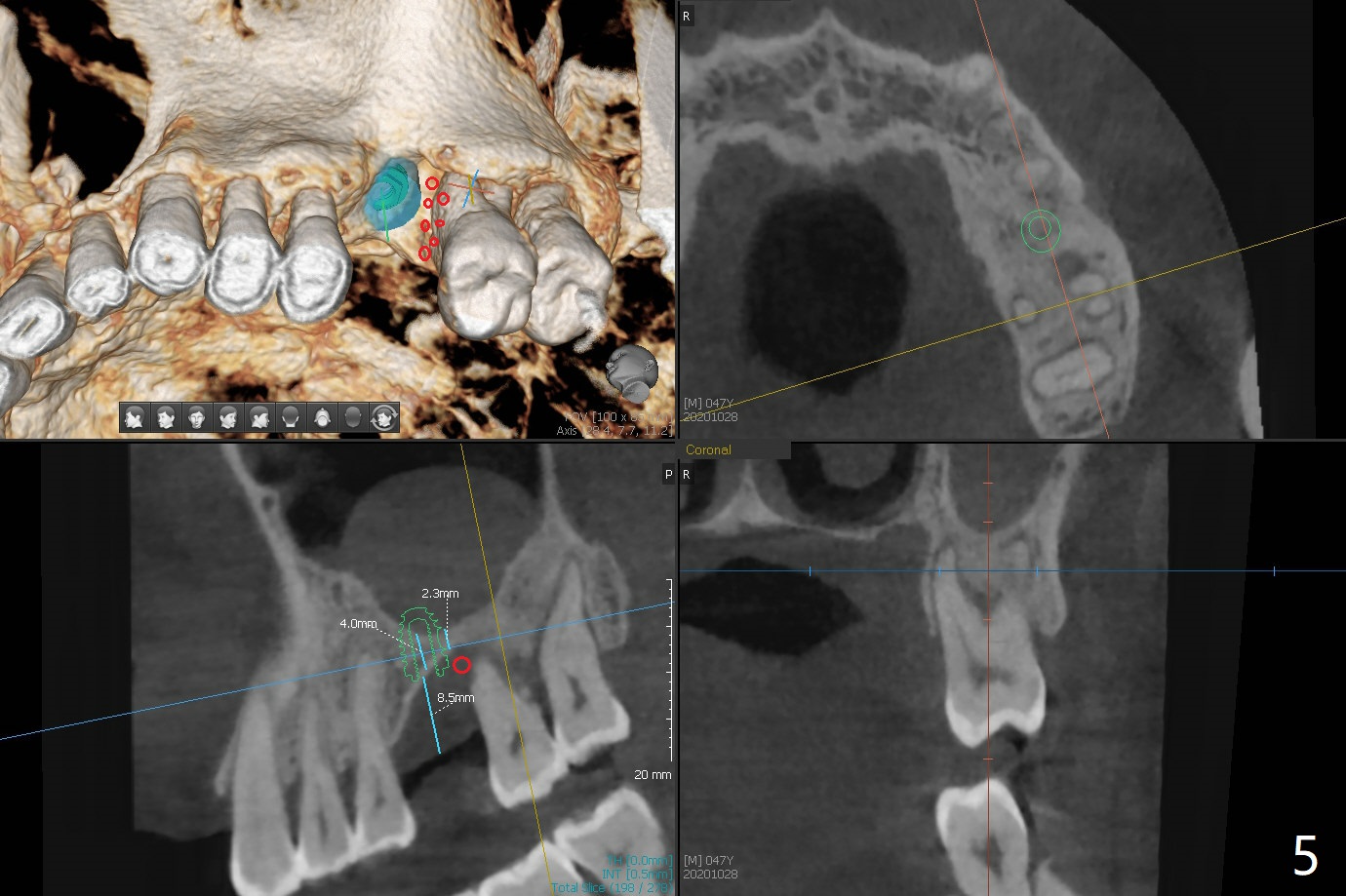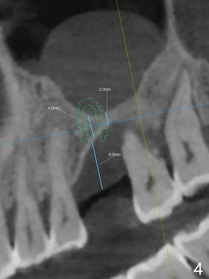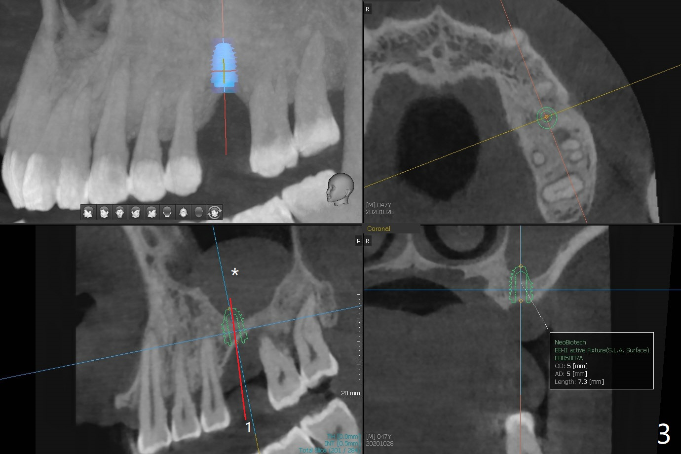 47岁男(吸烟一天半包)因右下8疼痛就诊,口服抗生素疼痛消失,不愿意拔除,但是要求左上6植牙(图一),左上颌窦好像有粘液囊肿(图一,三:*),而右侧上颌窦粘膜更厚(图二)。左上6植牙床是一个斜面,植牙会远中偏移,导板设计应有意往近中(图三:红线)。植体远中根尖需要内提升,冠部需要植骨(图四),厚的粘骨膜有利于植骨(粘骨,使用mill abutment),骨粉尽可能放置7牙根近中(图五:红色圆圈,Endogain)。第二种设计(图六)使用细长植体,近中龈下4毫米,远中龈下8毫米,有利于植骨,覆盖远中暴露的螺纹。Return to No Caries 位点保存/导板 手术 提升 Xin Wei, DDS, PhD, MS 1st edition 10/28/2020, last revision 04/04/2021