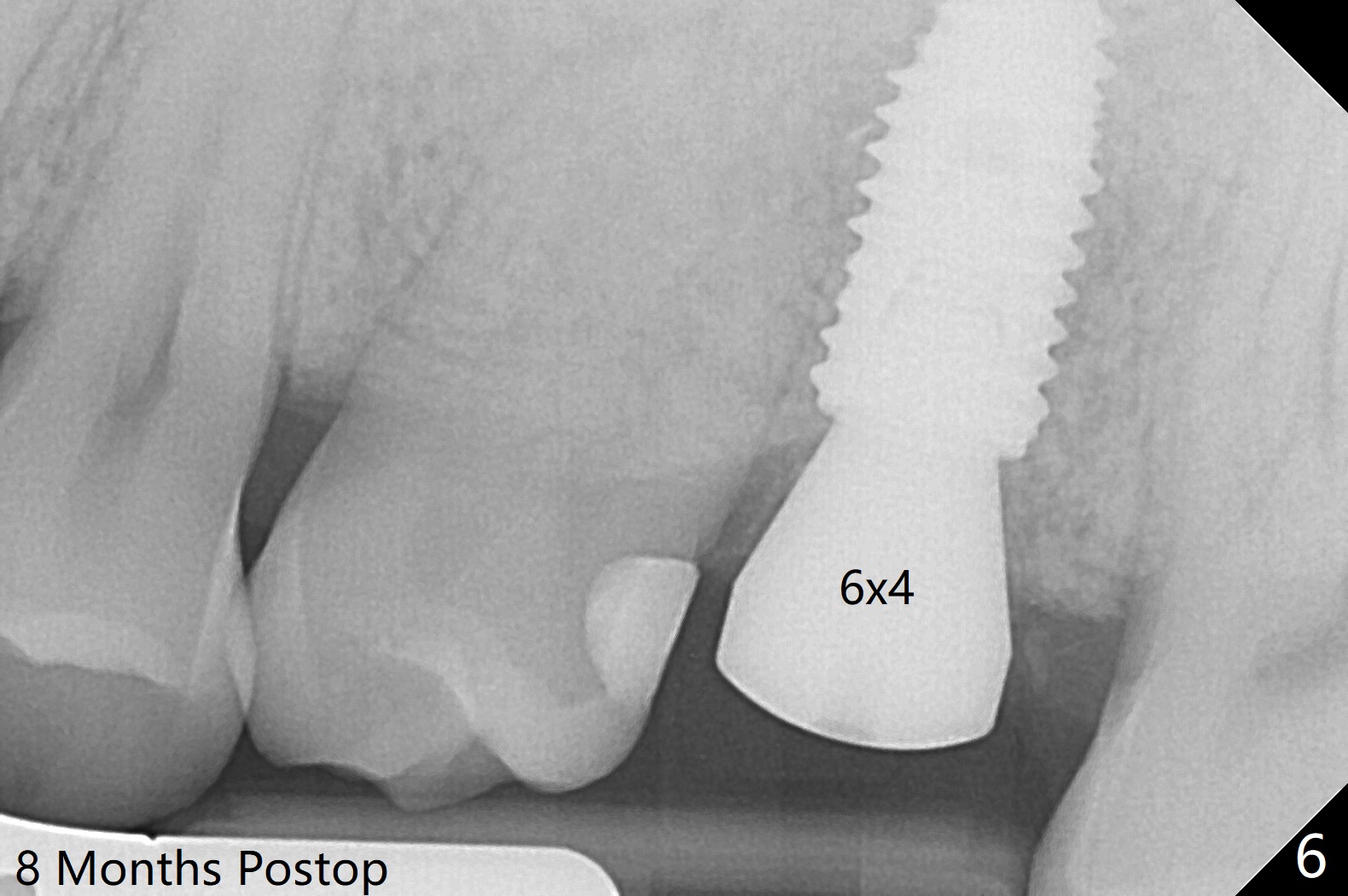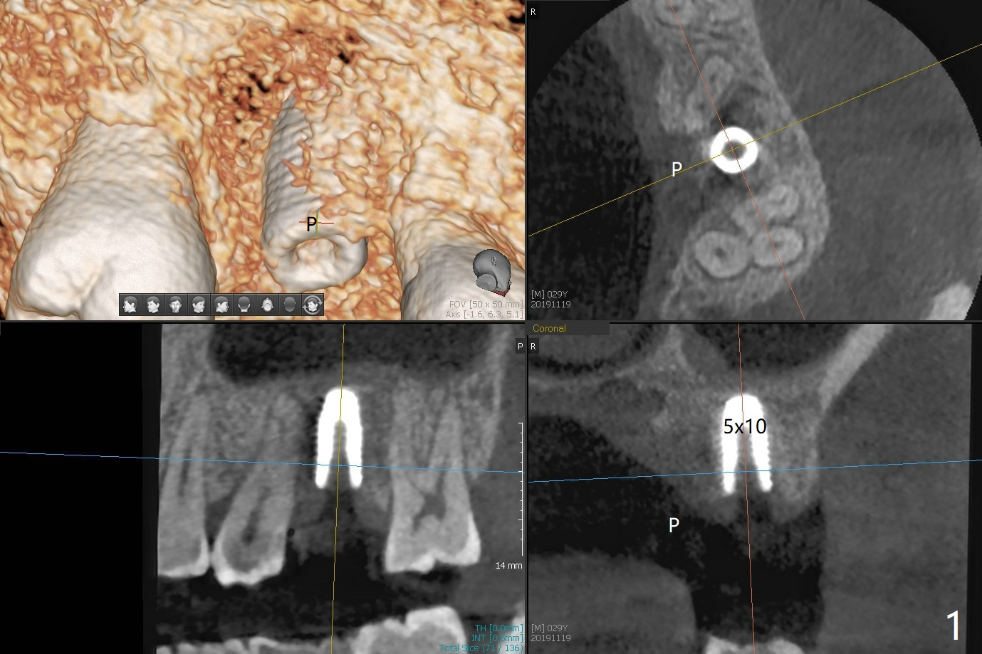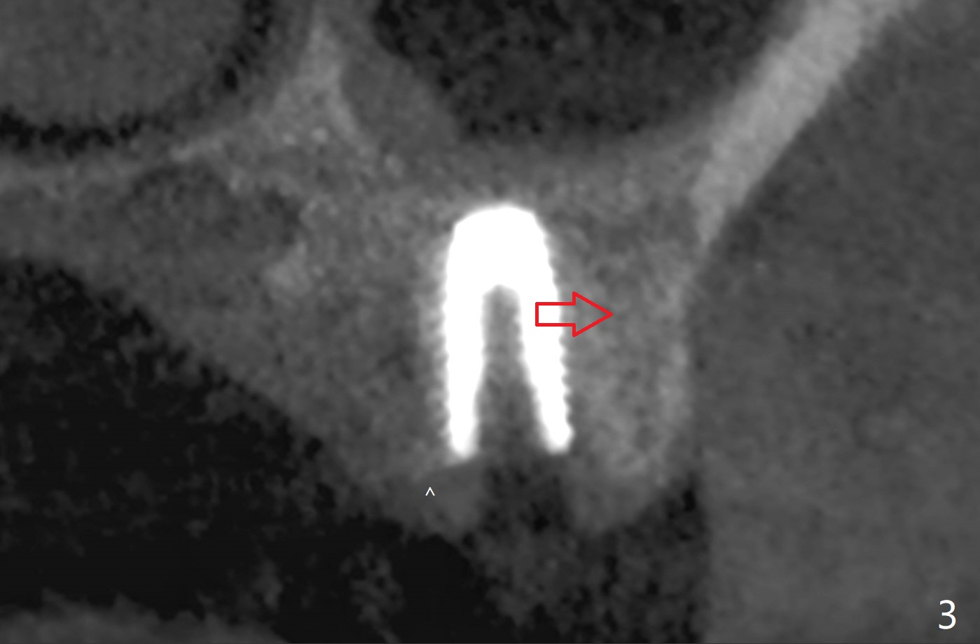 Low bone density is confirmed during osteotomy at #14 (6 months post socket preservation).  Underprep is adopted: after use of 3.5x10 mm drill instead of 4.5x10 mm one, a 4x10 and 4.5x10 mm dummy implant are placed for bone condensation.  When a 5x10 mm definitive implant is placed, it is unable to be placed to the depth.  After use of 4.0x10 mm, the final implant reaches depth ~ 1 mm more than planned.  But there appears no bone palatal to the implant clinically.  Small-field CT is taken.  In fact there is crestal bone palatal to the implant, but in small amount and in low bone density (Fig.1,2).  The implant should have been designed to be placed more buccal (Fig.3 arrow).  The implant also looks to be placed too close the root of the tooth #13, probably related to the rotation of #13 (Fig.4).  Unfortunately the patient does not agree to have limited orthodontics.  After palatal bone graft, GEM Cap is used to close the access with periodontal glue (Fig.5).  Spacer/periodontal dressing should have been used.  The wound heals 8 months postop, but 2-3 palatal threads are exposed with uncover.  After 6 mm profile drill and placement of a 6x4 mm healing abutment, allograft is placed palatal (Fig.6).  Upper Molar Immediate Implant, Trajectory II Shield Next Case of Buccal Defect  SP Xin Wei, DDS, PhD, MS 1st edition 11/19/2019, last revision 09/19/2020