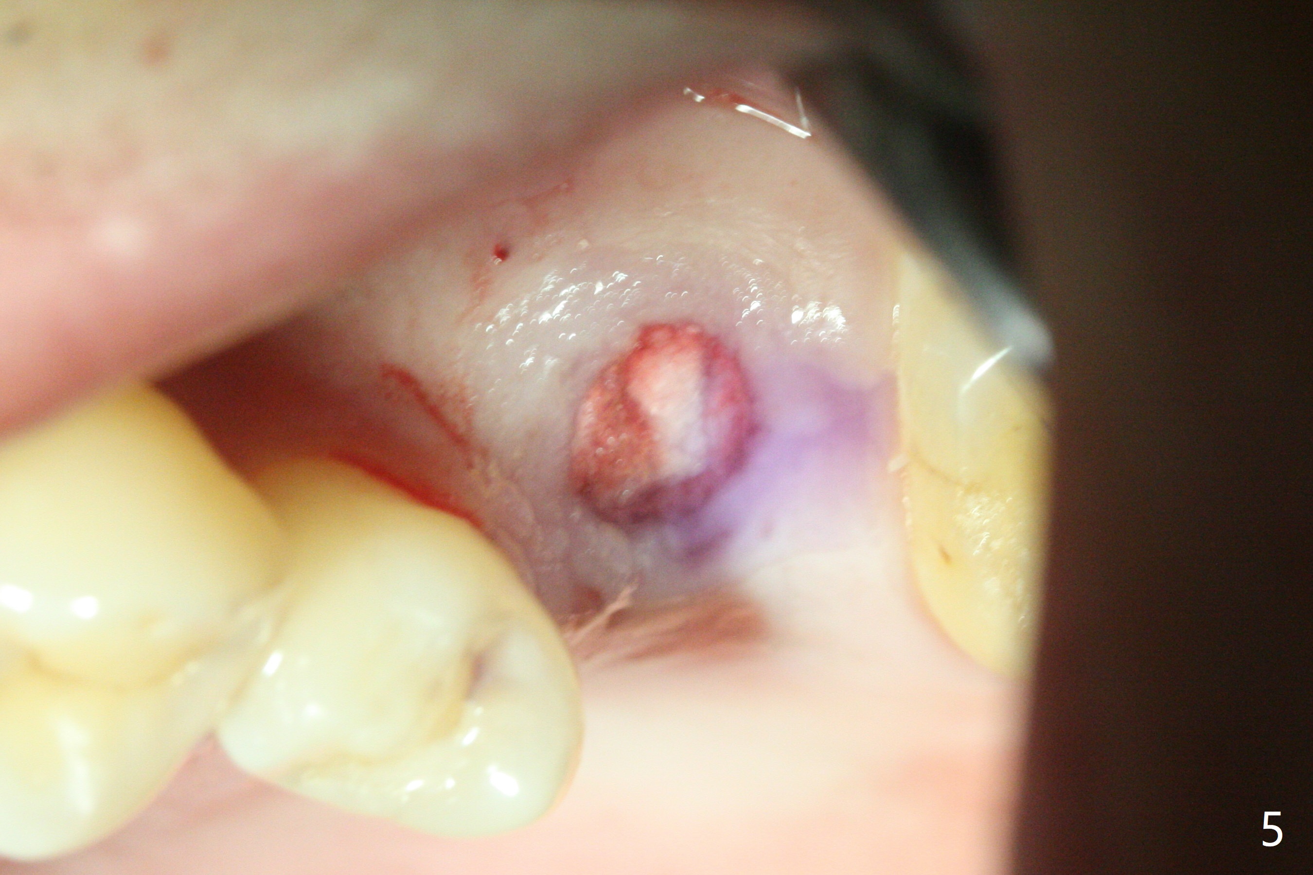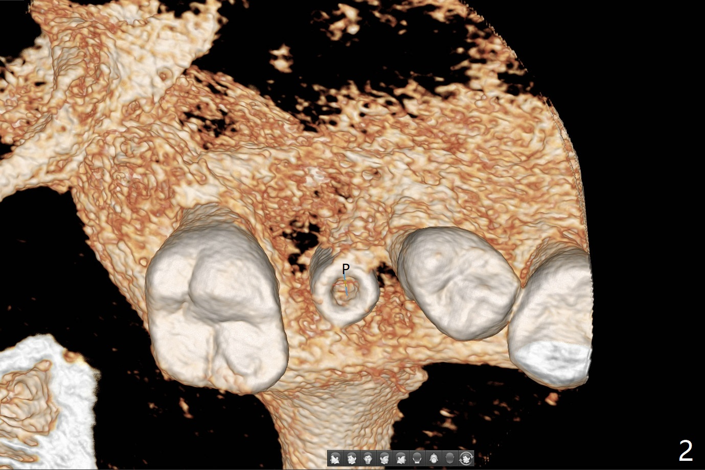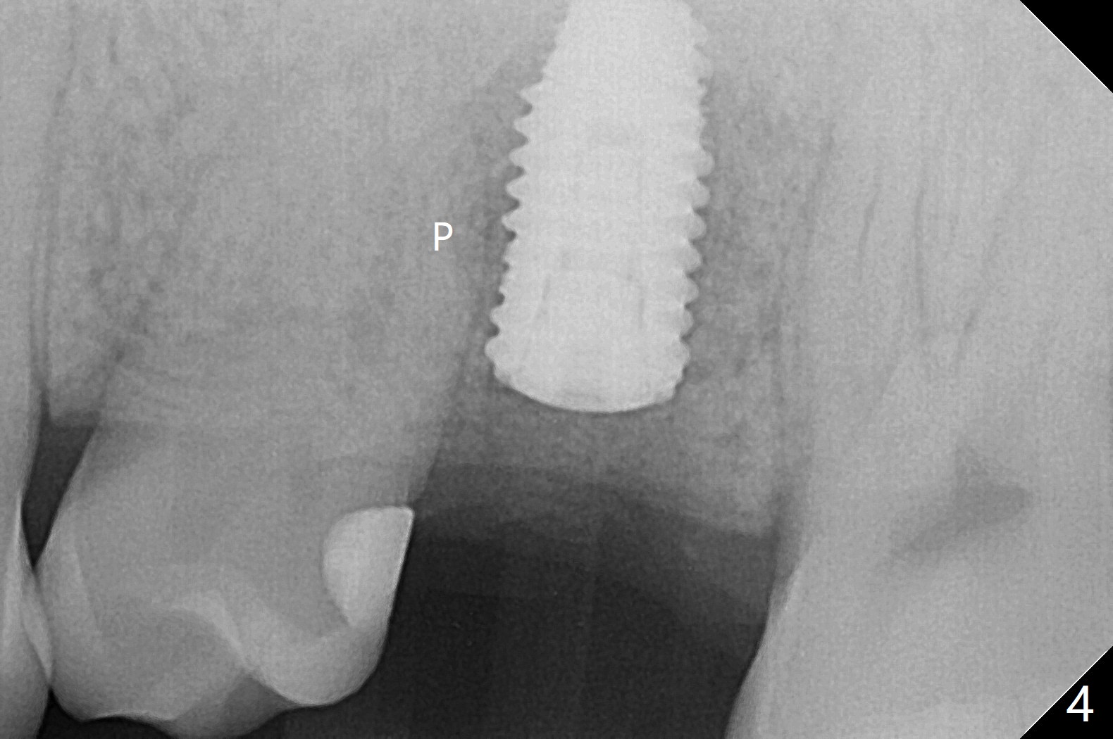 Low bone density is confirmed during osteotomy at #14 (6 months post socket preservation).  Underprep is adopted: after use of 3.5x10 mm drill instead of 4.5x10 mm one, a 4x10 and 4.5x10 mm dummy implant are placed for bone condensation.  When a 5x10 mm definitive implant is placed, it is unable to be placed to the depth.  After use of 4.0x10 mm, the final implant reaches depth ~ 1 mm more than planned.  But there appears no bone palatal to the implant clinically.  Small-field CT is taken.  In fact there is crestal bone palatal to the implant, but in small amount and in low bone density (Fig.1,2).  The implant should have been designed to be placed more buccal (Fig.3 arrow).  The implant also looks to be placed too close the root of the tooth #13, probably related to the rotation of #13 (Fig.4).  Unfortunately the patient does not agree to have limited orthodontics.  After palatal bone graft, GEM Cap is used to close the access with periodontal glue (Fig.5).  Spacer/periodontal dressing should have been used.  The wound heals 8 months postop, but 2-3 palatal threads are exposed with uncover.  After 6 mm profile drill and placement of a 6x4 mm healing abutment, allograft is placed palatal (Fig.6).  Upper Molar Immediate Implant, Trajectory II Shield Next Case of Buccal Defect  SP Xin Wei, DDS, PhD, MS 1st edition 11/19/2019, last revision 09/19/2020
