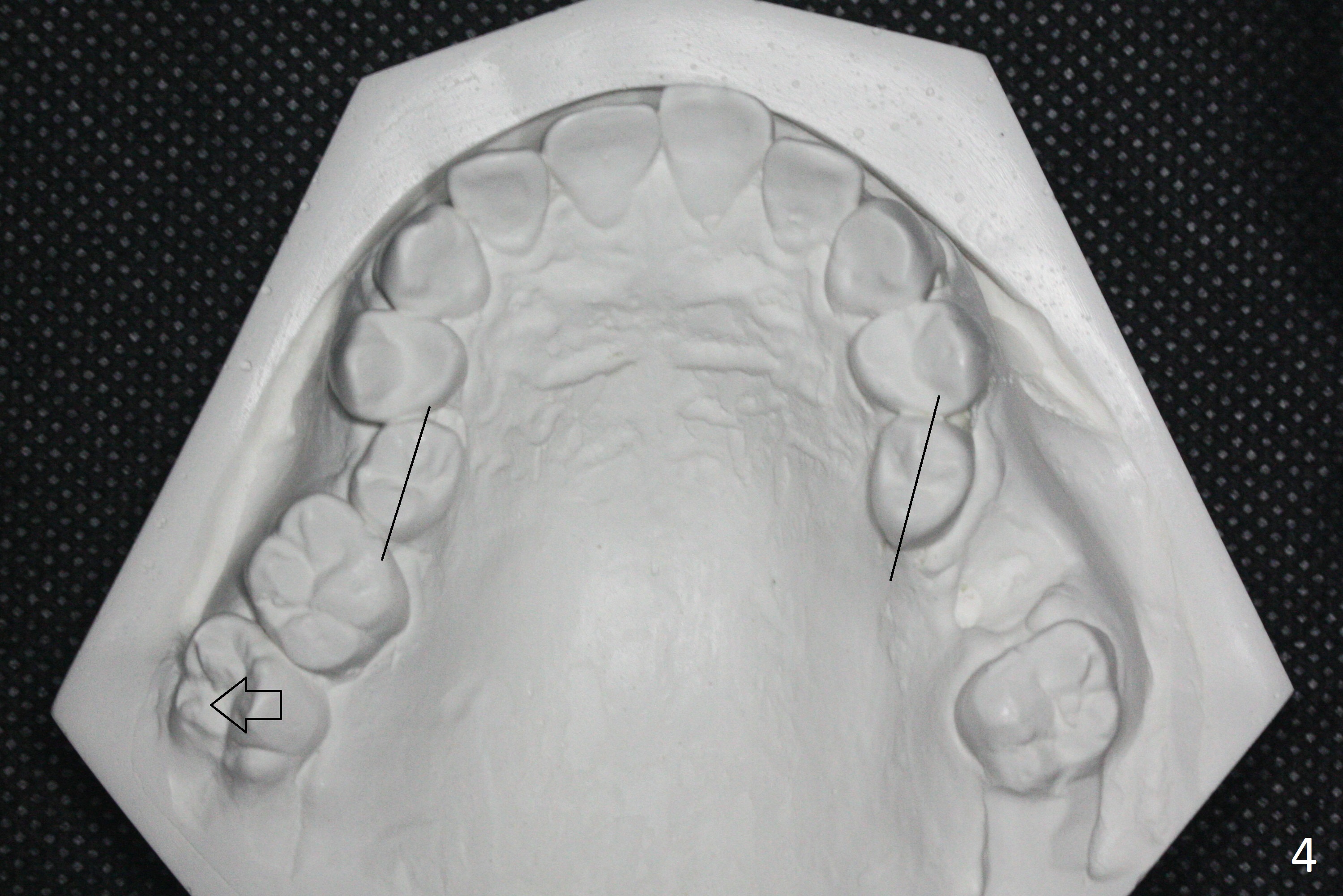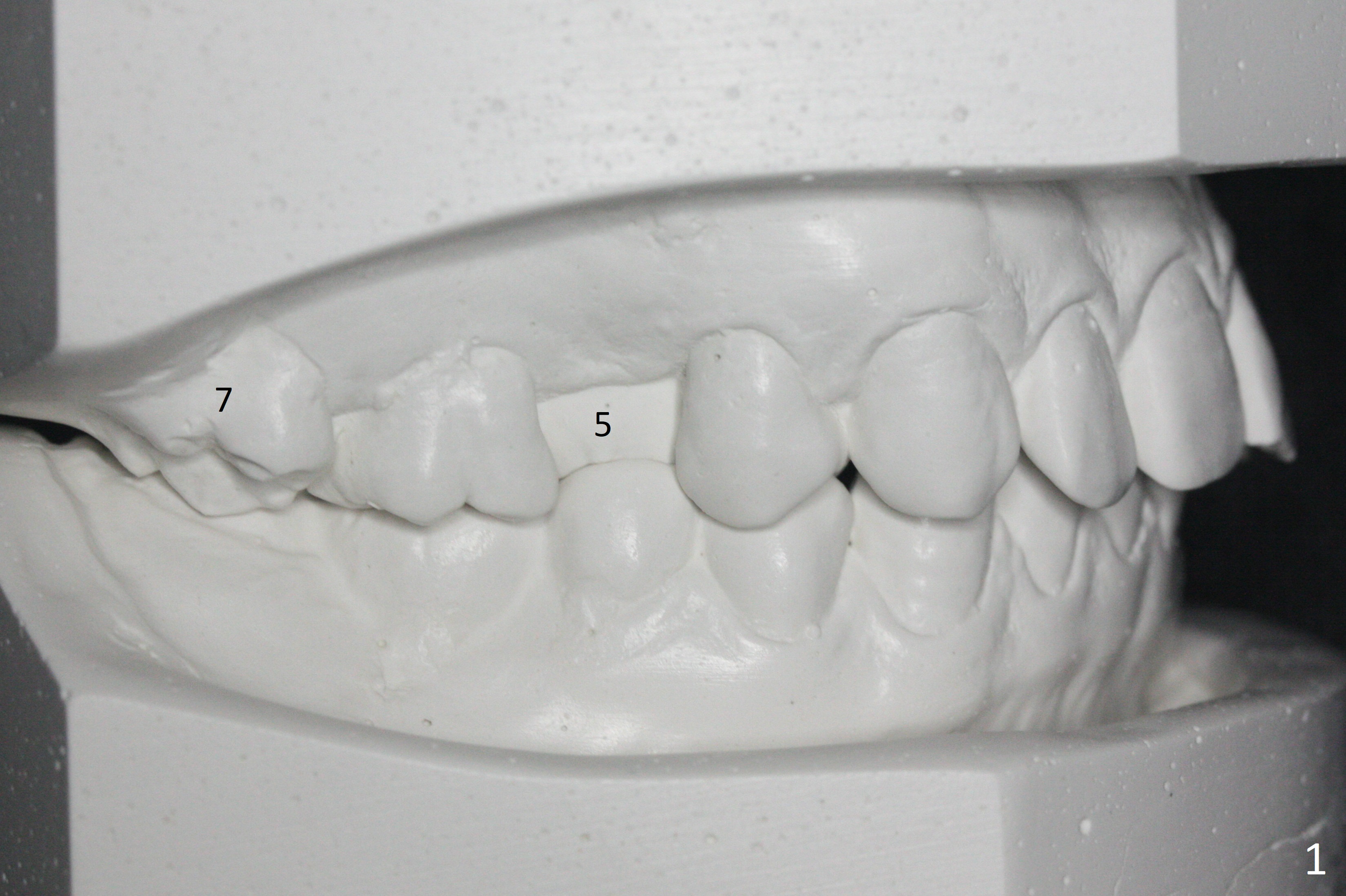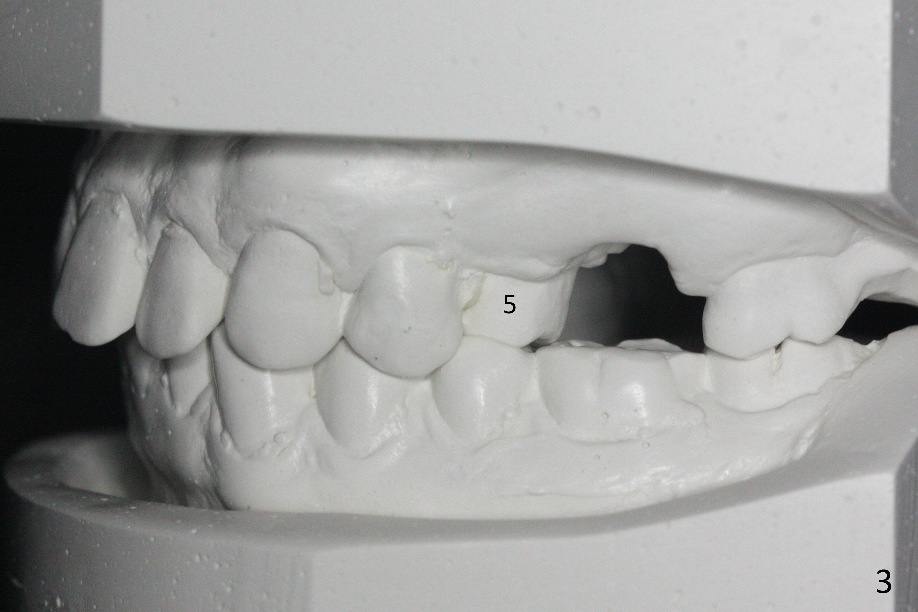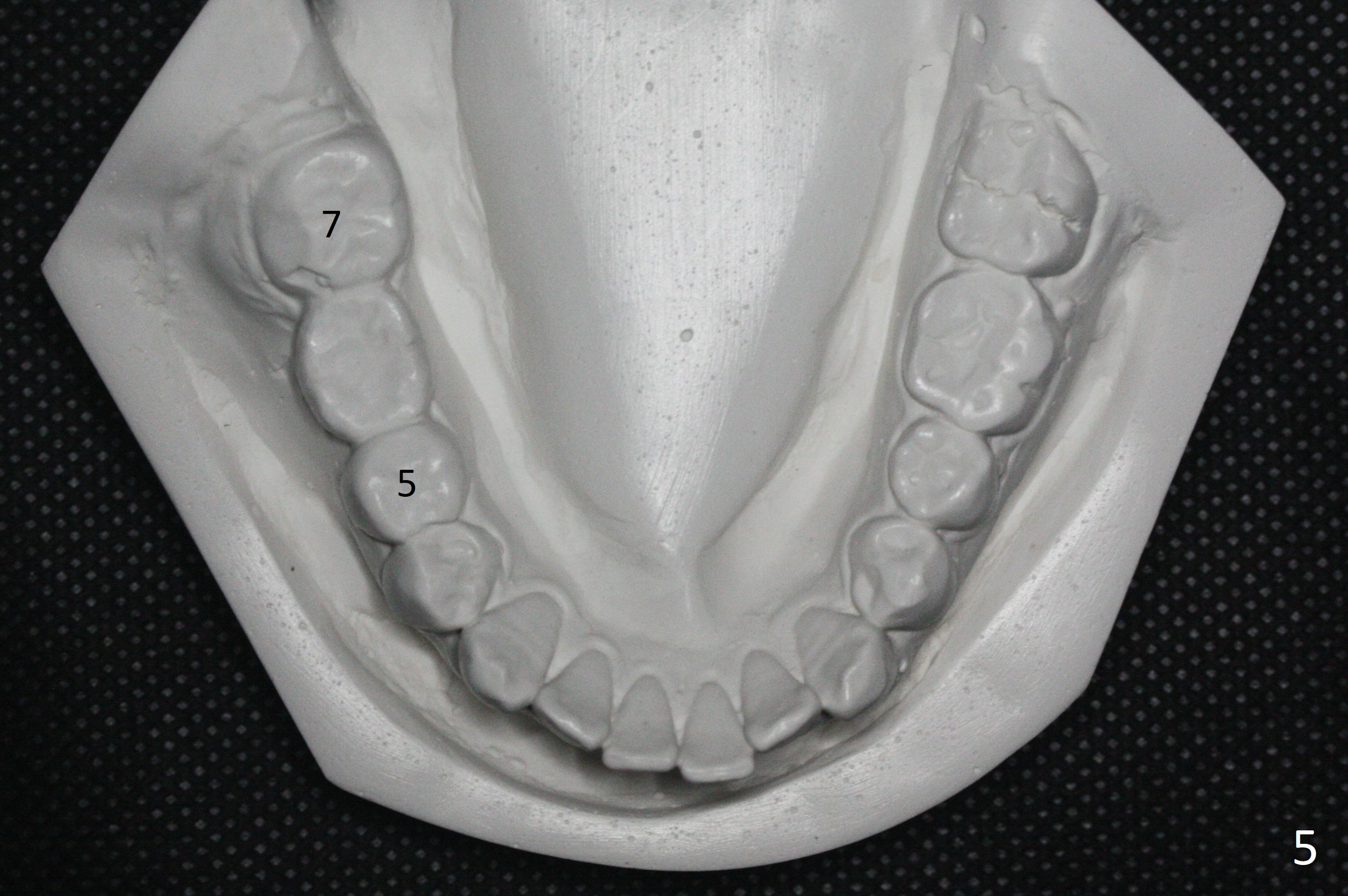 A 29-year-old man has crowding (especially cross bite of UR7 and U5s, Fig.1,3,4) associated with extraction of UL6 for a month (Fig.3,4). For lower arch alignment, how to handle LR5-7 FPD (Fig.5)? The patient will return for CT and impression for #14 guided surgery. A separator will be placed between UL4/5 on the day of implant placement. Brackets will be placed between UL3-7 in the 1st postop visit.