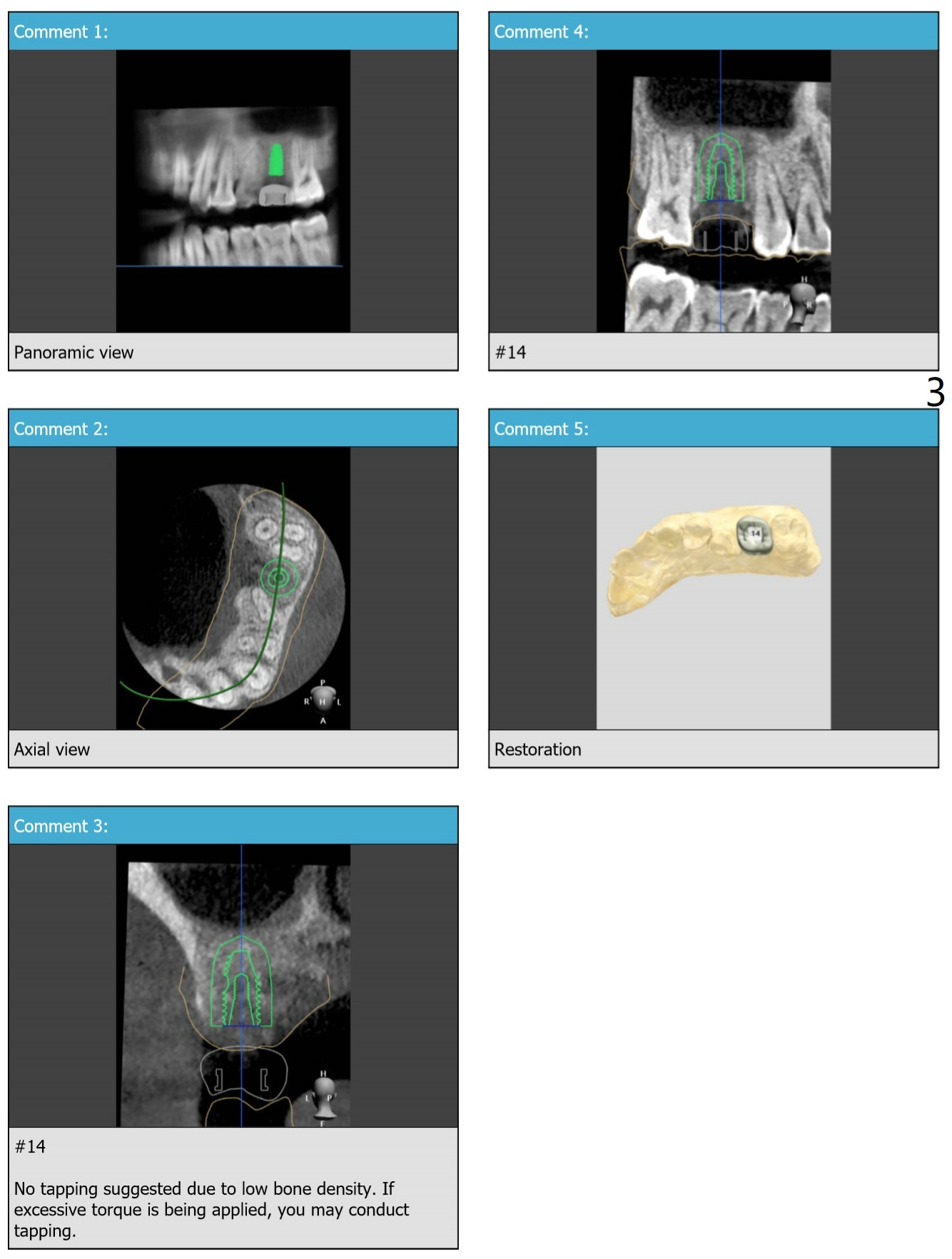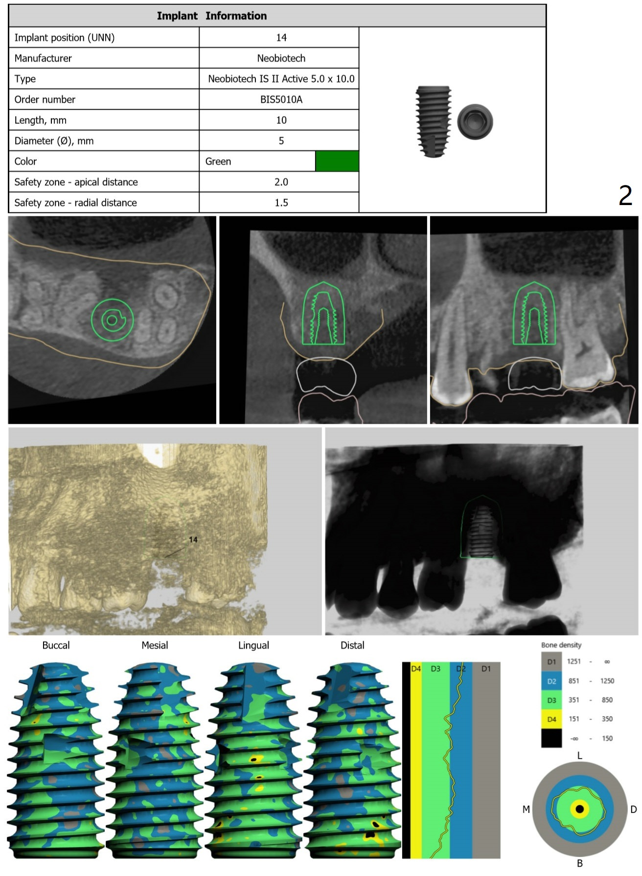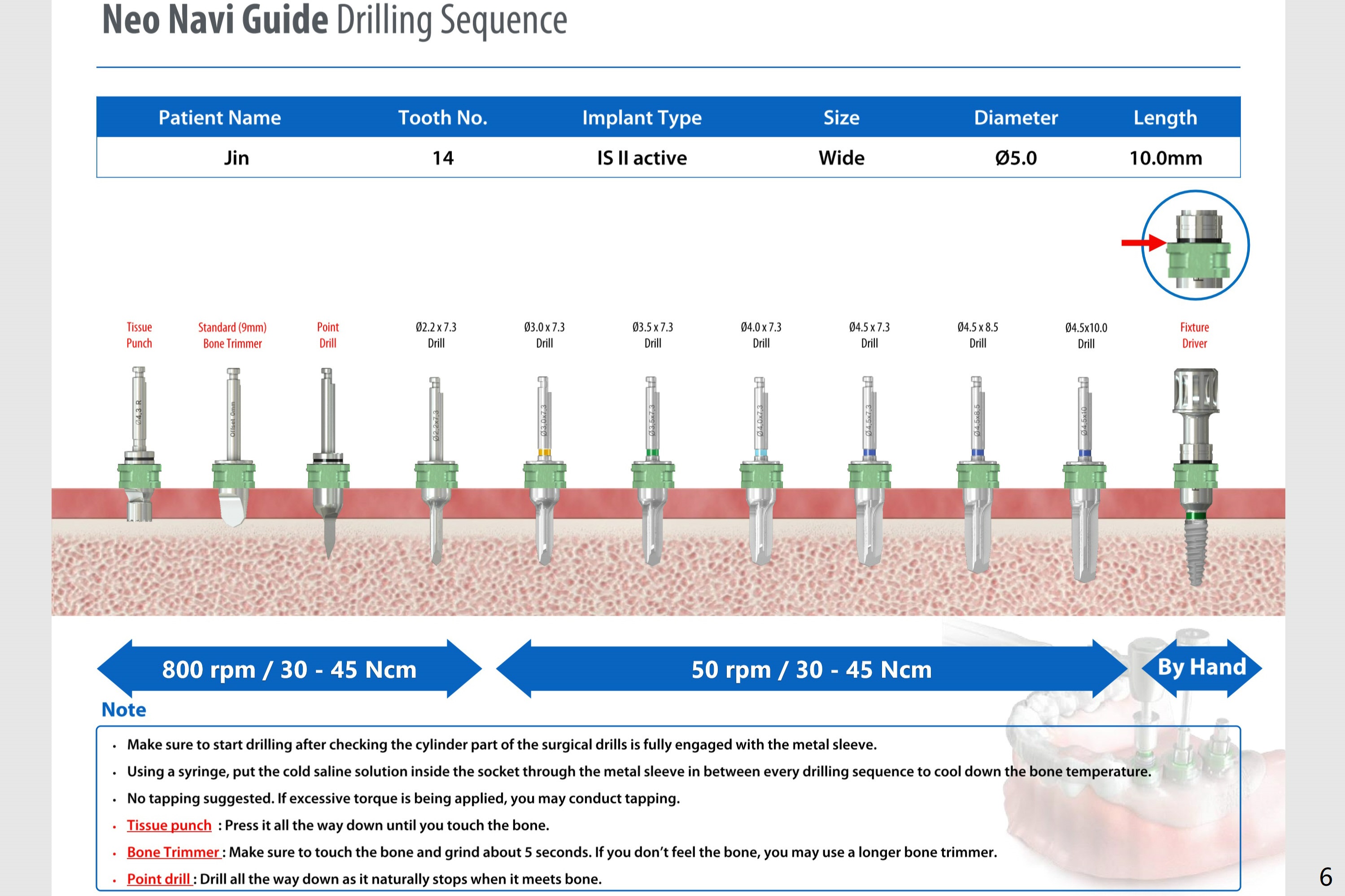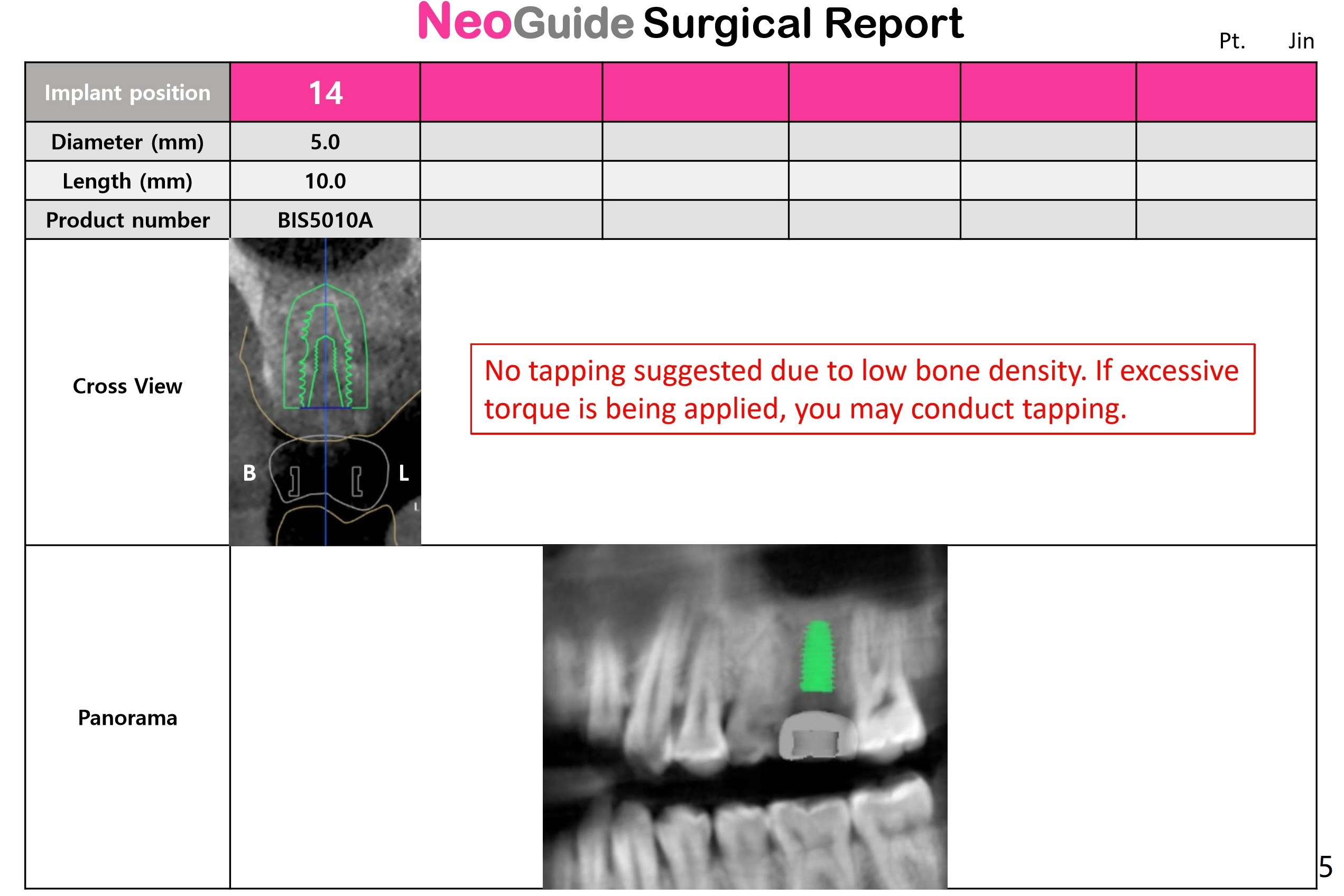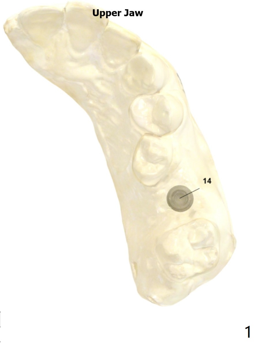 To reduce abutment screw loosening associated with low palatal bone density and buccal implant placement at #14, a Bicon implant will be placed (5x6 mm) with a healing abutment. Save bone in case of bone graft. Use 5 mm Bicon reamer free hand after drill sequence with guide except the last drill. Also open UF guide kit to see whether there are 5 mm drills. Prepare sensor 1 for PA and sensor 2 for BW. Place a separator between 12 and 13 for ortho immediately postop. Palatal socket shield should have been done to reduce bone graft loss before wound healing.