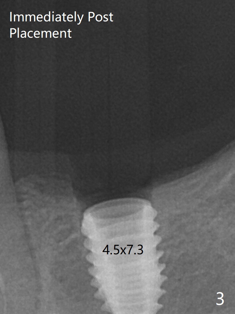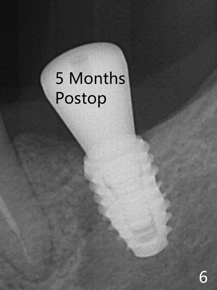 Fig.3: Implant placement at #19 with guide. The gingiva around the healing abutment (5.5x3 mm) at #19 is erythematous (Fig.5), probably related to the submerged abutment. There is no bone loss 5 months postop (Fig.6).