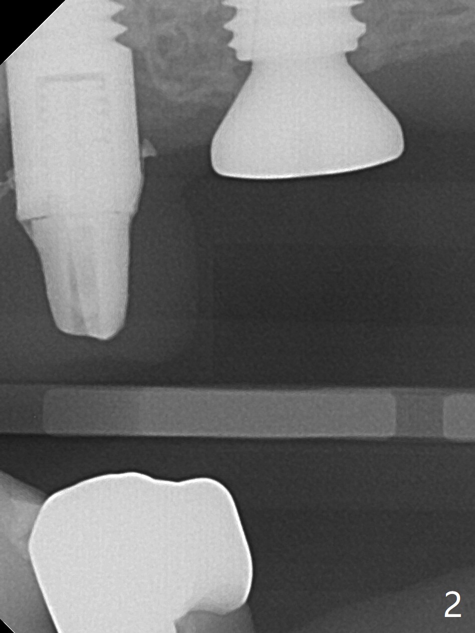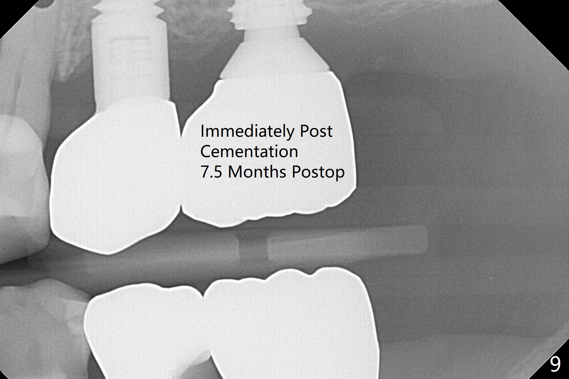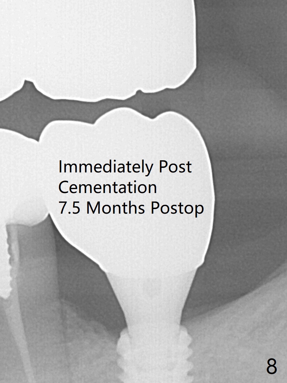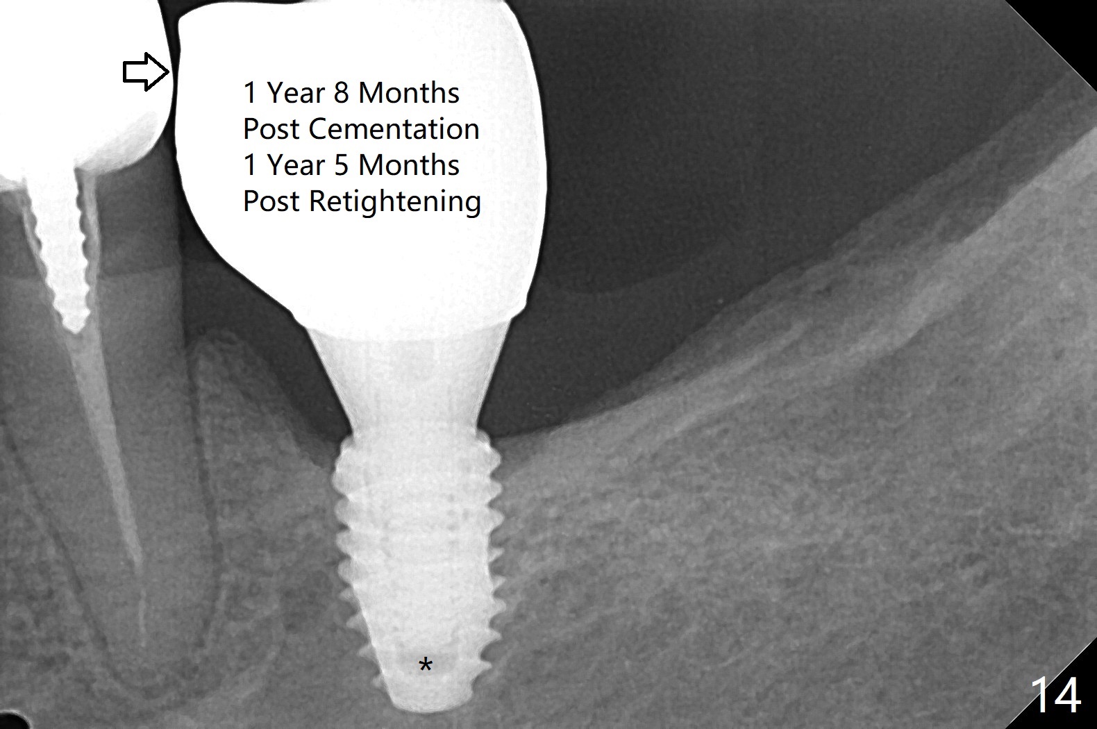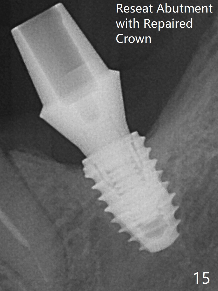 As a surgeon, I have never felt that my scalpel is as precise as media claims to be until guided surgery is introduced. The implants at #14 and 19 are placed as precisely as planned as well as painlessly and quickly (Fig.1-4). What else can we ask for? The gingiva around the healing abutment (5.5x3 mm) at #19 is erythematous (Fig.5). Later a longer healing abutment is used (Fig.6 (5.5x5 mm)). There is no bone loss 5 months or 7 months postop (Fig.6-9). The abutment screw is loose 3 months post cementation due to unfavorable crown/implant ratio (Fig.10); in fact the abutment is incompletely seated. Bicon implants will be in consideration to reduce screw loosening if implants are to be placed at #15 and 18. The abutment screw at #14 becomes loose 10 months post cementation; after retorque at #30 Ncm, the abutment is incompletely seated (Fig.11). It remains the same after use of 4.6 and 5.6 mm profile drills (Fig.12). A healing abutment is placed. When the patient returns, use planning kit and try to place a 5.2x5.5(2) cemented abutment. In fact it works (Fig.13). The crown at #19 is loose again 1 year 5 months post retightening. After removing crown/abutment, the mesial surface of the crown is heavily reduced. The crown/abutment is reseated to make sure that there is no proximal contact between the neighboring teeth (Fig.14 arrow). Because of tilt of the PA, it is difficult to tell the tightness of the contact between the implant and abutment, but the apical space is significantly reduced (*, as compared to Fig.10). Pick up impression is taken for porcelain addition occlusomesially. Two months later the patient returns for crown recementation. When the abutment is reseated with the repaired crown, the seating is incomplete (Fig.15). The abutment is completely seated when it is turned free hand with the flat surface of the abutment faces distal (Fig.16 D). The screw is torqued 20 Ncm before reimpression.