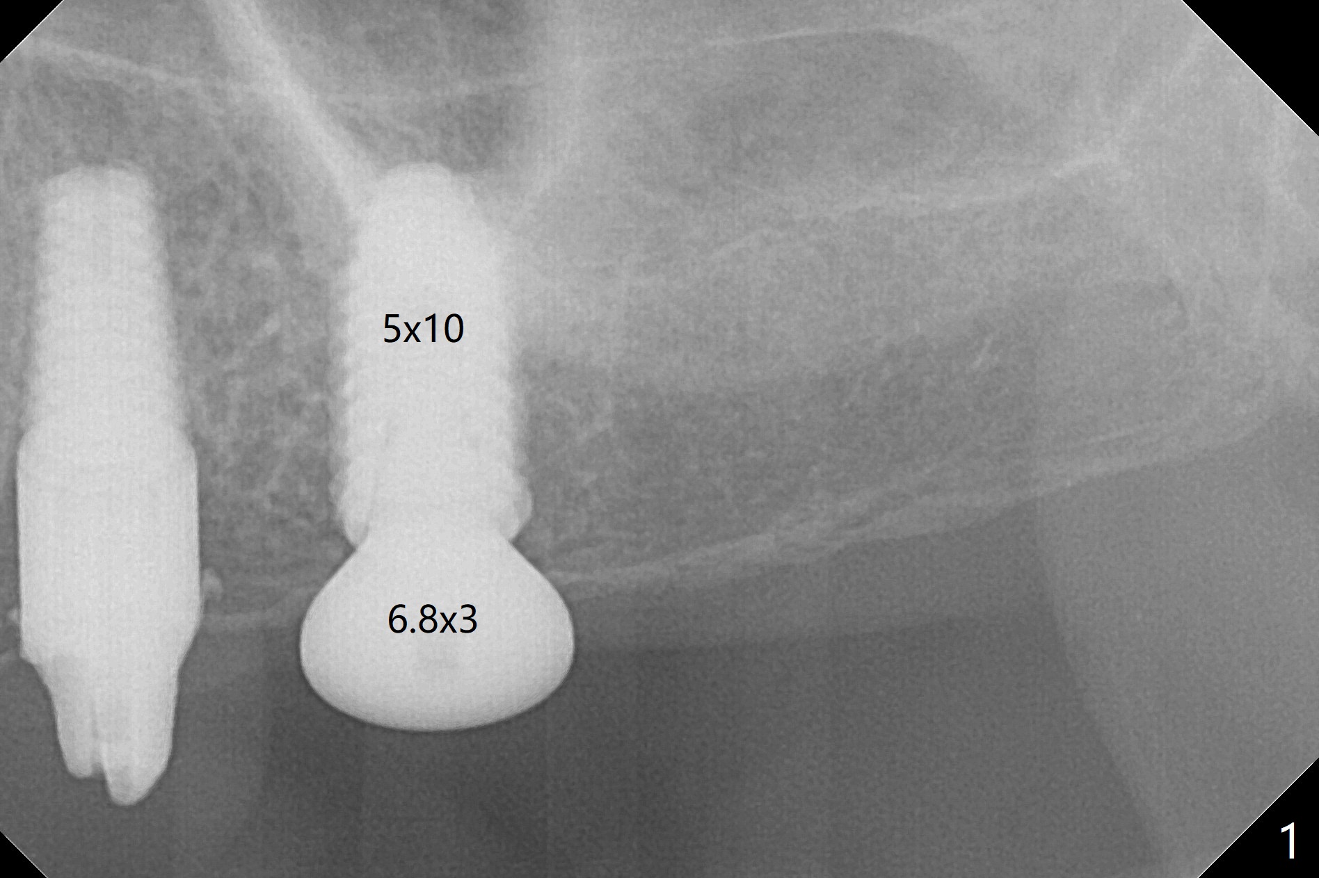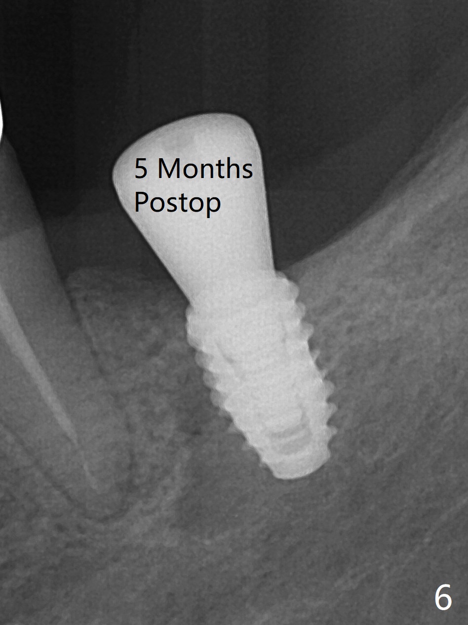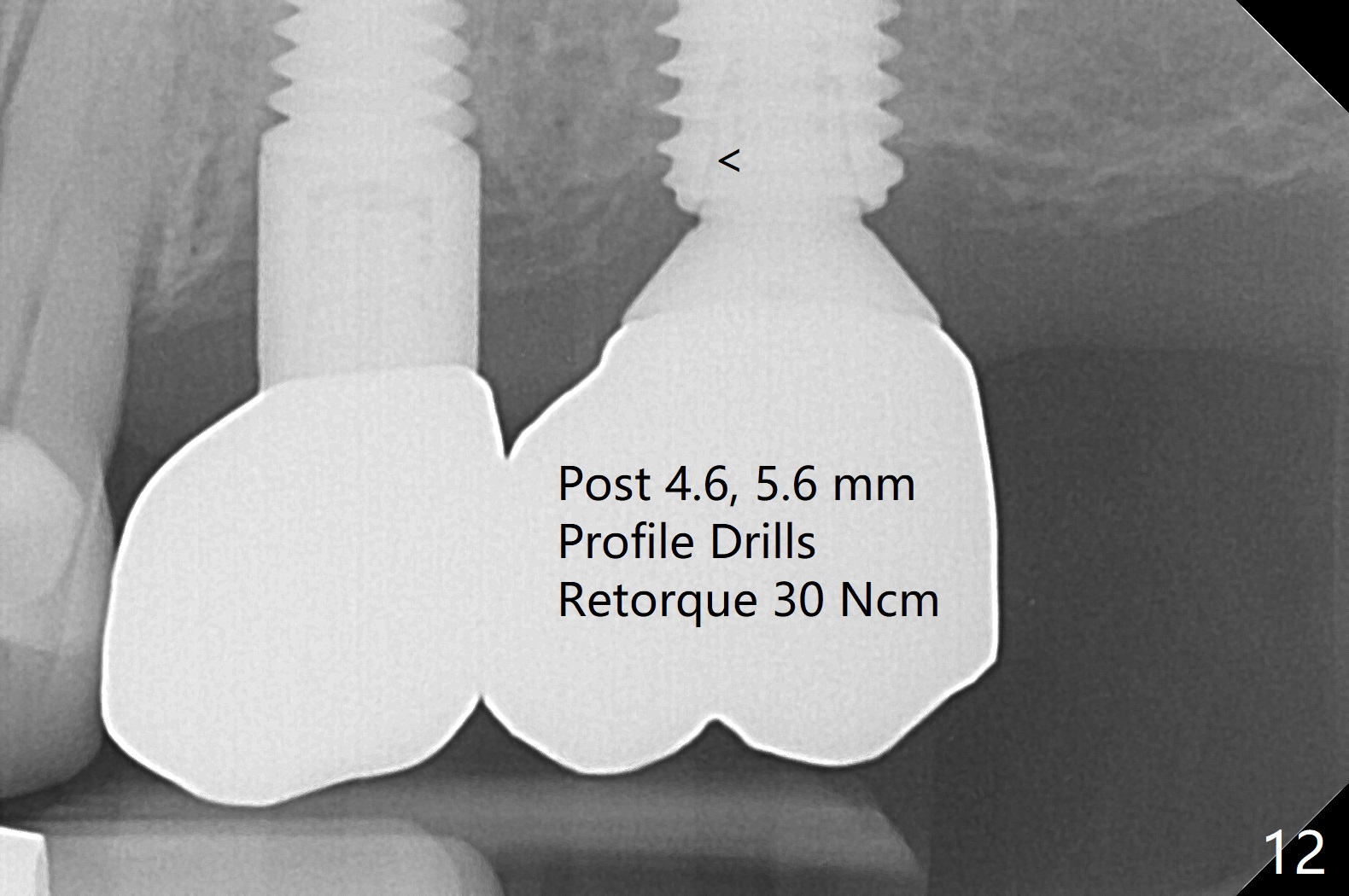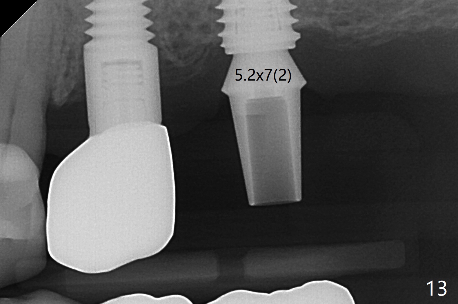 As a surgeon, I have never felt that my scalpel is as precise as media claims to be until guided surgery is introduced. The implants at #14 and 19 are placed as precisely as planned as well as painlessly and quickly (Fig.1-4). What else can we ask for? The gingiva around the healing abutment (5.5x3 mm) at #19 is erythematous (Fig.5). Later a longer healing abutment is used (Fig.6 (5.5x5 mm)). There is no bone loss 5 months or 7 months postop (Fig.6-9). The abutment screw is loose 3 months post cementation due to unfavorable crown/implant ratio (Fig.10); in fact the abutment is incompletely seated. Bicon implants will be in consideration to reduce screw loosening if implants are to be placed at #15 and 18. The abutment screw at #14 becomes loose 10 months post cementation; after retorque at #30 Ncm, the abutment is incompletely seated (Fig.11). It remains the same after use of 4.6 and 5.6 mm profile drills (Fig.12). A healing abutment is placed. When the patient returns, use planning kit and try to place a 5.2x5.5(2) cemented abutment. In fact it works (Fig.13). The crown at #19 is loose again 1 year 5 months post retightening. After removing crown/abutment, the mesial surface of the crown is heavily reduced. The crown/abutment is reseated to make sure that there is no proximal contact between the neighboring teeth (Fig.14 arrow). Because of tilt of the PA, it is difficult to tell the tightness of the contact between the implant and abutment, but the apical space is significantly reduced (*, as compared to Fig.10). Pick up impression is taken for porcelain addition occlusomesially. Two months later the patient returns for crown recementation. When the abutment is reseated with the repaired crown, the seating is incomplete (Fig.15). The abutment is completely seated when it is turned free hand with the flat surface of the abutment faces distal (Fig.16 D). The screw is torqued 20 Ncm before reimpression.