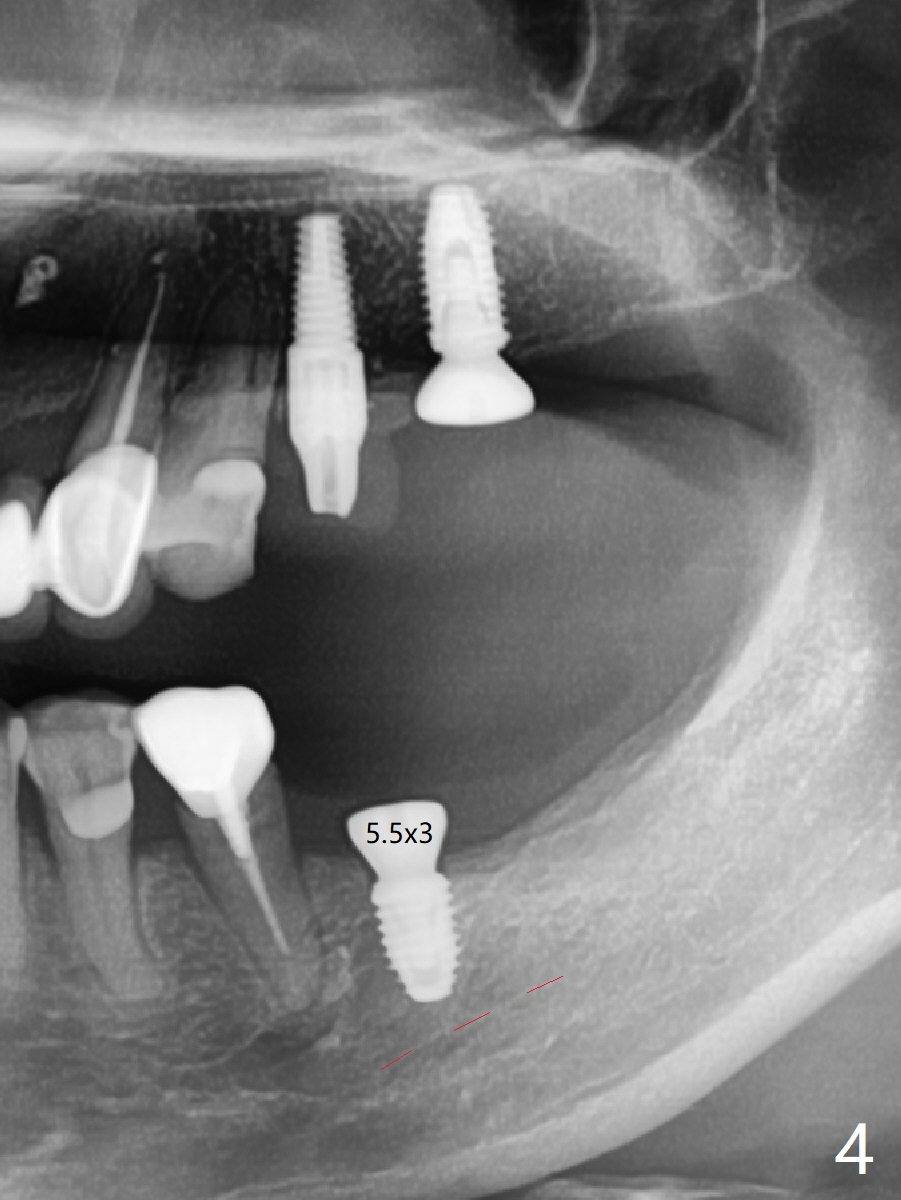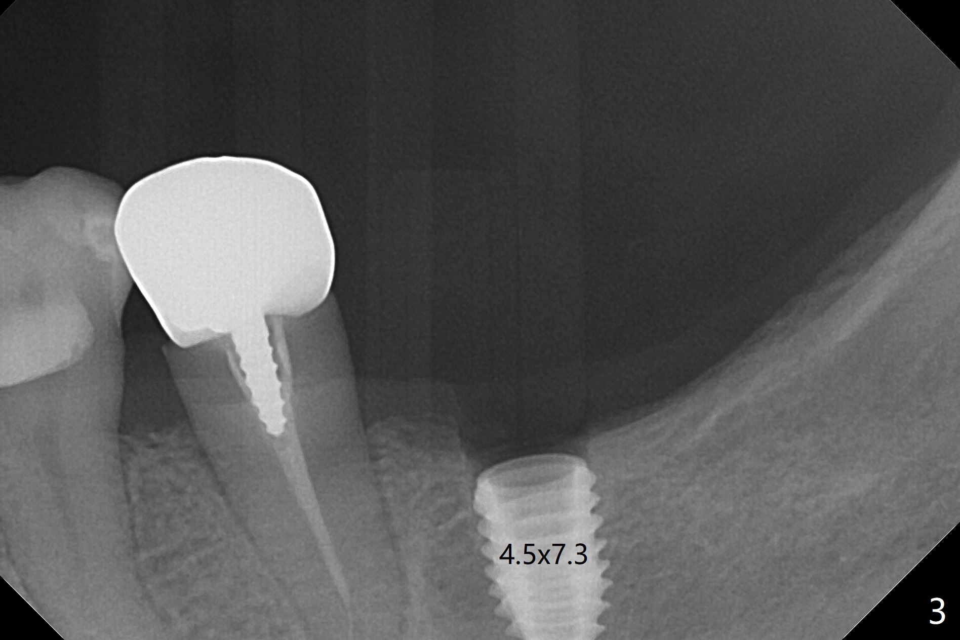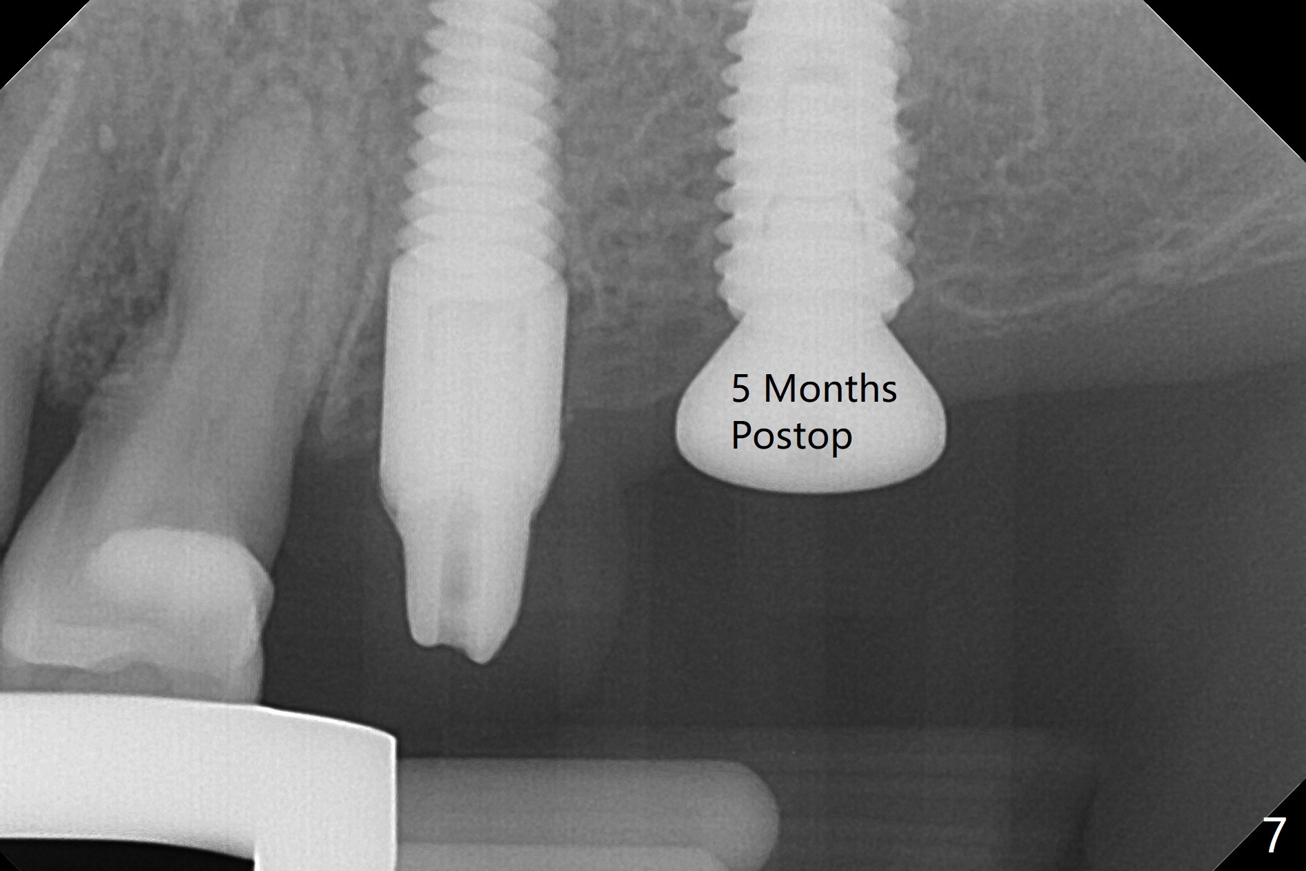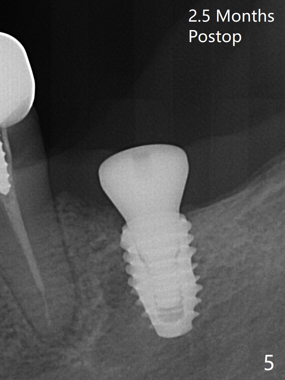 As a surgeon, I have never felt that my scalpel is as precise as media claims to be until guided surgery is introduced. The implants at #14 and 19 are placed as precisely as planned as well as painlessly and quickly (Fig.1-4). What else can we ask for? The gingiva around the healing abutment (5.5x3 mm) at #19 is erythematous (Fig.5). Later a longer healing abutment is used (Fig.6 (5.5x5 mm)). There is no bone loss 5 months or 7 months postop (Fig.6-9). The abutment screw is loose 3 months post cementation due to unfavorable crown/implant ratio (Fig.10); in fact the abutment is incompletely seated. Bicon implants will be in consideration to reduce screw loosening if implants are to be placed at #15 and 18. The abutment screw at #14 becomes loose 10 months post cementation; after retorque at #30 Ncm, the abutment is incompletely seated (Fig.11). It remains the same after use of 4.6 and 5.6 mm profile drills (Fig.12). A healing abutment is placed. When the patient returns, use planning kit and try to place a 5.2x5.5(2) cemented abutment. In fact it works (Fig.13). The crown at #19 is loose again 1 year 5 months post retightening. After removing crown/abutment, the mesial surface of the crown is heavily reduced. The crown/abutment is reseated to make sure that there is no proximal contact between the neighboring teeth (Fig.14 arrow). Because of tilt of the PA, it is difficult to tell the tightness of the contact between the implant and abutment, but the apical space is significantly reduced (*, as compared to Fig.10). Pick up impression is taken for porcelain addition occlusomesially. Two months later the patient returns for crown recementation. When the abutment is reseated with the repaired crown, the seating is incomplete (Fig.15). The abutment is completely seated when it is turned free hand with the flat surface of the abutment faces distal (Fig.16 D). The screw is torqued 20 Ncm before reimpression.