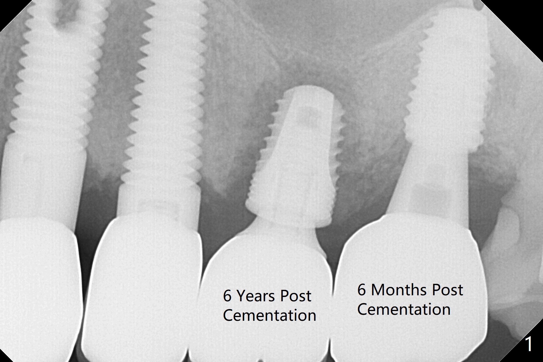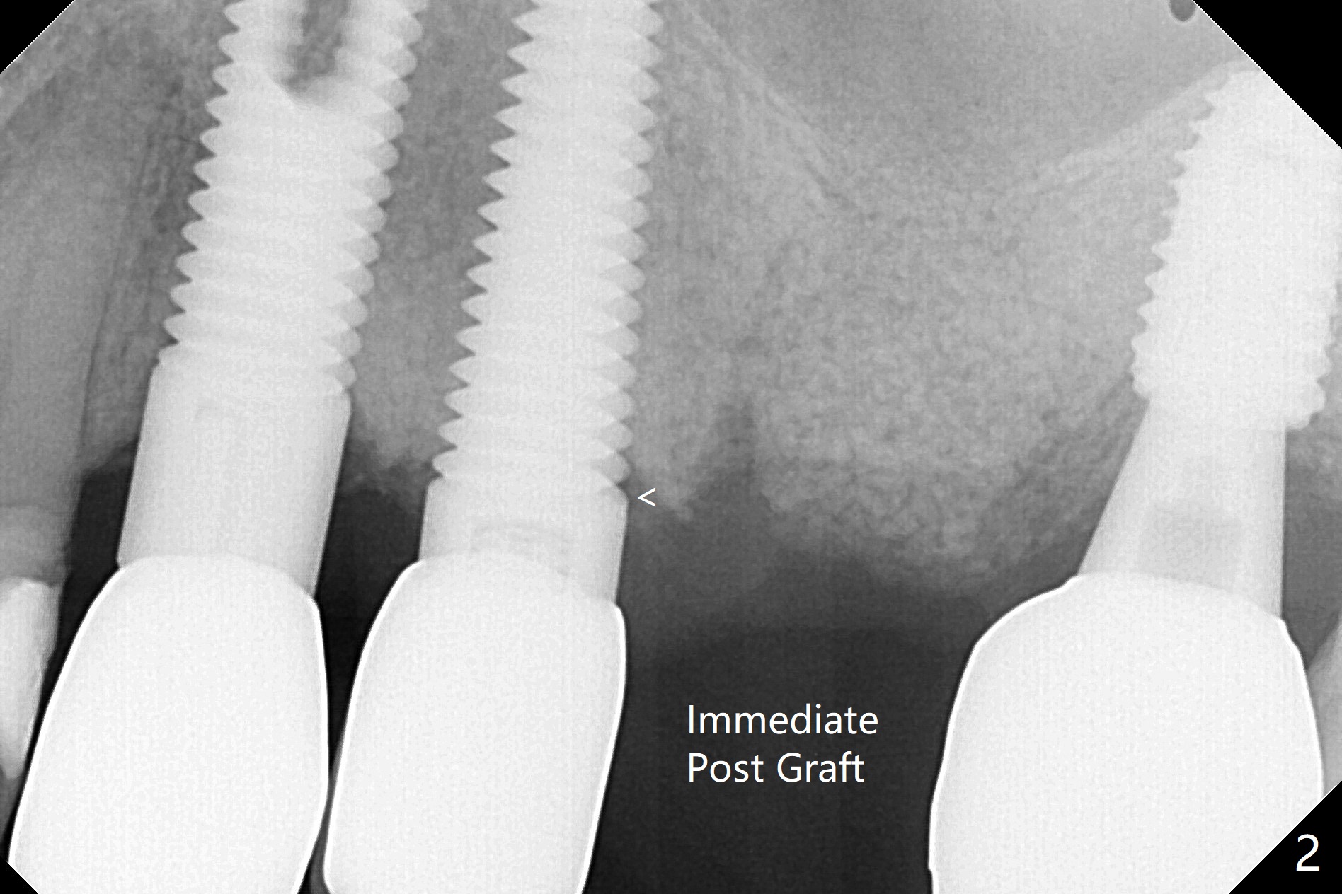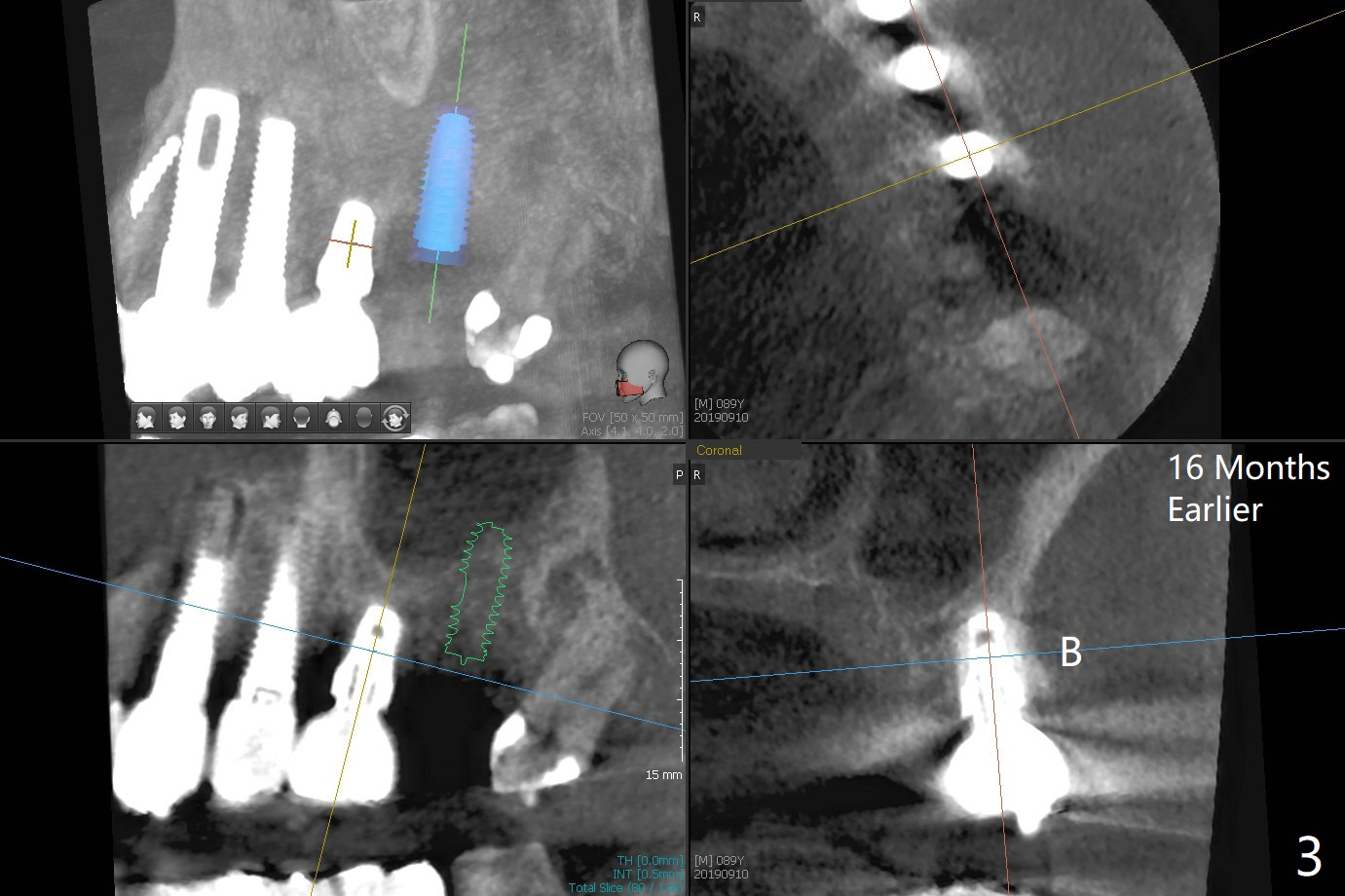 91岁男,刚诊断骨质疏松,准备服用骨质疏松药物Fosamax 70mg 每周一次。主诉左上植牙松动(图一),容易取出,颊侧骨板缺失,上颌窦底板好像完整,清创后,填入皮质骨粉(图二),GEM Cap,牙周胶水,牙周敷料。The buccal plate was present 1 year 4 months earlier (Fig.3). SM implants appear to have rapid bone loss associated with poor bone quality and bruxism.
