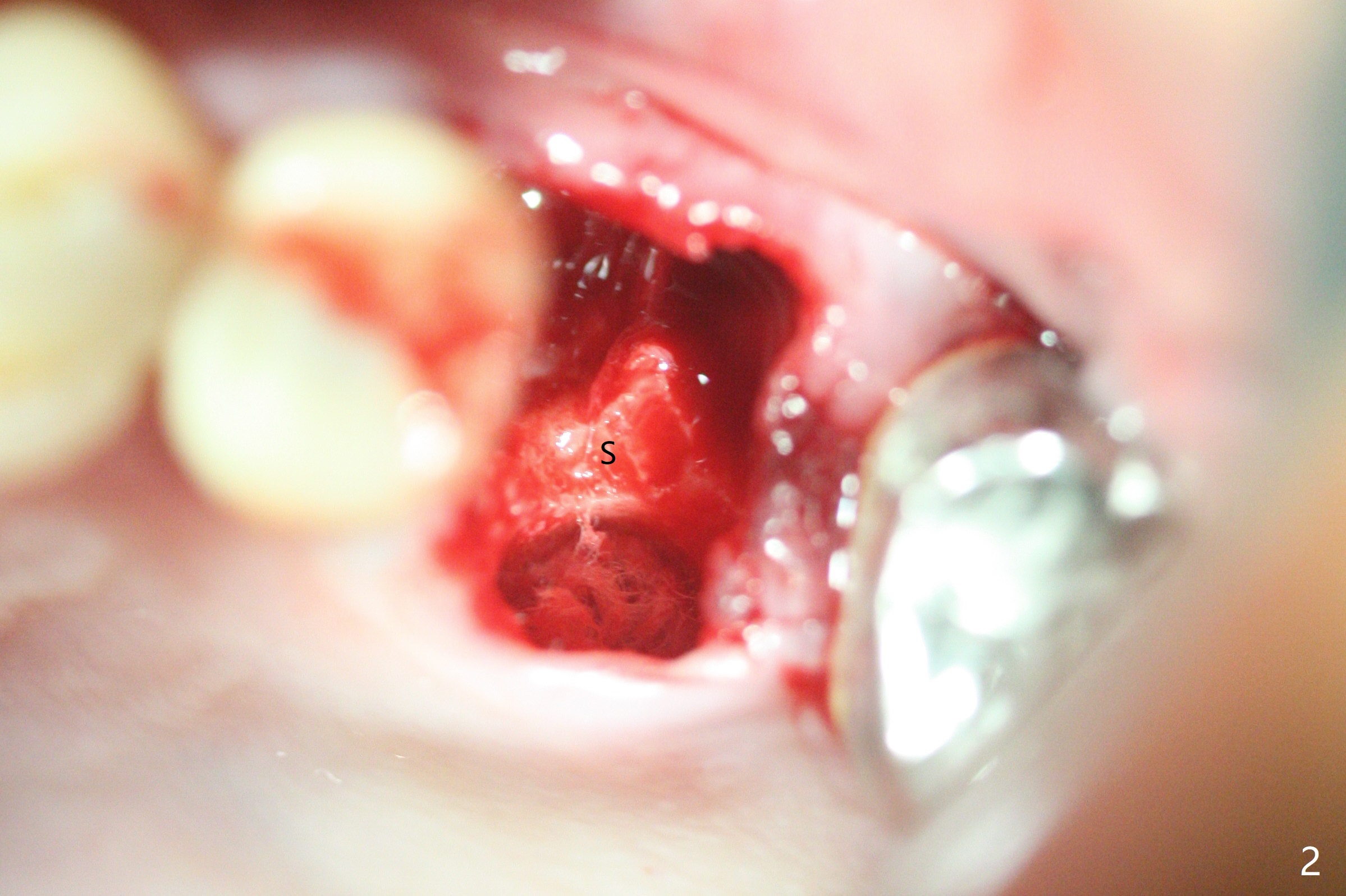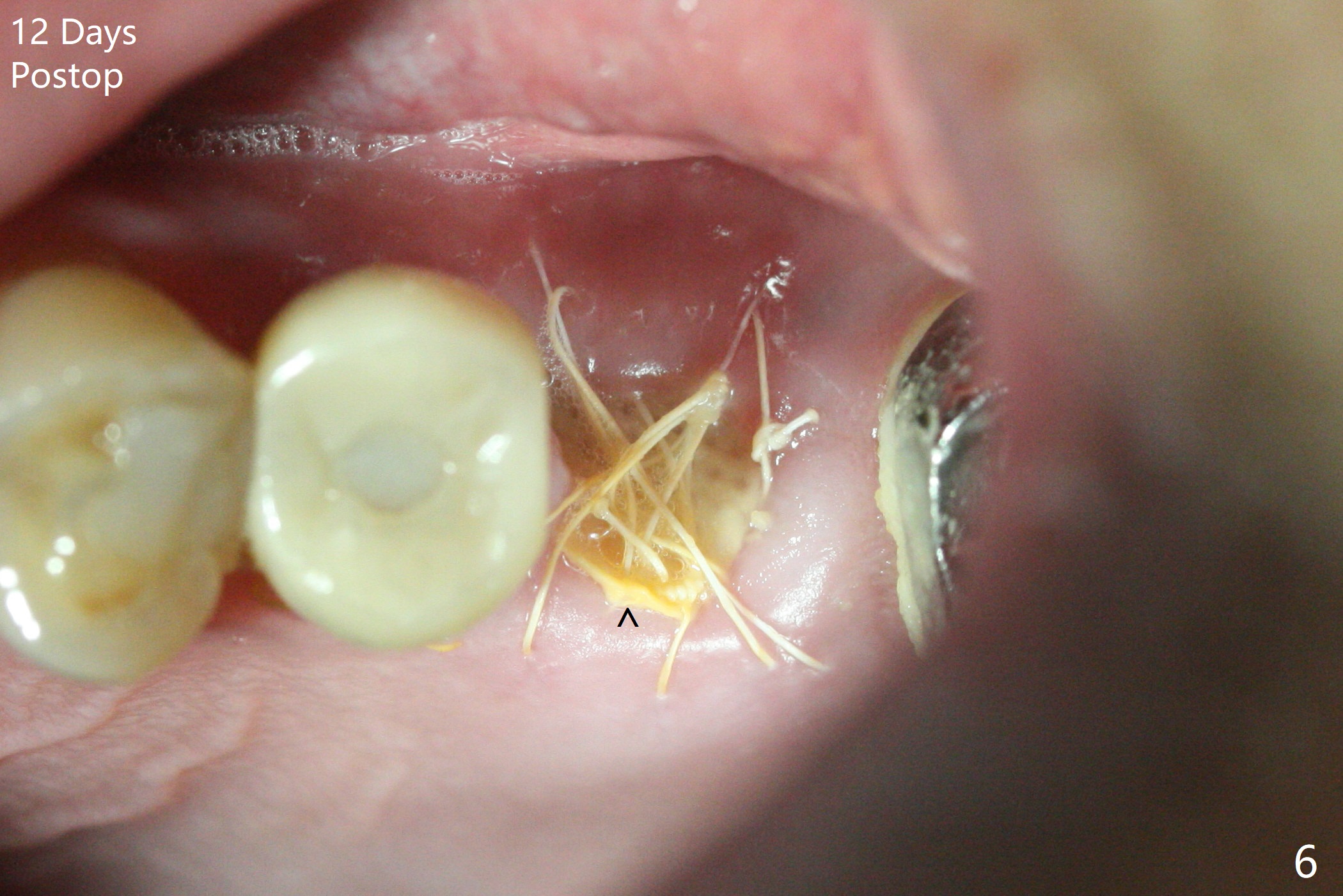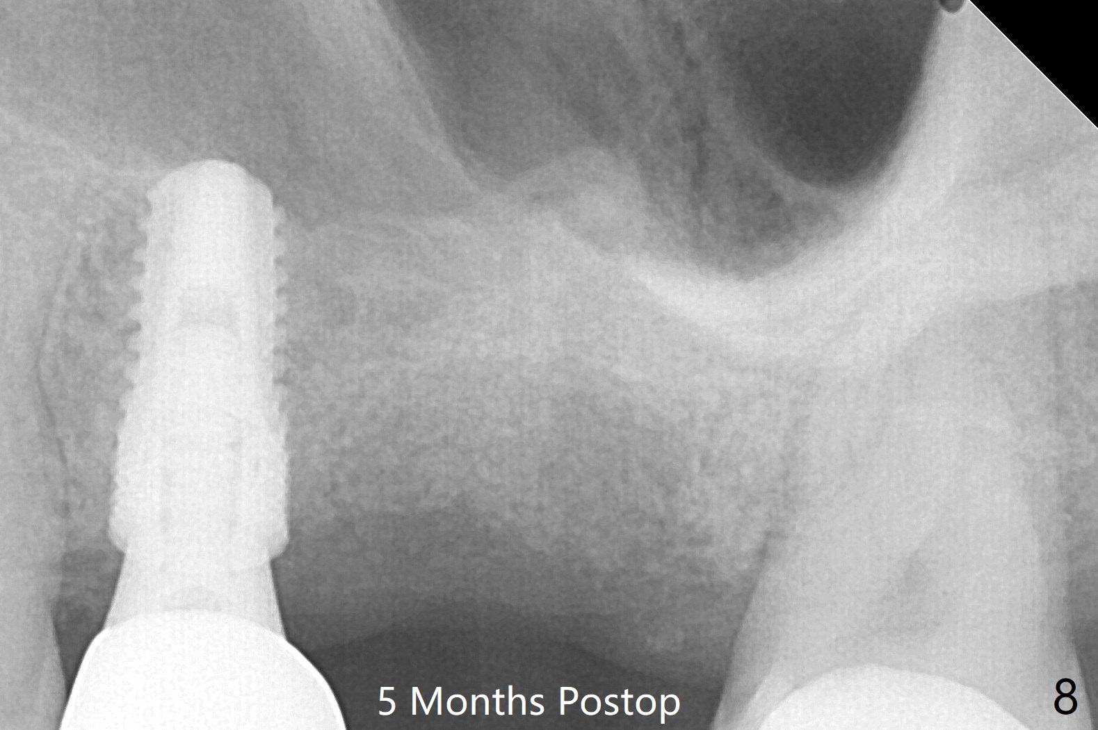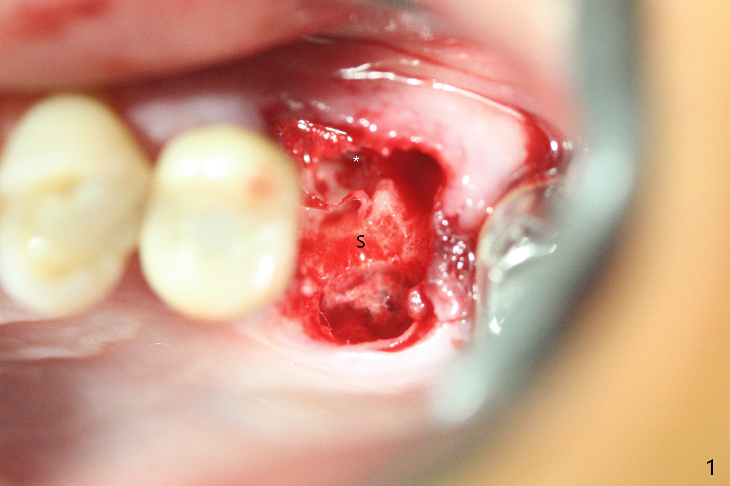 左上六拔除后,近中颊侧窝尤其大,与上颌窦相通(图一 *),而中隔比较尖,截除后还显得窄(图一,二:S),不太适合即刻种植。放置一块PRF膜于近中颊侧窝修补上颌窦,然后放置粘性骨块,好像有上颌窦提升迹象(图三:*(箭头:近中颊侧骨板缺失)),用骨粉填满其余牙槽窝(图四),覆盖另外一块PRF膜以及Cytoplast(不可吸收膜),用PTFE缝线(也不可吸收,与膜是同一个材料,非常柔软,好打结)缝合(图五)。最后使用牙周敷料。后者术后八九天脱落,病人术后十二天复诊,不可吸收膜腭侧有些外翻(图六箭头),伤口愈合尚可,没有骨粉丢失迹象,反复交代口腔卫生。再过三周撤除不可吸收膜。其实三周后膜自己脱落,病人回来撤去剩余缝线(图七),新鲜肉芽组织形成。术后5个月牙槽嵴和角化龈宽,骨高度尚可(图八),密度差些(图九,750单位),植体应该是4.5x8.5 或者 10 毫米,少量上颌窦提升。
