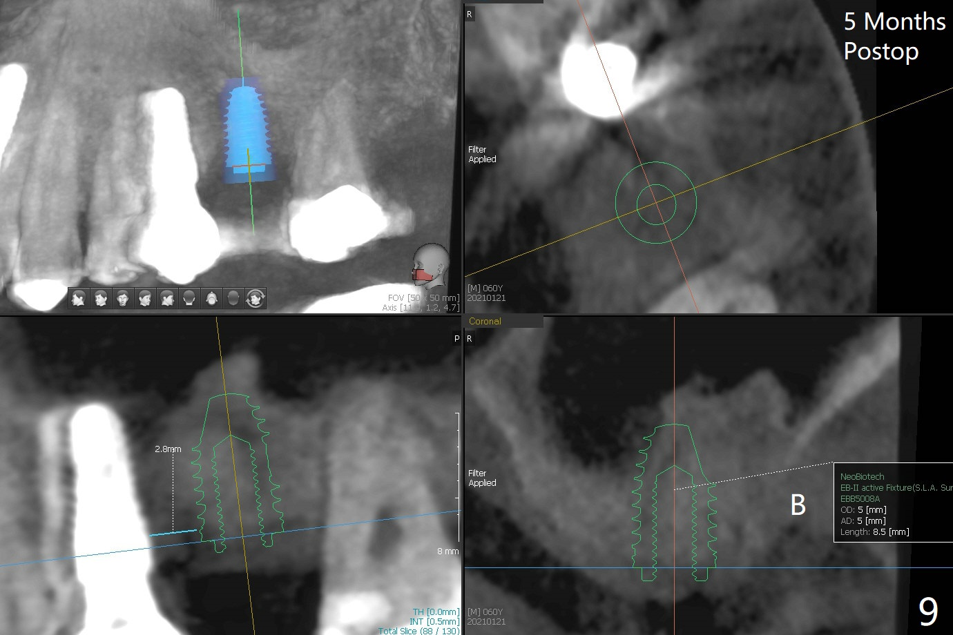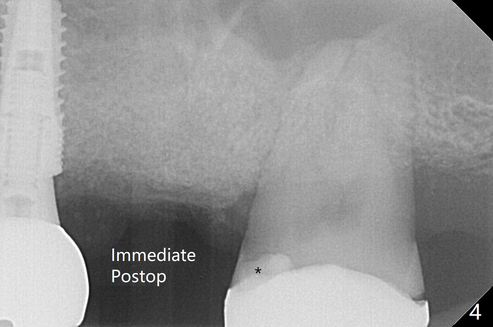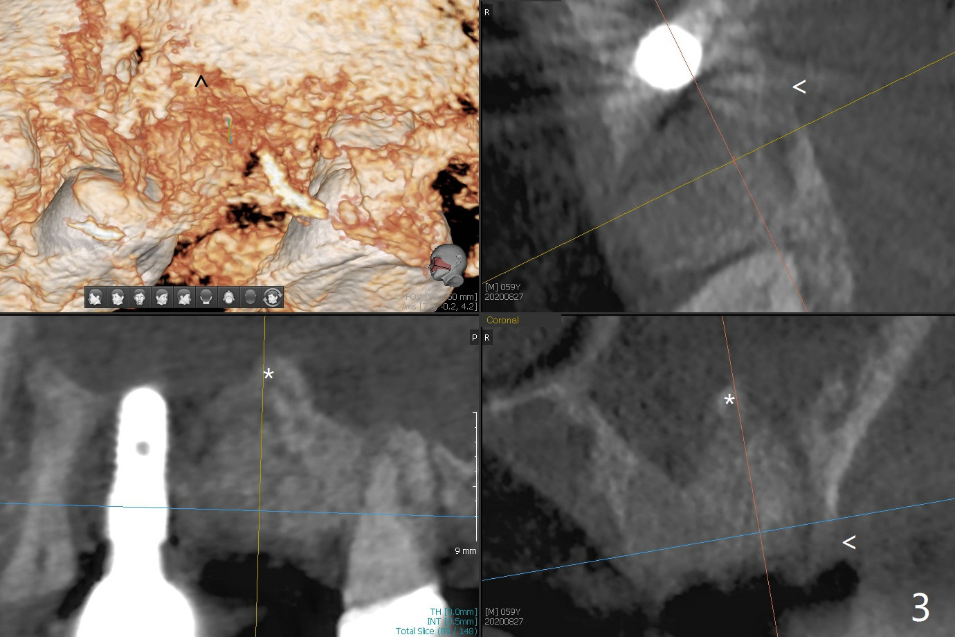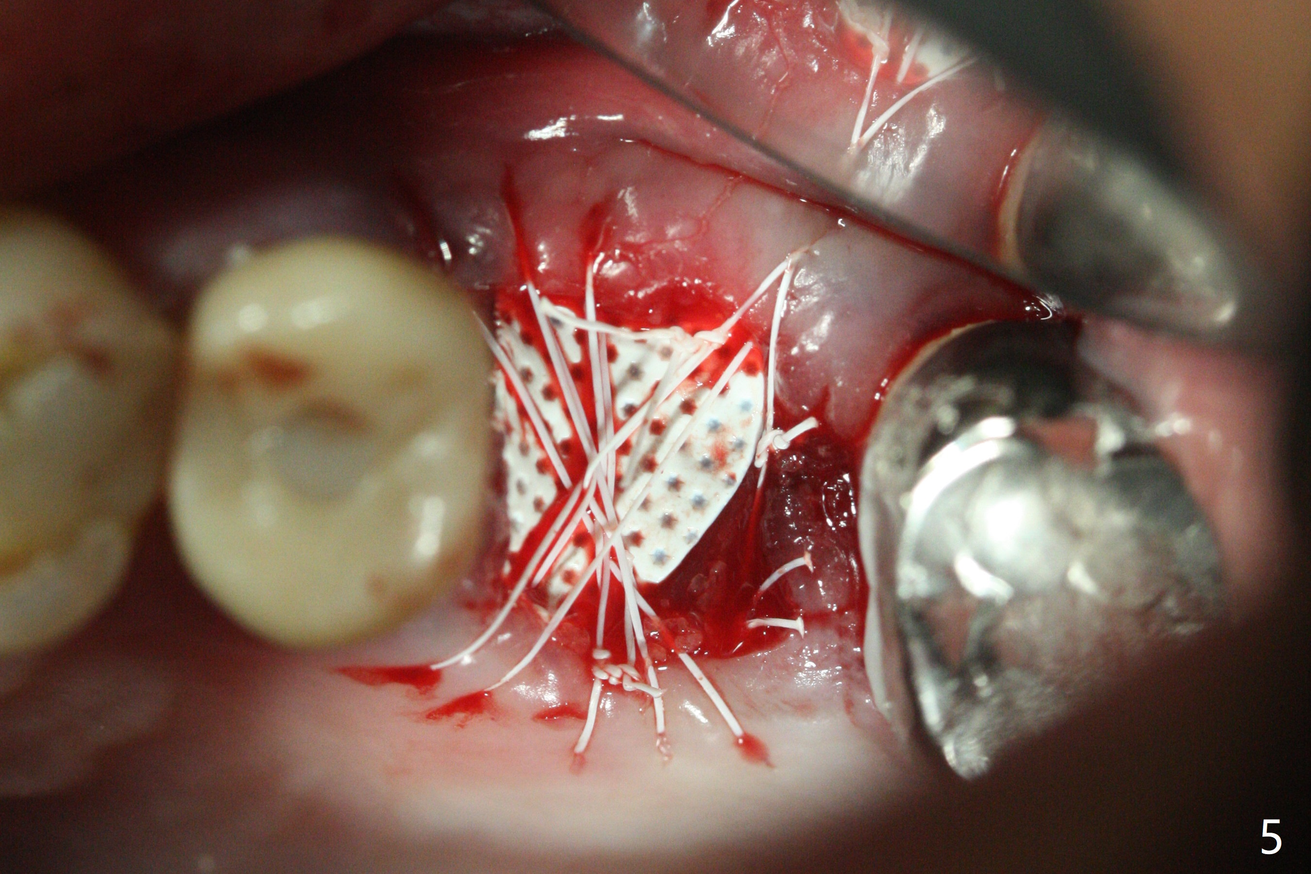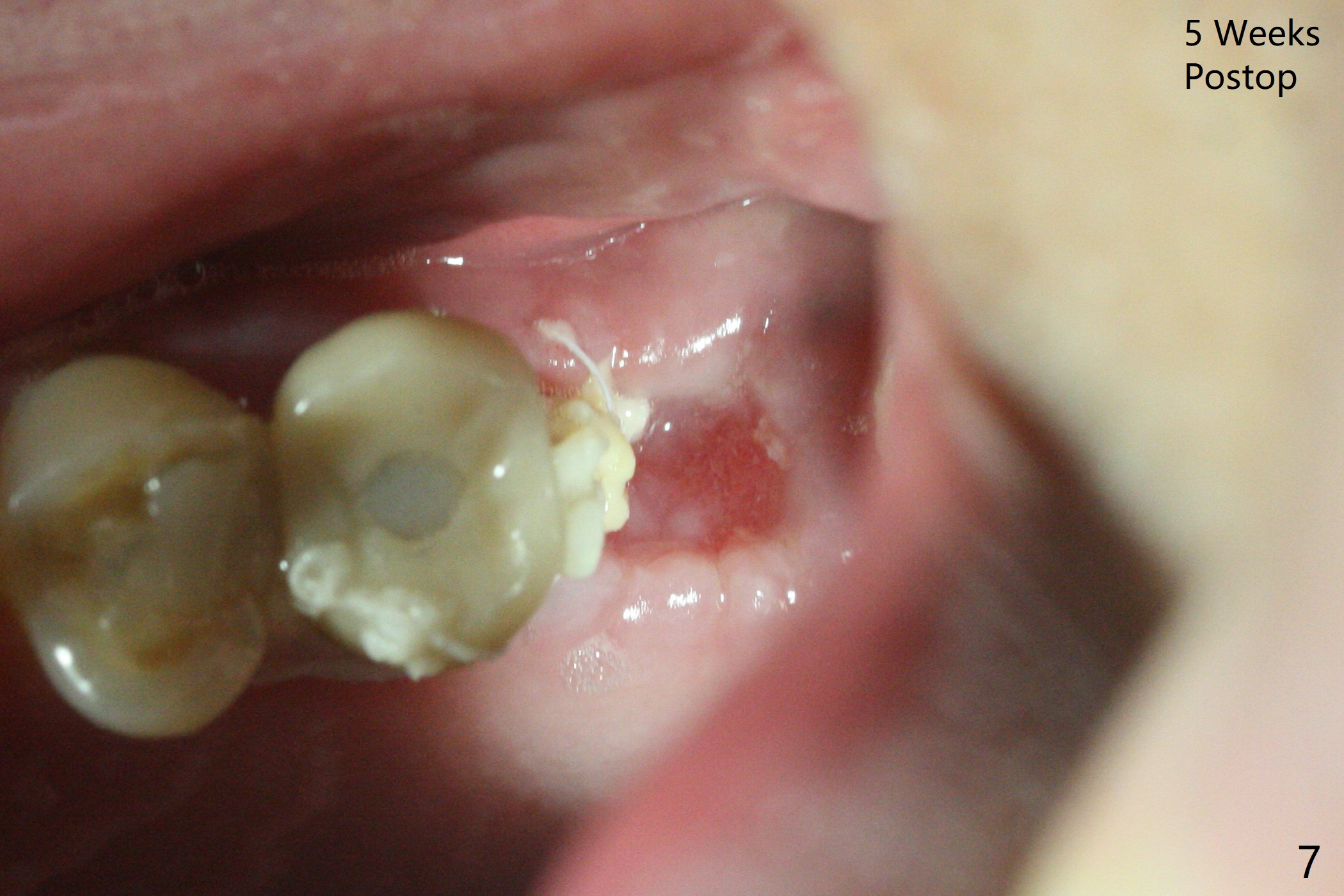 左上六拔除后,近中颊侧窝尤其大,与上颌窦相通(图一 *),而中隔比较尖,截除后还显得窄(图一,二:S),不太适合即刻种植。放置一块PRF膜于近中颊侧窝修补上颌窦,然后放置粘性骨块,好像有上颌窦提升迹象(图三:*(箭头:近中颊侧骨板缺失)),用骨粉填满其余牙槽窝(图四),覆盖另外一块PRF膜以及Cytoplast(不可吸收膜),用PTFE缝线(也不可吸收,与膜是同一个材料,非常柔软,好打结)缝合(图五)。最后使用牙周敷料。后者术后八九天脱落,病人术后十二天复诊,不可吸收膜腭侧有些外翻(图六箭头),伤口愈合尚可,没有骨粉丢失迹象,反复交代口腔卫生。再过三周撤除不可吸收膜。其实三周后膜自己脱落,病人回来撤去剩余缝线(图七),新鲜肉芽组织形成。术后5个月牙槽嵴和角化龈宽,骨高度尚可(图八),密度差些(图九,750单位),植体应该是4.5x8.5 或者 10 毫米,少量上颌窦提升。