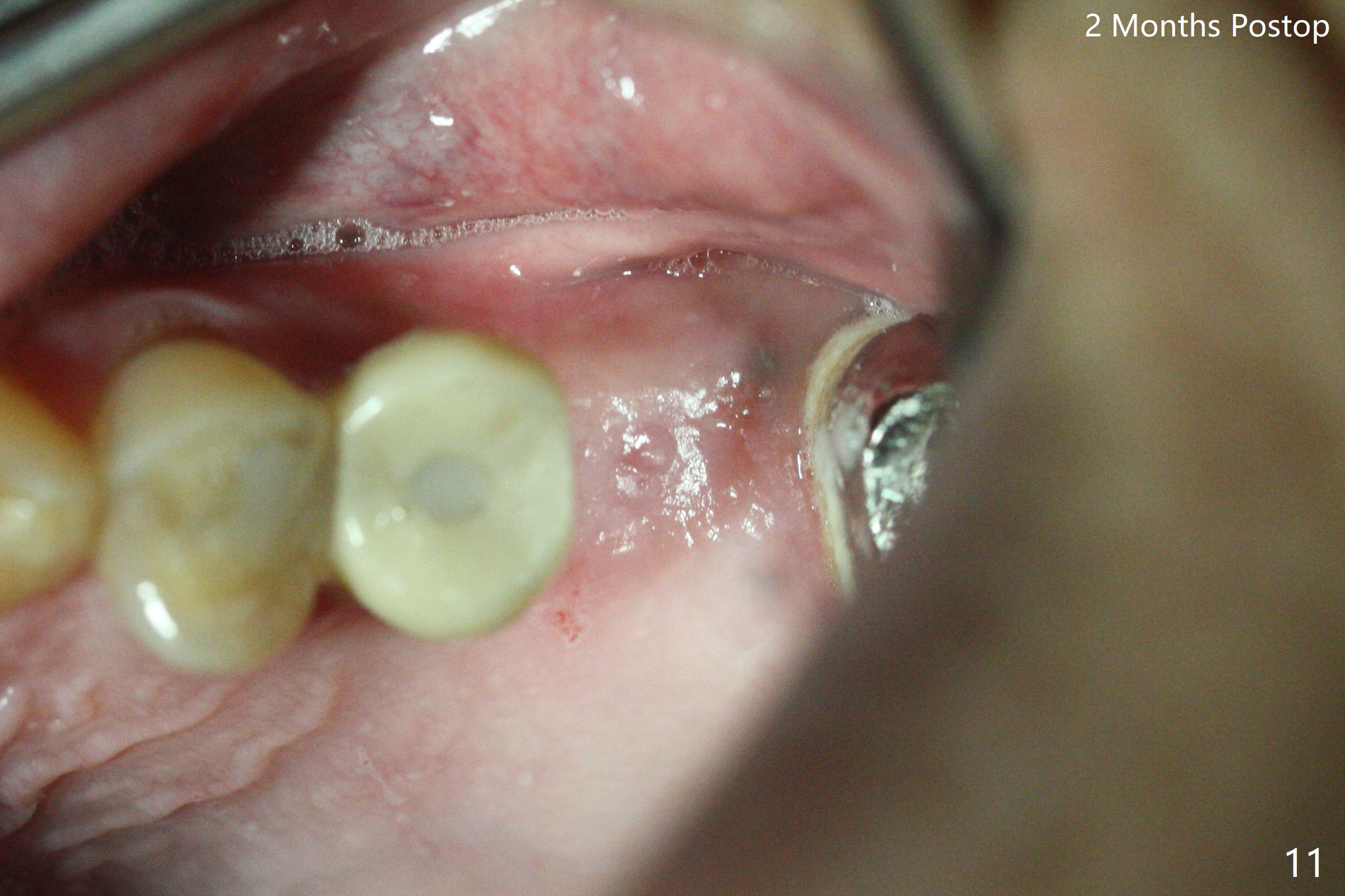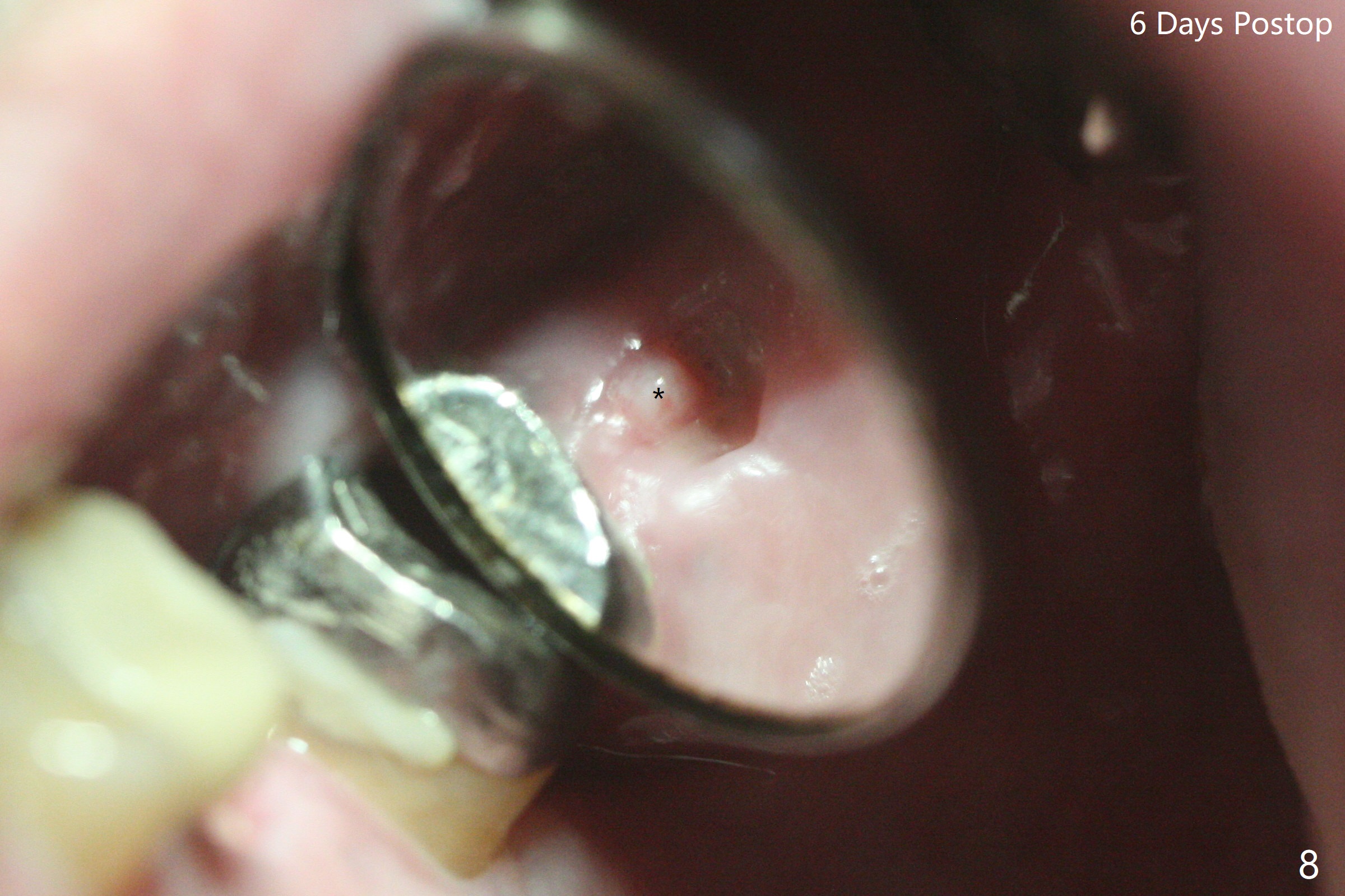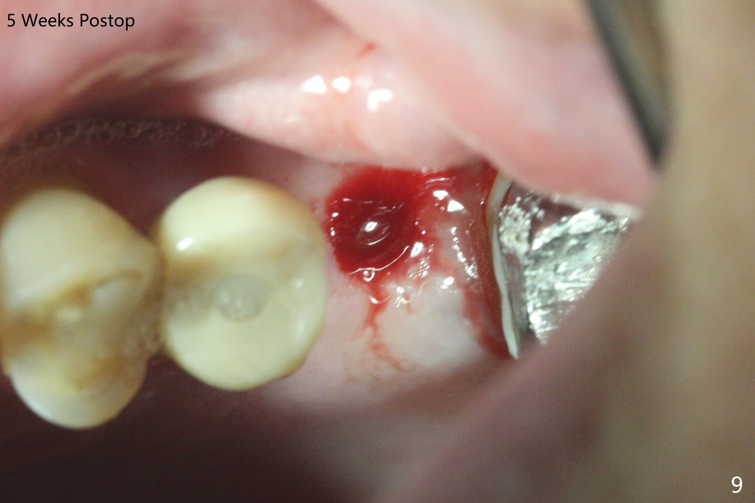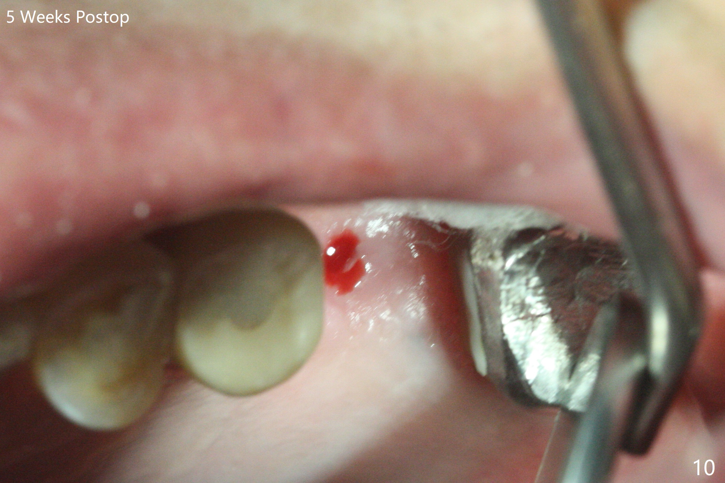 60岁男,左上6(牙根折裂严重骨质吸收)位点保存后6个月,回来植牙。术前CT显示骨质密度低,宽度足够,角化龈也宽,前后牙齿都有牙冠,制作导板麻烦,所以采纳徒手种植。使用4毫米活检打孔刀(Biopsy Punch)进入,简化手术,但是又怕开口不正,不敢用大号植体,术后CT发现钻洞偏颊侧。针对骨质密度低,使用1.2毫米钻头后(约8毫米),使用旋转式骨扩张器直至2.4/3.7毫米(图一(红虚线:原来骨质缺损)逐渐增加深度至11毫米),备洞几乎没有失去骨质,钻洞周围骨质密度谅必增高),取出最后一个扩大器后发现上颌窦底板破裂,放置粘性骨粉,使用4毫米报废植体做上颌窦提升,重复一次(图二,三),稳定性尚可。再次放置骨粉和PRF膜,使用正式植体提升(4.5x8毫米),临床上很难判断是否植体植入牙槽嵴之下(可能骨质疏松),只好拍摄CT(图四,五),好像正好牙槽嵴下,不过又植入骨粉一些(图七:*)。植体扭力~15Ncm,保险起见,放置愈合帽,表面放置少许骨粉以及打孔留下的牙龈(图六:G,之前一直泡在PRF上清液里),牙周胶水固定游离牙龈以及牙周敷料保护。术后6小时没有鼻出血。所以骨质缺损严重,植骨后,虽然缺损外形得到恢复,但是骨头质量,固定植体能力还不够。植牙时,需要适当改变手段,例如使用骨凿,提高骨质密度,而不是单纯使用钻头。术后病人恢复正常,没有疼痛,六天复诊,牙周敷料已经脱落,打孔的牙龈附着颊侧,部分骨粉暴露,但是看样子挺稳定,好像游离牙龈必须缝合。使用树脂敷料牢靠些。术后五周,伤口基本愈合,一处未愈合,与下面骨粉相通,用牙周探针稍微搅动,出血(图九)。擦干血迹,伤口还不错(图十)。术后2个月伤口好像正常愈合(图十一)。术后4.5个月根尖片显示6种植比5深,往后螺纹暴露可能性减少(图十二)。
