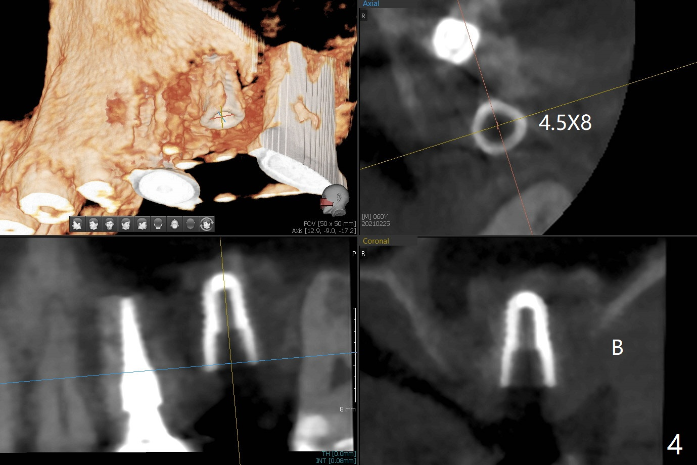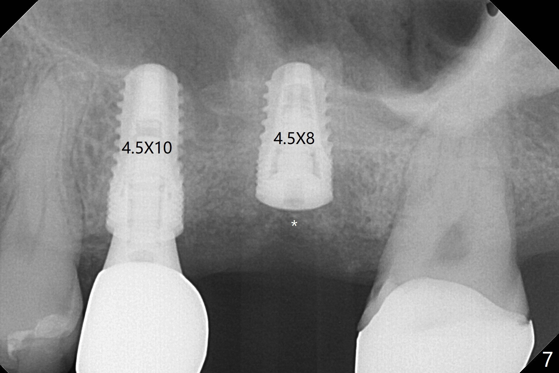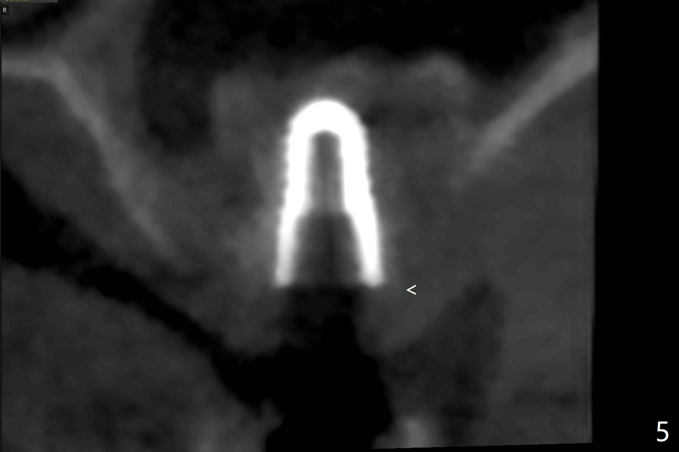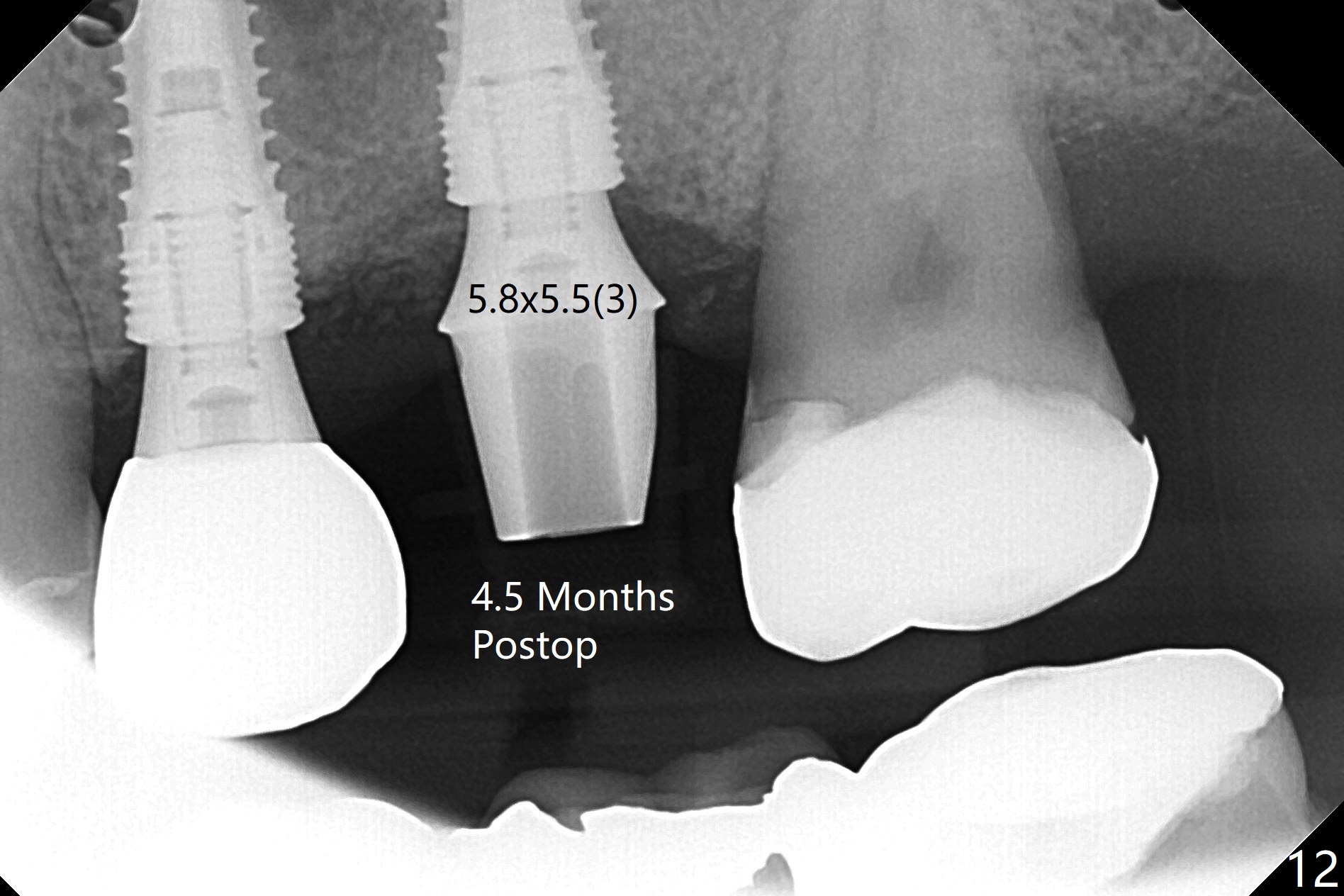 60岁男,左上6(牙根折裂严重骨质吸收)位点保存后6个月,回来植牙。术前CT显示骨质密度低,宽度足够,角化龈也宽,前后牙齿都有牙冠,制作导板麻烦,所以采纳徒手种植。使用4毫米活检打孔刀(Biopsy Punch)进入,简化手术,但是又怕开口不正,不敢用大号植体,术后CT发现钻洞偏颊侧。针对骨质密度低,使用1.2毫米钻头后(约8毫米),使用旋转式骨扩张器直至2.4/3.7毫米(图一(红虚线:原来骨质缺损)逐渐增加深度至11毫米),备洞几乎没有失去骨质,钻洞周围骨质密度谅必增高),取出最后一个扩大器后发现上颌窦底板破裂,放置粘性骨粉,使用4毫米报废植体做上颌窦提升,重复一次(图二,三),稳定性尚可。再次放置骨粉和PRF膜,使用正式植体提升(4.5x8毫米),临床上很难判断是否植体植入牙槽嵴之下(可能骨质疏松),只好拍摄CT(图四,五),好像正好牙槽嵴下,不过又植入骨粉一些(图七:*)。植体扭力~15Ncm,保险起见,放置愈合帽,表面放置少许骨粉以及打孔留下的牙龈(图六:G,之前一直泡在PRF上清液里),牙周胶水固定游离牙龈以及牙周敷料保护。术后6小时没有鼻出血。所以骨质缺损严重,植骨后,虽然缺损外形得到恢复,但是骨头质量,固定植体能力还不够。植牙时,需要适当改变手段,例如使用骨凿,提高骨质密度,而不是单纯使用钻头。术后病人恢复正常,没有疼痛,六天复诊,牙周敷料已经脱落,打孔的牙龈附着颊侧,部分骨粉暴露,但是看样子挺稳定,好像游离牙龈必须缝合。使用树脂敷料牢靠些。术后五周,伤口基本愈合,一处未愈合,与下面骨粉相通,用牙周探针稍微搅动,出血(图九)。擦干血迹,伤口还不错(图十)。术后2个月伤口好像正常愈合(图十一)。术后4.5个月根尖片显示6种植比5深,往后螺纹暴露可能性减少(图十二)。