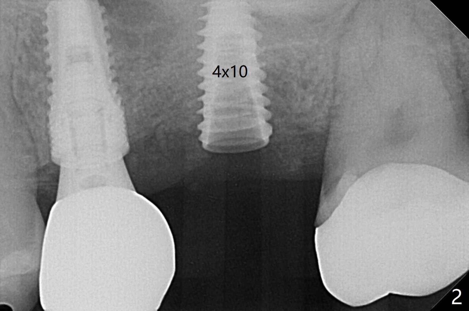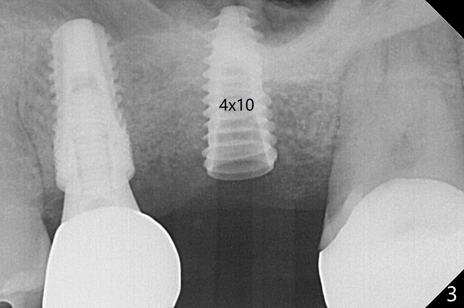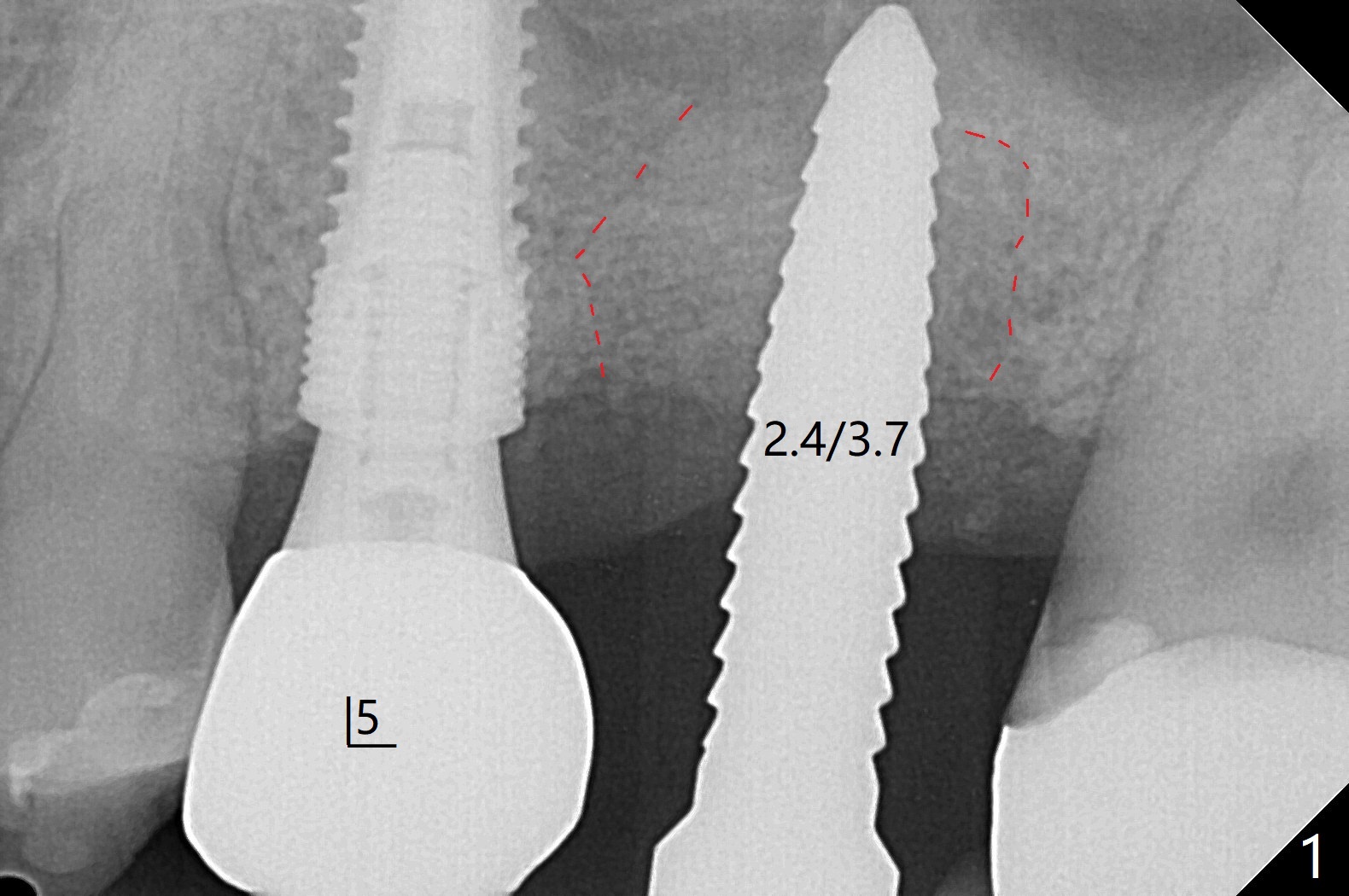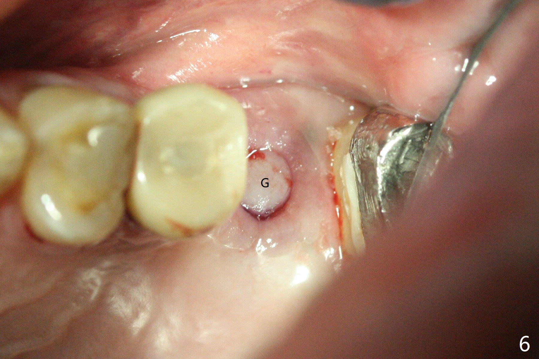60岁男,左上6(牙根折裂严重骨质吸收)位点保存后6个月,回来植牙。术前CT显示骨质密度低,宽度足够,角化龈也宽,前后牙齿都有牙冠,制作导板麻烦,所以采纳徒手种植。使用4毫米活检打孔刀(Biopsy Punch)进入,简化手术,但是又怕开口不正,不敢用大号植体,术后CT发现钻洞偏颊侧。针对骨质密度低,使用1.2毫米钻头后(约8毫米),使用旋转式骨扩张器直至2.4/3.7毫米(图一(红虚线:原来骨质缺损)逐渐增加深度至11毫米),备洞几乎没有失去骨质,钻洞周围骨质密度谅必增高),取出最后一个扩大器后发现上颌窦底板破裂,放置粘性骨粉,使用4毫米报废植体做上颌窦提升,重复一次(图二,三),稳定性尚可。再次放置骨粉和PRF膜,使用正式植体提升(4.5x8毫米),临床上很难判断是否植体植入牙槽嵴之下(可能骨质疏松),只好拍摄CT(图四,五),好像正好牙槽嵴下,不过又植入骨粉一些(图七:*)。植体扭力~15Ncm,保险起见,放置愈合帽,表面放置少许骨粉以及打孔留下的牙龈(图六:G,之前一直泡在PRF上清液里),牙周胶水固定游离牙龈以及牙周敷料保护。术后6小时没有鼻出血。所以骨质缺损严重,植骨后,虽然缺损外形得到恢复,但是骨头质量,固定植体能力还不够。植牙时,需要适当改变手段,例如使用骨凿,提高骨质密度,而不是单纯使用钻头。术后病人恢复正常,没有疼痛,六天复诊,牙周敷料已经脱落,打孔的牙龈附着颊侧,部分骨粉暴露,但是看样子挺稳定,好像游离牙龈必须缝合。使用树脂敷料牢靠些。术后五周,伤口基本愈合,一处未愈合,与下面骨粉相通,用牙周探针稍微搅动,出血(图九)。擦干血迹,伤口还不错(图十)。术后2个月伤口好像正常愈合(图十一)。术后4.5个月根尖片显示6种植比5深,往后螺纹暴露可能性减少(图十二)。
