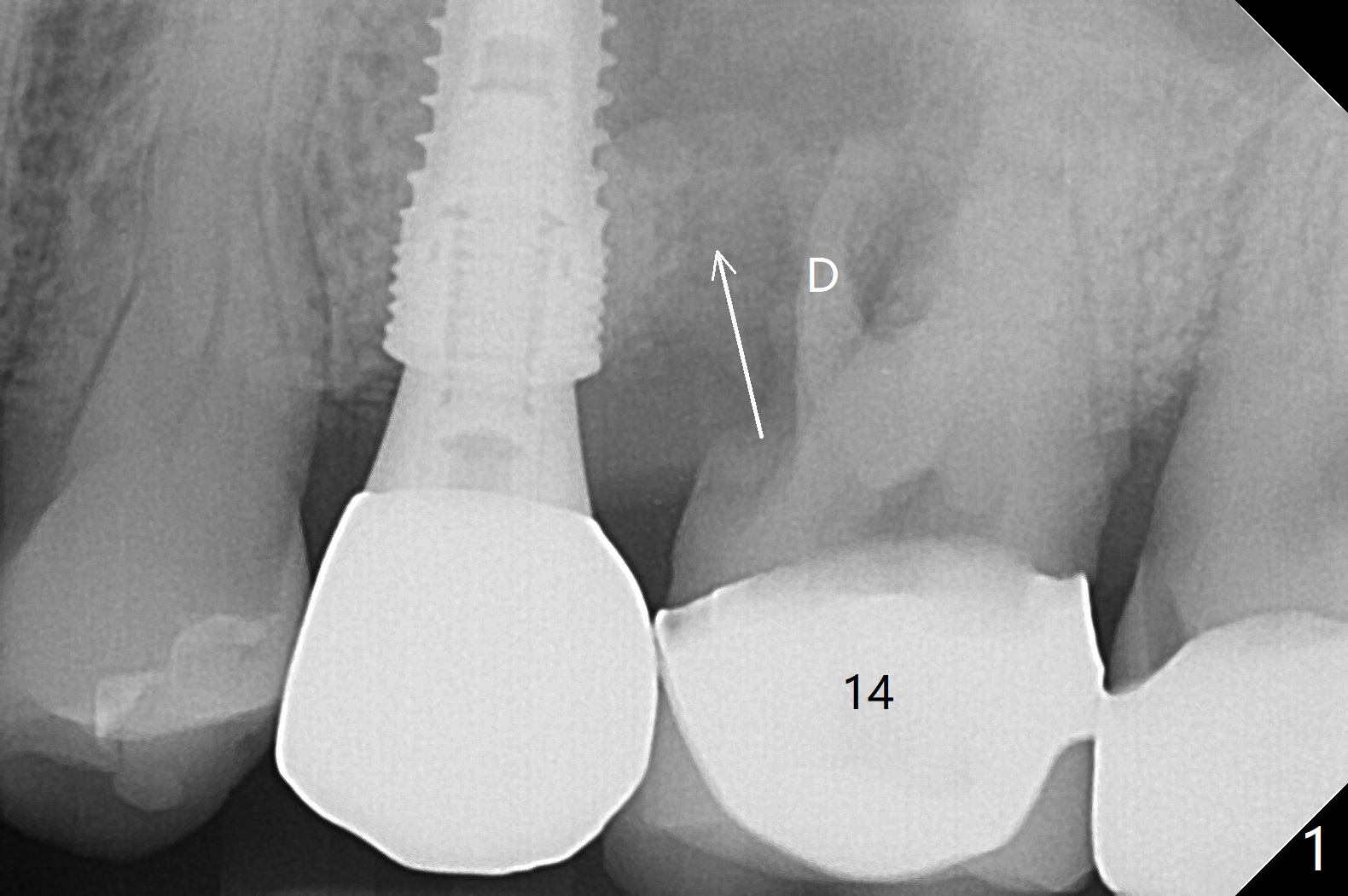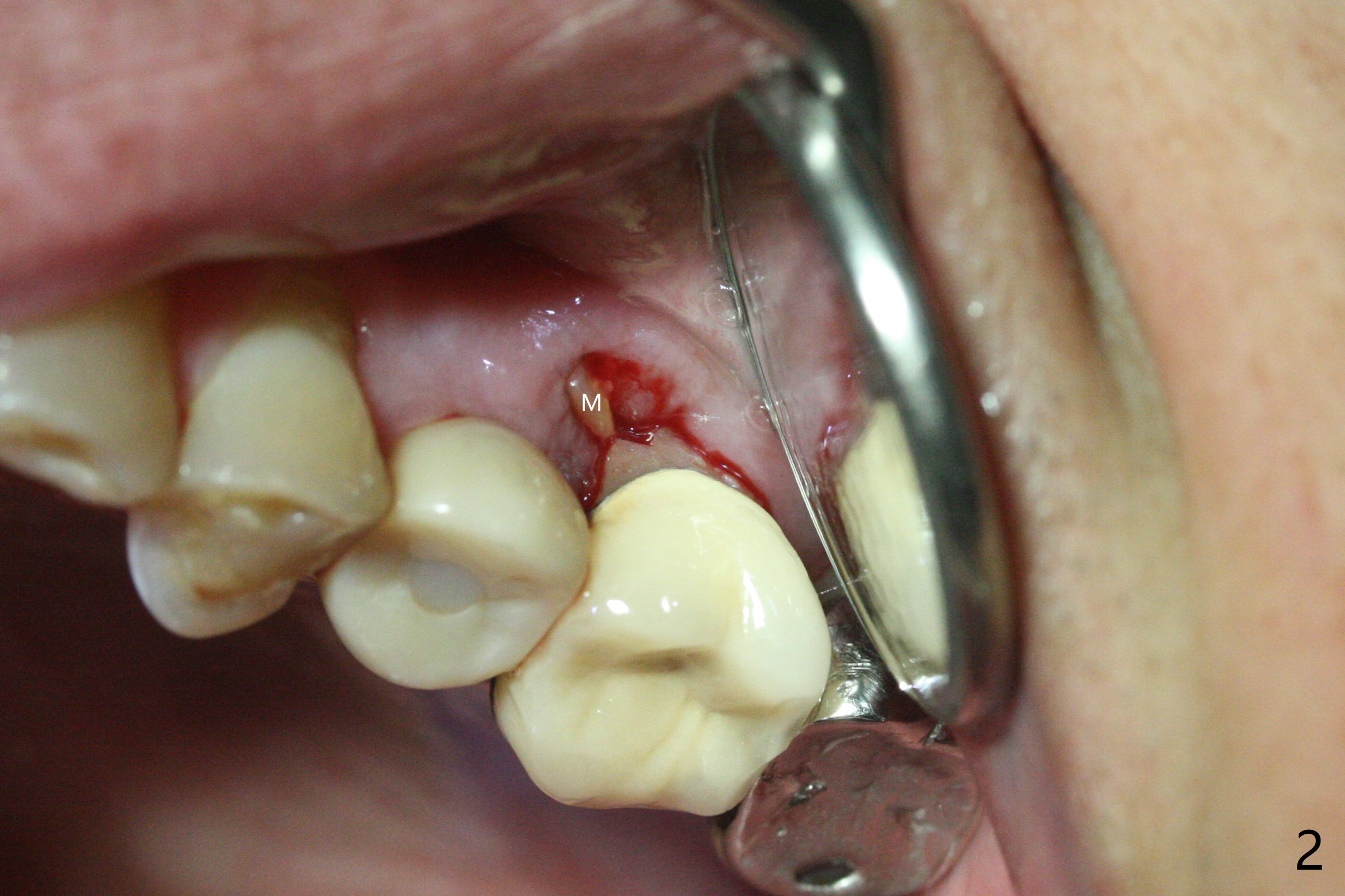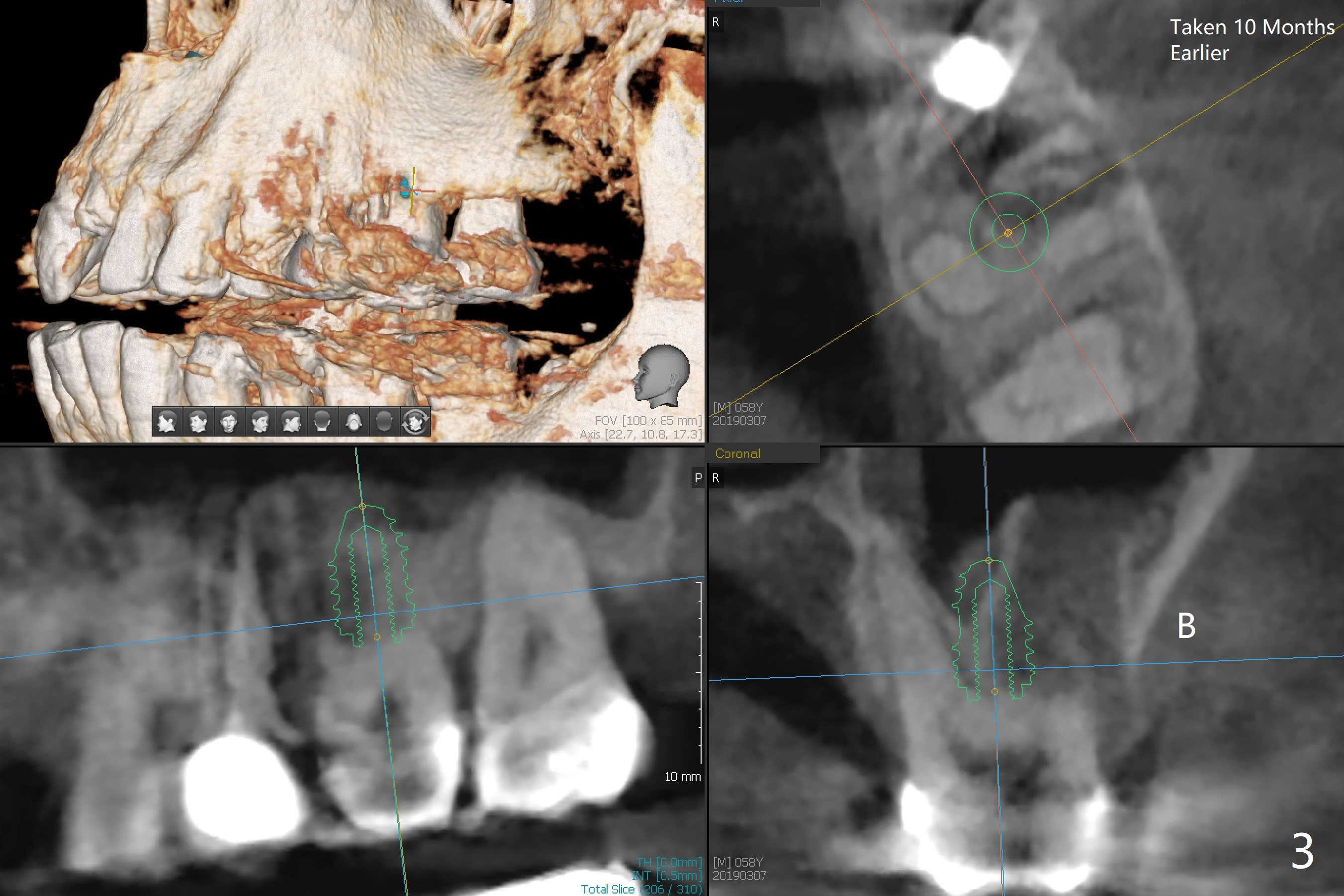 The vertical mesiobuccal root fracture of #14 of a 59-year-old man has become worse in the last 10 months. The mesial portion appears to be separate and have migrated mesiobuccal from its original place (Fig.1,2). CT taken 10 months earlier shows that the septal bone seems to be thin (Fig.3). Use IS drills (pointed to 3 mm in diameter) with 2 or 3 mm stoppers to start osteotomy and Magic Sinus Lifter. Place a 4.5x9 mm FC. If the latter fails, use sticky bone for sinus lift and socket preservation, followed PRF membranes (3-4), Cytoplast (small piece, smaller than the wound) and setting acrylic to close the sockets, including buccal defect. Take new CT (5x5) for update.