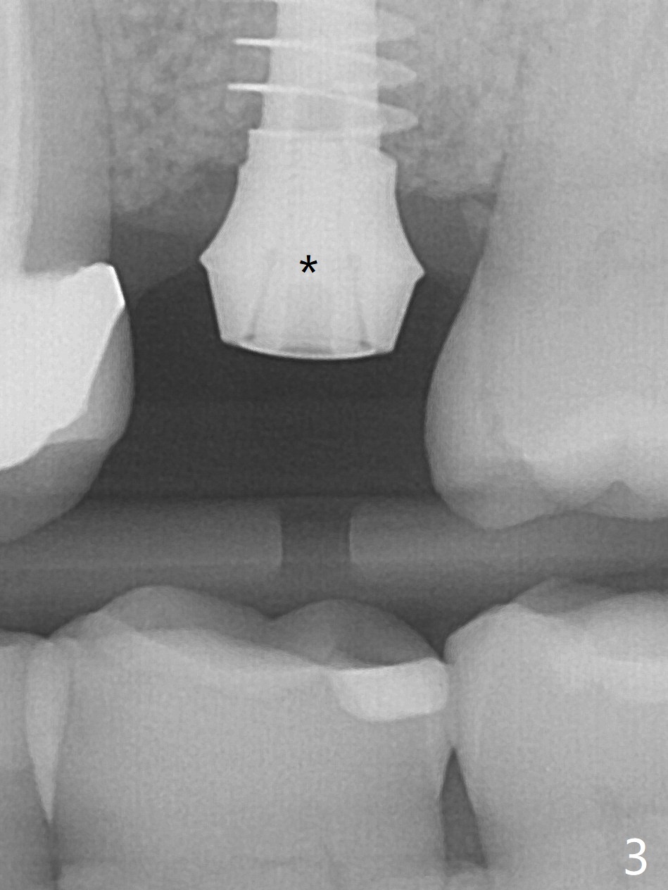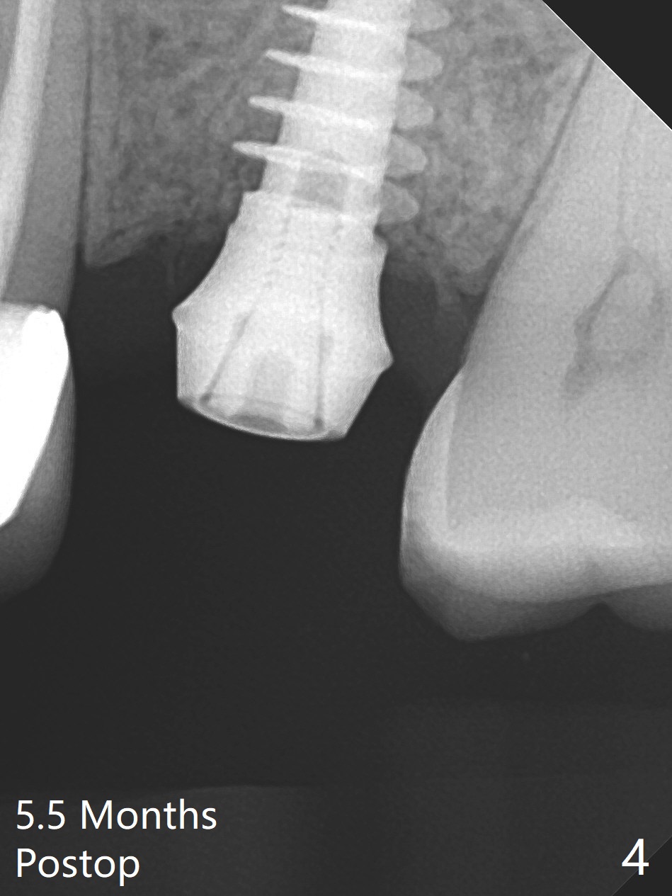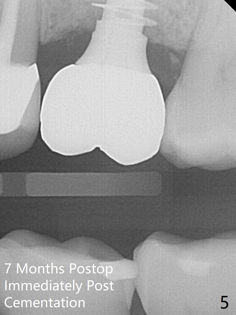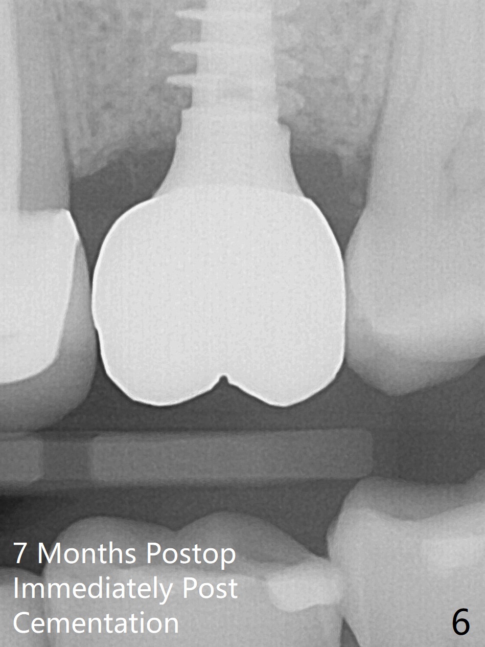 The ridge is wide at #14 11 months post socket preservation. Access and bone expansion (BEB) starts with Magic Split, followed by Magic Expanders 3.0, 3.8 and 4.3 mm from 8 to 9 mm for sinus lift. No bone is removed for osteotomy. Instead bone condensation occurs. After placement of a 4.5x11 mm dummy FC implant (Fig.1 with sinus lift (without bone graft)), a 5x9(2) mm Magicore (2 mm cuff) is placed with >55 Ncm with cuff margin at the gingival margin (Fig.2); a 5.5x3 mm solid abutment tries in. There is no occlusal clearance; trimming of the solid abutment will be needed. Later a healing screw is placed (Fig.3 *). There is no bone loss 5.5 months postop (Fig.4). A healing cap is placed without much tissue blanching. Instead a 5.5x3 mm solid abutment is placed; after height adjustment, impression is taken. A permanent crown is temporarily cemented 6 months postop (to rule out food impaction) and permanently re-cemented 7 months postop (Fig.5,6). CBCT taken 3-4 months post cementation shows that the implant threads are within the bone (Fig.7) and that the implant barely enters the sinus (Fig.8 *). That is significant since the patient has chronic sinusitis with thickened sinus membrane (Fig.9 *). The tooth #18 seems to have crazing line 10 months post cementation of the crown at #14 (overloading, Fig.10).