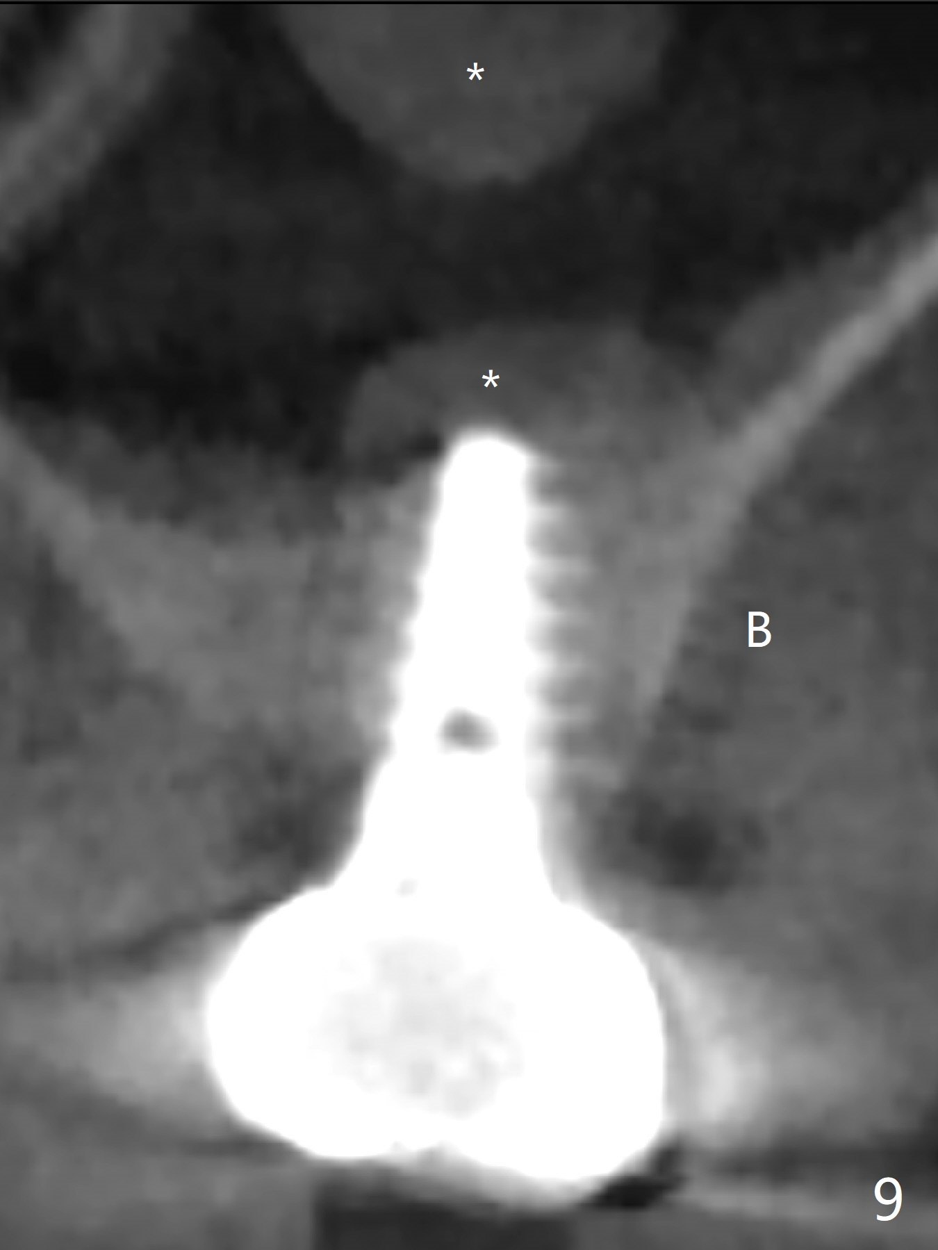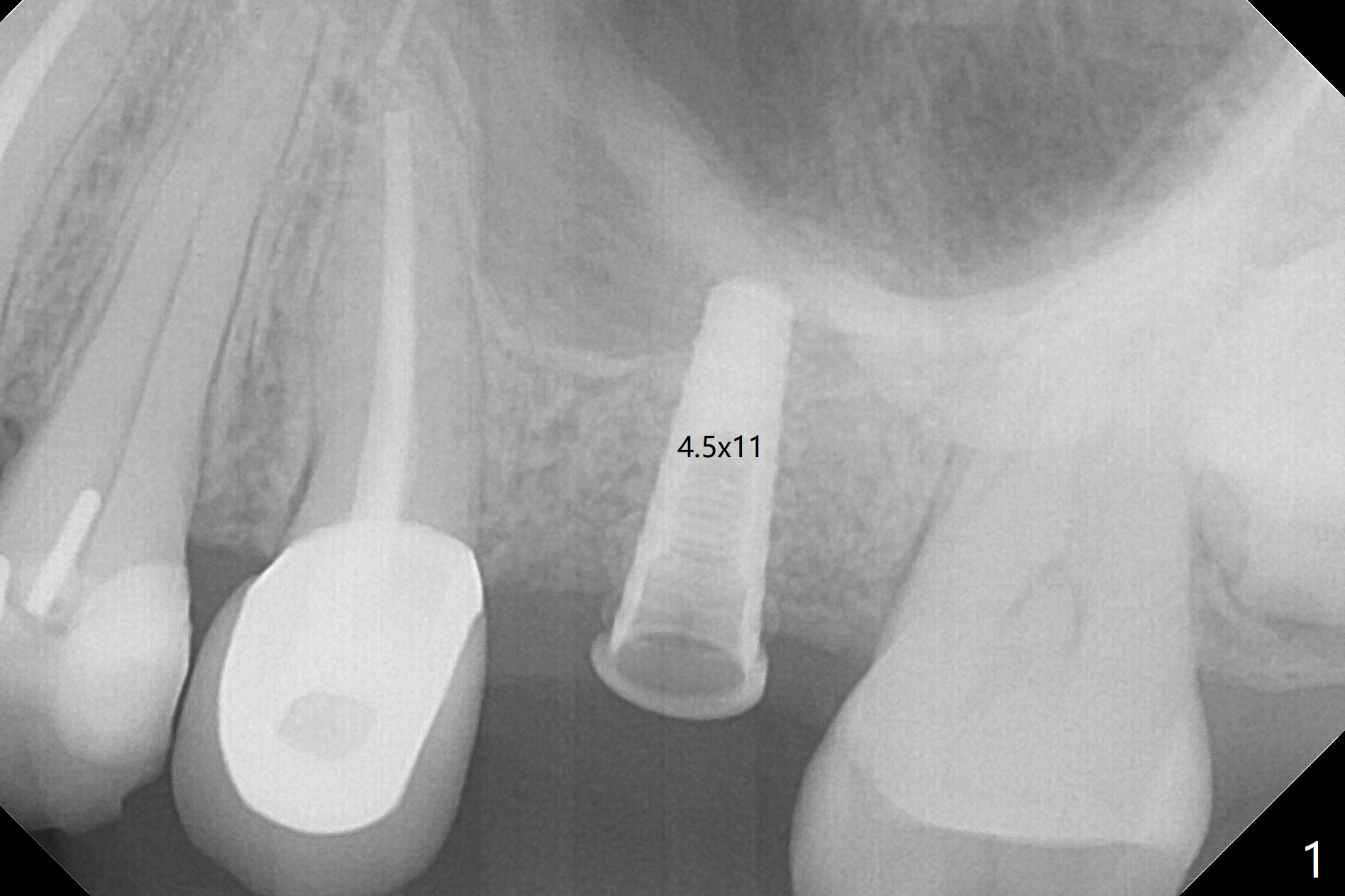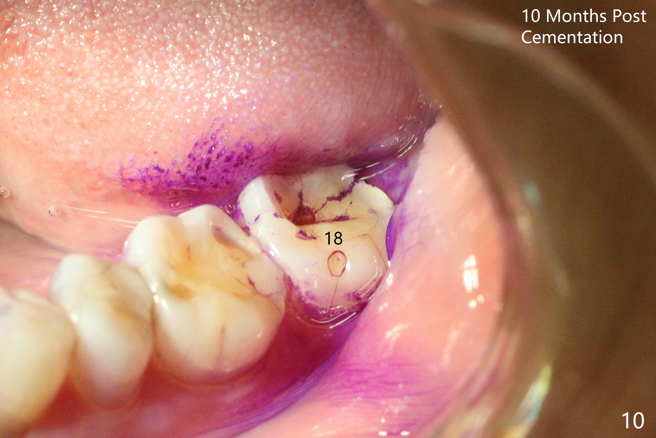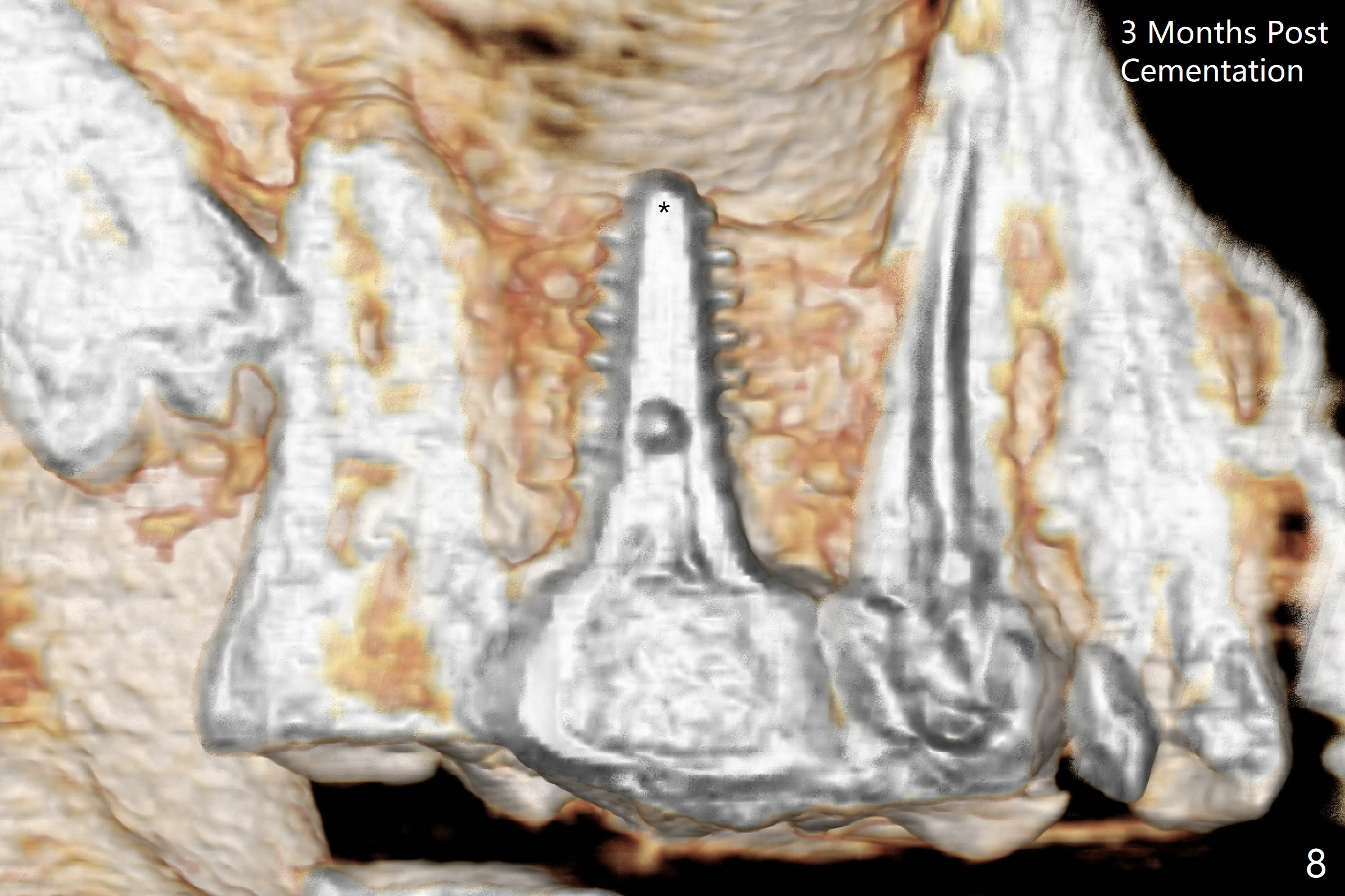 The ridge is wide at #14 11 months post socket preservation. Access and bone expansion (BEB) starts with Magic Split, followed by Magic Expanders 3.0, 3.8 and 4.3 mm from 8 to 9 mm for sinus lift. No bone is removed for osteotomy. Instead bone condensation occurs. After placement of a 4.5x11 mm dummy FC implant (Fig.1 with sinus lift (without bone graft)), a 5x9(2) mm Magicore (2 mm cuff) is placed with >55 Ncm with cuff margin at the gingival margin (Fig.2); a 5.5x3 mm solid abutment tries in. There is no occlusal clearance; trimming of the solid abutment will be needed. Later a healing screw is placed (Fig.3 *). There is no bone loss 5.5 months postop (Fig.4). A healing cap is placed without much tissue blanching. Instead a 5.5x3 mm solid abutment is placed; after height adjustment, impression is taken. A permanent crown is temporarily cemented 6 months postop (to rule out food impaction) and permanently re-cemented 7 months postop (Fig.5,6). CBCT taken 3-4 months post cementation shows that the implant threads are within the bone (Fig.7) and that the implant barely enters the sinus (Fig.8 *). That is significant since the patient has chronic sinusitis with thickened sinus membrane (Fig.9 *). The tooth #18 seems to have crazing line 10 months post cementation of the crown at #14 (overloading, Fig.10).