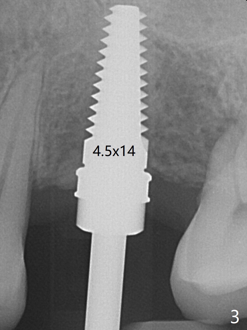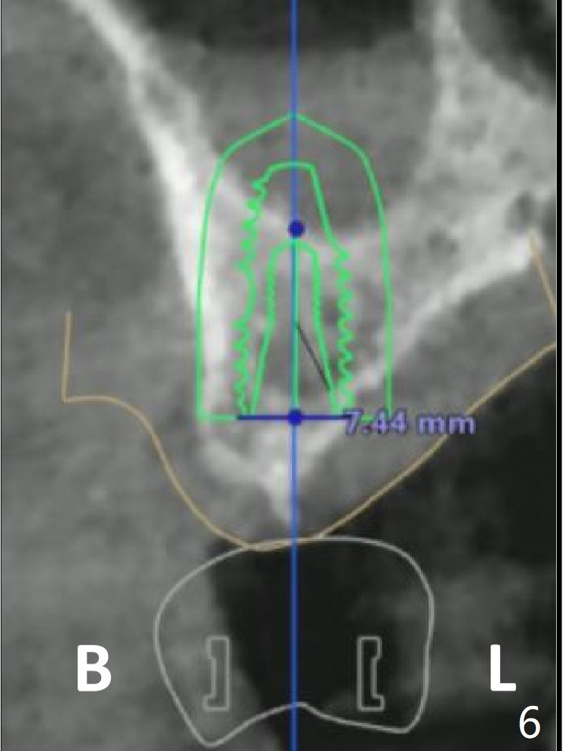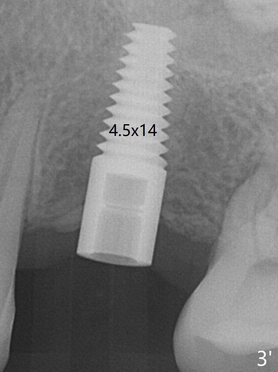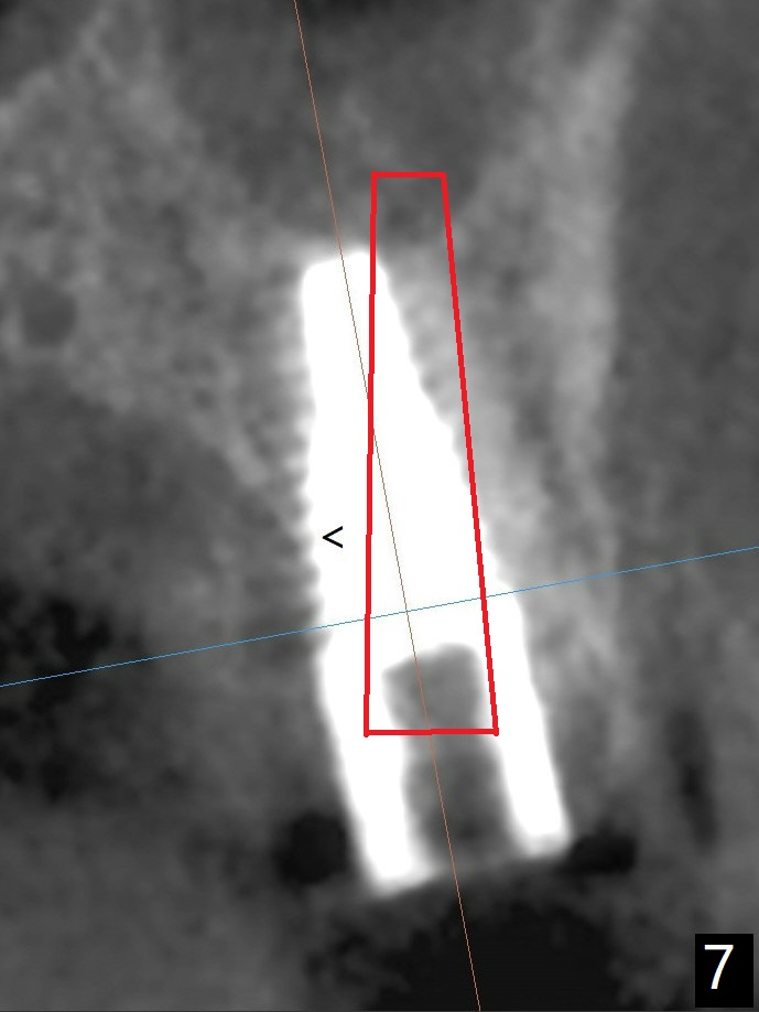 Immediately preop reanalysis of CT shows that there may be palatal thread exposure at #14 when a 4.5x14 mm tissue-level implant is placed equigingival (Fig.1,2). After sinus lift with IS 4x10 mm dummy implant with guide, the tissue-level tap and implant placed free hand look deep (Fig.3,3'). CT reveals possible 3 palatal threads exposed (Fig.4,5 arrowheads), which is associated with change in trajectory due to the palatal shift of the apex of the implant (arrow), as compared to the design of the bone-level implant (Fig.6). When there is a slope in the ridge and/or sinus floor, do not shift implants and use the guide for implant placement. If switching is necessary, use a final drill without underprep (Fig.7 red) through the sinus floor after sinus lift to avoid apical implant deviation. To fix the palatal thread exposure, palatal flap is raised. In fact the implant has to be removed for the incision. When the implant is re-placed deeper by ~ 1mm, there is a thread exposed. Bone graft is placed with collagen membrane. As a 4.5x3 mm abutment is placed, the implant is found to be unstable. Periodontal dressing is applied. In fact the implant exfoliates with the abutment 4.5 months postop (Fig.8). Bone graft seems to be necessary (sticky bone). Tissue level implant should be avoided for patient with poor oral hygiene. Return to Upper Molar Immediate Implant, Trajectory II 3 Xin Wei, DDS, PhD, MS 1st edition 08/30/2019, last revision 05/18/2020