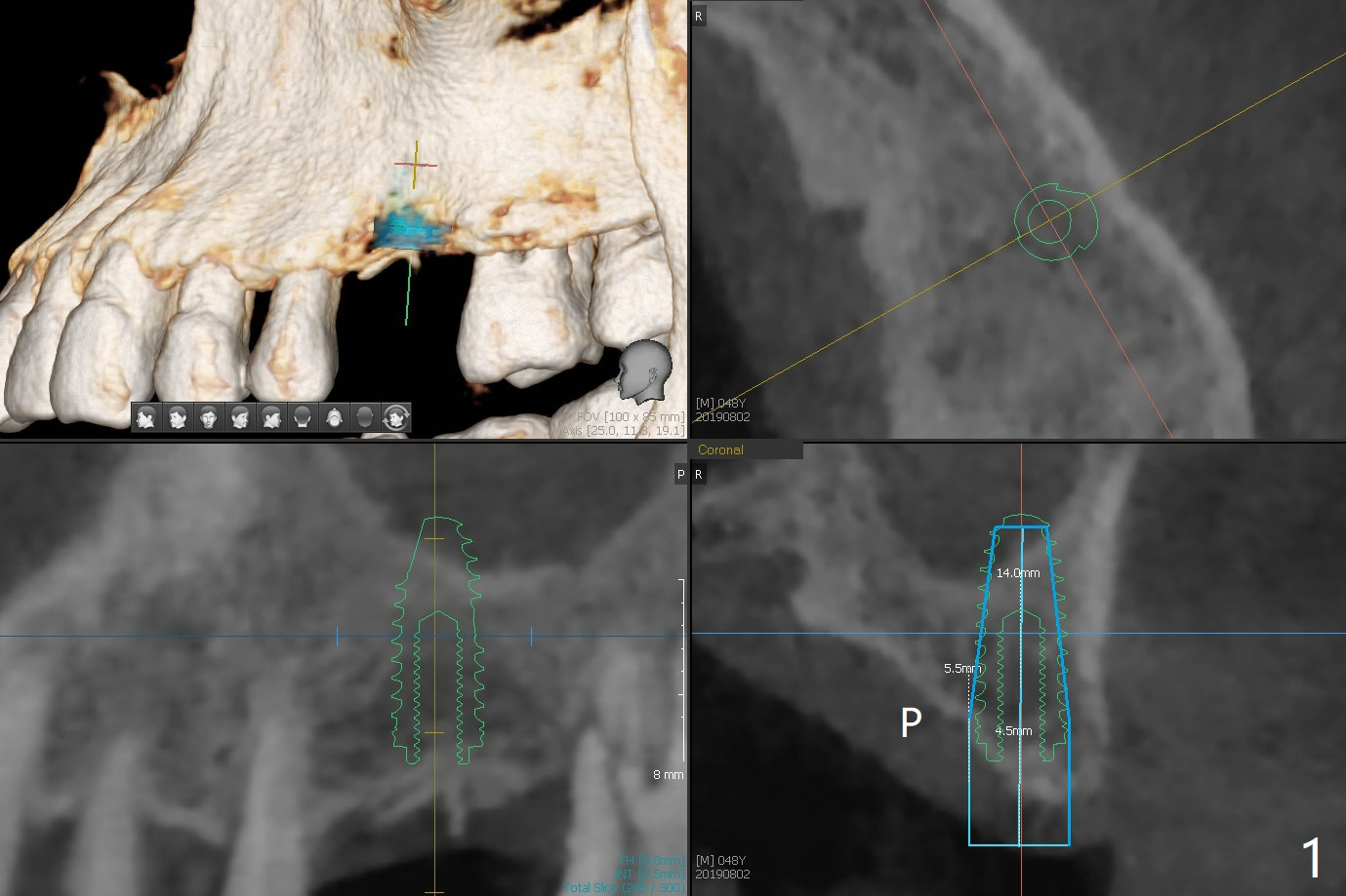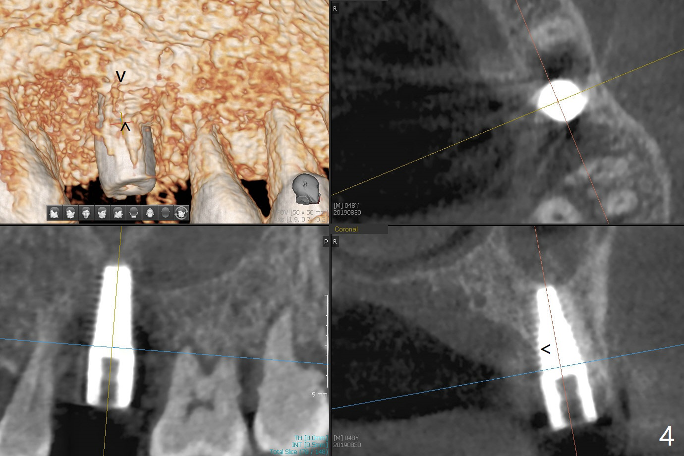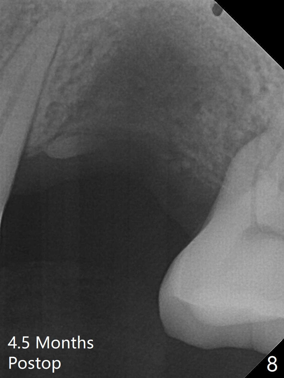 Immediately preop reanalysis of CT shows that there may be palatal thread exposure at #14 when a 4.5x14 mm tissue-level implant is placed equigingival (Fig.1,2). After sinus lift with IS 4x10 mm dummy implant with guide, the tissue-level tap and implant placed free hand look deep (Fig.3,3'). CT reveals possible 3 palatal threads exposed (Fig.4,5 arrowheads), which is associated with change in trajectory due to the palatal shift of the apex of the implant (arrow), as compared to the design of the bone-level implant (Fig.6). When there is a slope in the ridge and/or sinus floor, do not shift implants and use the guide for implant placement. If switching is necessary, use a final drill without underprep (Fig.7 red) through the sinus floor after sinus lift to avoid apical implant deviation. To fix the palatal thread exposure, palatal flap is raised. In fact the implant has to be removed for the incision. When the implant is re-placed deeper by ~ 1mm, there is a thread exposed. Bone graft is placed with collagen membrane. As a 4.5x3 mm abutment is placed, the implant is found to be unstable. Periodontal dressing is applied. In fact the implant exfoliates with the abutment 4.5 months postop (Fig.8). Bone graft seems to be necessary (sticky bone). Tissue level implant should be avoided for patient with poor oral hygiene. Return to Upper Molar Immediate Implant, Trajectory II 3 Xin Wei, DDS, PhD, MS 1st edition 08/30/2019, last revision 05/18/2020