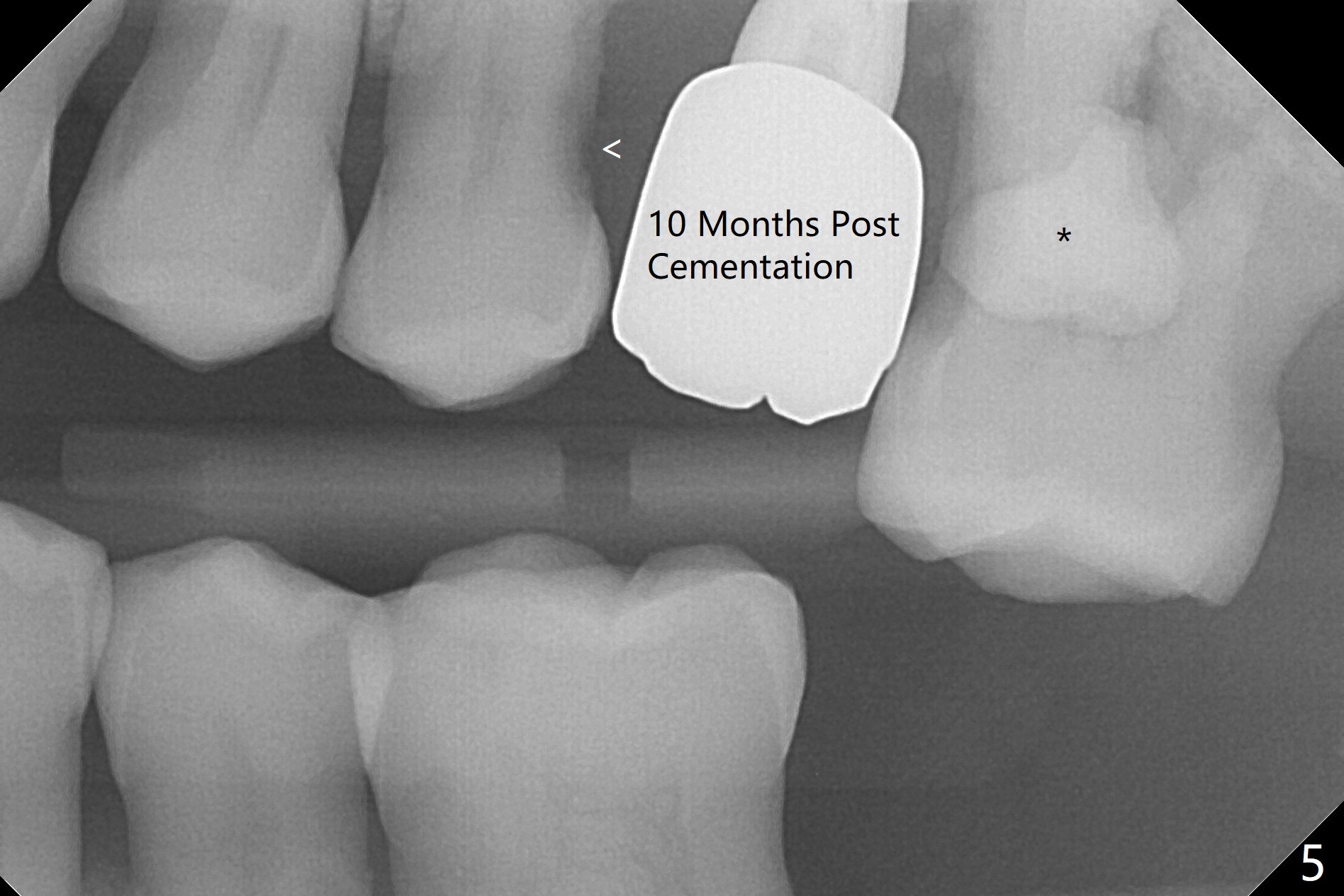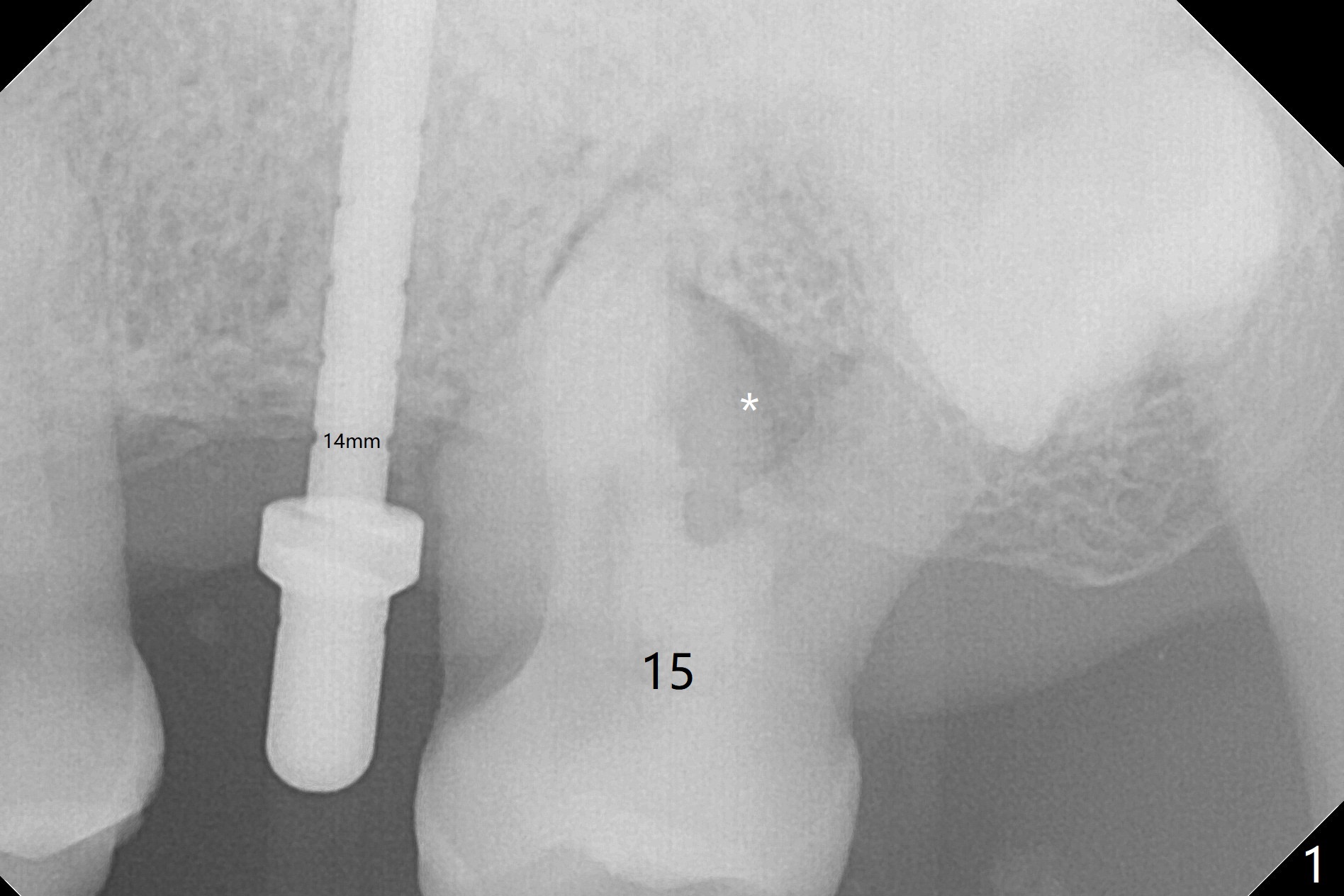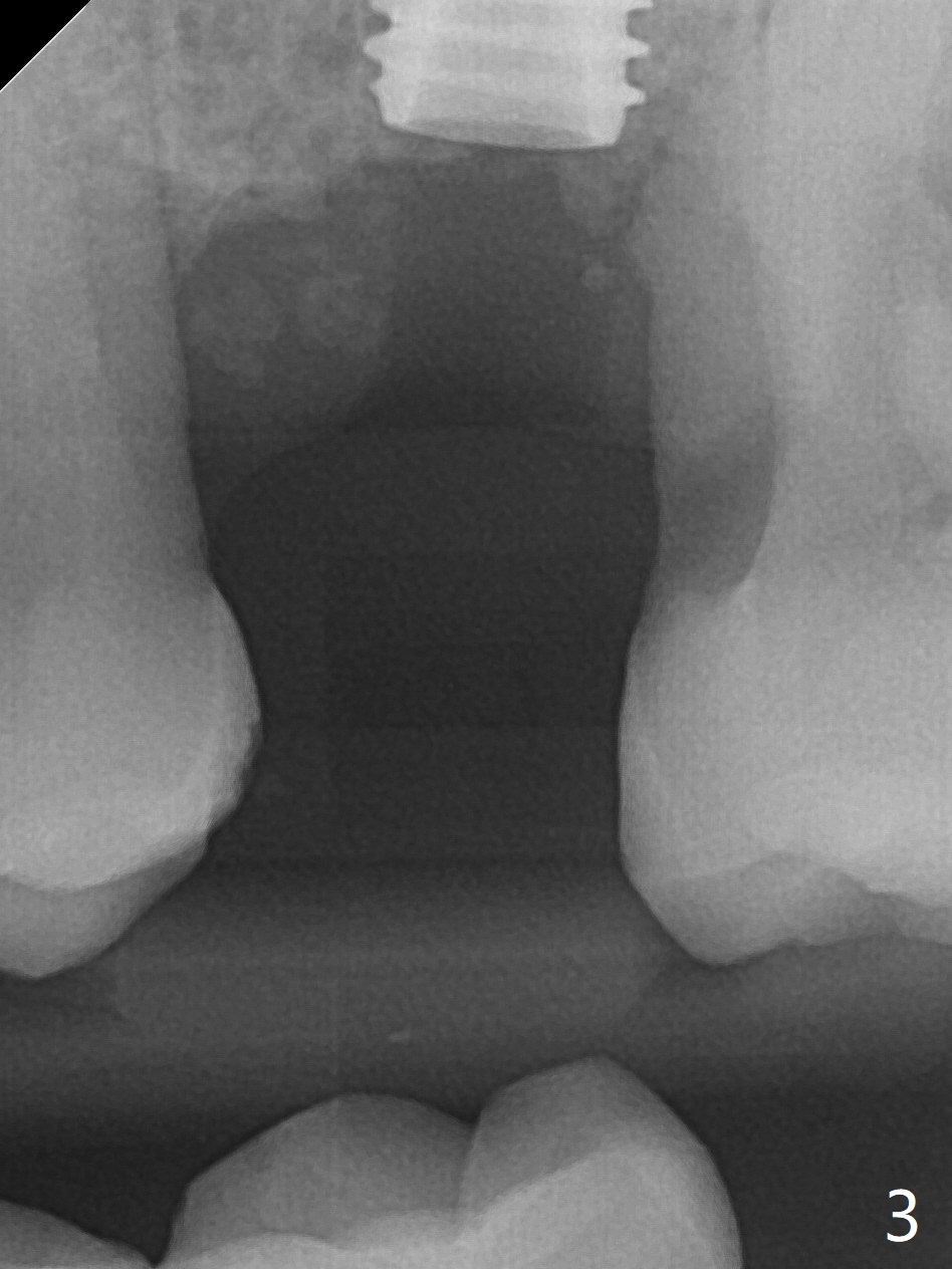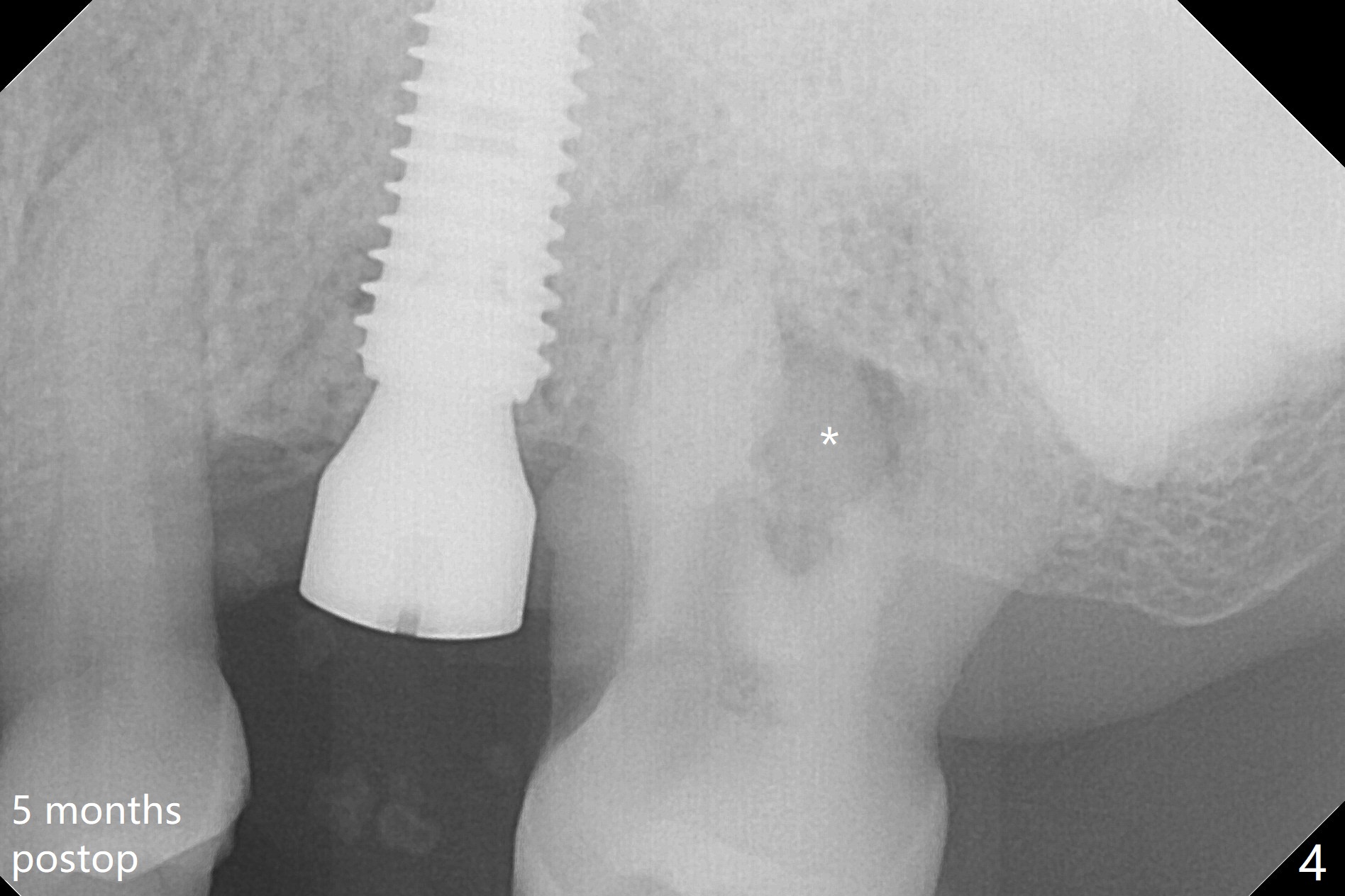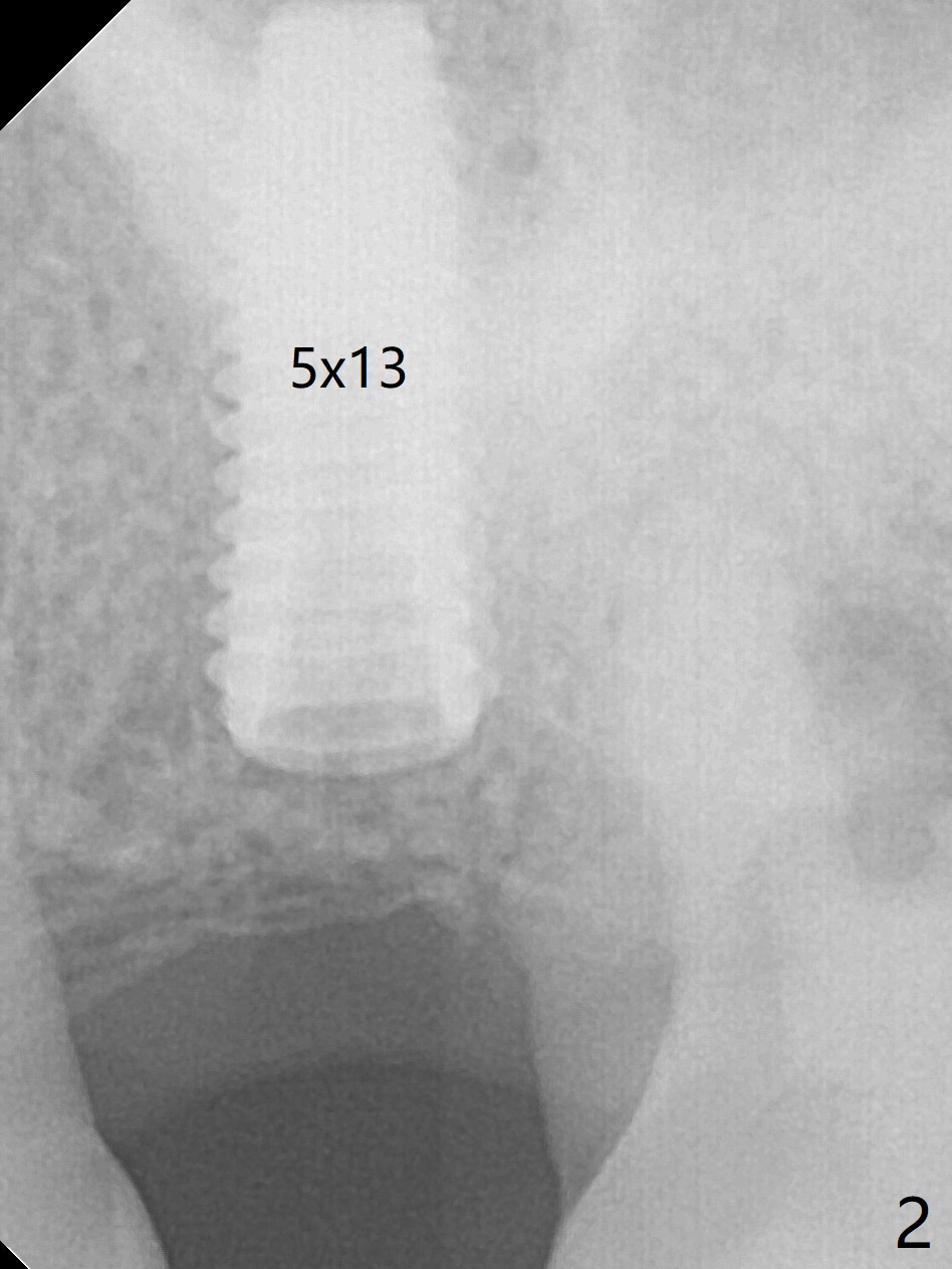 The patient is extremely nervous about implant placement at #14. Access is obtained with a 4 mm tissue punch, which appears to be the least traumatic. Since the gingiva is ~ 5 mm thick, vision is poor and it is difficult to change osteotomy buccally. It seems a 6 mm tissue punch is more appropriate for this case. The initial osteotomy depth is 14 mm (Fig.1). Since the tooth #15 is nonsalvageable because of furca caries and bone loss (Fig.1 *), the distal osteotomy at #14 is apparently acceptable. When a 5x13 mm implant is placed with >50 Ncm (Fig.2), the implant is subcrestal clinically except palatal (osteotomy not buccal enough), which is consistent with bitewing view (Fig.3). A 5.5x5 mm healing abutment is placed. Surprisingly the fearful patient does not experience any pain. Tissue punch is an atraumtic measure. A larger one (6 mm) allows more room to change osteotomy. The access can be closed with larger healing abutment. If this implant fails due to periimplantitis, it is due to palatal placement with too large the implant (5 mm vs. 4 mm at #3). Palpate the bone prior to changing next large drill when performing a flapless procedure. The implant seems to be osteointegrated 5 months postop; the furca caries (Fig.4 *) is taken care of before impression with a 4.5x5(4) mm abutment. Distal caries of the tooth #13 is found 10 months post cementation (Fig.5). Strict oral hygiene for prevention should have been given after composite for the furca of the tooth #15 (*).