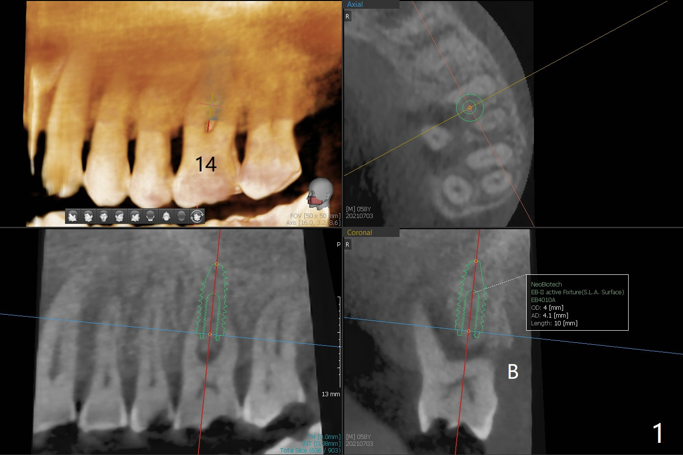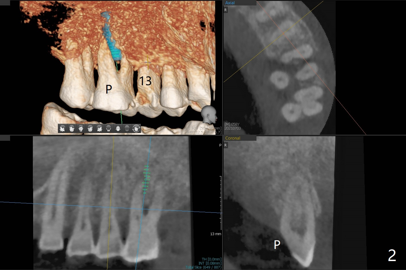 58岁男要求治疗14号牙,吃饭剧痛,CT检查显示腭侧(P)骨质吸收,所以颊侧植入较小植体(图一),13号牙腭侧牙尖折裂(图二),需要牙冠修复。